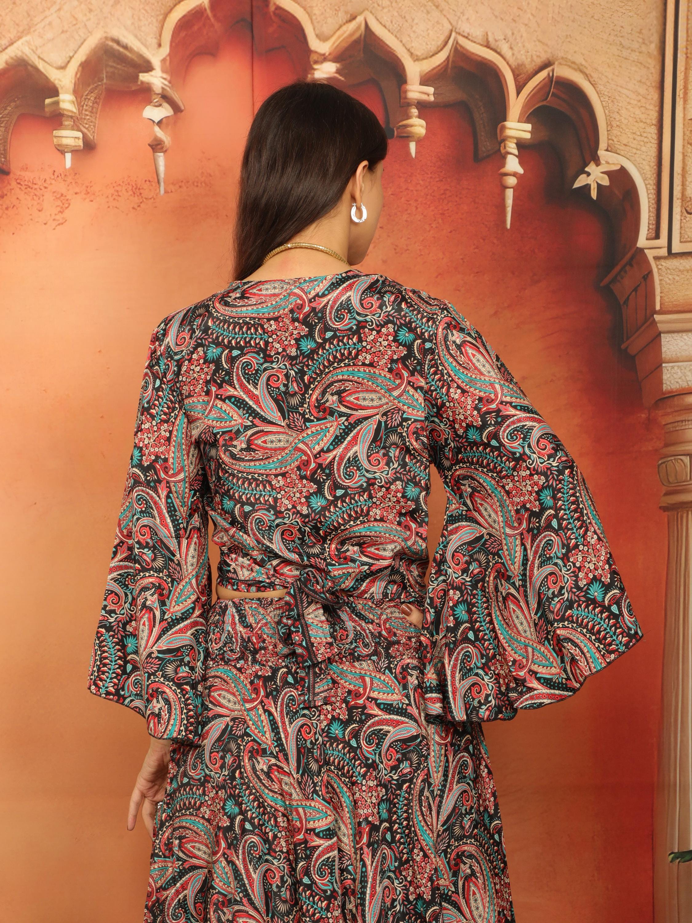 The stunning black top is adorned with a vibrant Emerald Green and Wine Paisley Print. The stylish flare sleeves add a touch of drama, while the flattering wrap top design allows for a customizable fit.