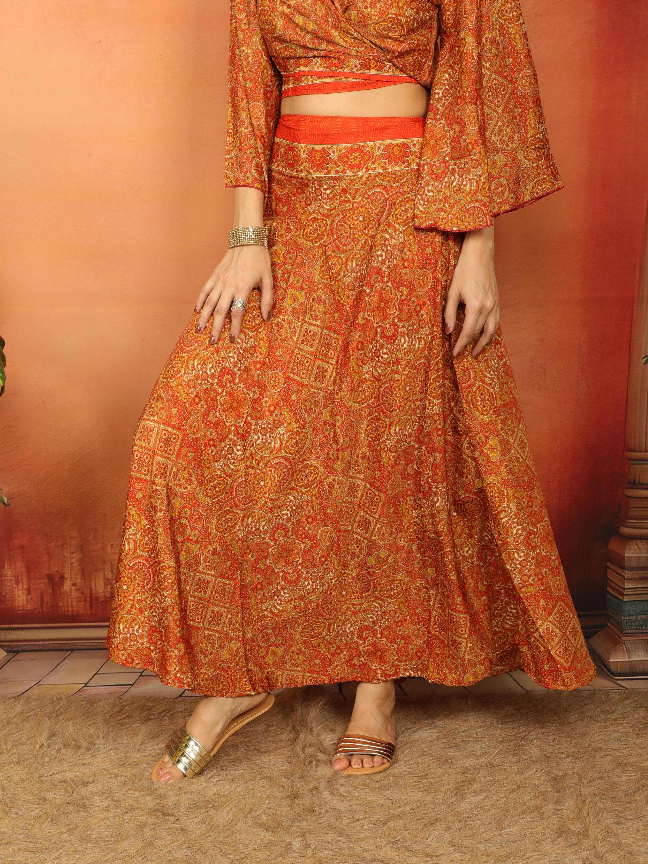 This captivating skirt features a mesmerizing floral print in warm shades of orange, evoking a sense of earthy elegance.