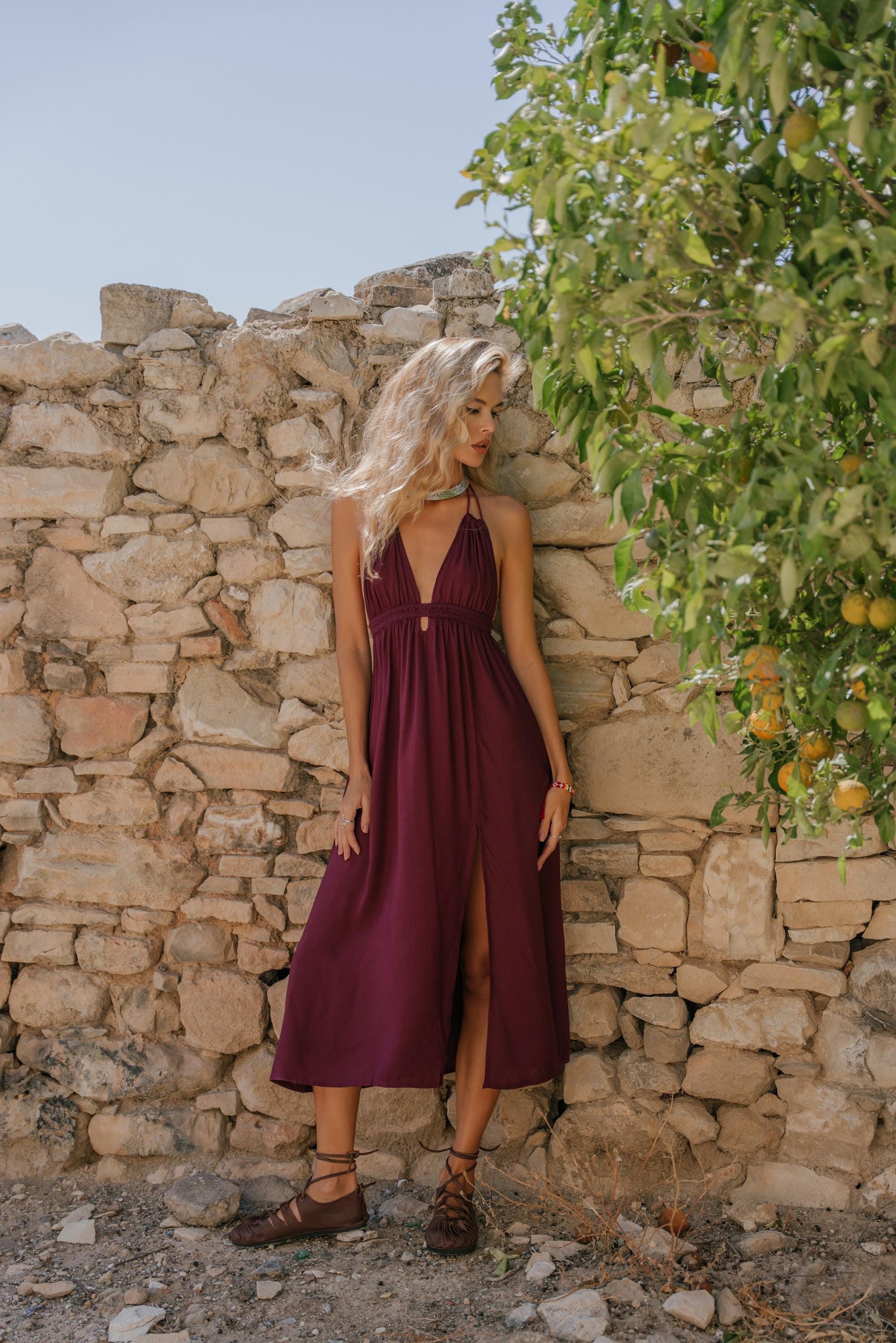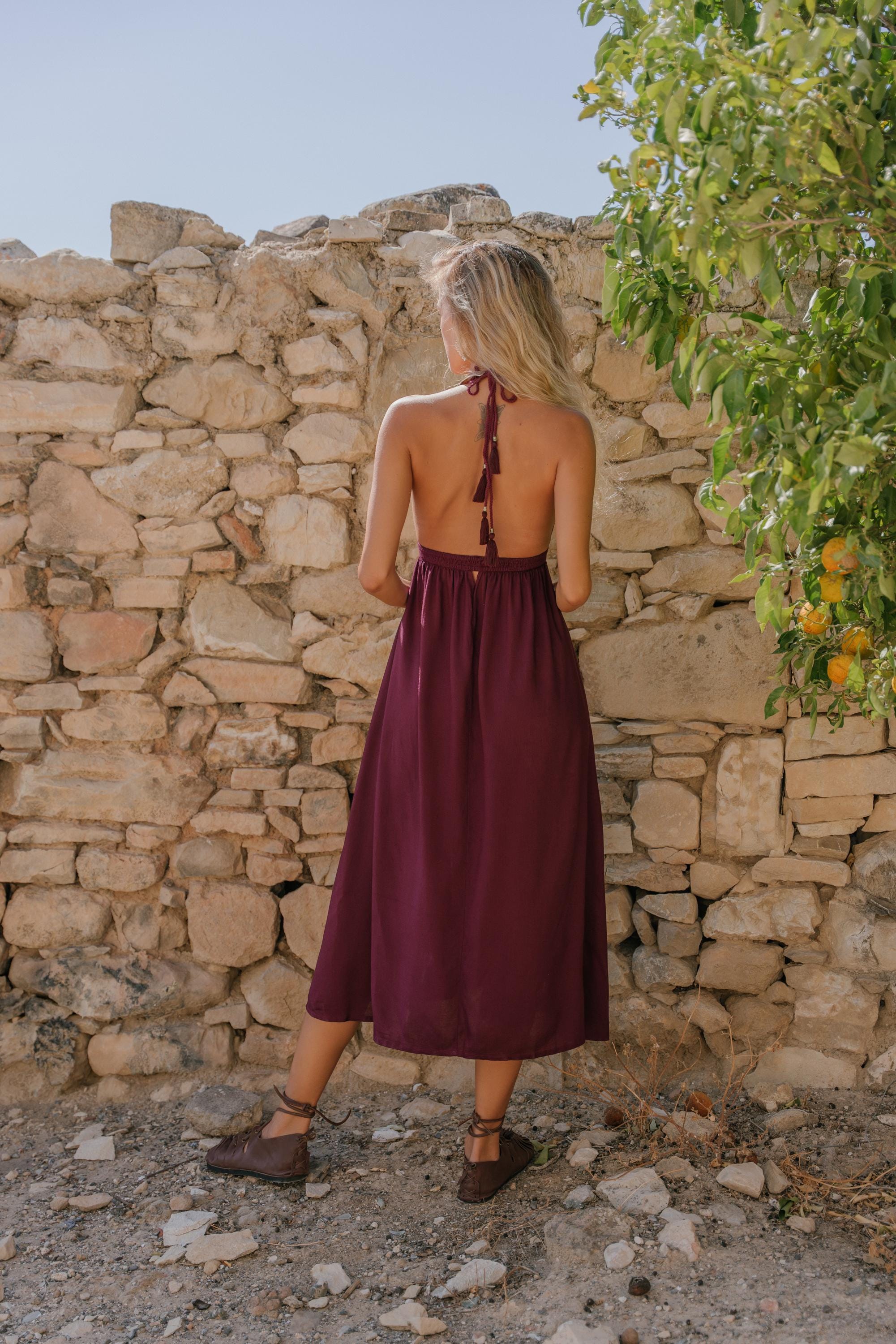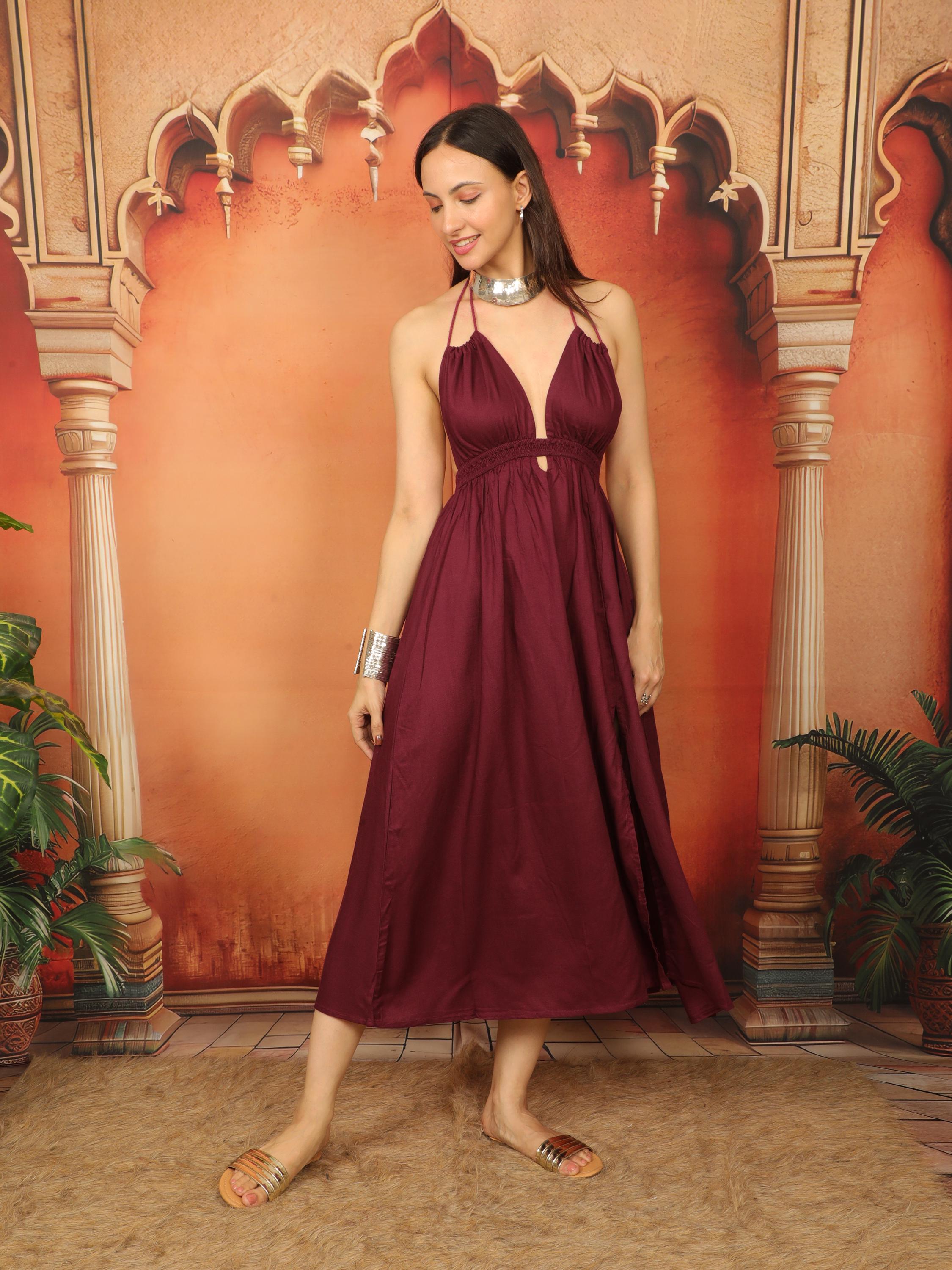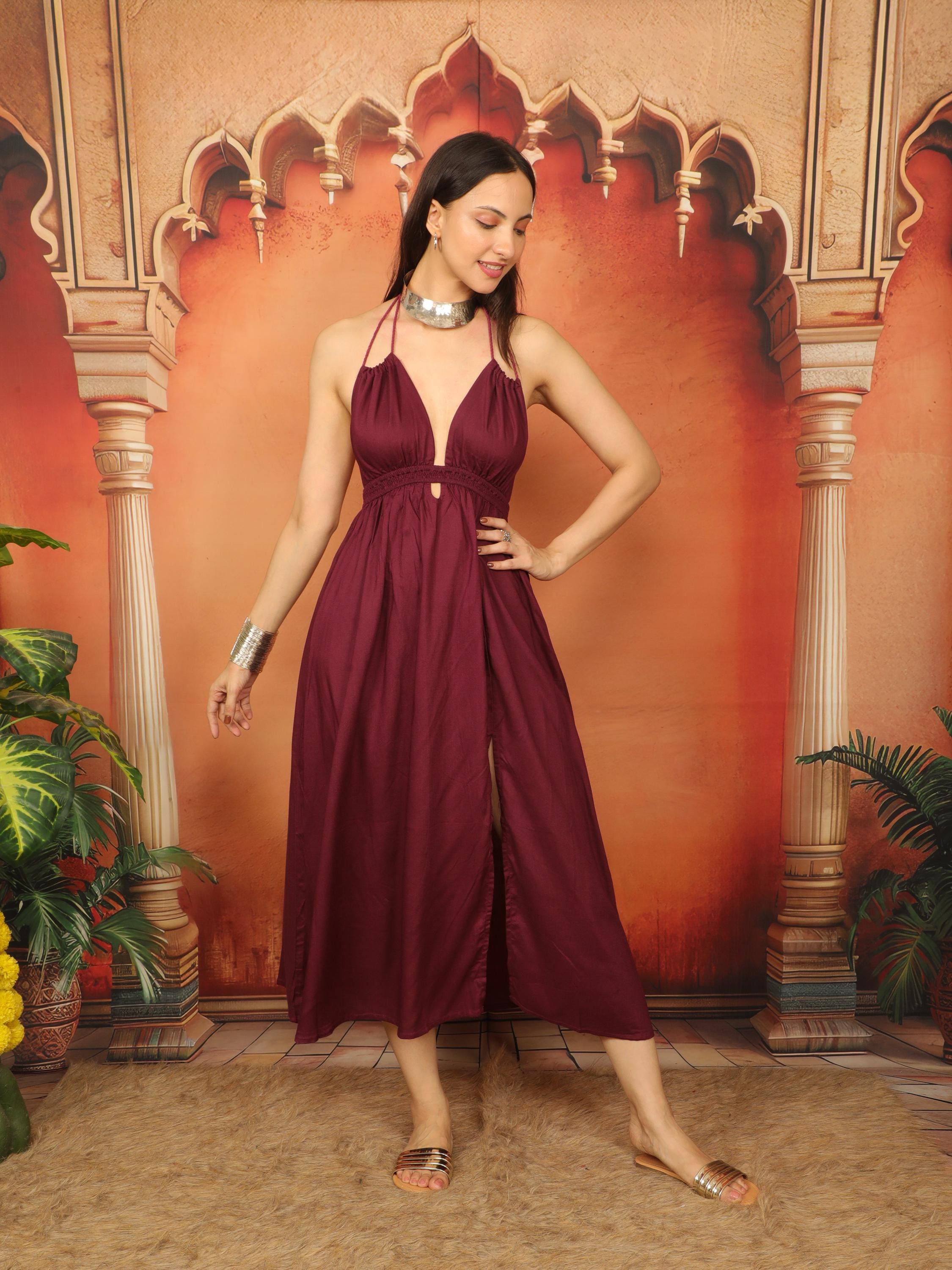 Make a statement in our Boho Burgundy Backless Viscose Long Dress.