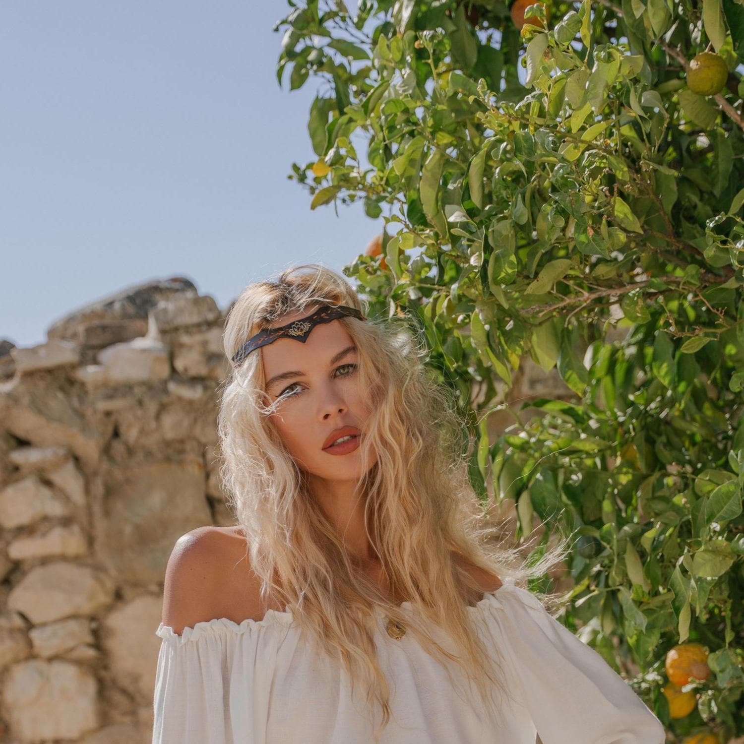 Adorned with a Brass Pendant Topped with a semi-precious stone cabochon, this Celtic-inspired brow jewelry adds a touch of enchantment to your outfit.