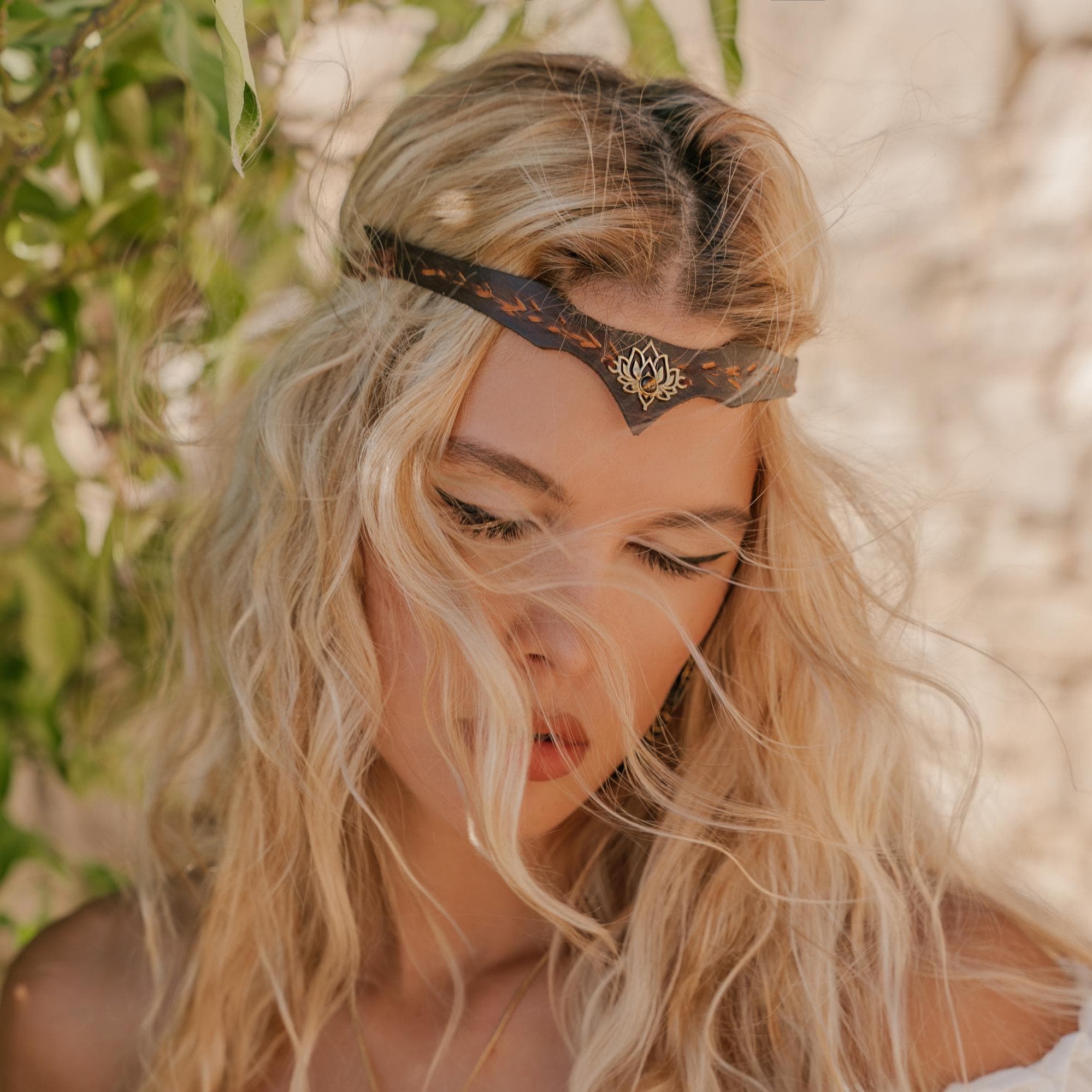 Patterns engraved into the leather while the natural beauty of the cabochon attracts the eye and reinforces your mystical aura. this tiara complements a variety of looks.