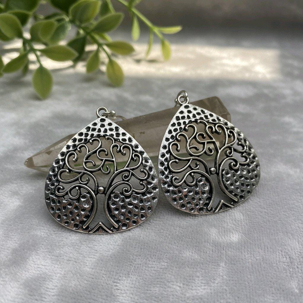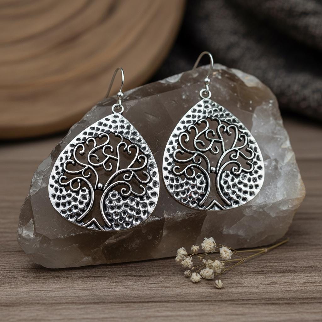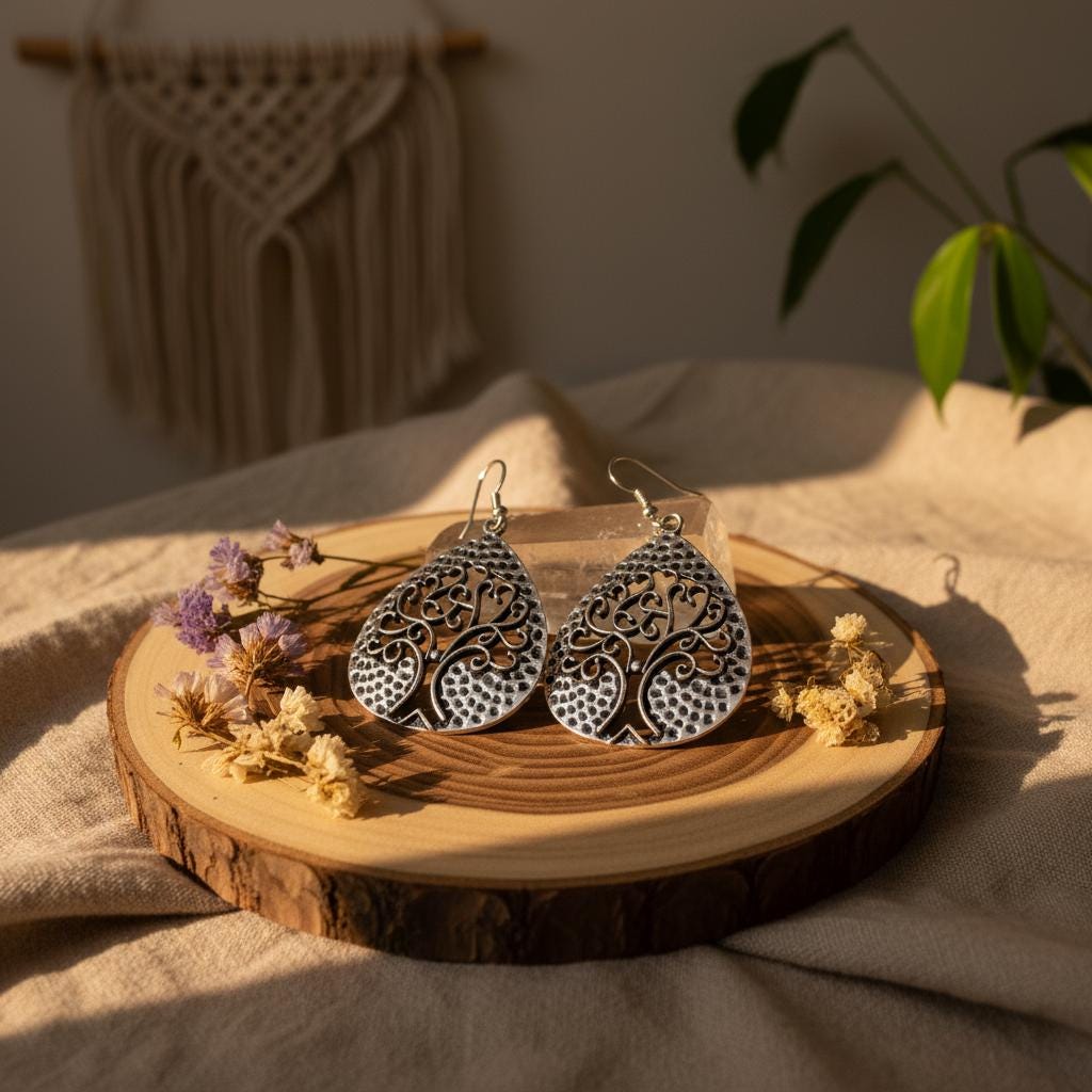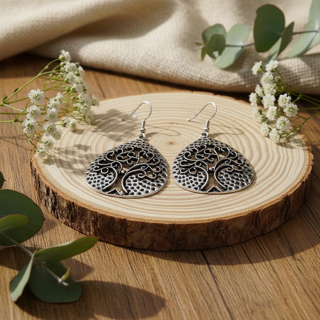 Celebrate nature and spiritual symbolism with these bohemian Tree of Life earrings, handcrafted in silver tone brass with an intricate openwork design. The Tree of Life motif represents growth, strength, and balance, making these earrings both meaningful and stylish.