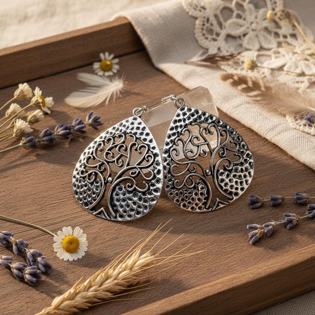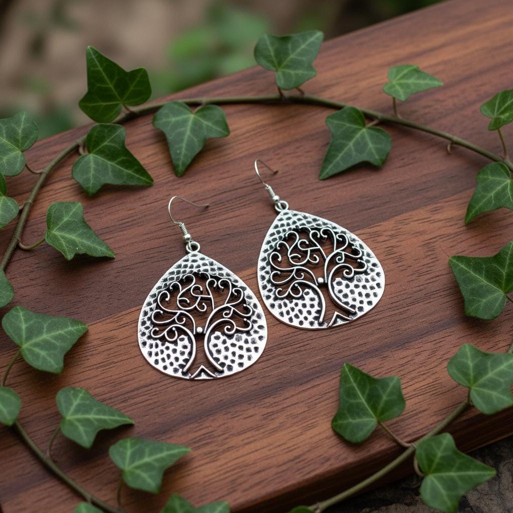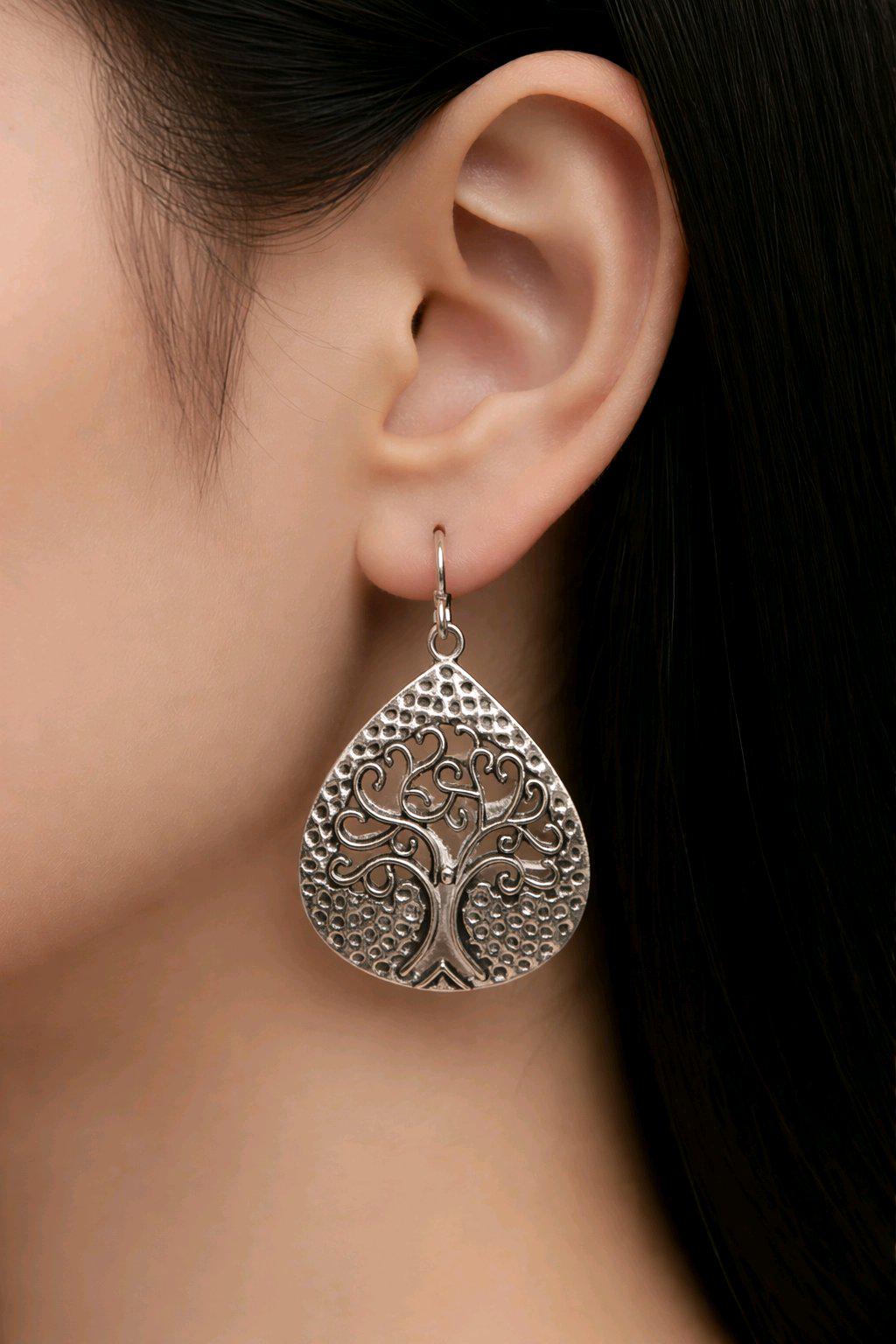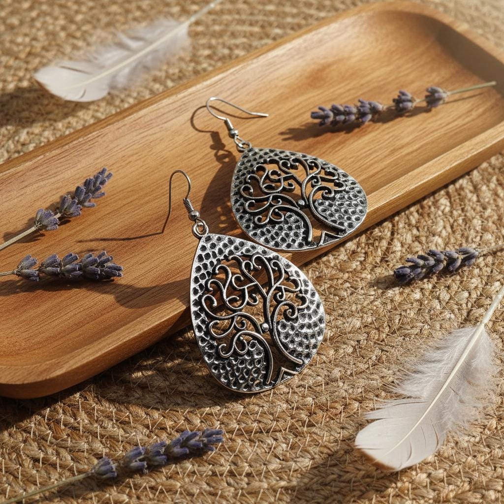 Celebrate nature and spiritual symbolism with these bohemian Tree of Life earrings, handcrafted in silver tone brass with an intricate openwork design. The Tree of Life motif represents growth, strength, and balance, making these earrings both meaningful and stylish.