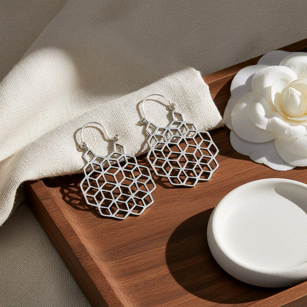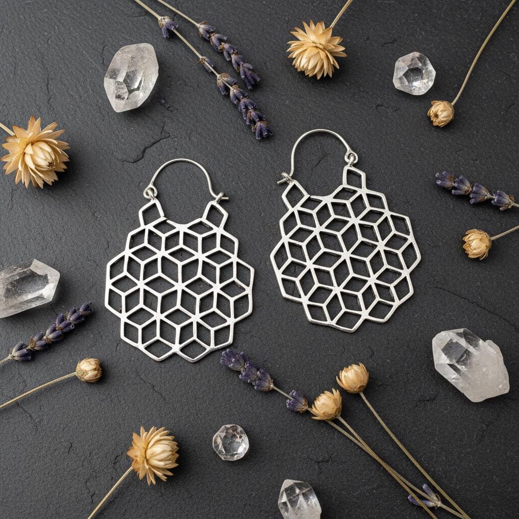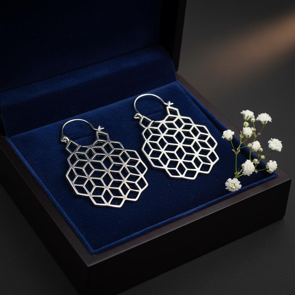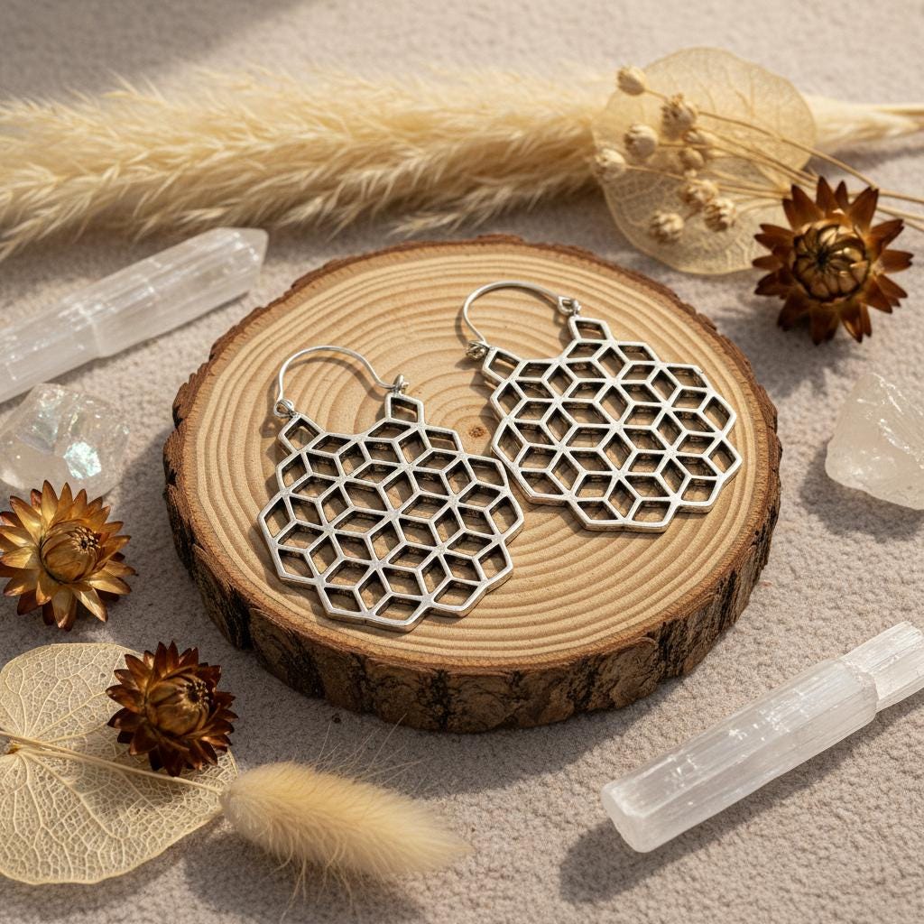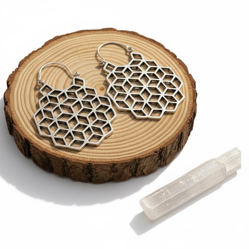 Each earring features an intricate hexagon lattice pattern, symbolizing balance, harmony, and connection to nature. The silver-tone finish reflects light beautifully, giving these earrings a modern yet earthy aesthetic that pairs effortlessly with boho, minimalist, or contemporary styles.