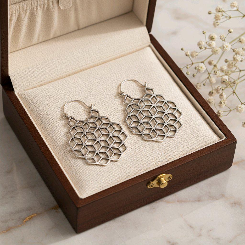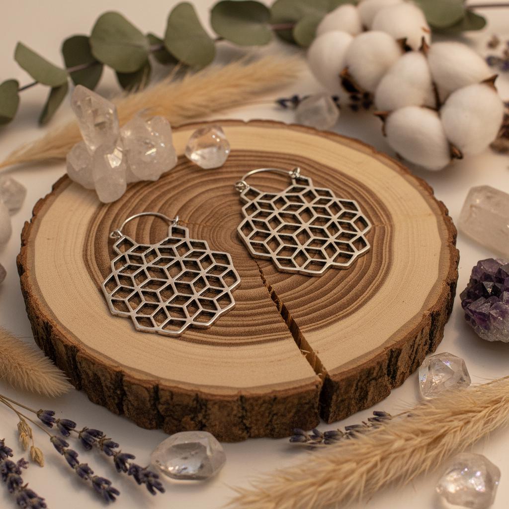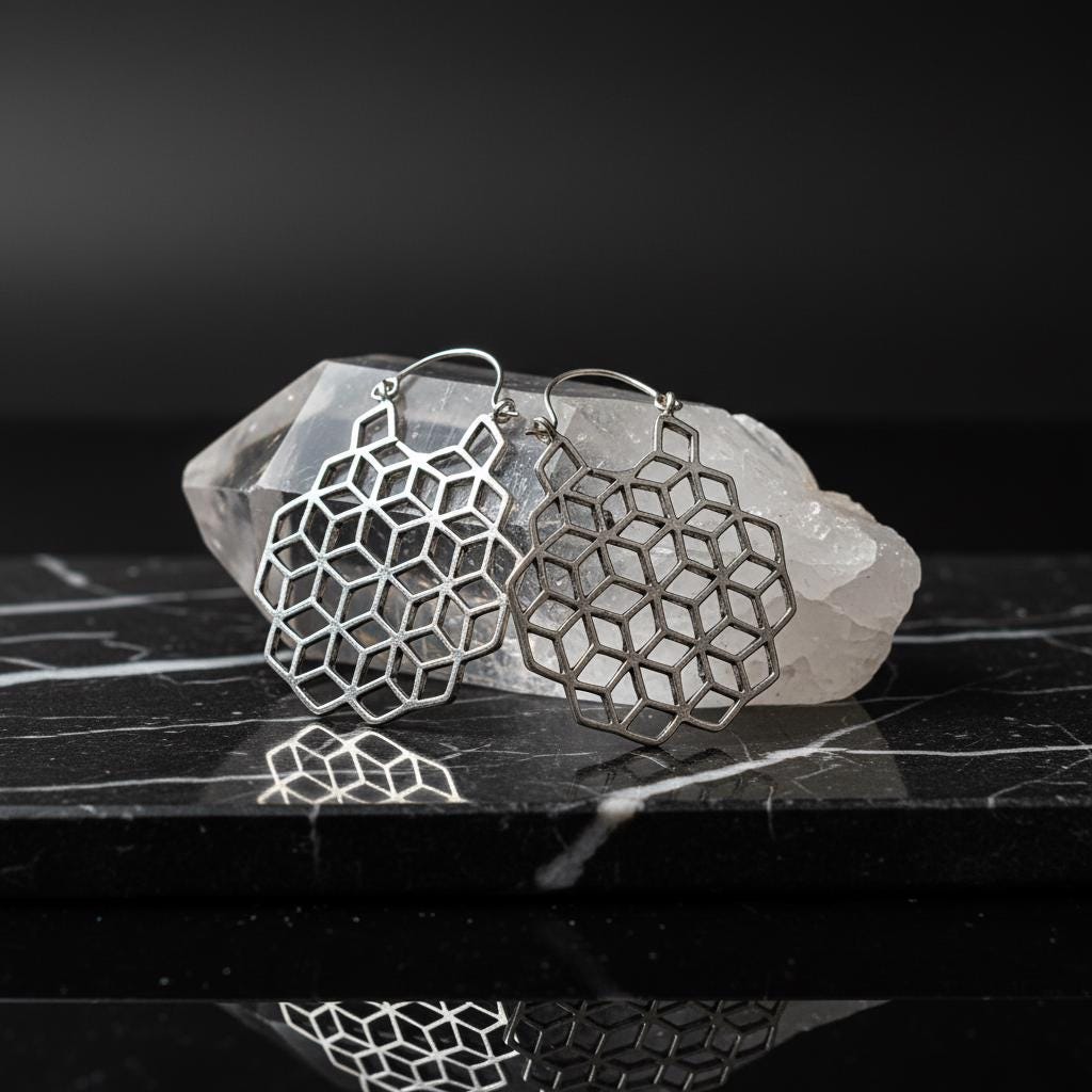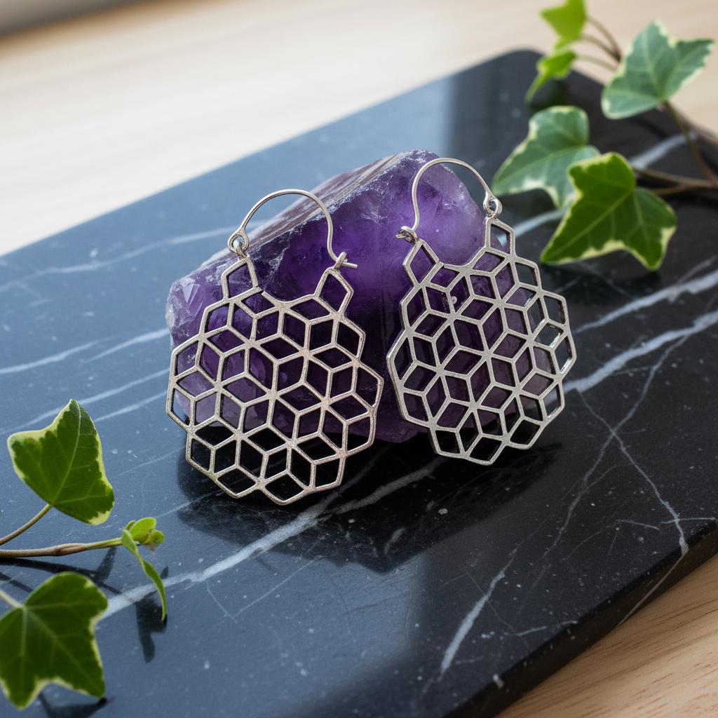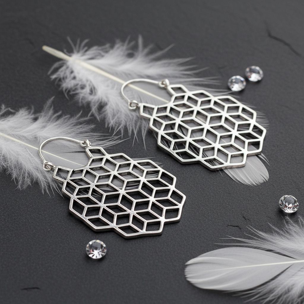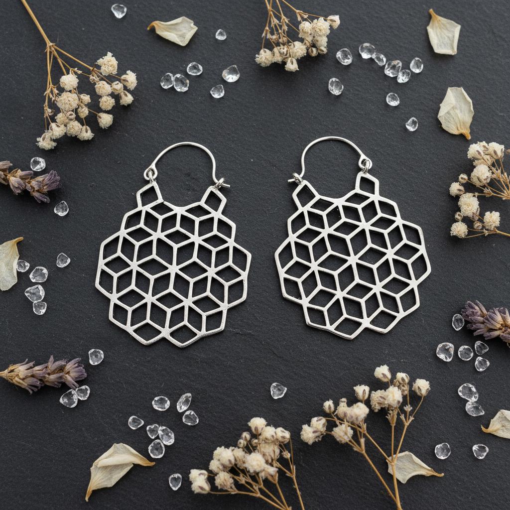 Each earring features an intricate hexagon lattice pattern, symbolizing balance, harmony, and connection to nature. The silver-tone finish reflects light beautifully, giving these earrings a modern yet earthy aesthetic that pairs effortlessly with boho, minimalist, or contemporary styles.