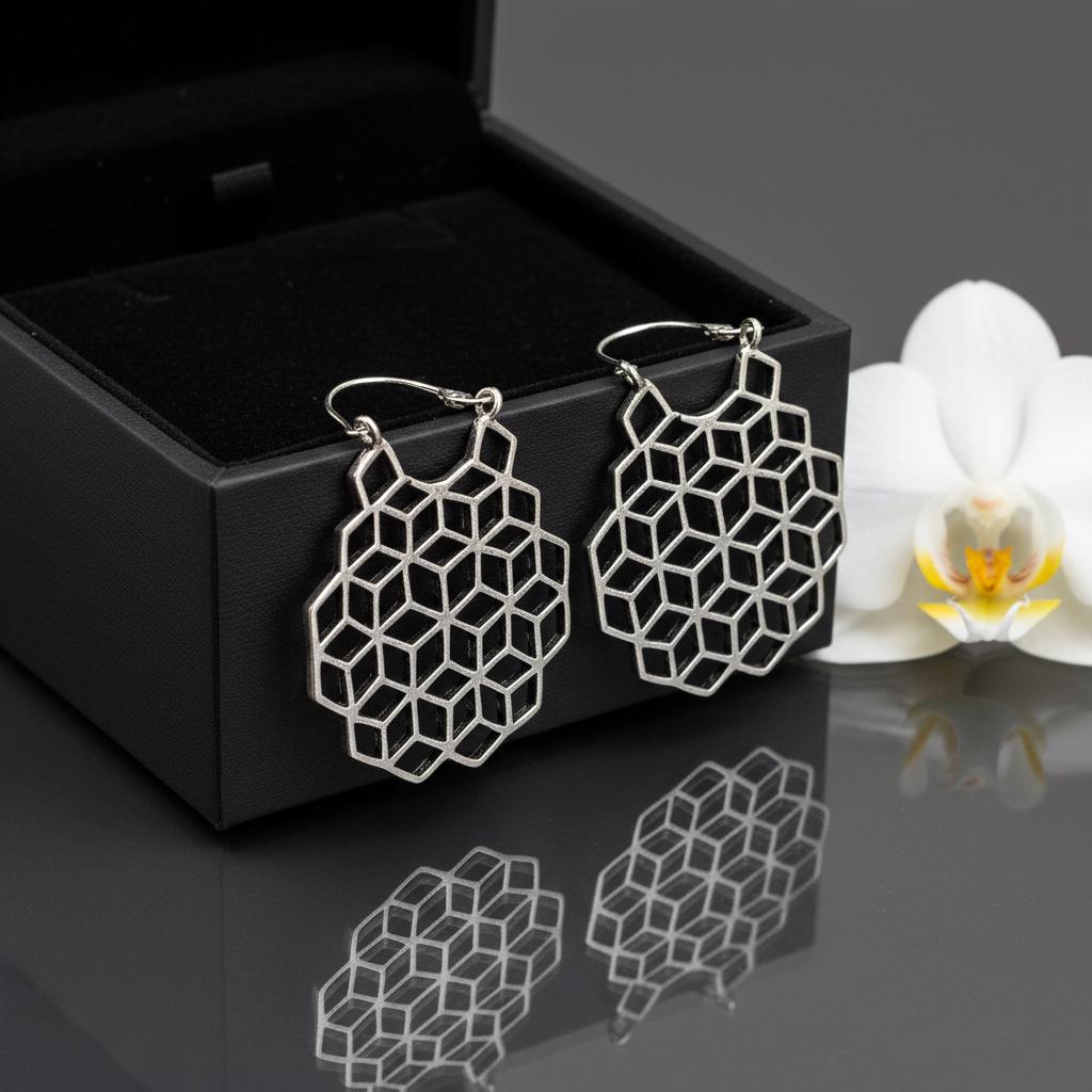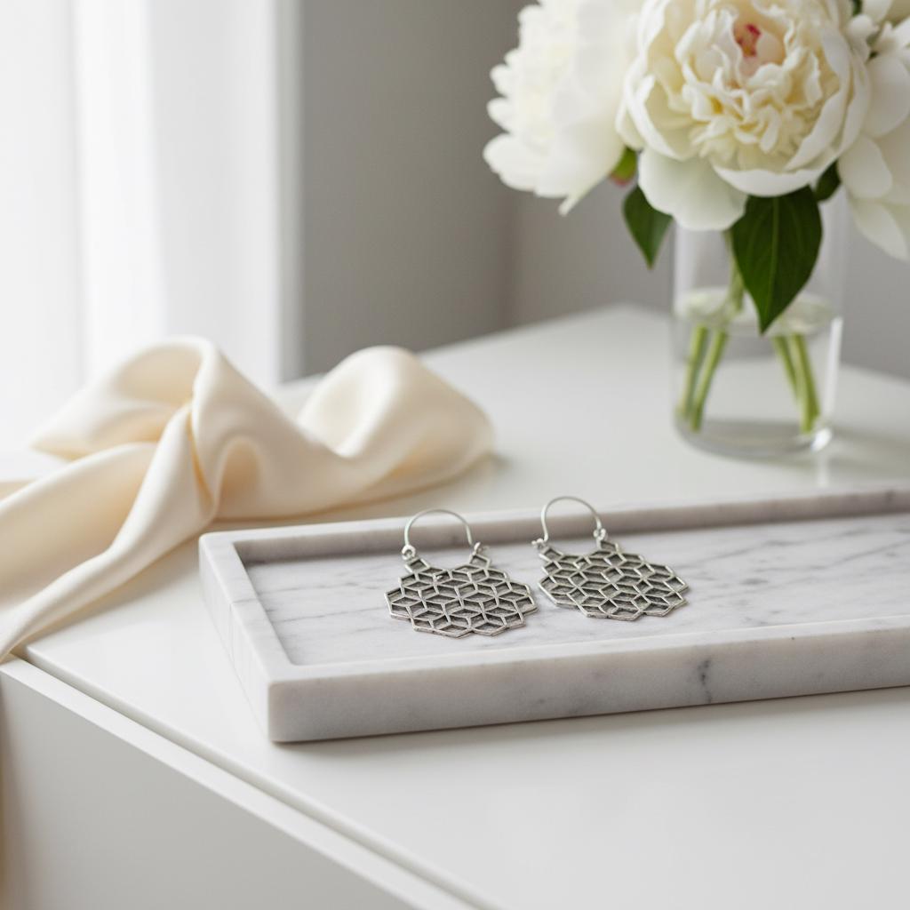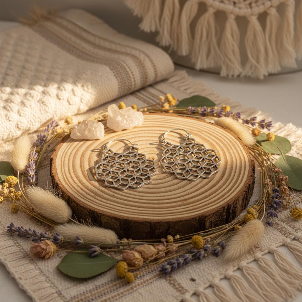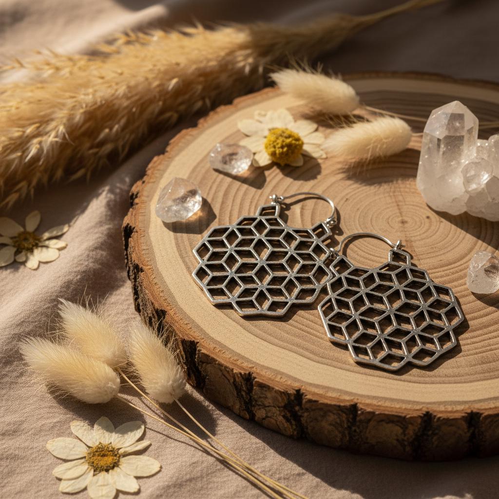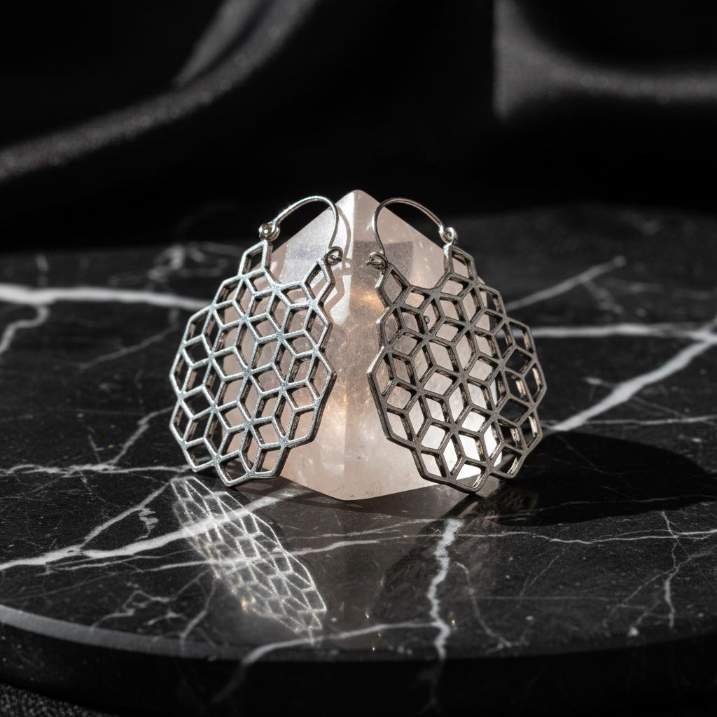 Each earring features an intricate hexagon lattice pattern, symbolizing balance, harmony, and connection to nature. The silver-tone finish reflects light beautifully, giving these earrings a modern yet earthy aesthetic that pairs effortlessly with boho, minimalist, or contemporary styles.