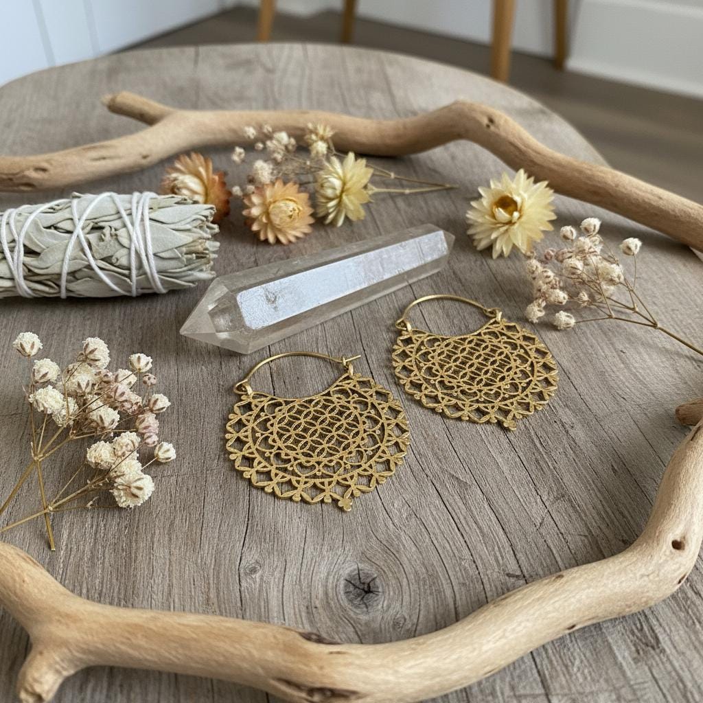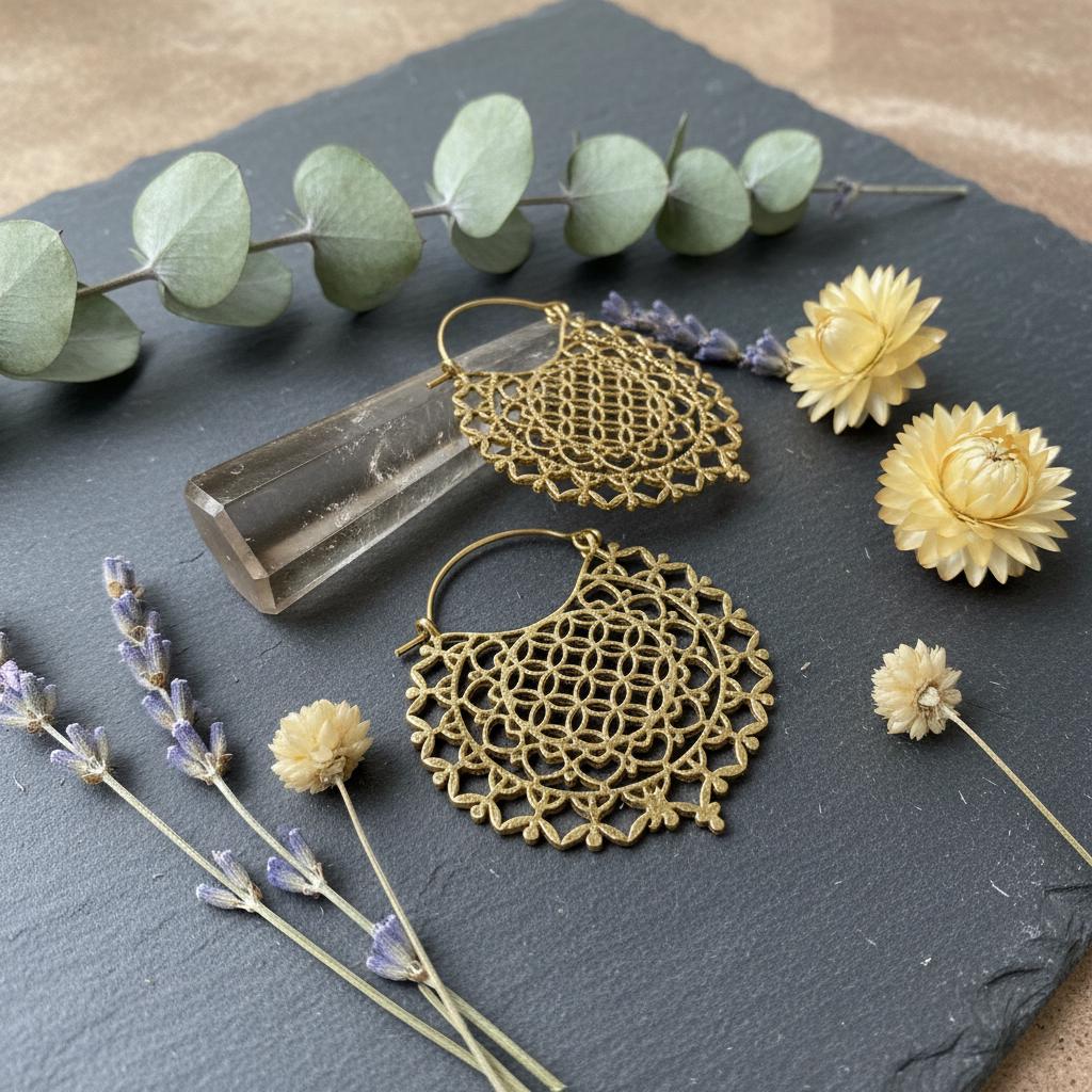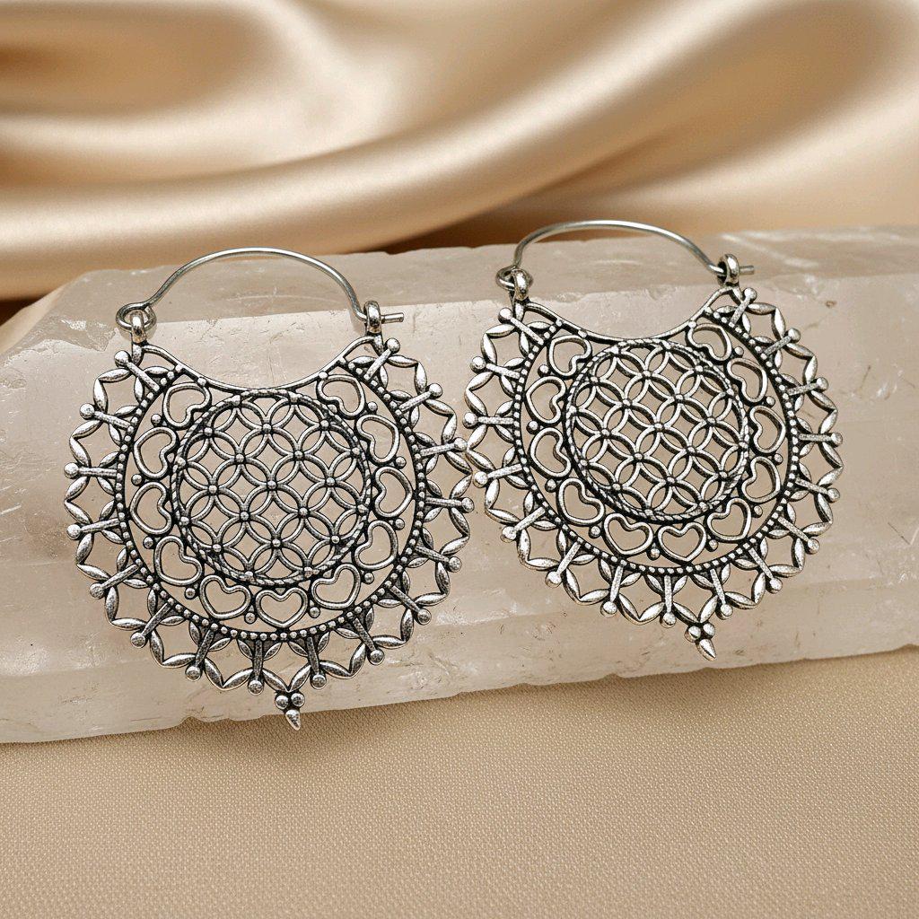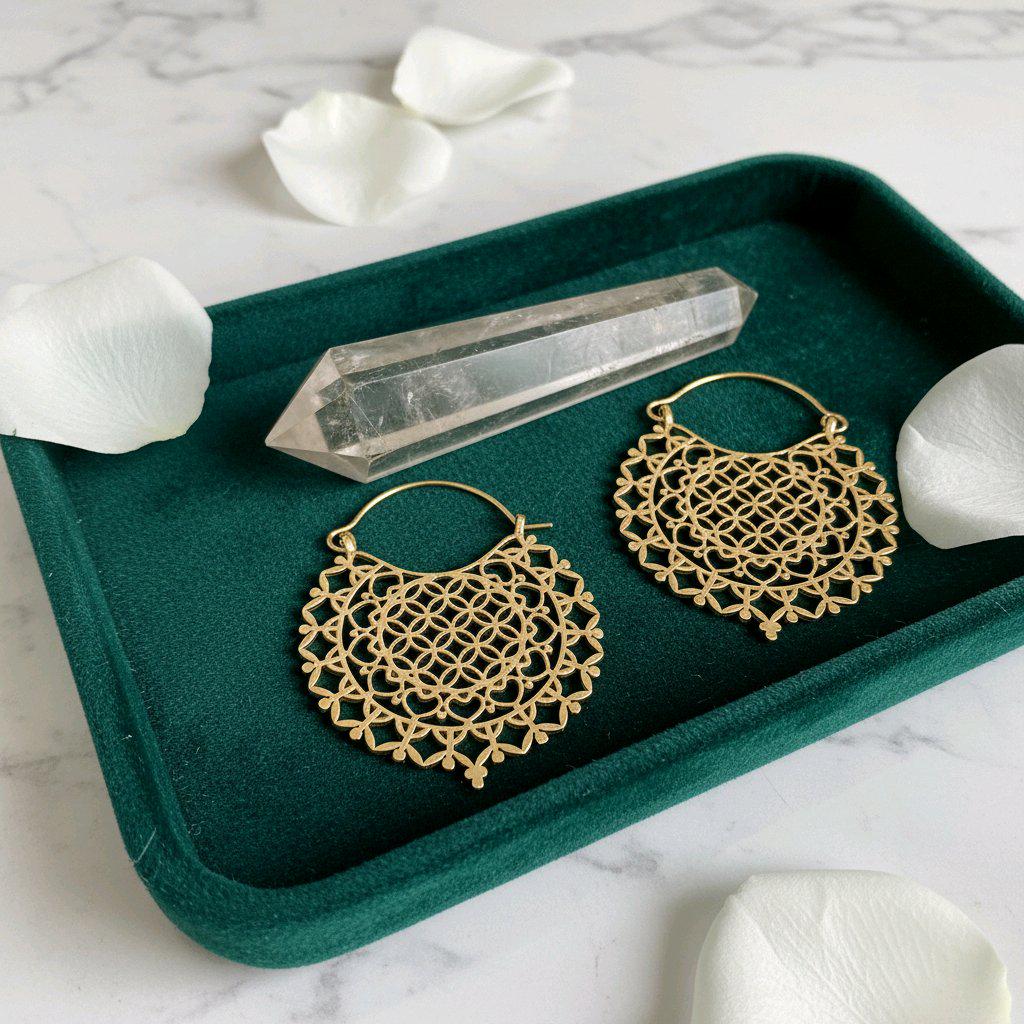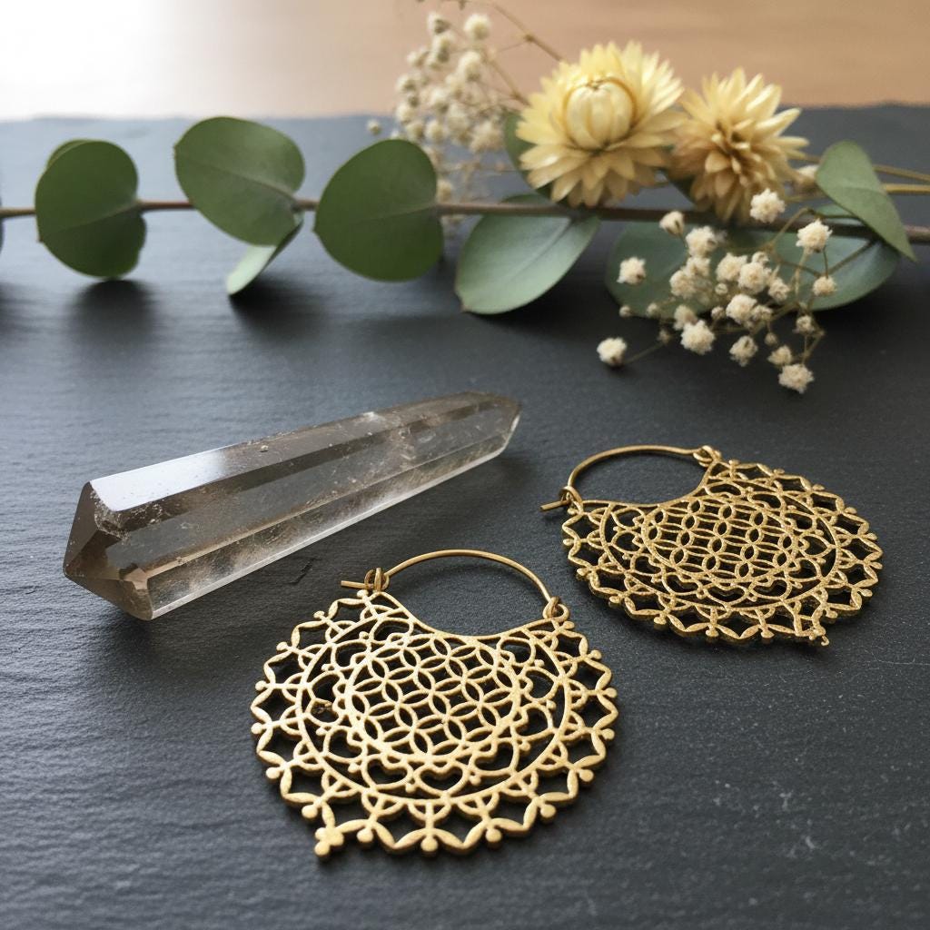 Make a meaningful style statement with these beautifully crafted brass sacred geometry hoop earrings, featuring an intricate Flower of Life mandala design. Carefully shaped with delicate openwork details, these earrings are both visually striking and surprisingly lightweight, making them perfect for everyday wear or special occasions.