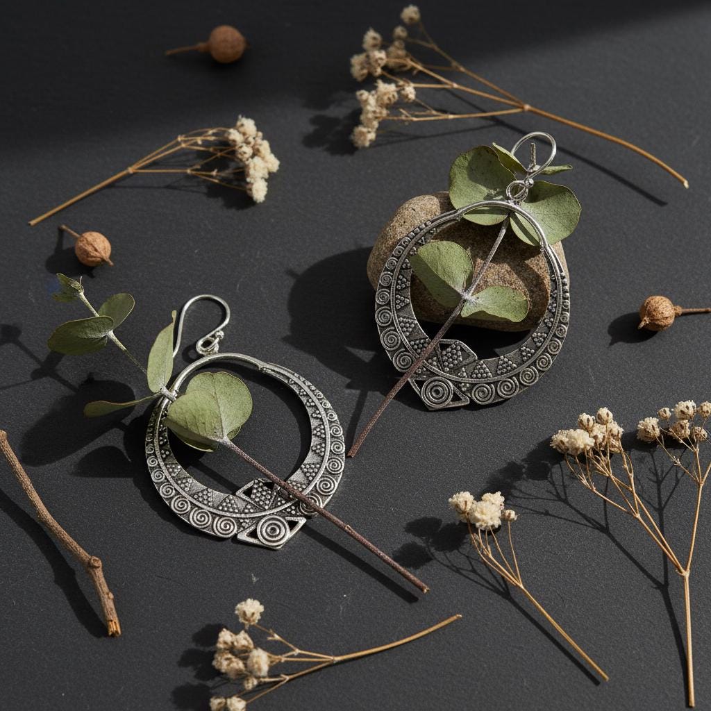 Available in golden tone and silver tone, these brass earrings are designed to suit both warm and cool styling preferences while keeping their artisanal character. The detailed texture gives them a handcrafted look that reflects ancient motifs and sacred geometry traditions.