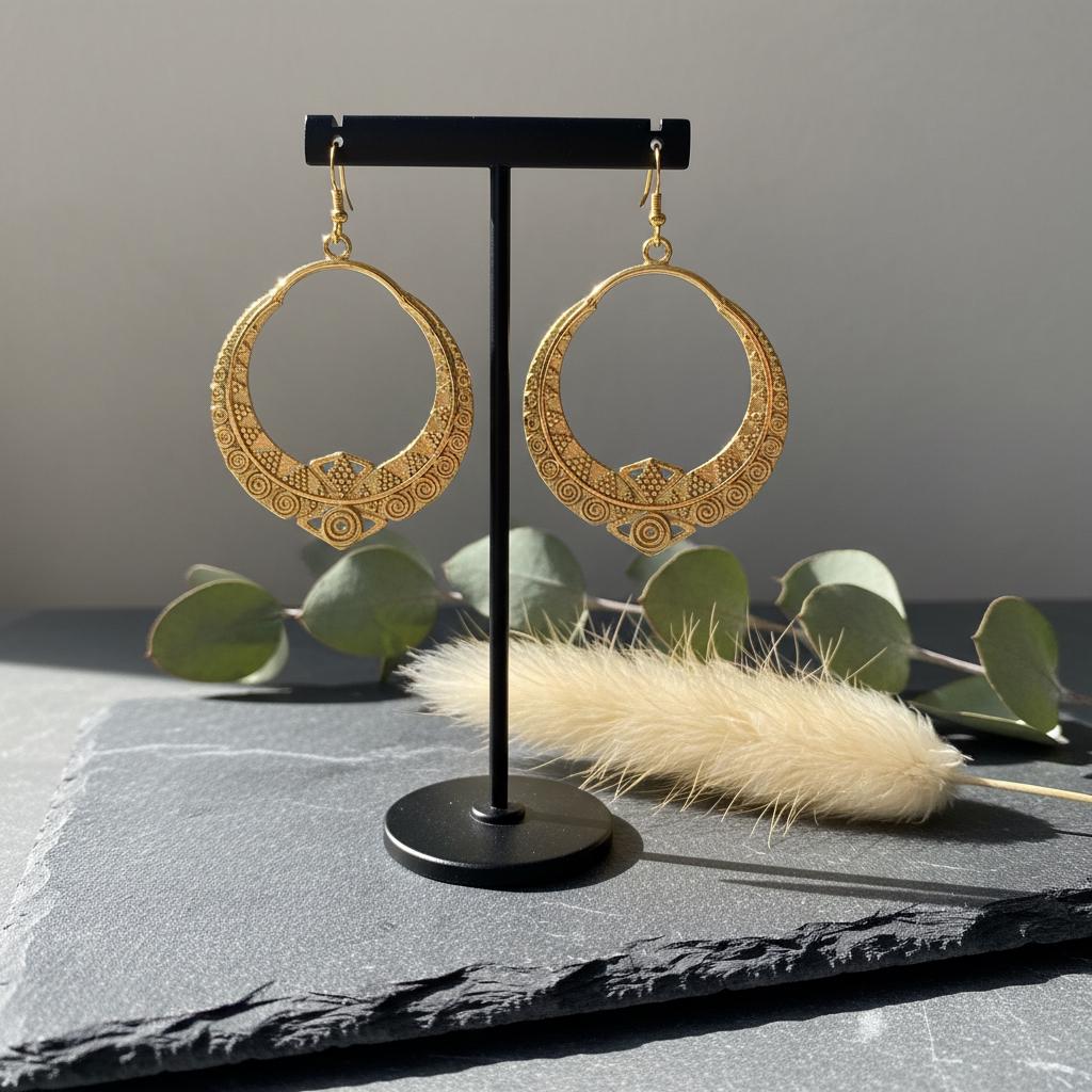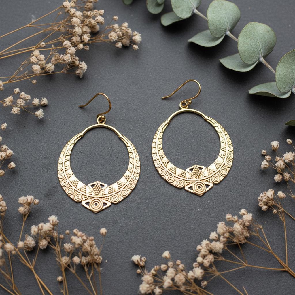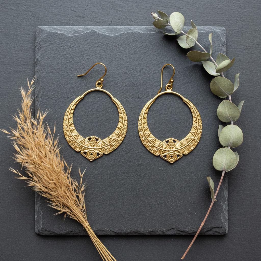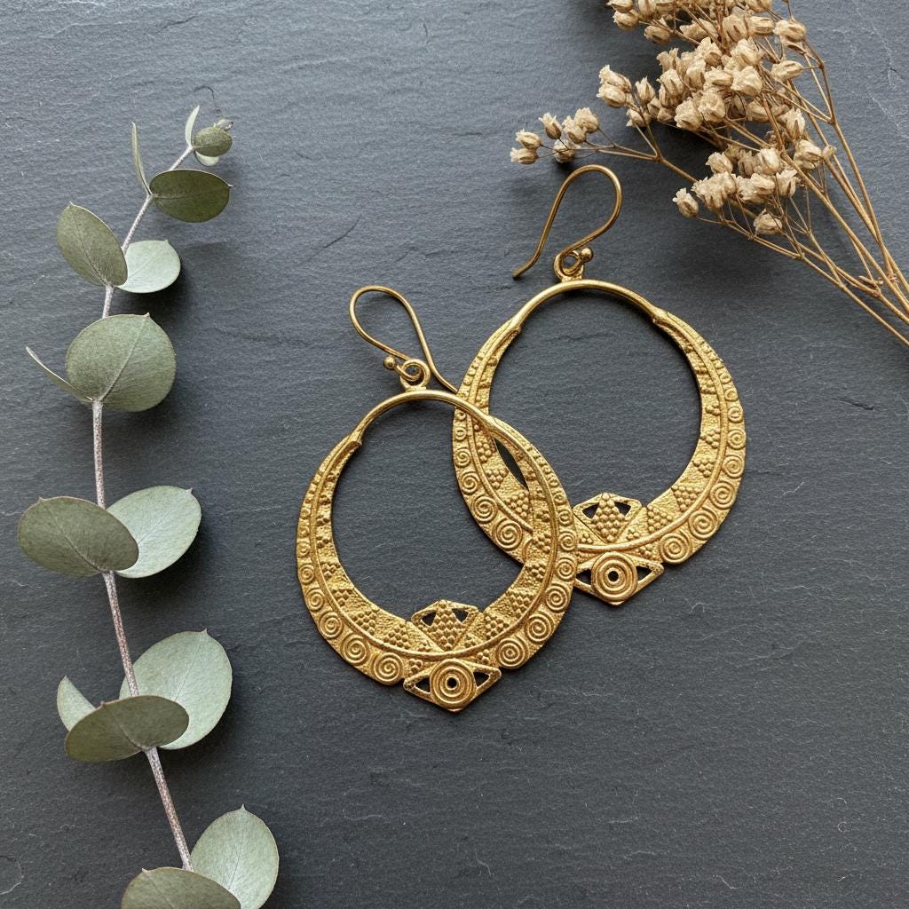 These boho tribal hoop earrings are crafted from brass and feature an intricate ethnic geometric pattern inspired by oriental and tribal symbolism. Their open circular shape combined with engraved spiral and dot details creates a powerful yet elegant statement.