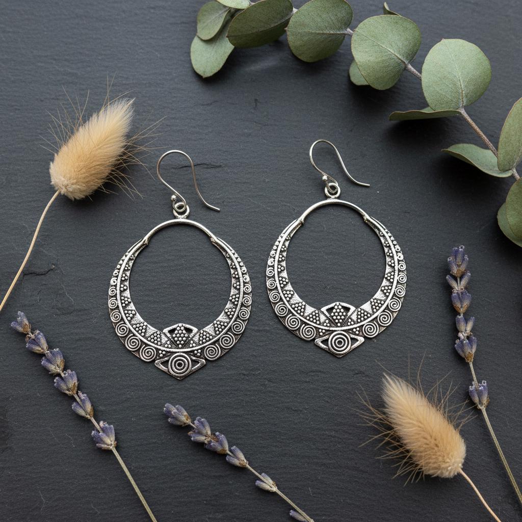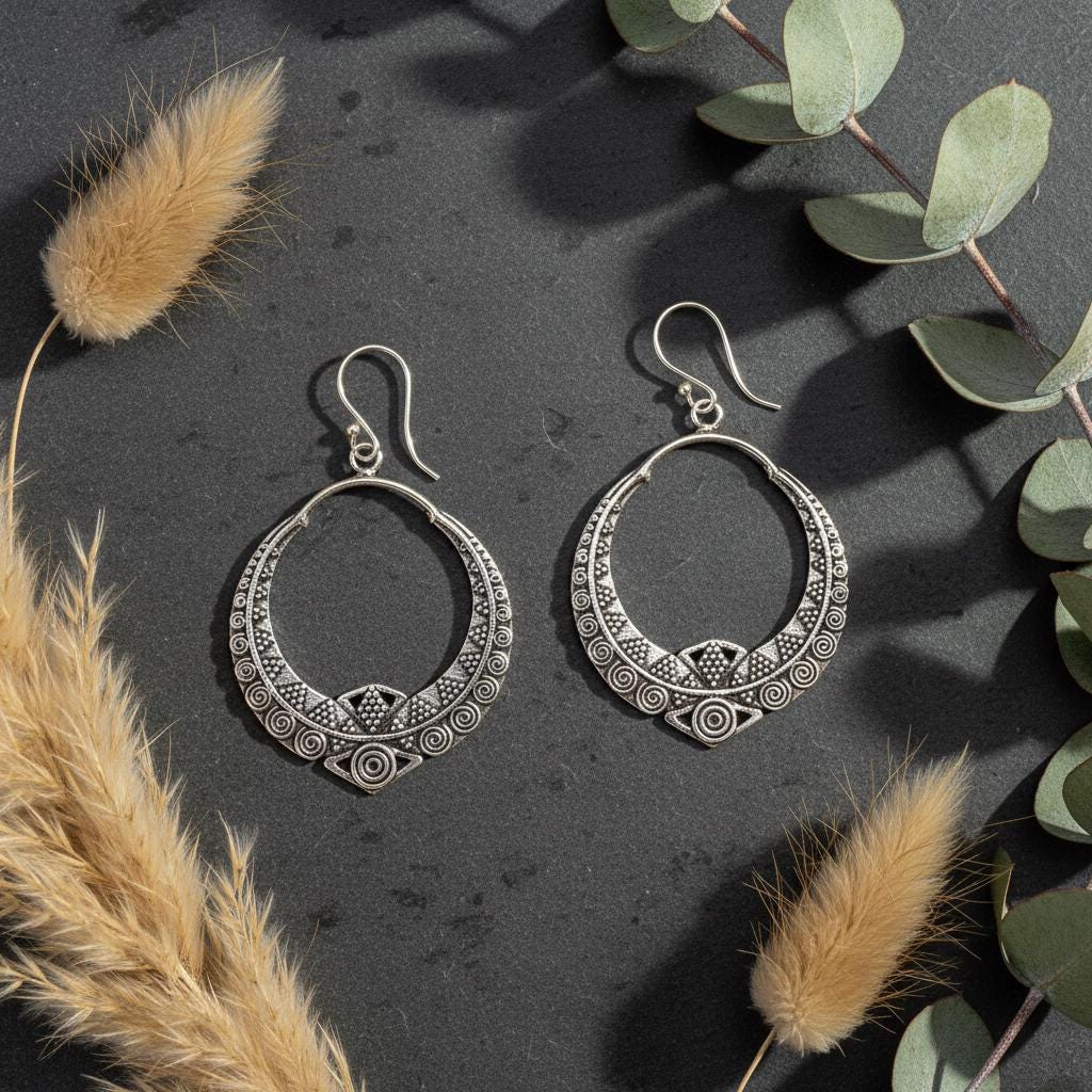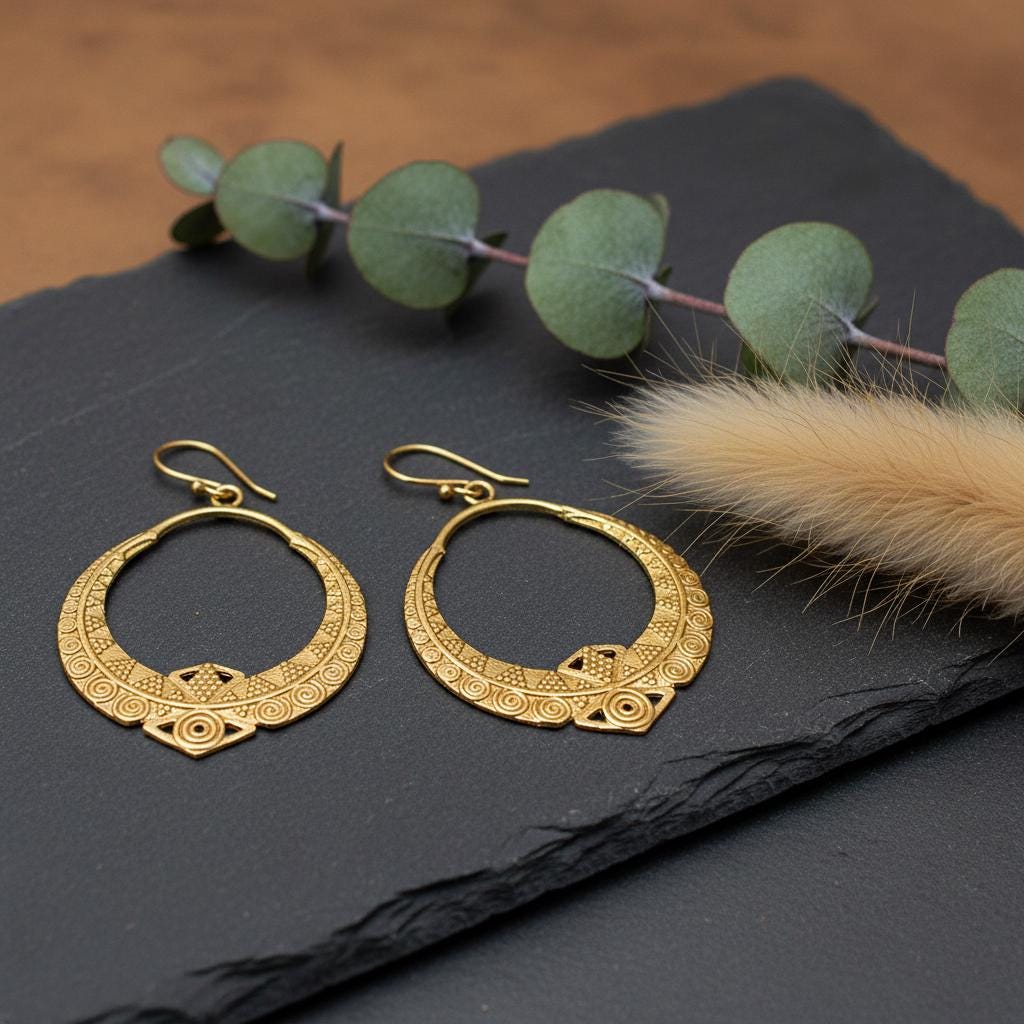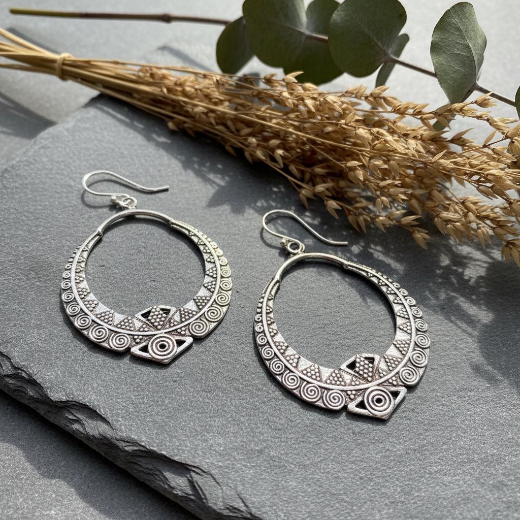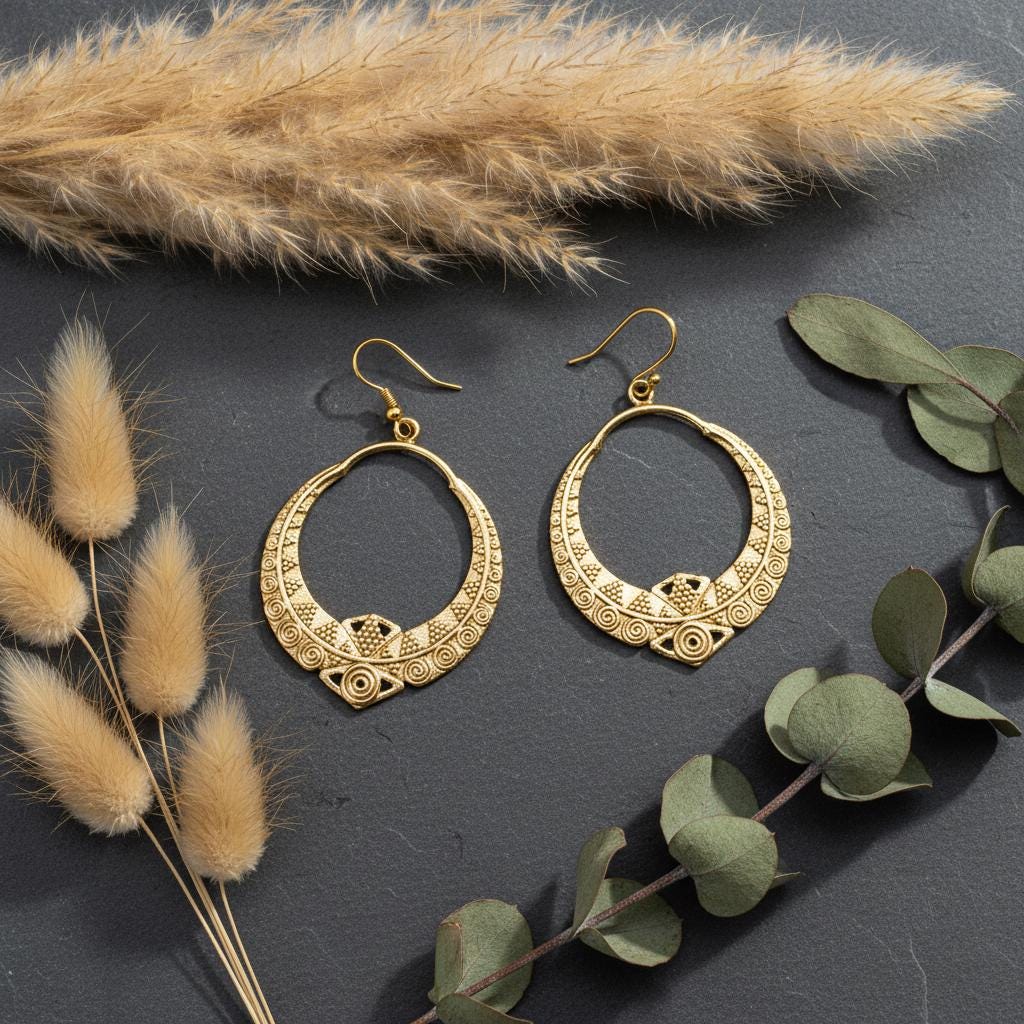 These boho tribal hoop earrings are crafted from brass and feature an intricate ethnic geometric pattern inspired by oriental and tribal symbolism. Their open circular shape combined with engraved spiral and dot details creates a powerful yet elegant statement.