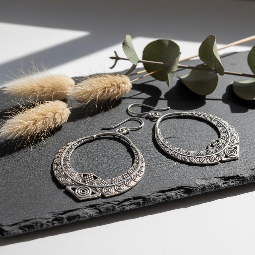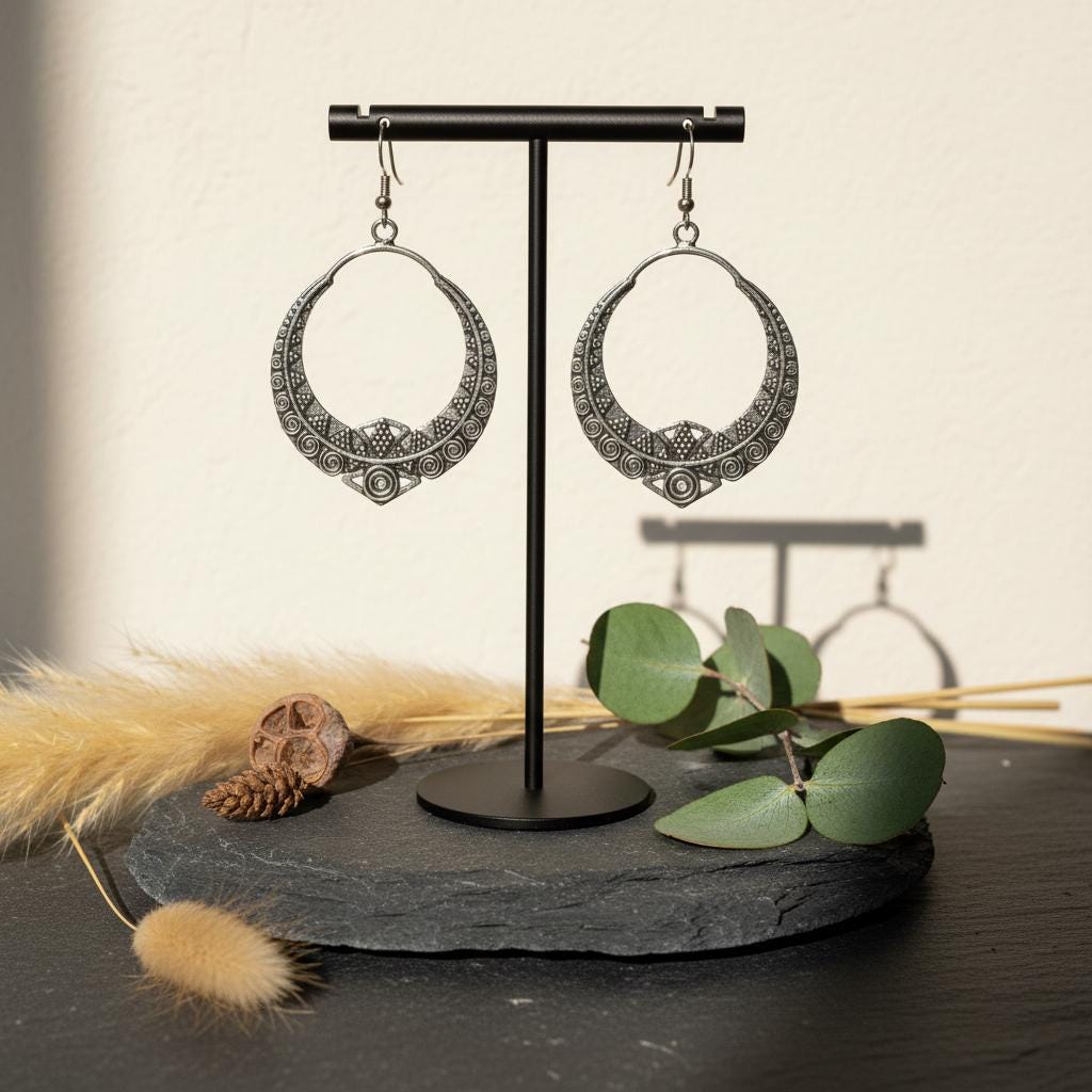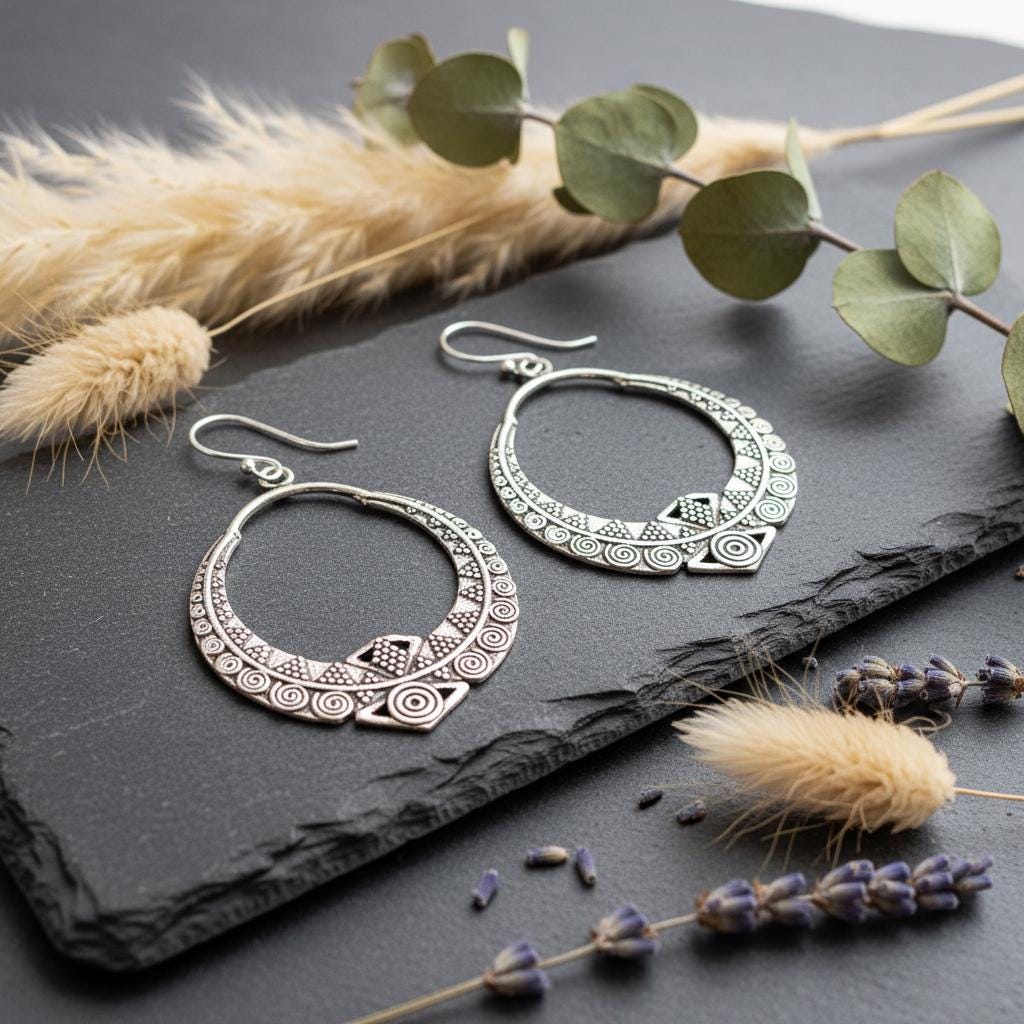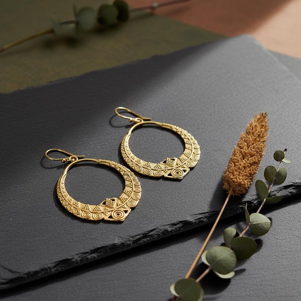 These boho tribal hoop earrings are crafted from brass and feature an intricate ethnic geometric pattern inspired by oriental and tribal symbolism. Their open circular shape combined with engraved spiral and dot details creates a powerful yet elegant statement.