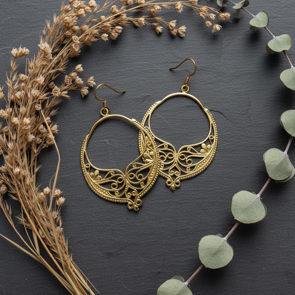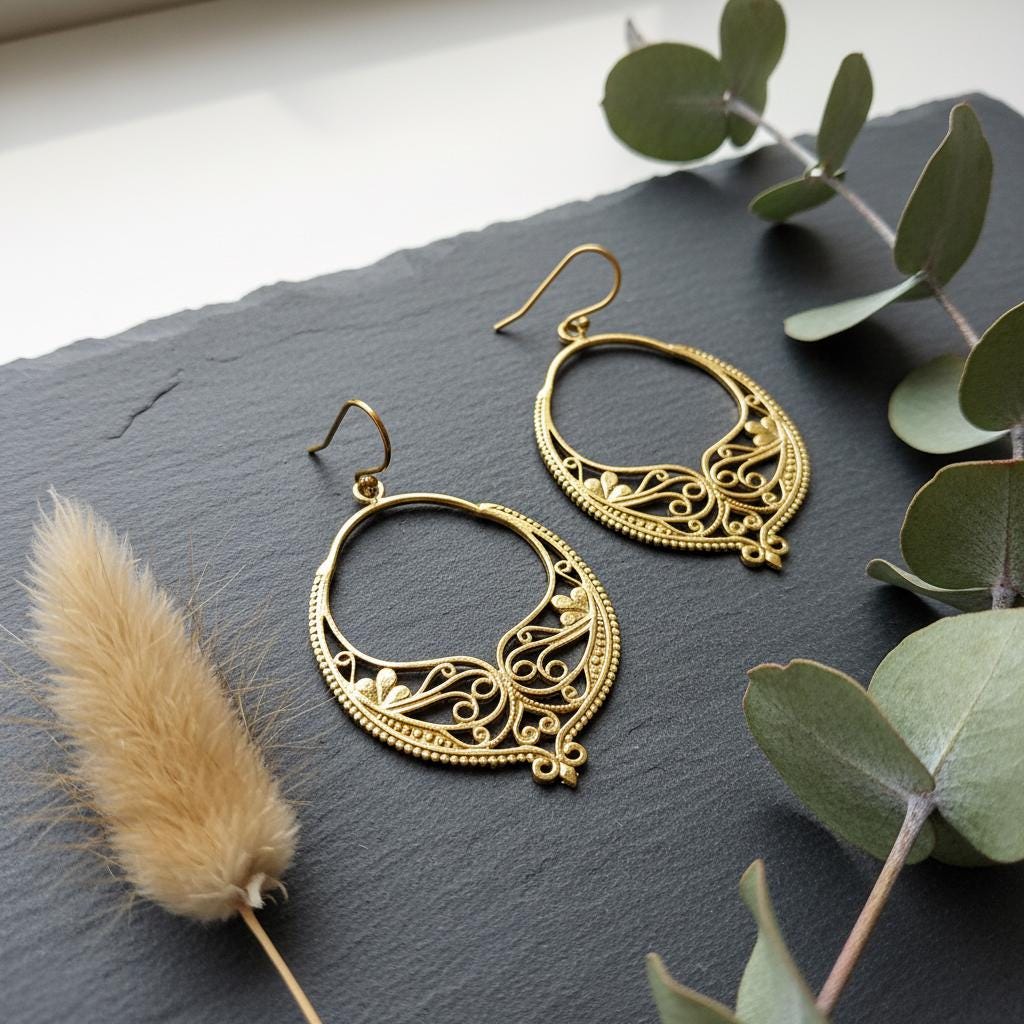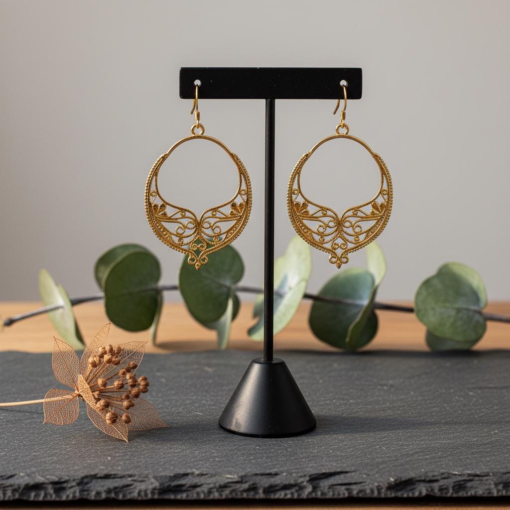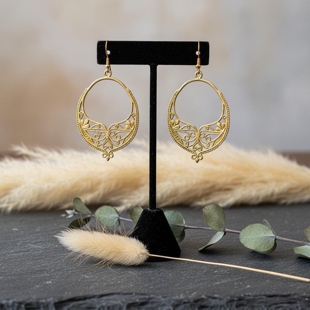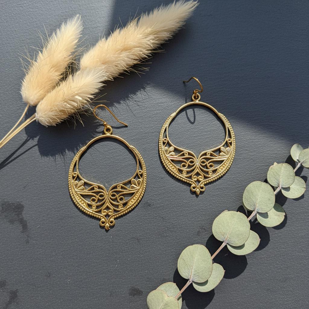 These boho filigree hoop earrings are beautifully crafted from brass and feature an elegant openwork floral and scroll design inspired by oriental and ethnic artistry. The delicate curves and symmetrical detailing give these earrings a refined yet powerful bohemian character.