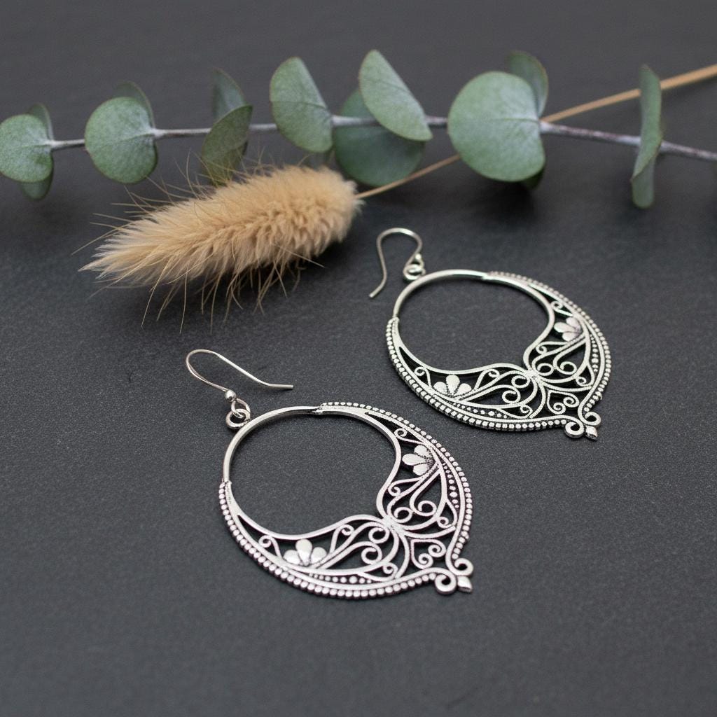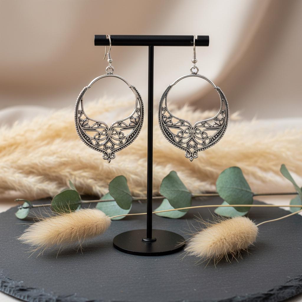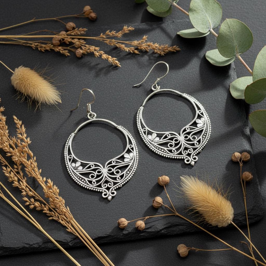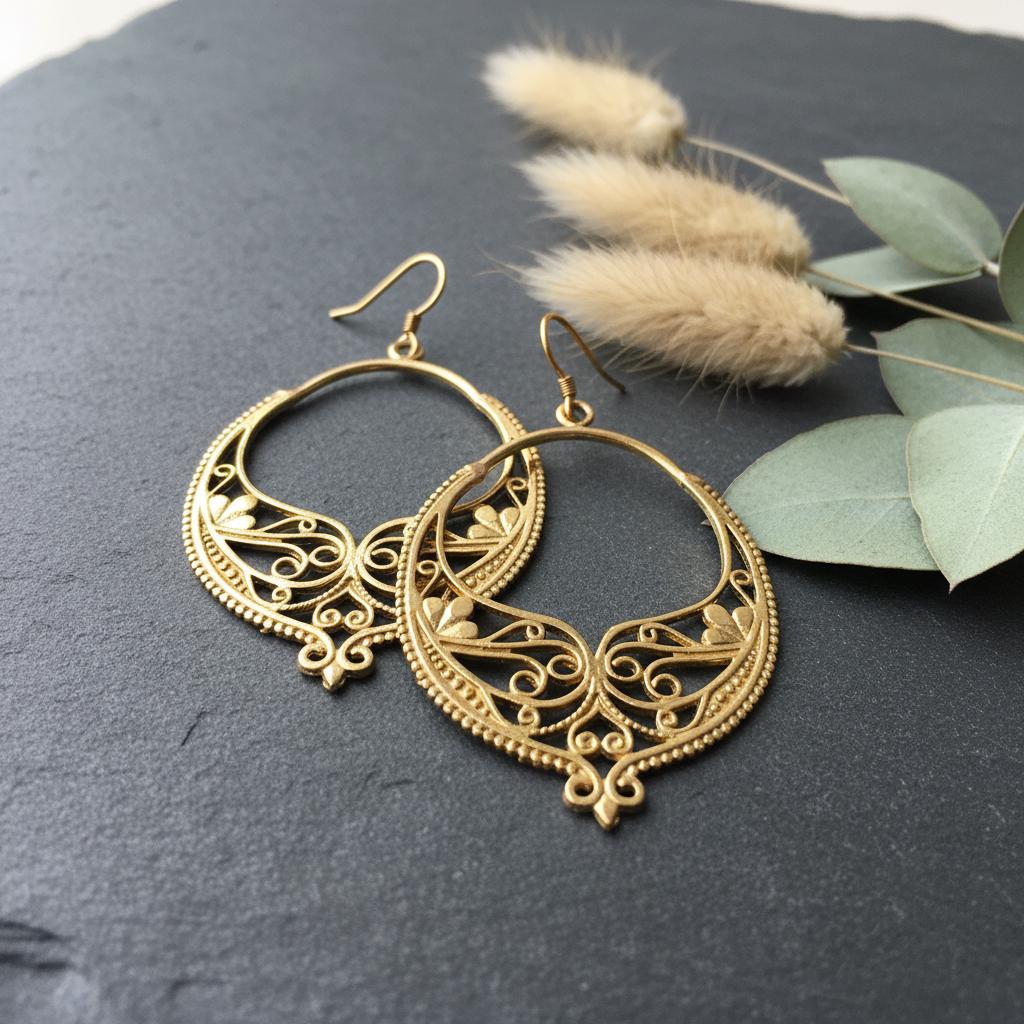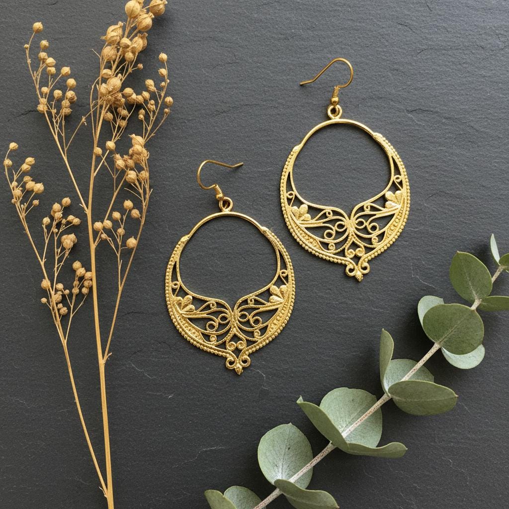 These boho filigree hoop earrings are beautifully crafted from brass and feature an elegant openwork floral and scroll design inspired by oriental and ethnic artistry. The delicate curves and symmetrical detailing give these earrings a refined yet powerful bohemian character.