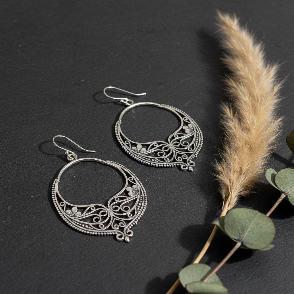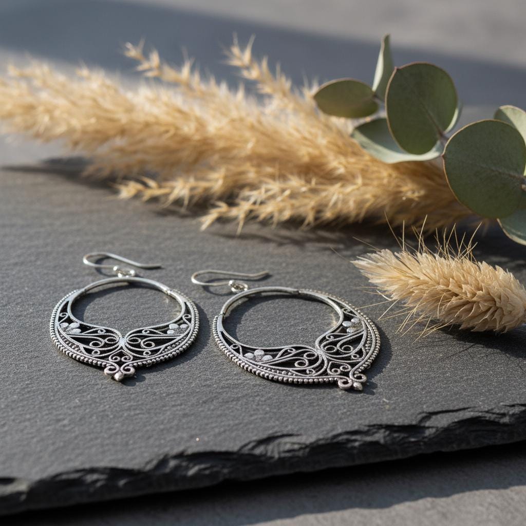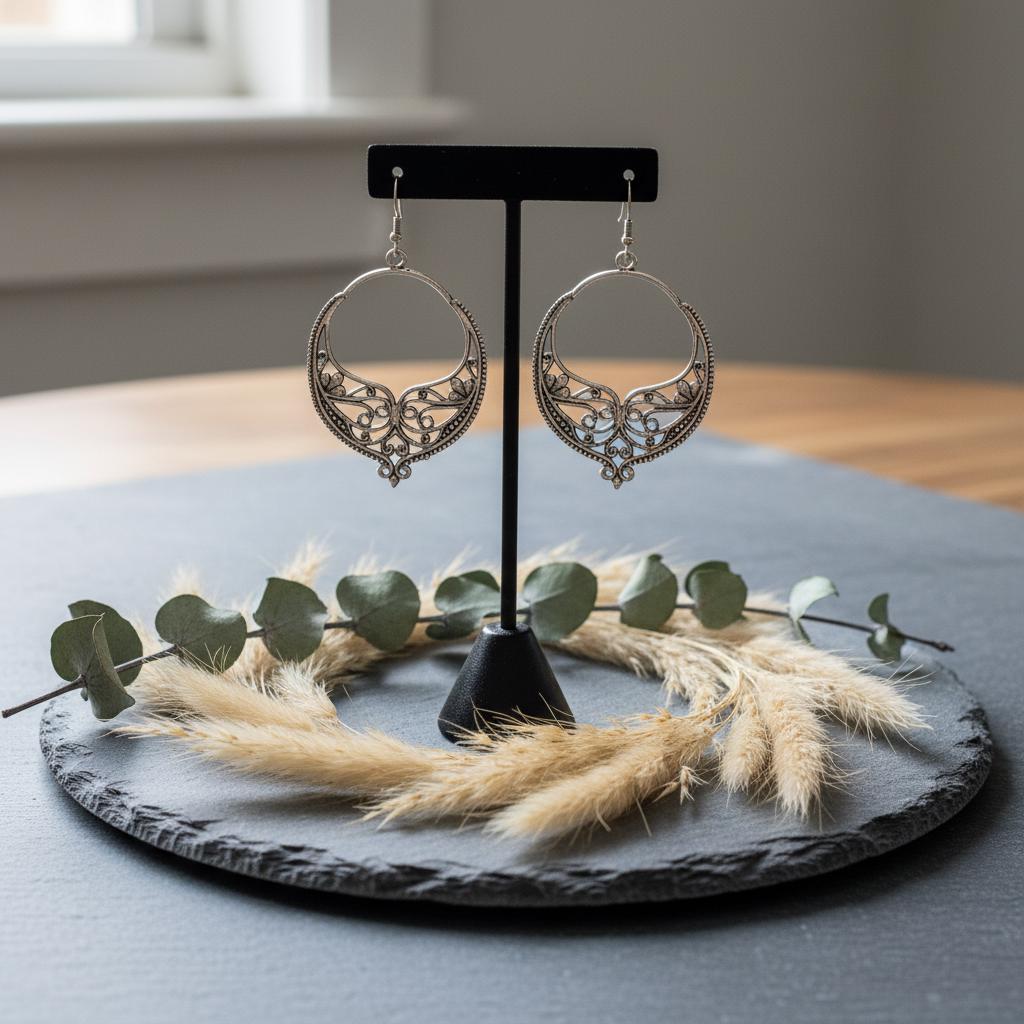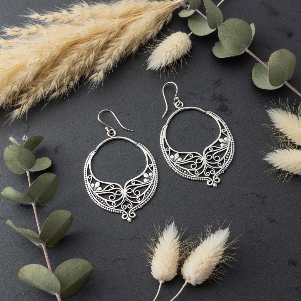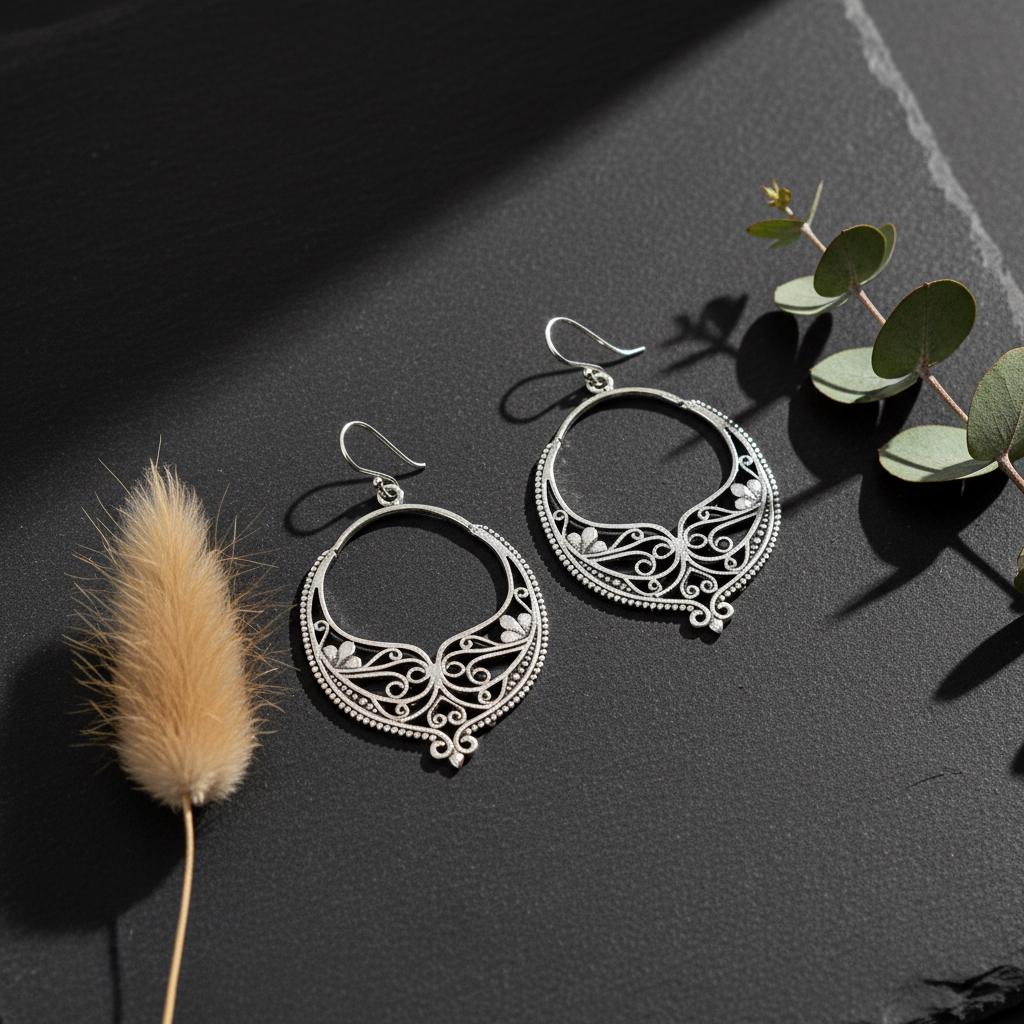 These boho filigree hoop earrings are beautifully crafted from brass and feature an elegant openwork floral and scroll design inspired by oriental and ethnic artistry. The delicate curves and symmetrical detailing give these earrings a refined yet powerful bohemian character.