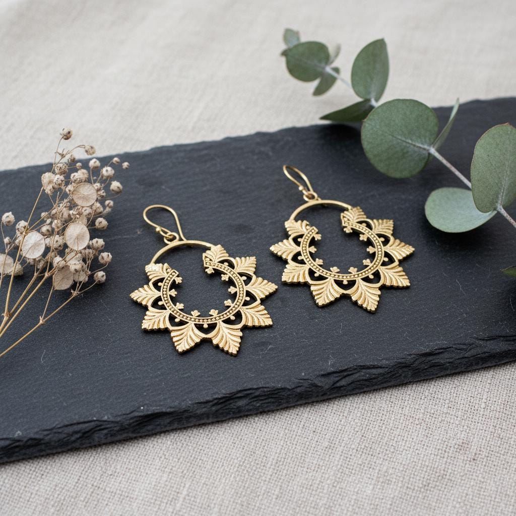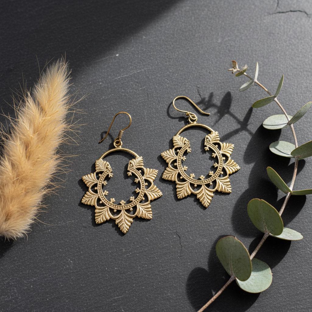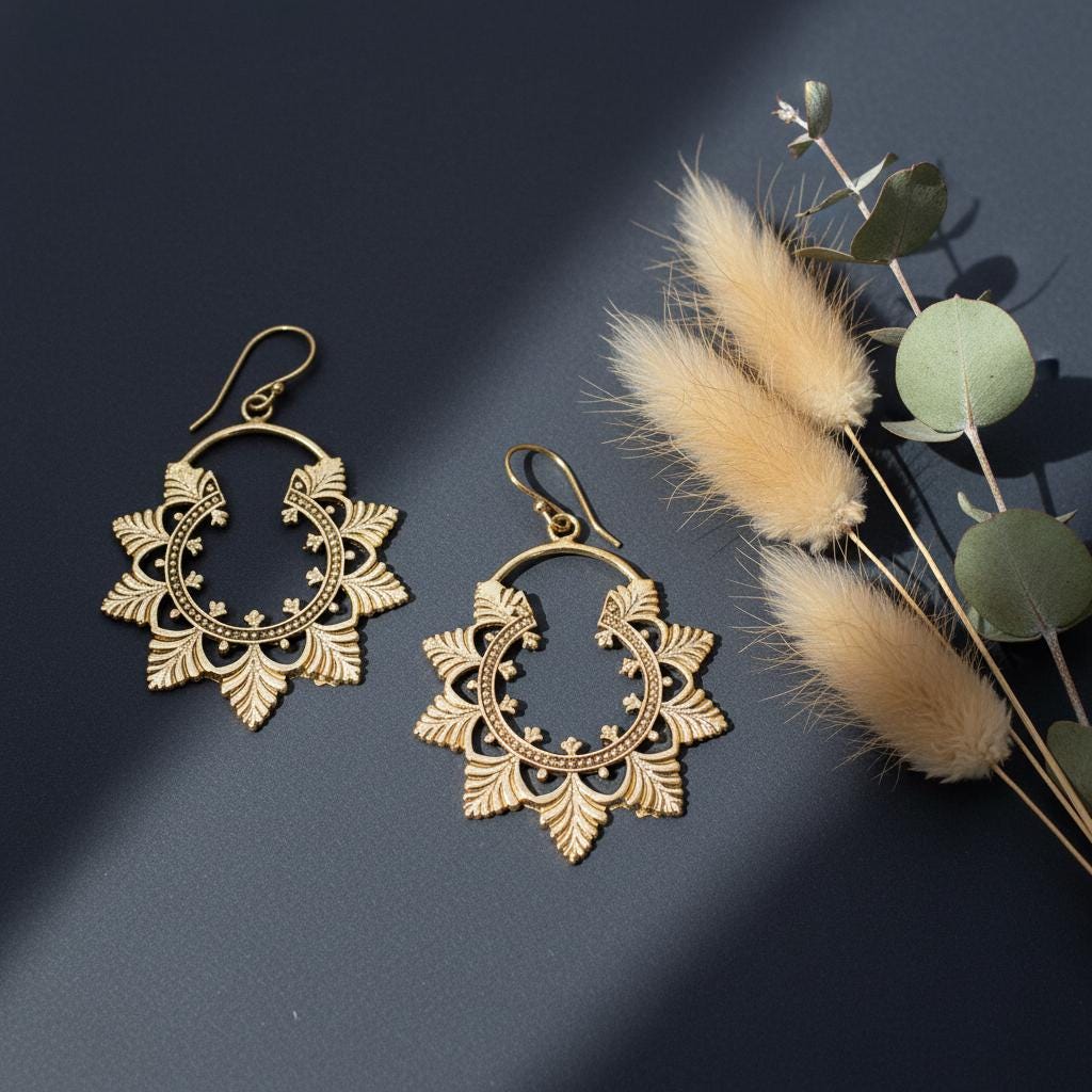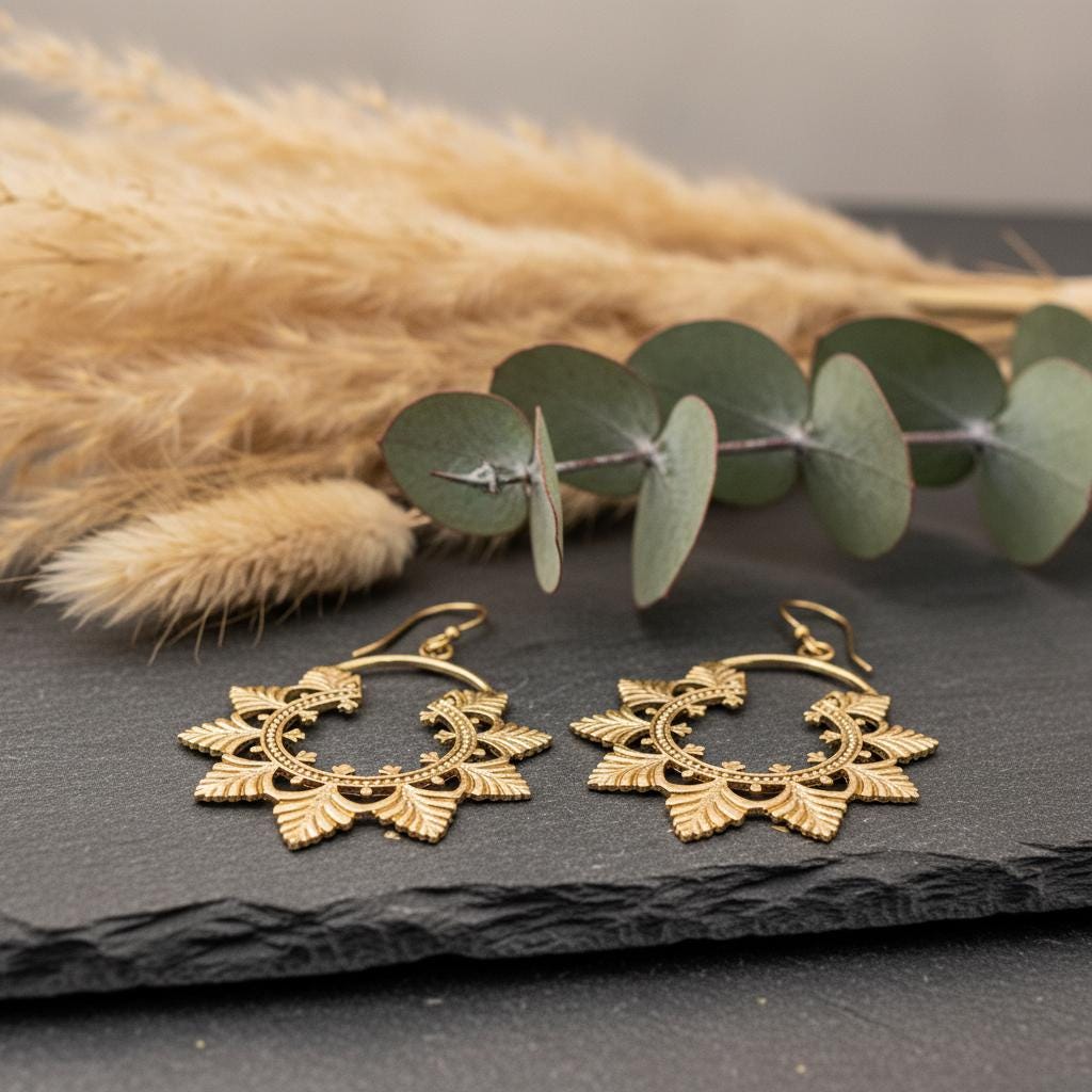 Available in golden or silver tone, they pair beautifully with bohemian outfits, natural fabrics, and vintage-inspired looks. A timeless piece for women drawn to ethnic craftsmanship and nature-inspired brass jewelry.