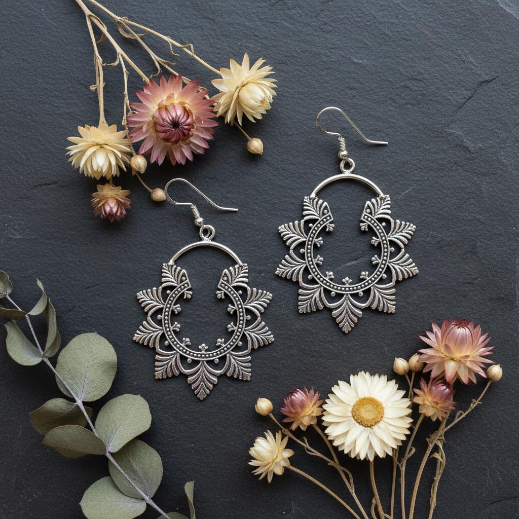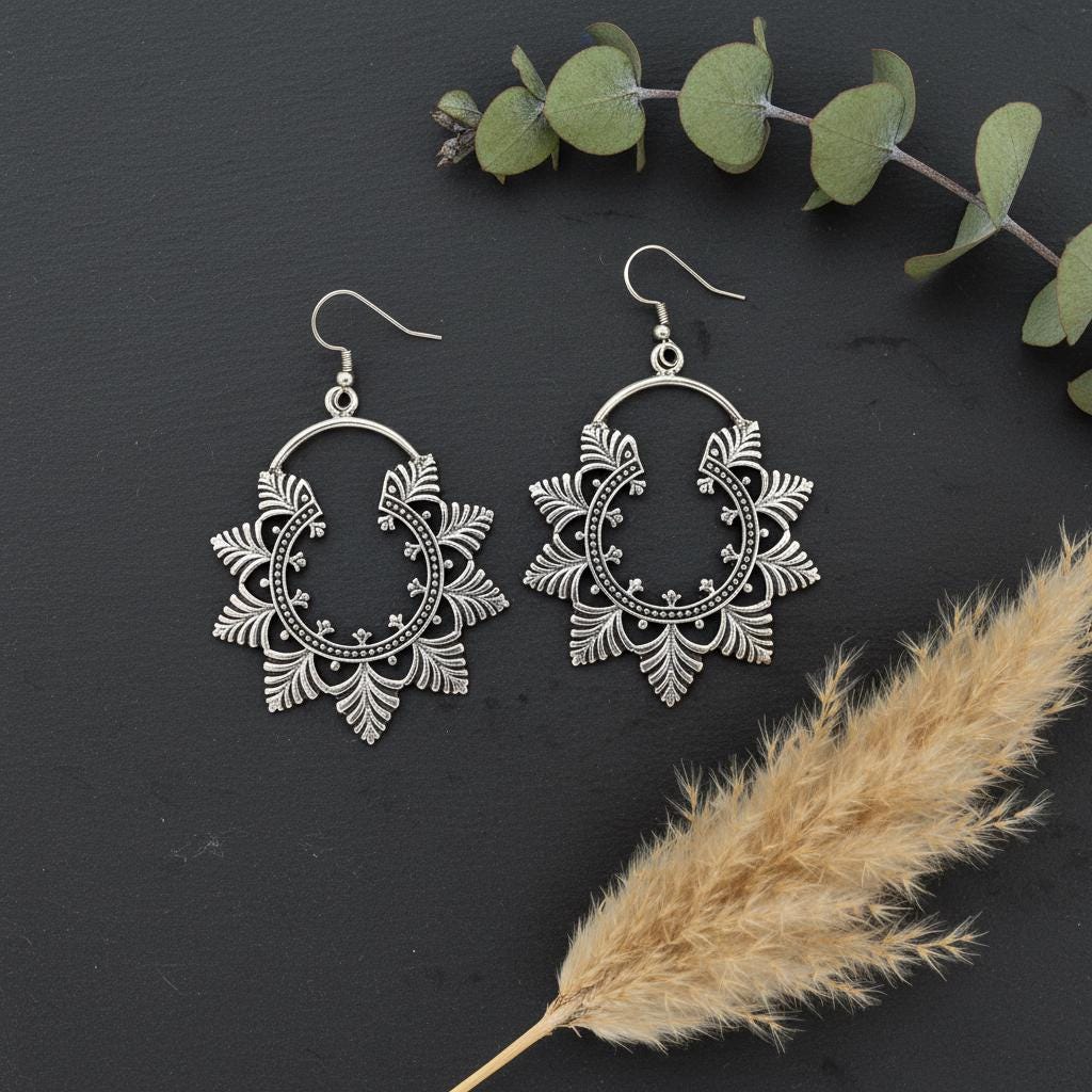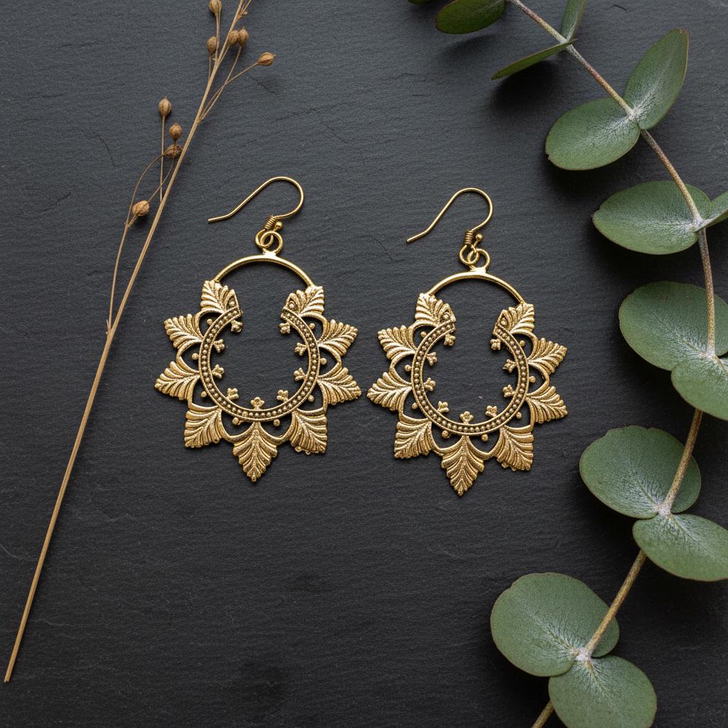 These refined boho leaf filigree earrings are crafted from brass and inspired by nature, oriental patterns, and ethnic artistry. The design features a circular open hoop framed with delicate leaf-shaped filigree motifs, symbolising growth, harmony, and feminine energy.