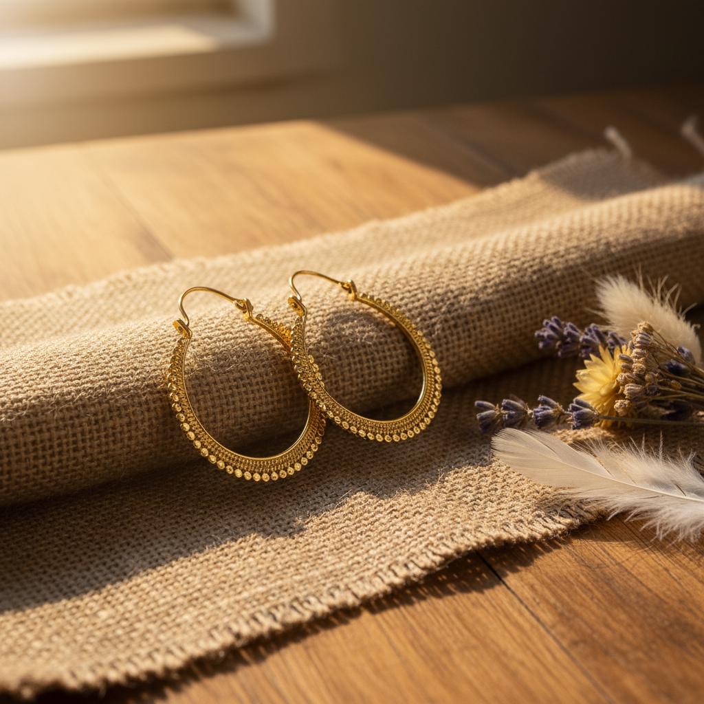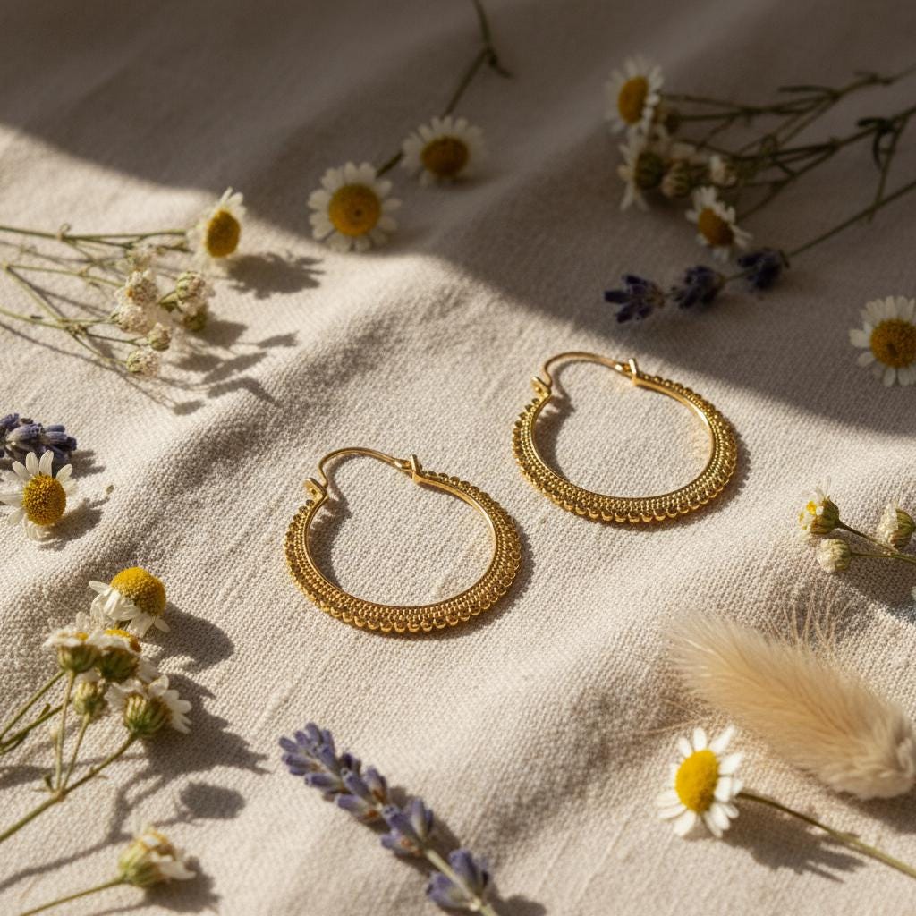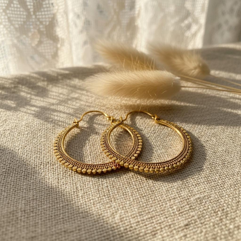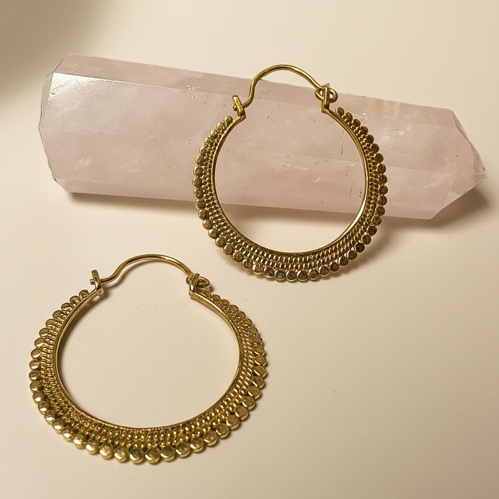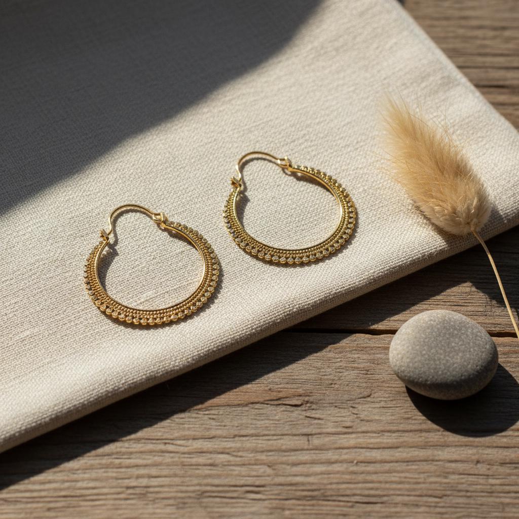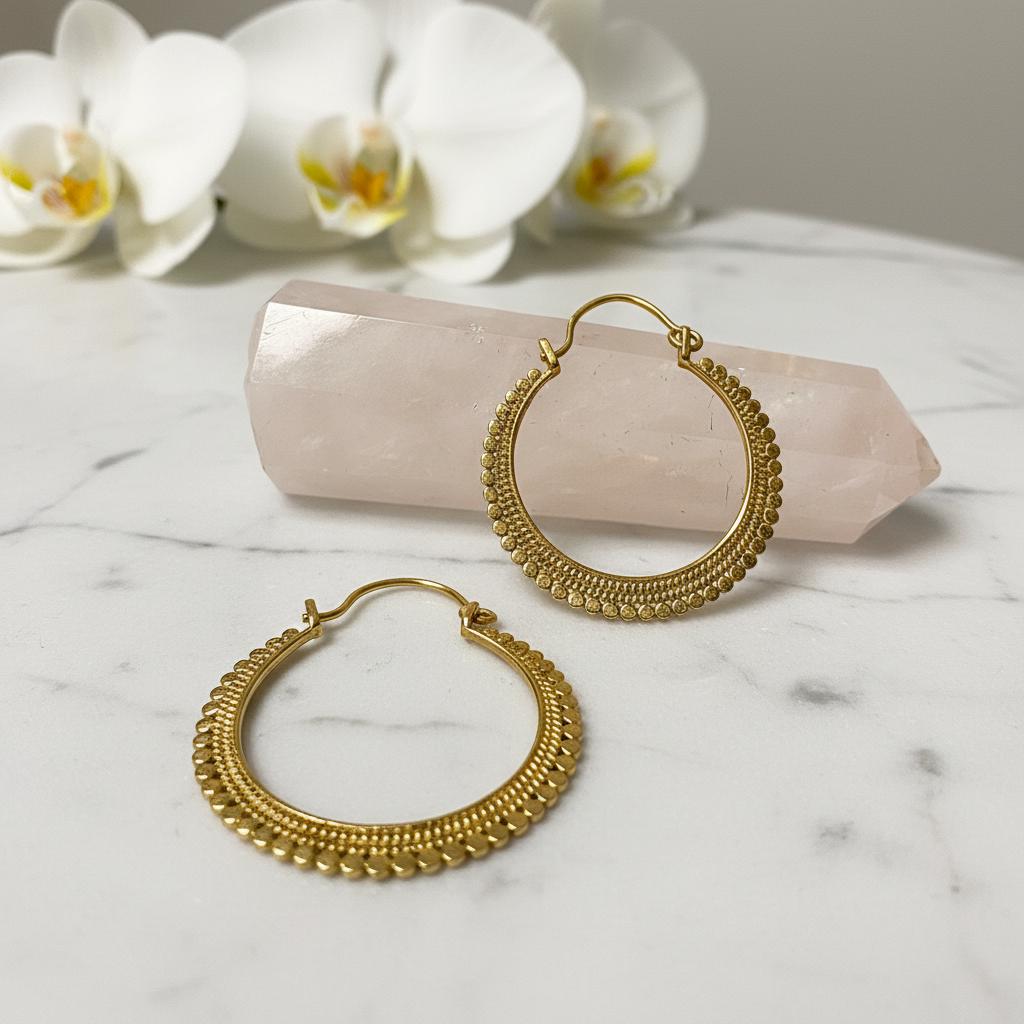 These textured hoop earrings are crafted from solid brass and feature a clean circular form with raised dot detailing carved directly into the metal. The design is inspired by ethnic and artisanal traditions, offering a balance between subtle texture and bold simplicity.