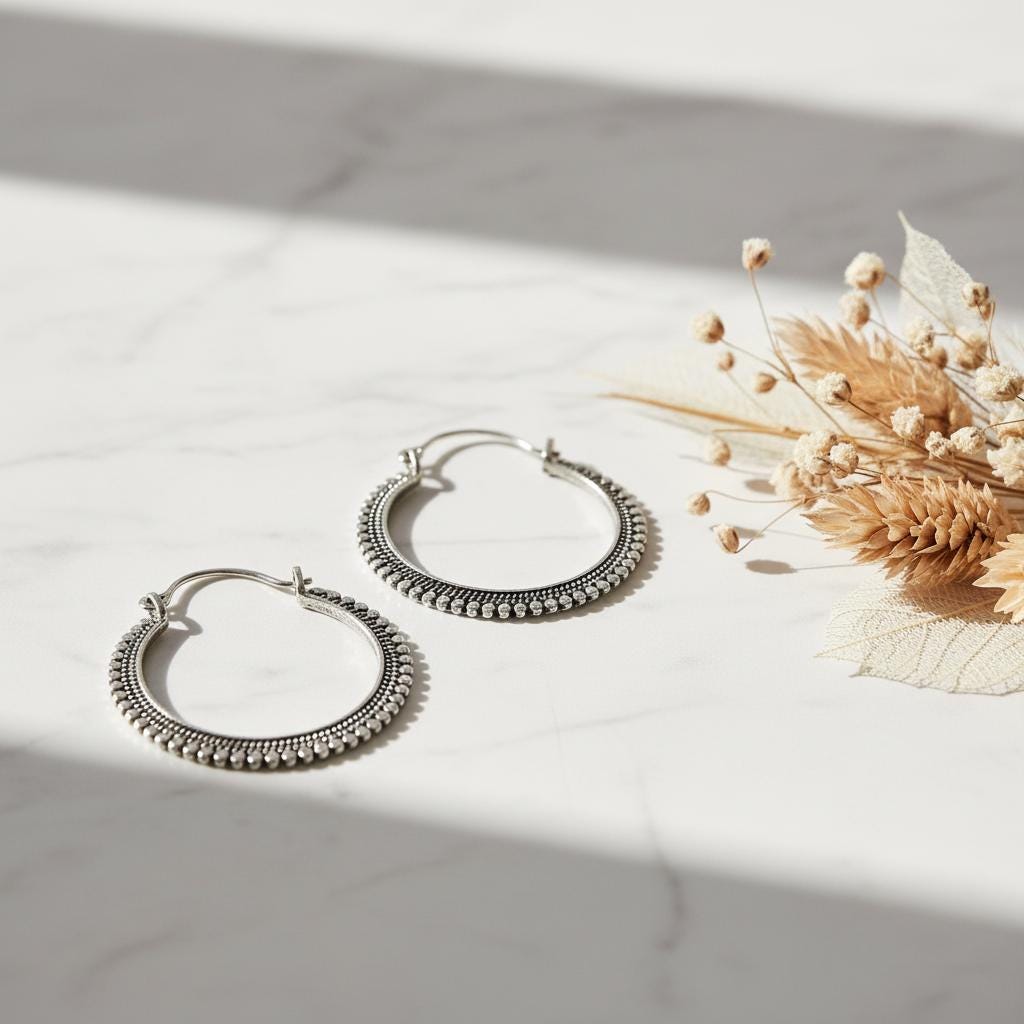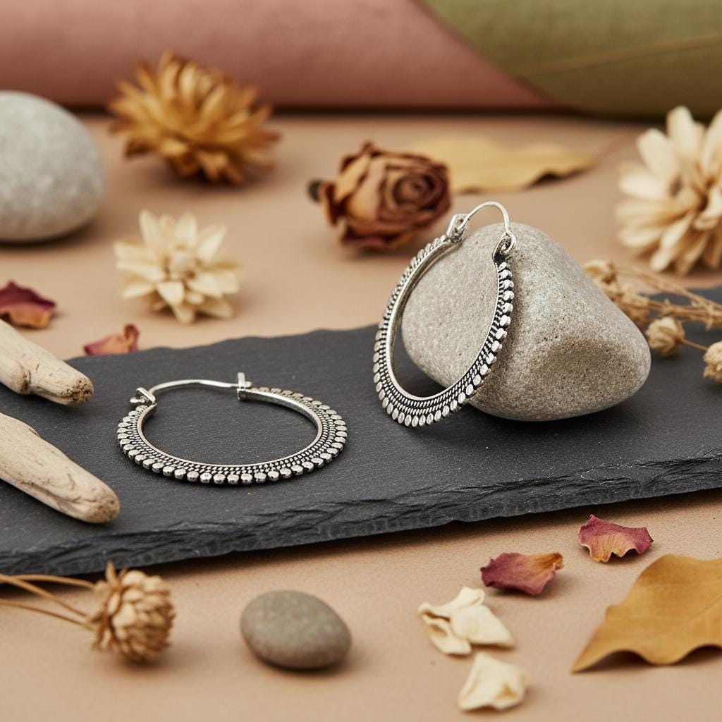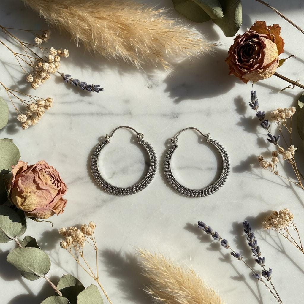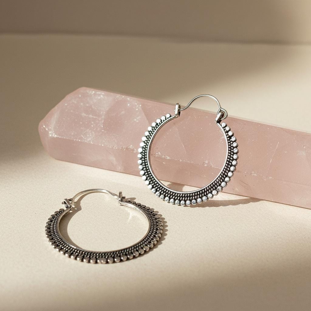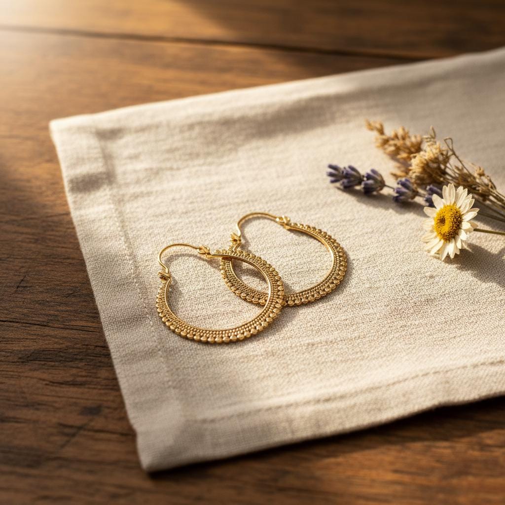 These textured hoop earrings are crafted from solid brass and feature a clean circular form with raised dot detailing carved directly into the metal. The design is inspired by ethnic and artisanal traditions, offering a balance between subtle texture and bold simplicity.