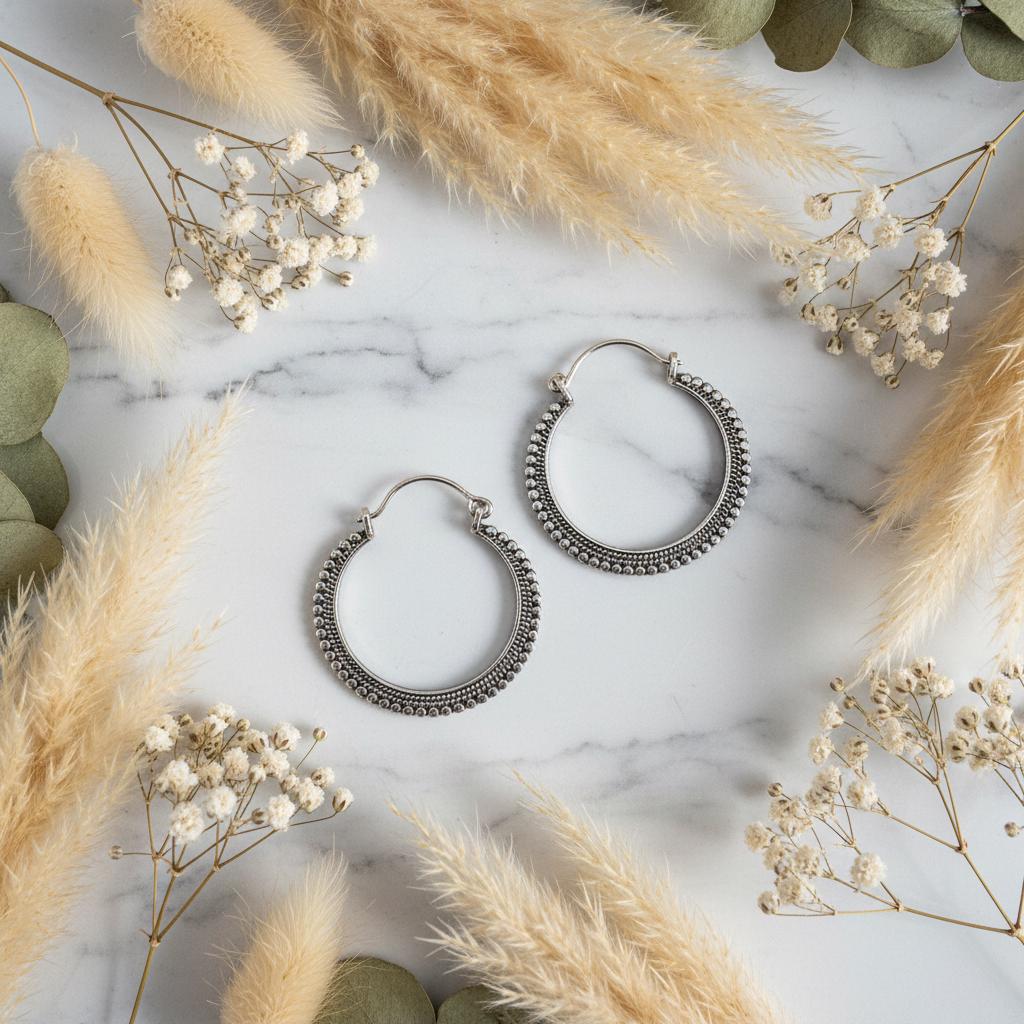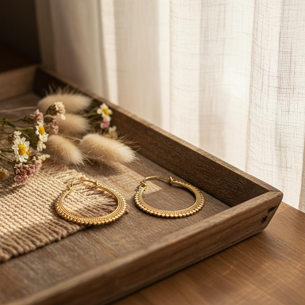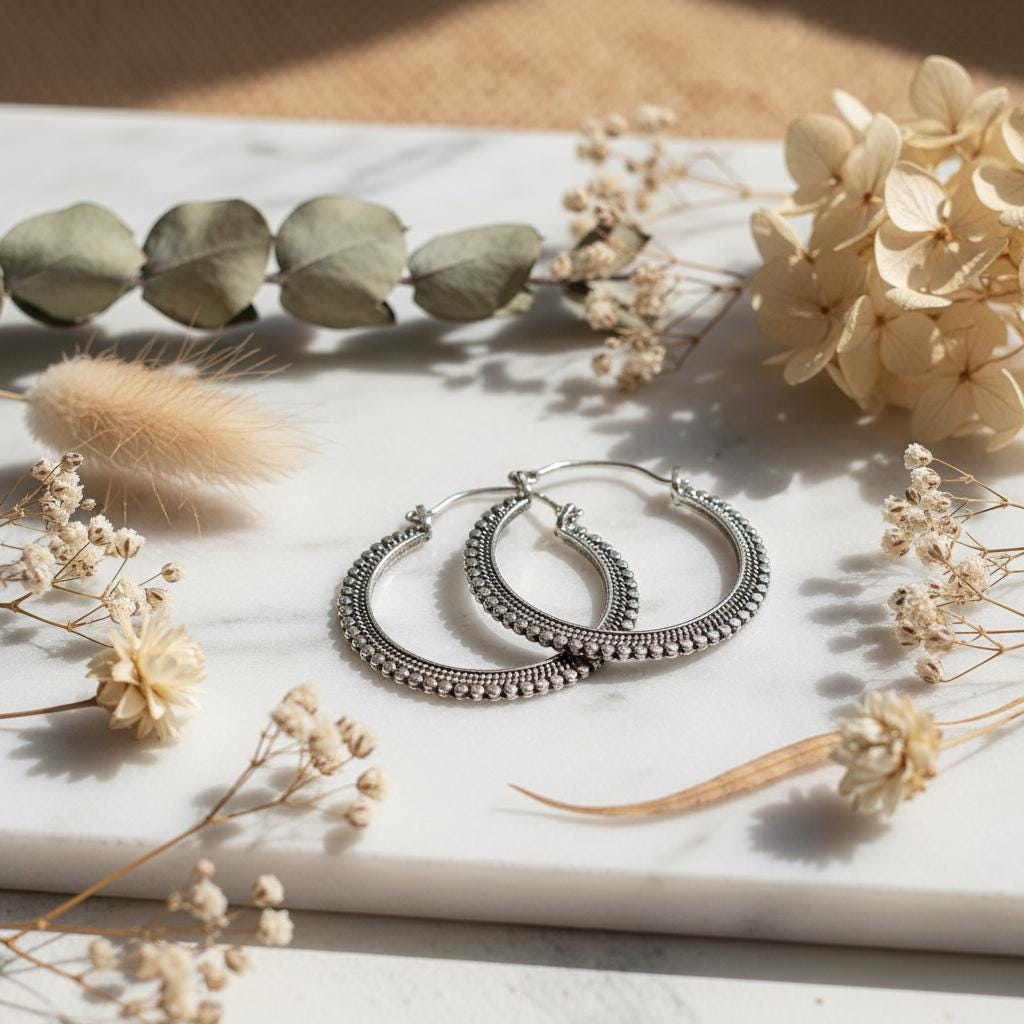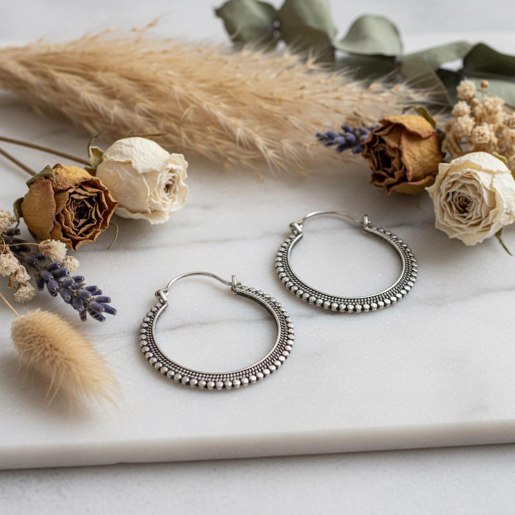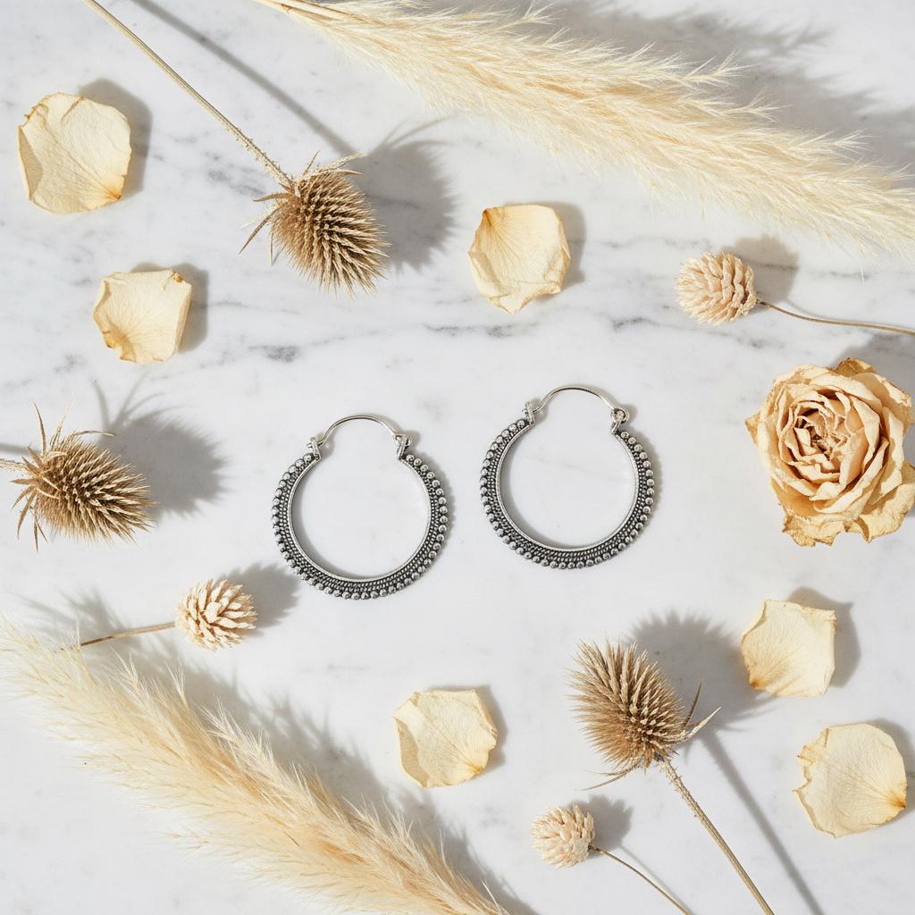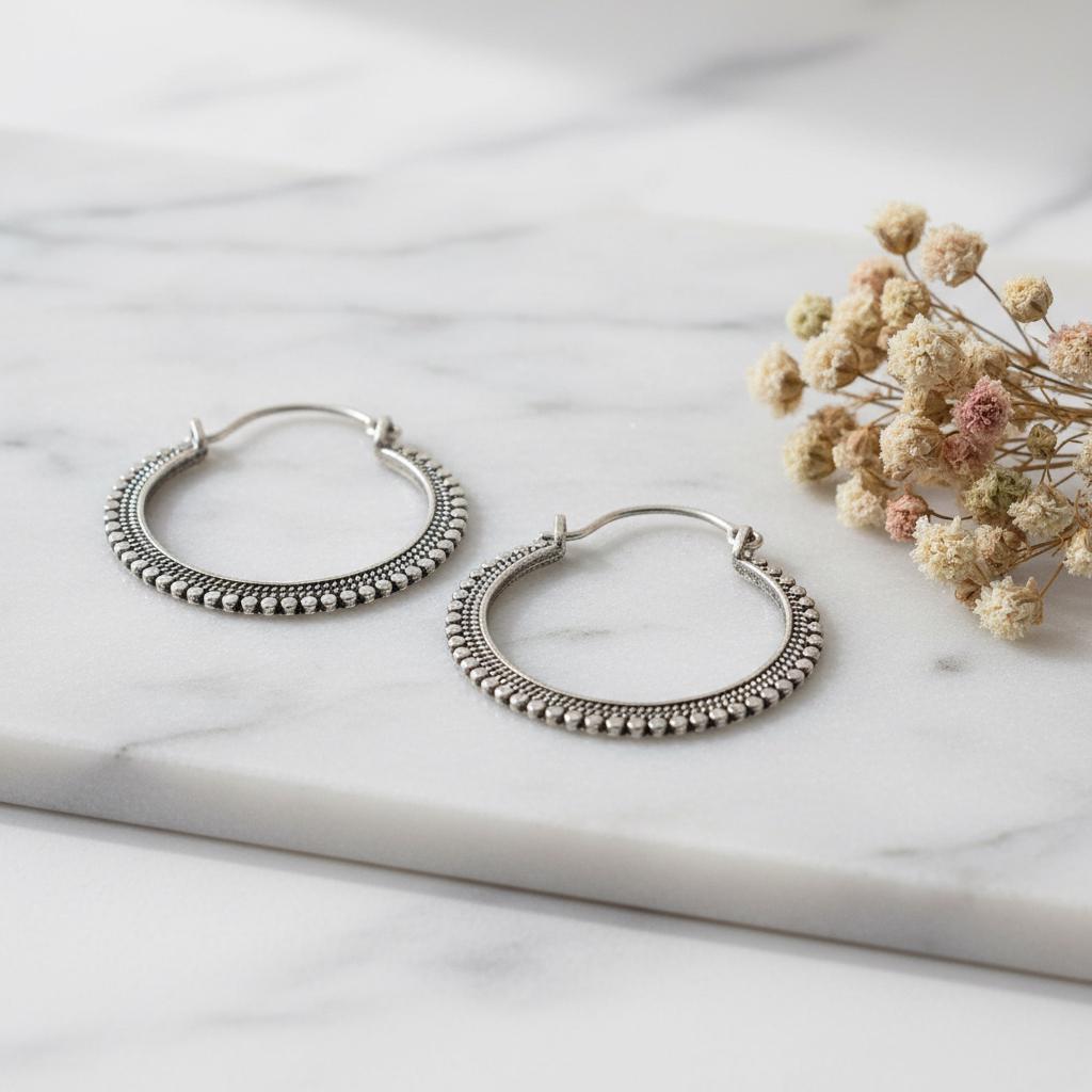 These textured hoop earrings are crafted from solid brass and feature a clean circular form with raised dot detailing carved directly into the metal. The design is inspired by ethnic and artisanal traditions, offering a balance between subtle texture and bold simplicity.
