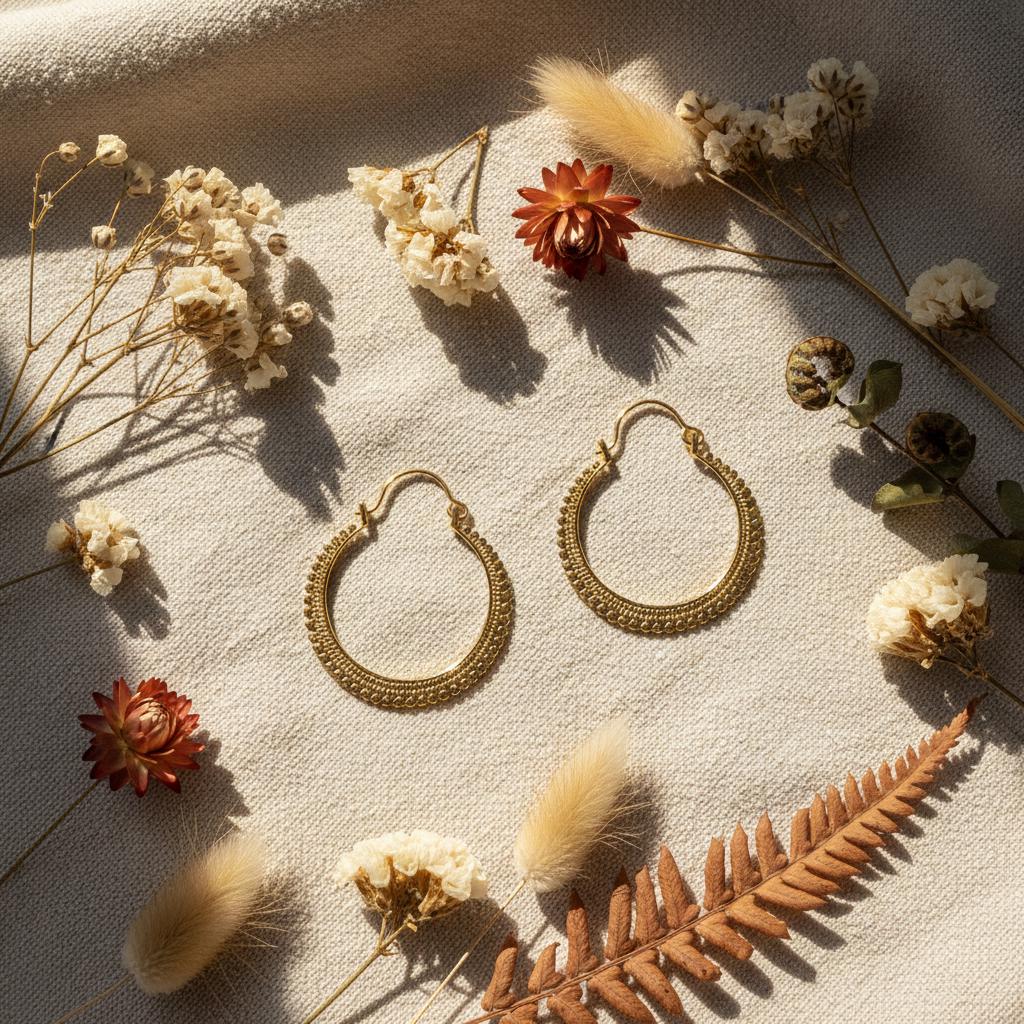 Available in golden tone and silver tone, these solid brass earrings provide two timeless finishes — one warm and radiant, the other cool and refined. The surface texture is part of the brass itself, not applied or beaded, giving the earrings a durable and authentic handcrafted character.