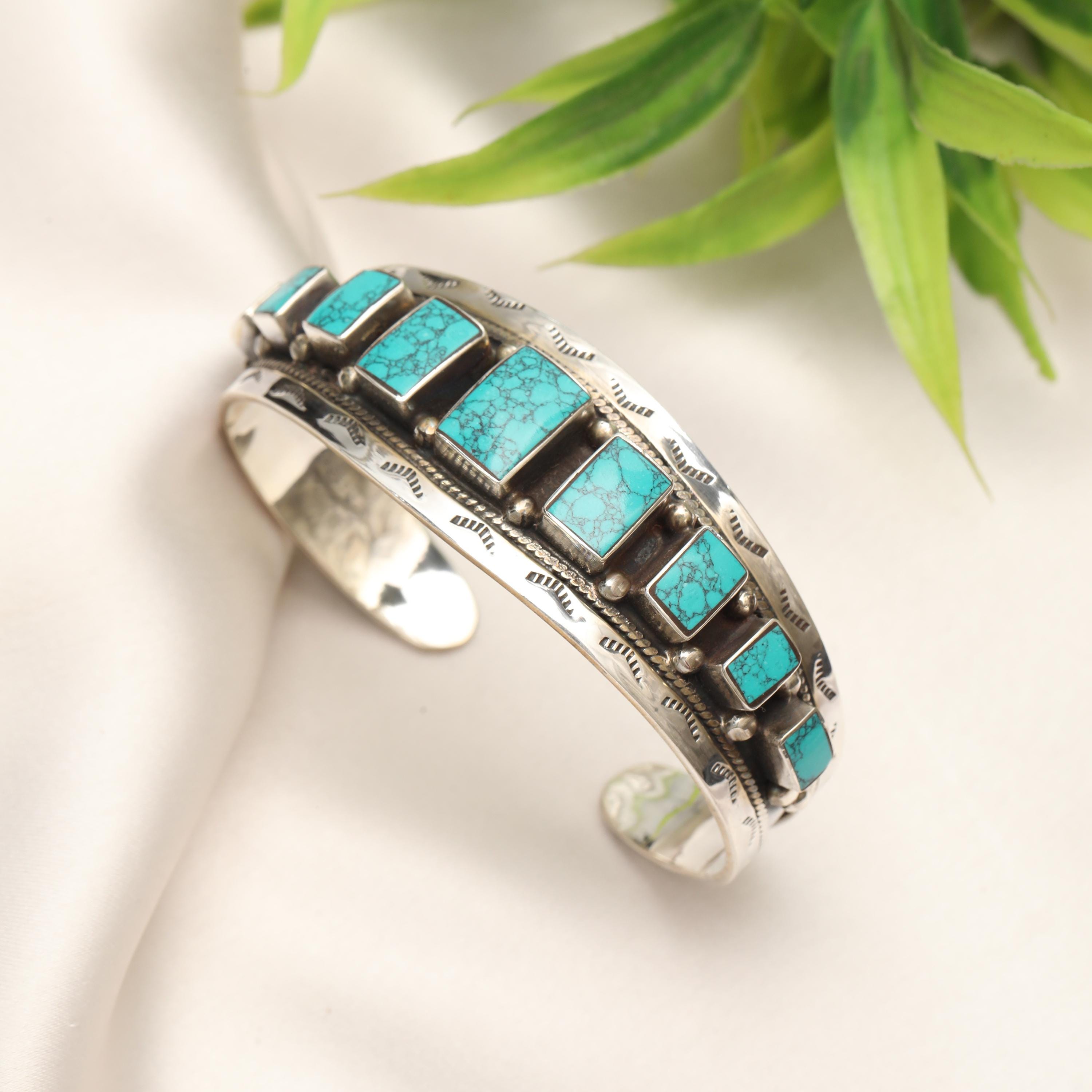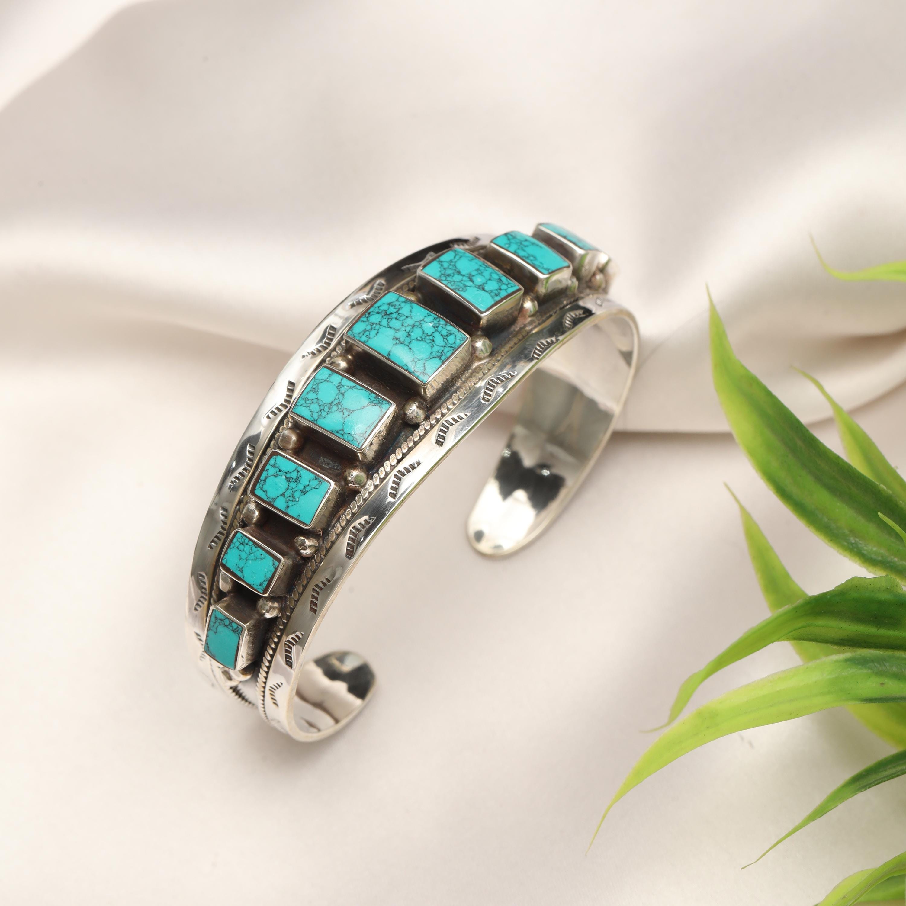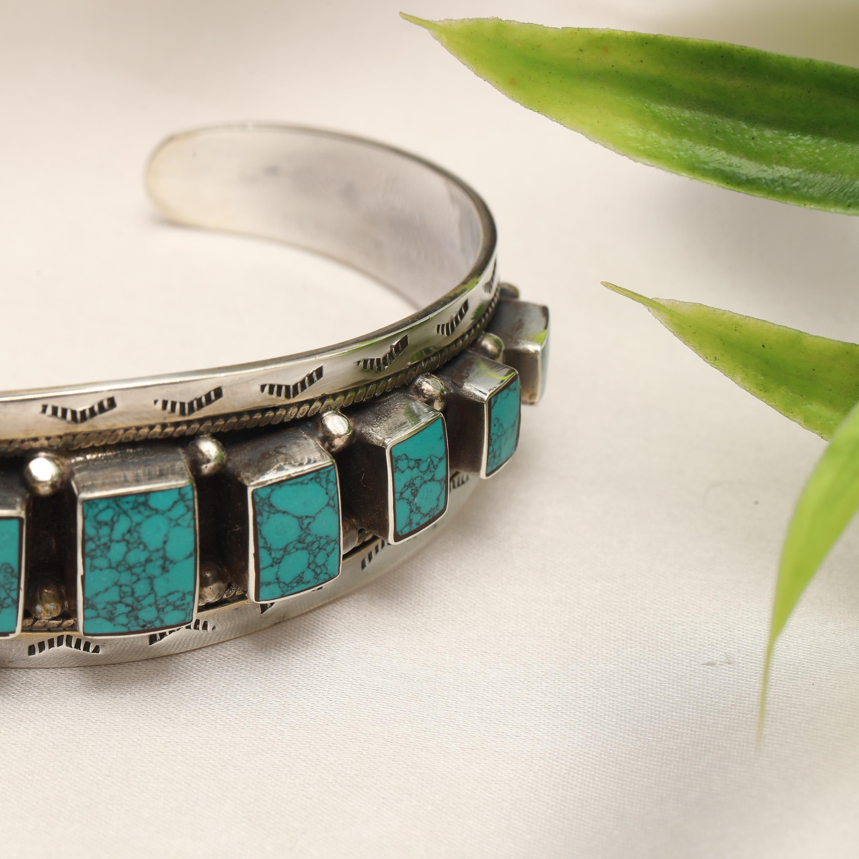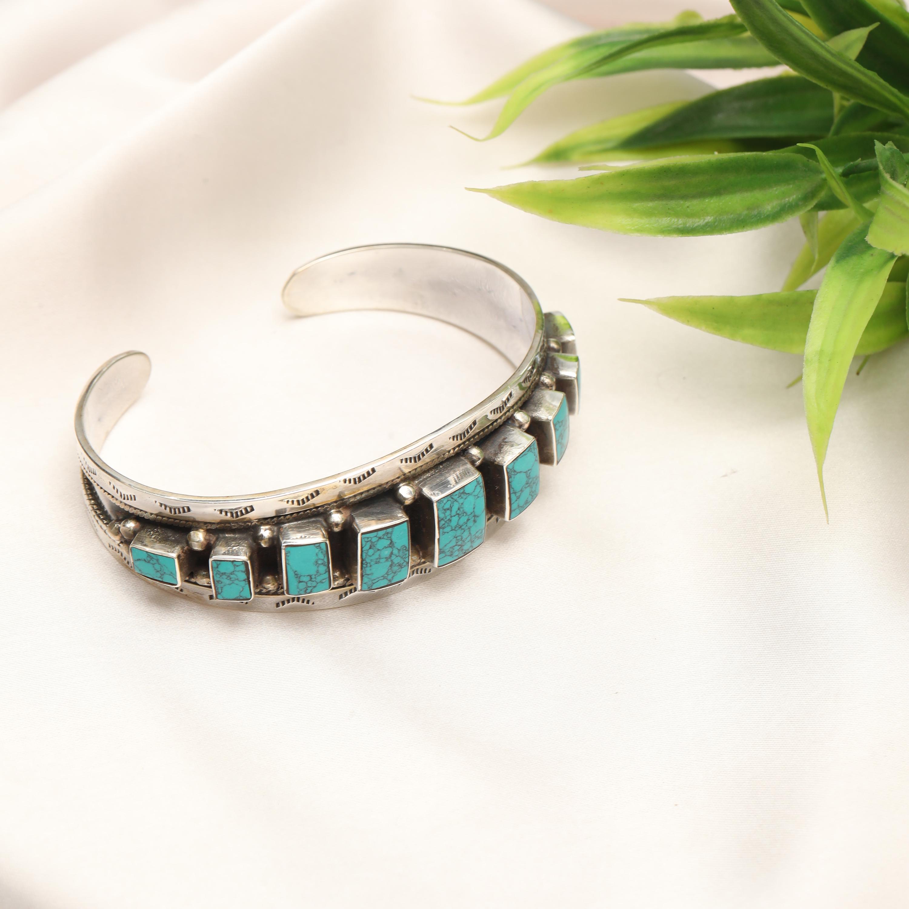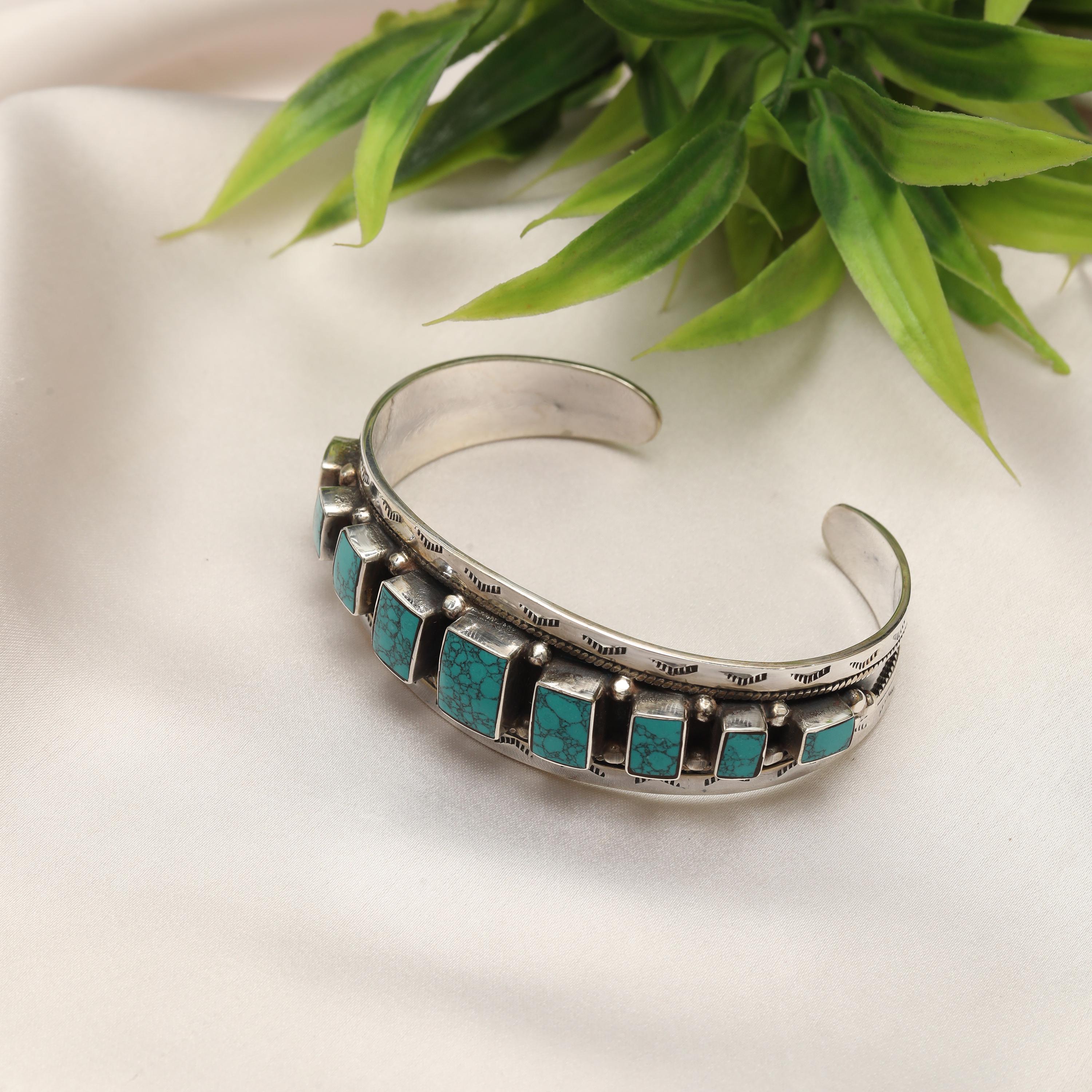 This boho tribal cuff bracelet is a powerful statement piece crafted from solid brass and decorated with a row of rectangular Turquénite stones. Inspired by by Native American, ethnic, oriental, and tribal jewelry traditions, this cuff combines bold geometry with intricate engraved patterns.