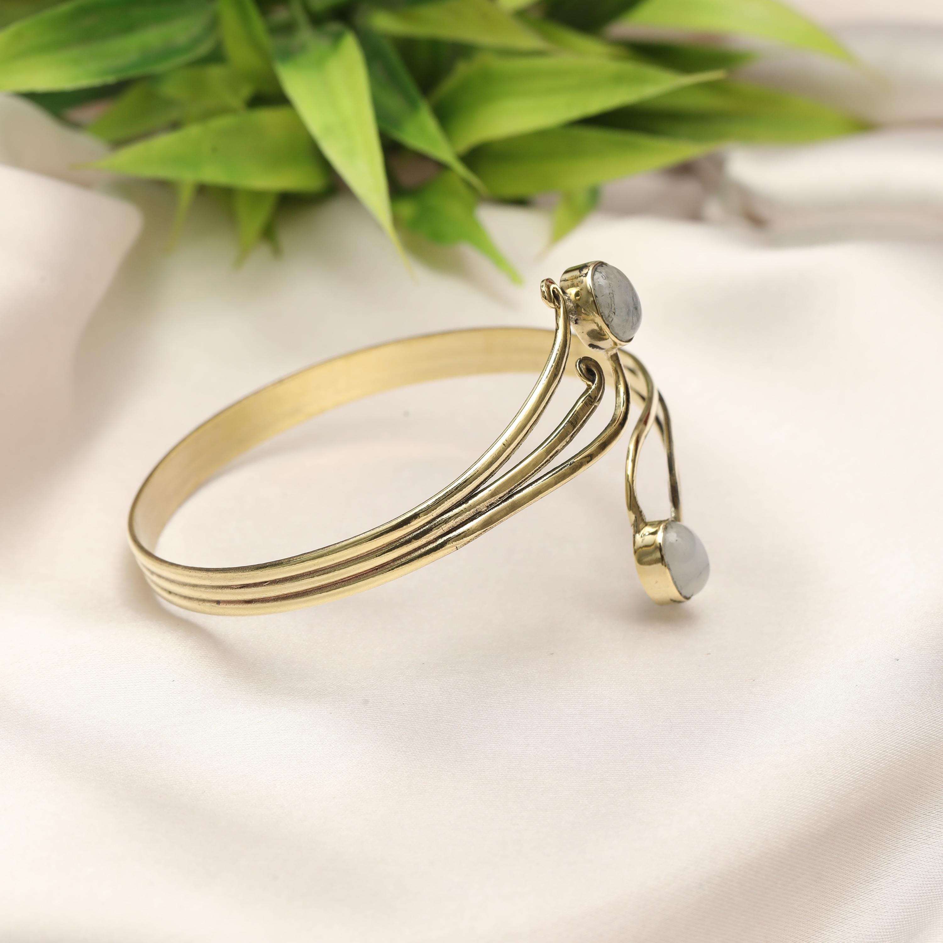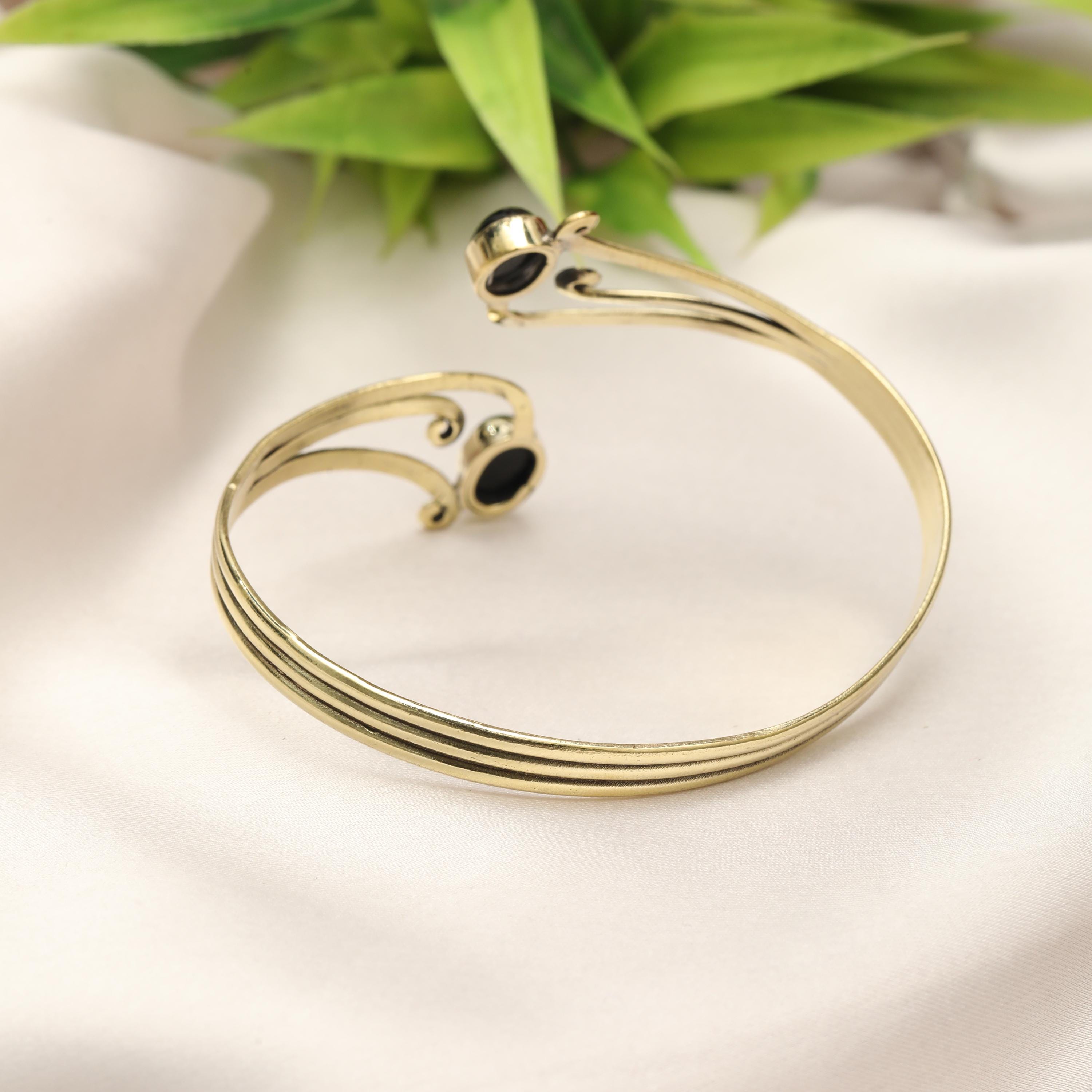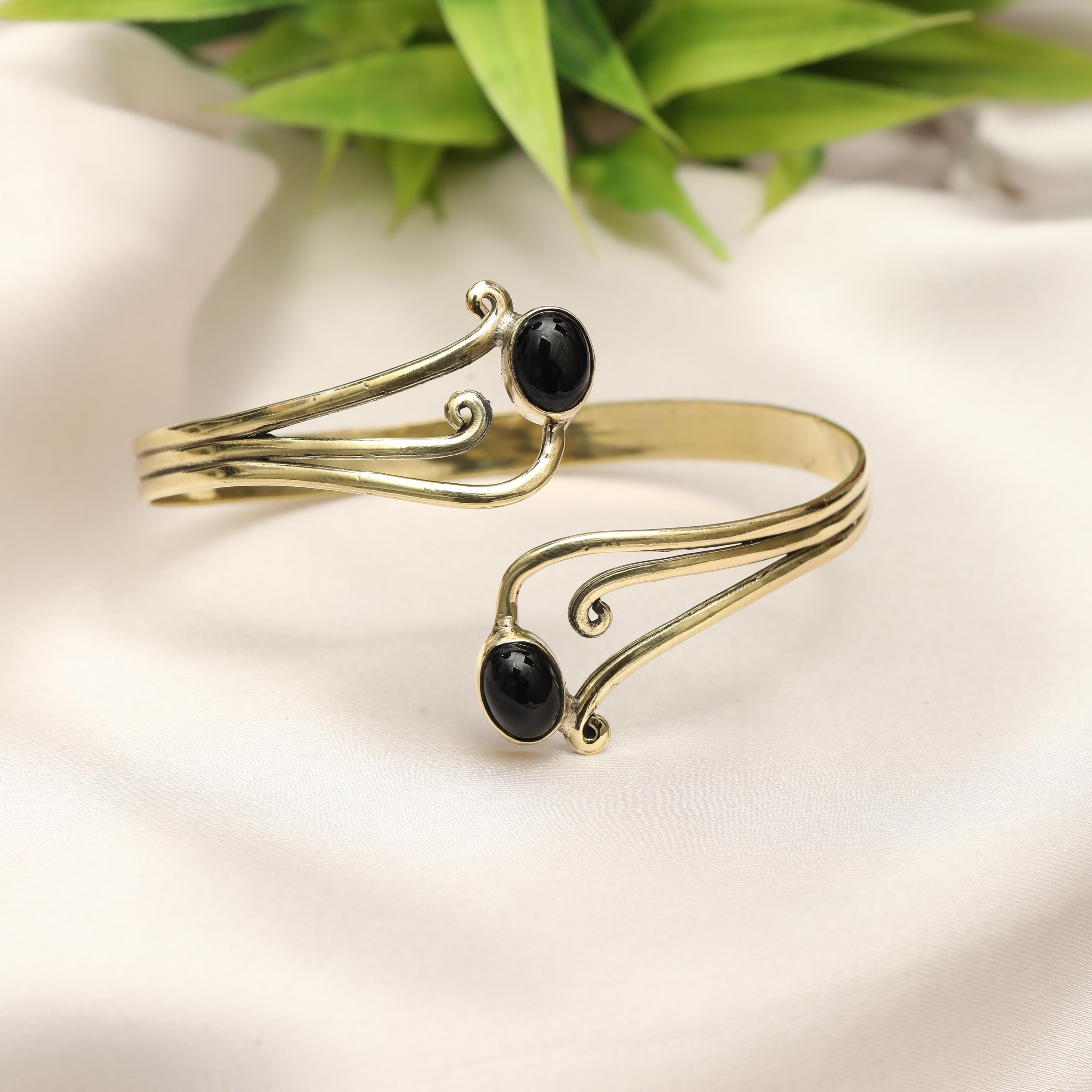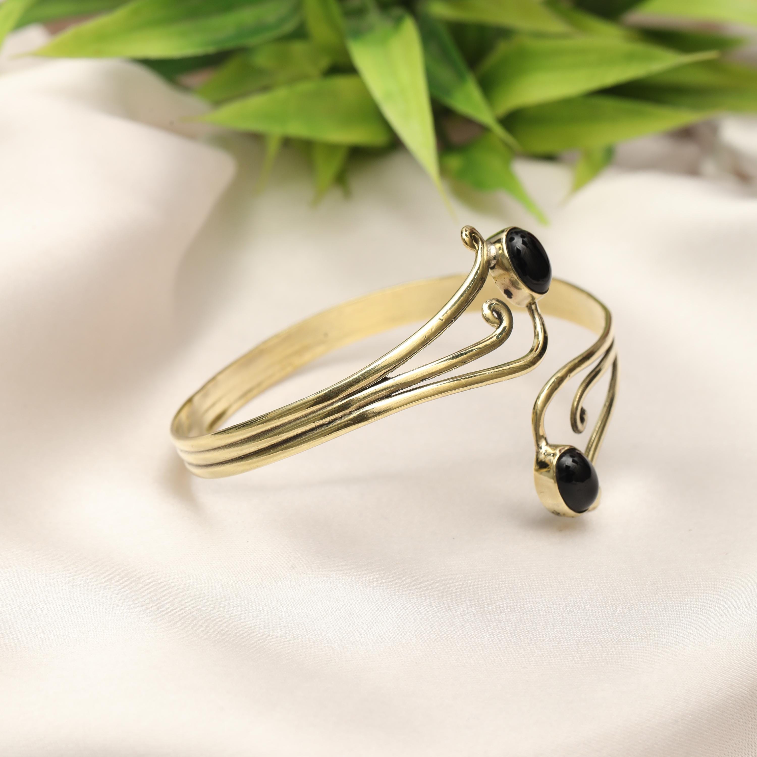 This elegant boho swirl cuff bracelet is crafted from solid brass and designed with flowing, organic curves inspired by tribal and oriental artistry. The open cuff features two balanced stone settings framed by graceful scrollwork, creating a harmonious and feminine statement piece.