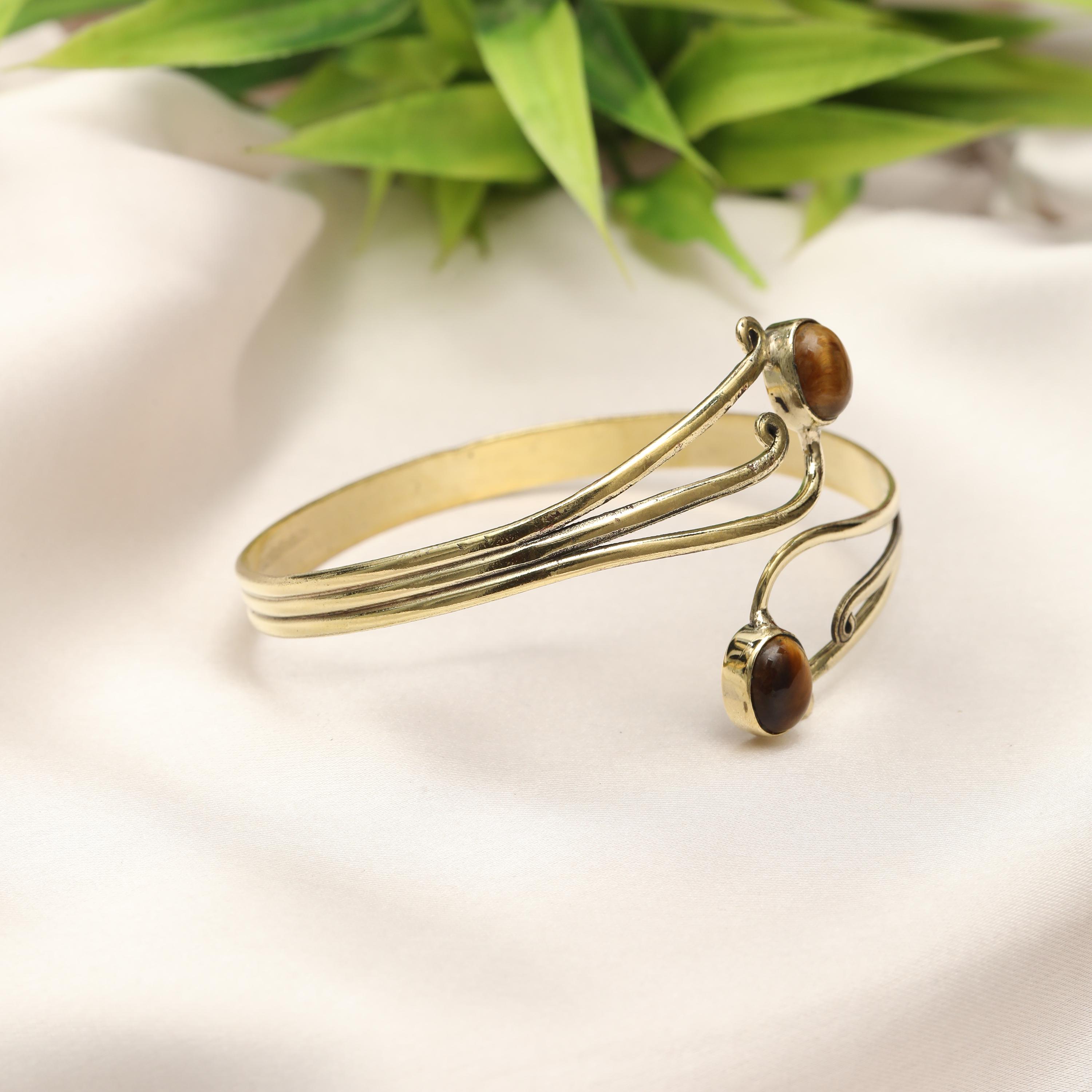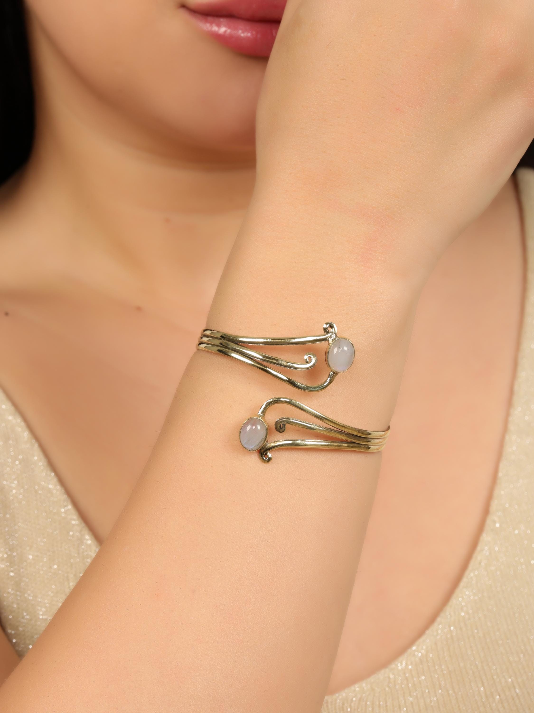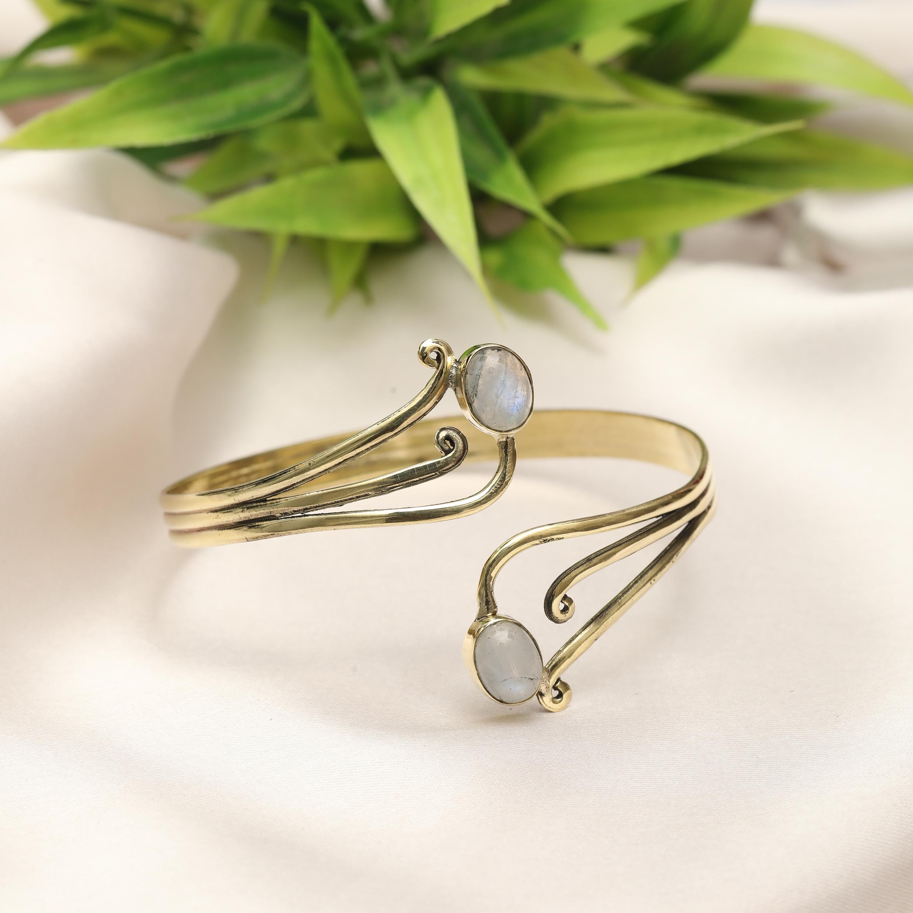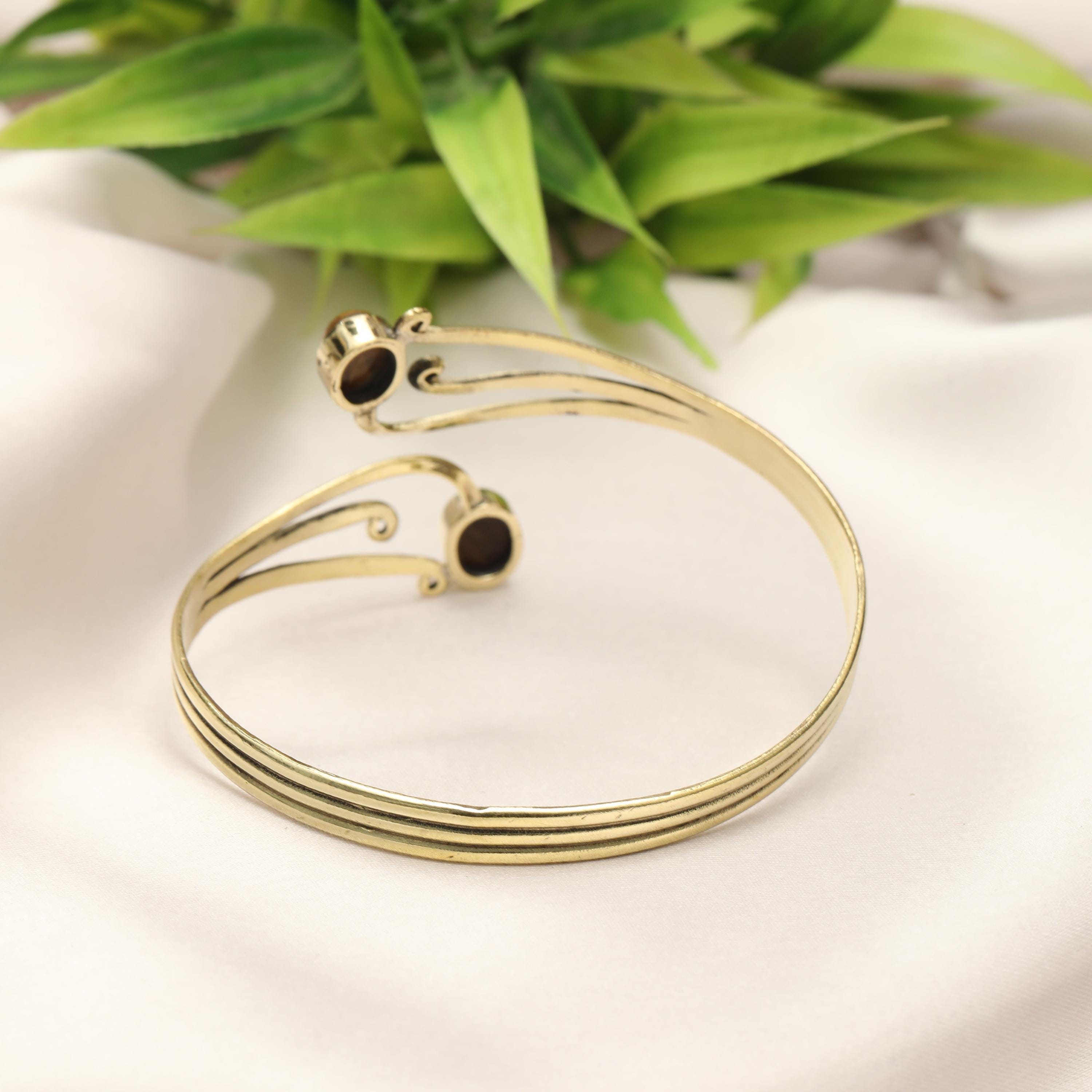 This elegant boho swirl cuff bracelet is crafted from solid brass and designed with flowing, organic curves inspired by tribal and oriental artistry. The open cuff features two balanced stone settings framed by graceful scrollwork, creating a harmonious and feminine statement piece.