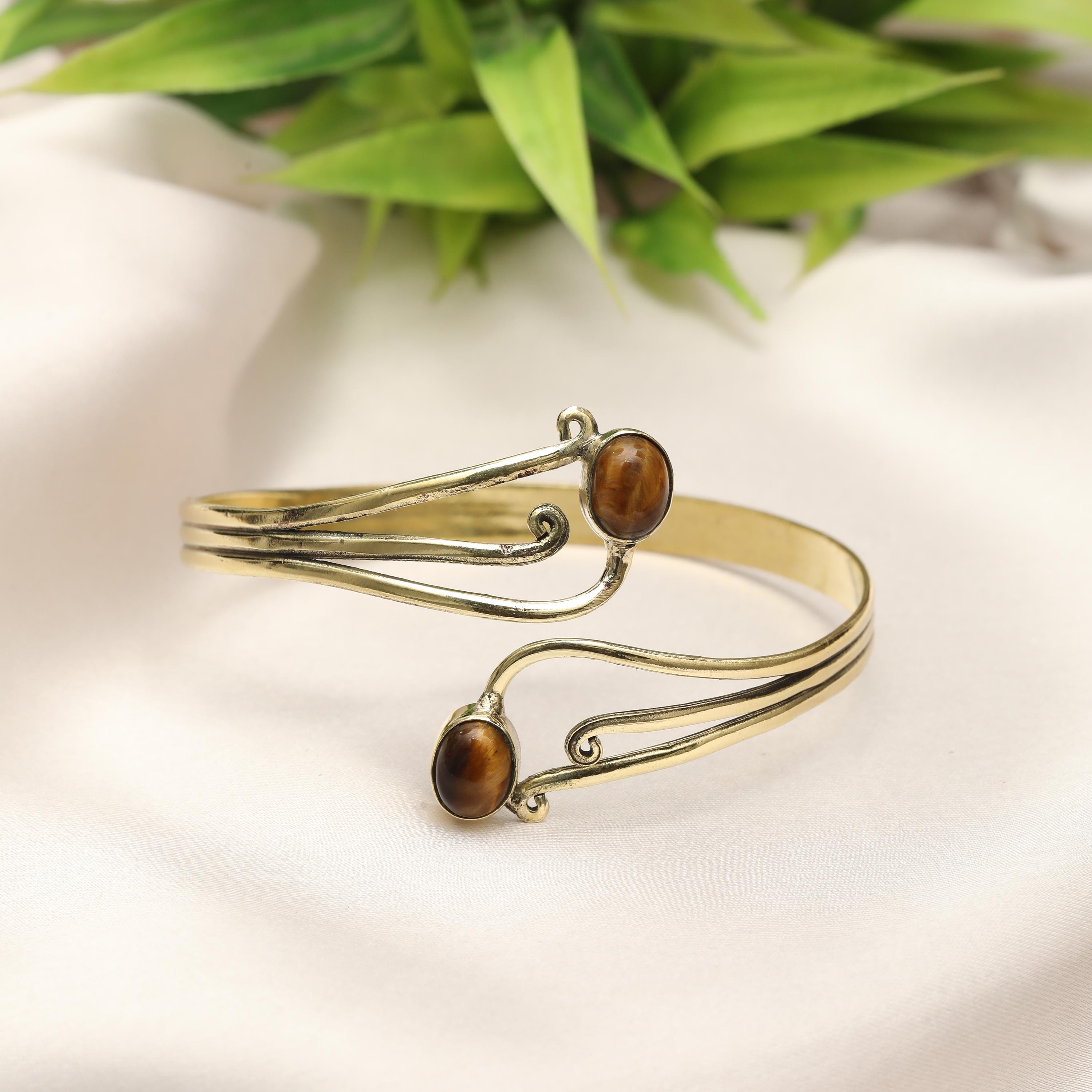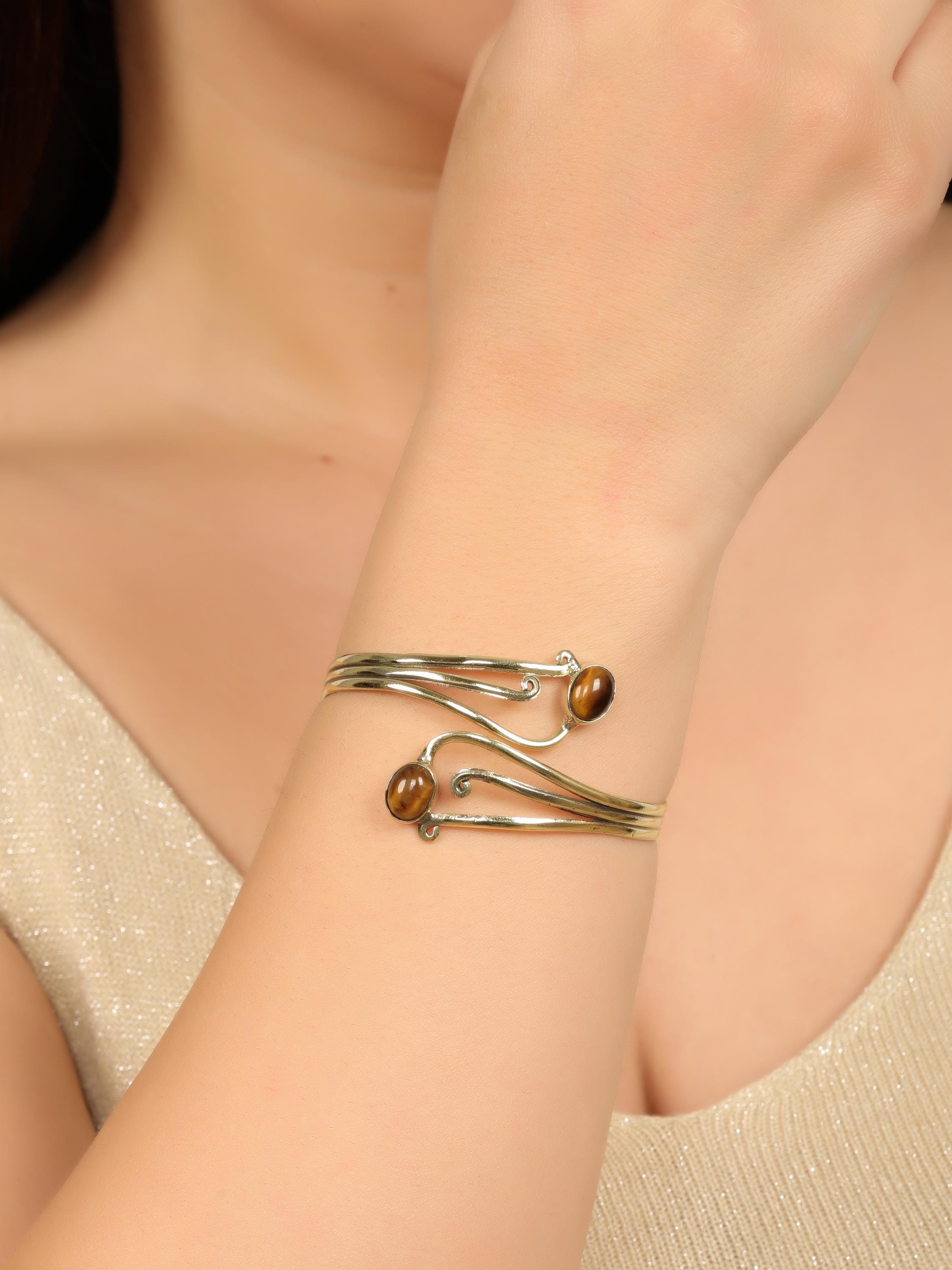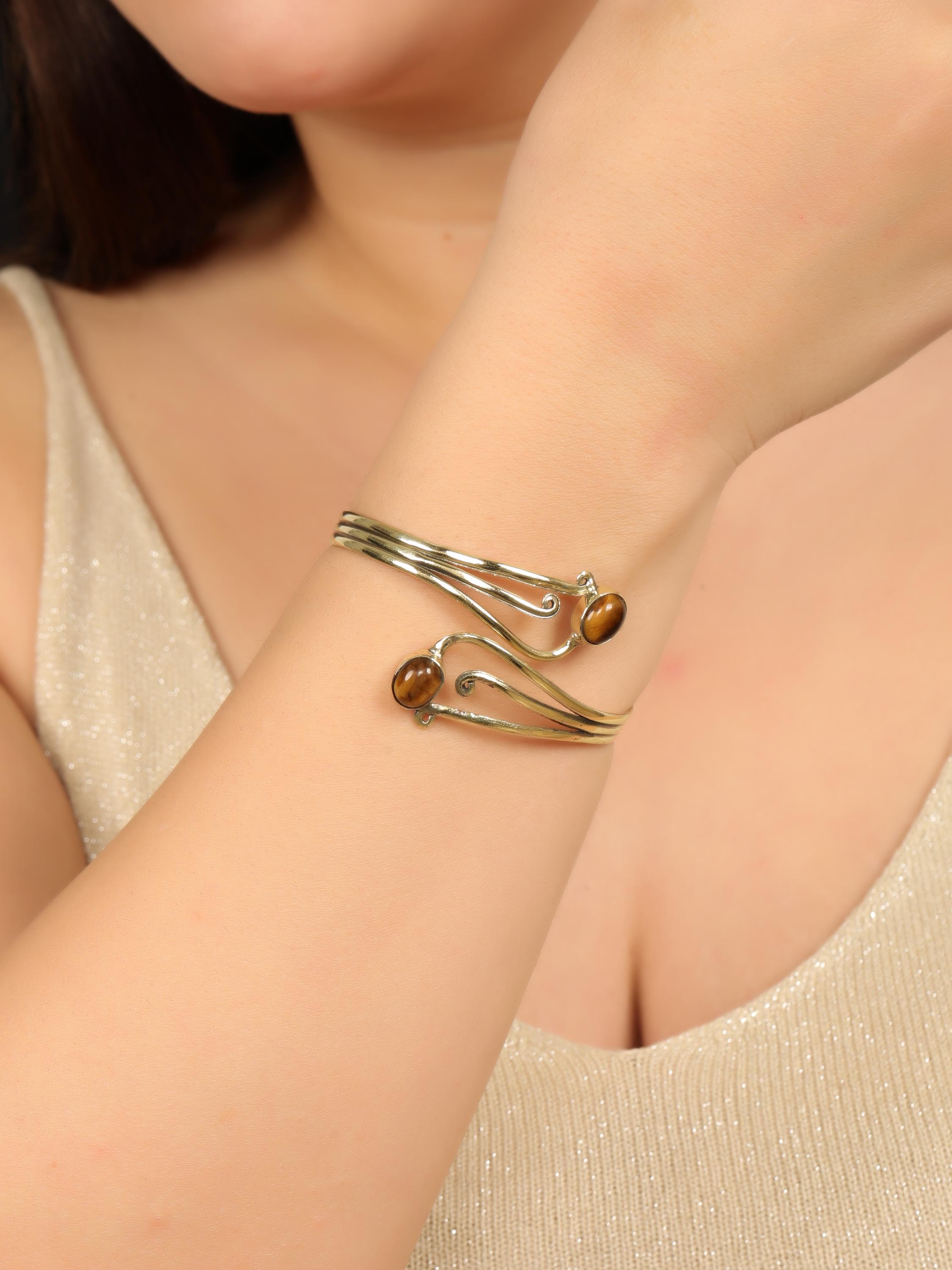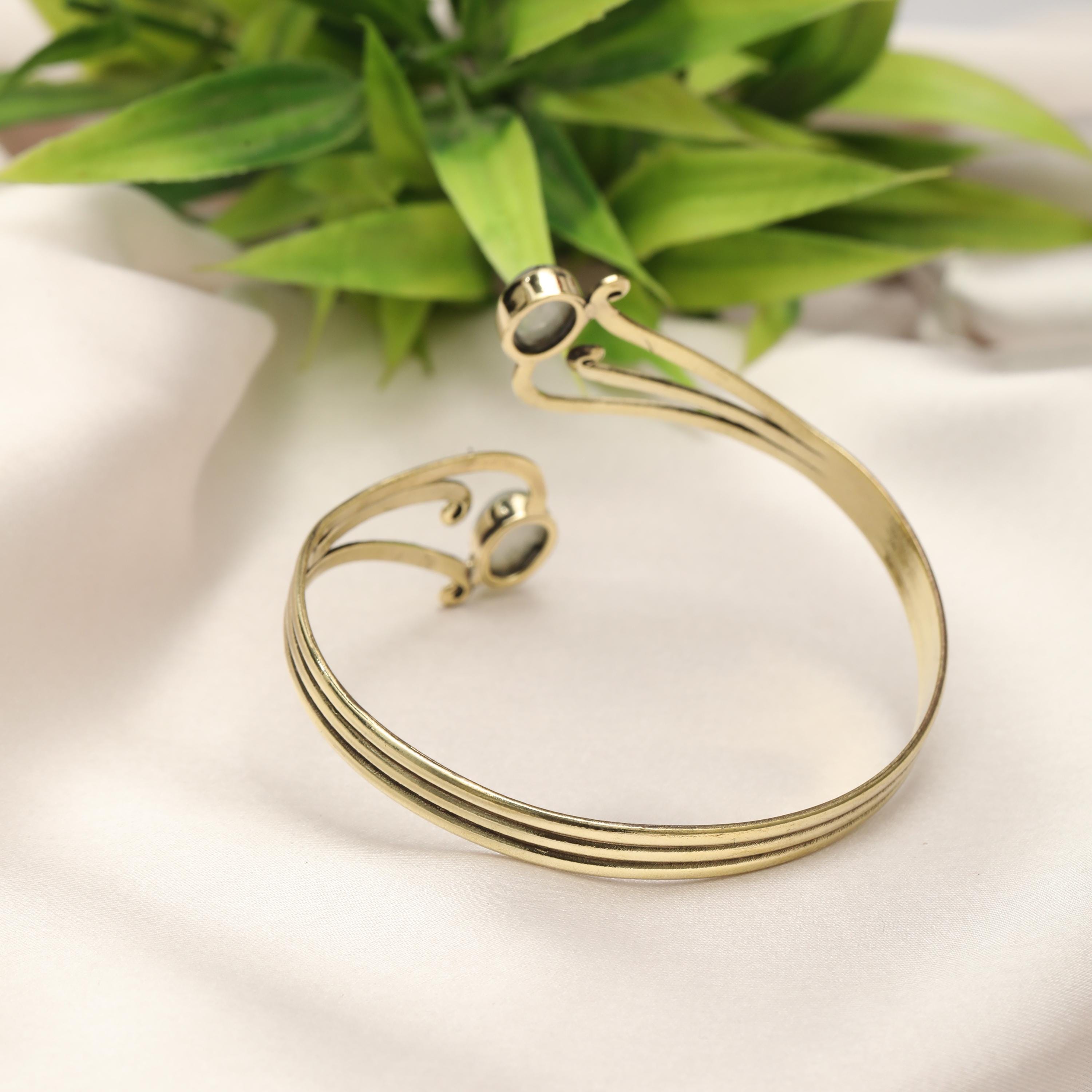 This elegant boho swirl cuff bracelet is crafted from solid brass and designed with flowing, organic curves inspired by tribal and oriental artistry. The open cuff features two balanced stone settings framed by graceful scrollwork, creating a harmonious and feminine statement piece.