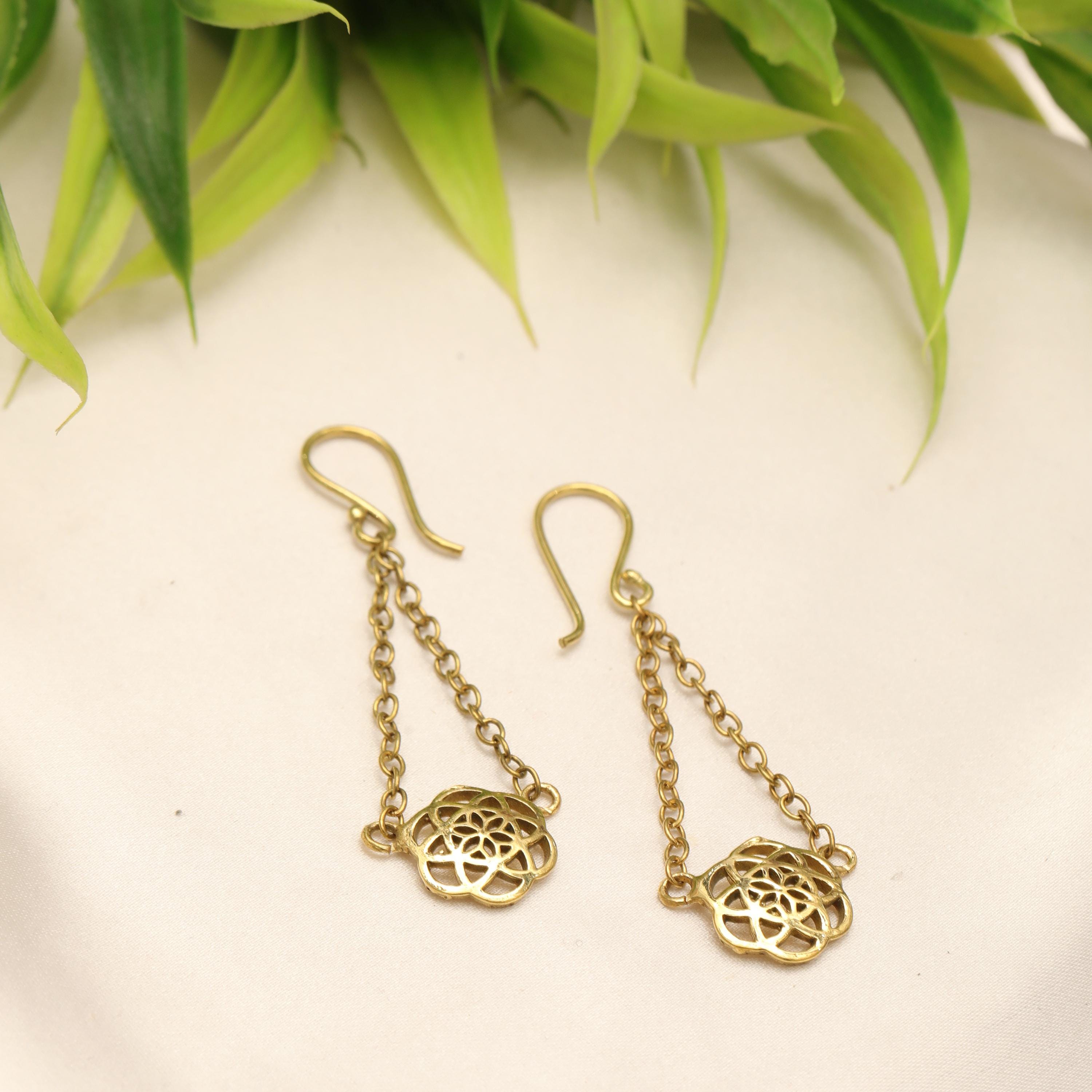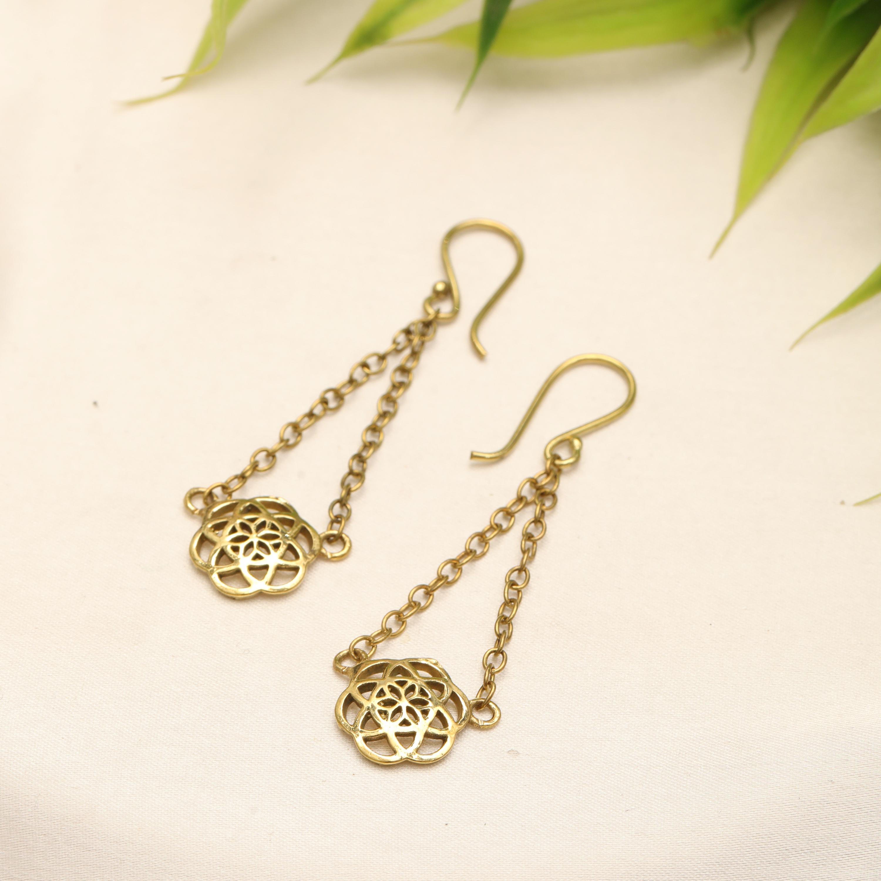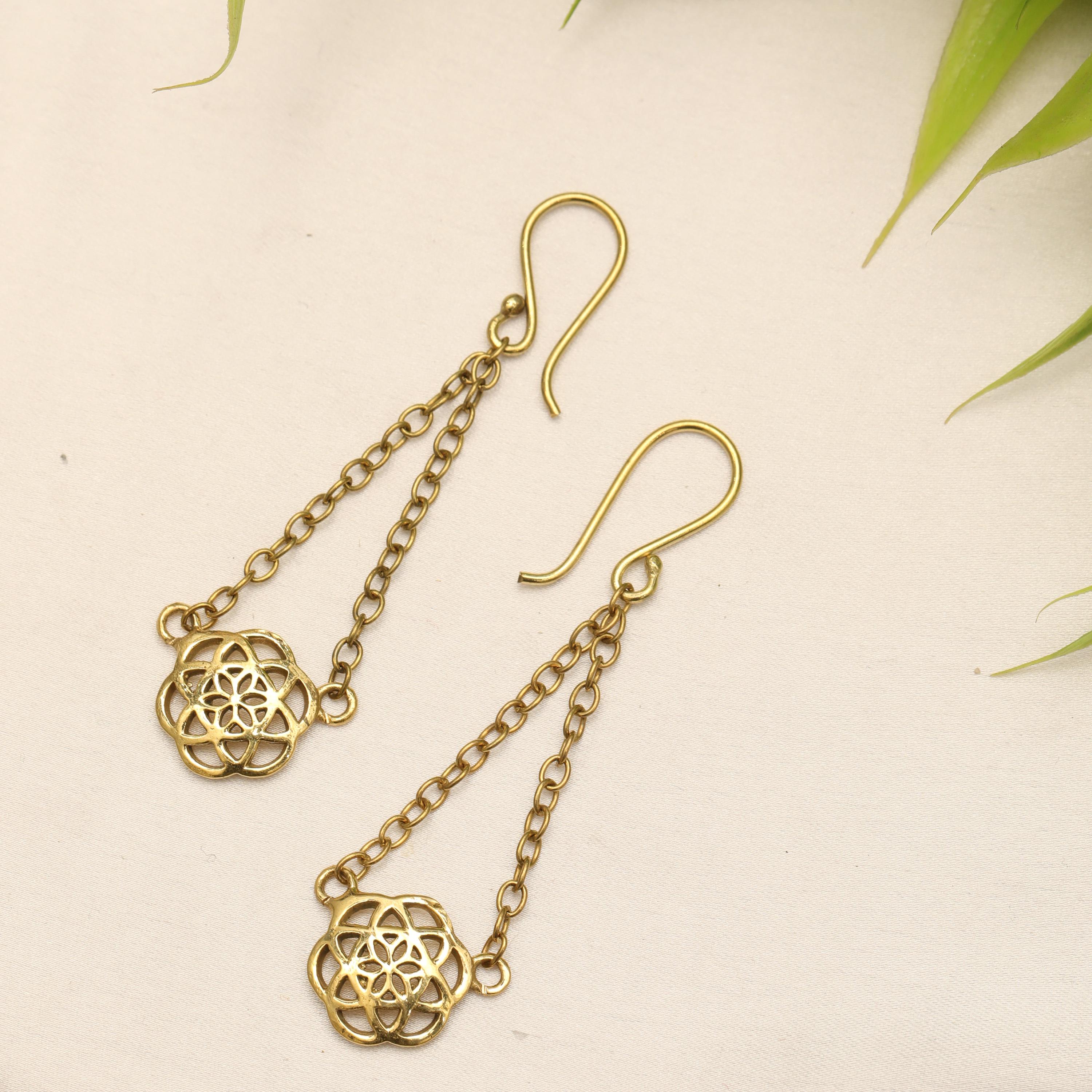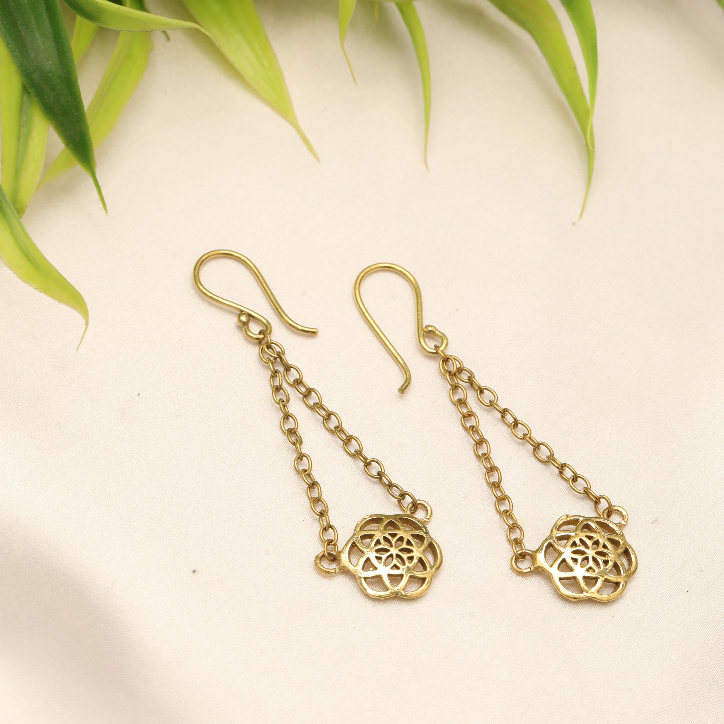 These bohemian sacred geometry earrings are crafted entirely from solid brass and designed for lovers of oriental, ethnic, and spiritual jewelry. Featuring an intricate mandala-inspired openwork pattern, these earrings embody harmony, balance, and sacred symbolism cherished in boho culture.