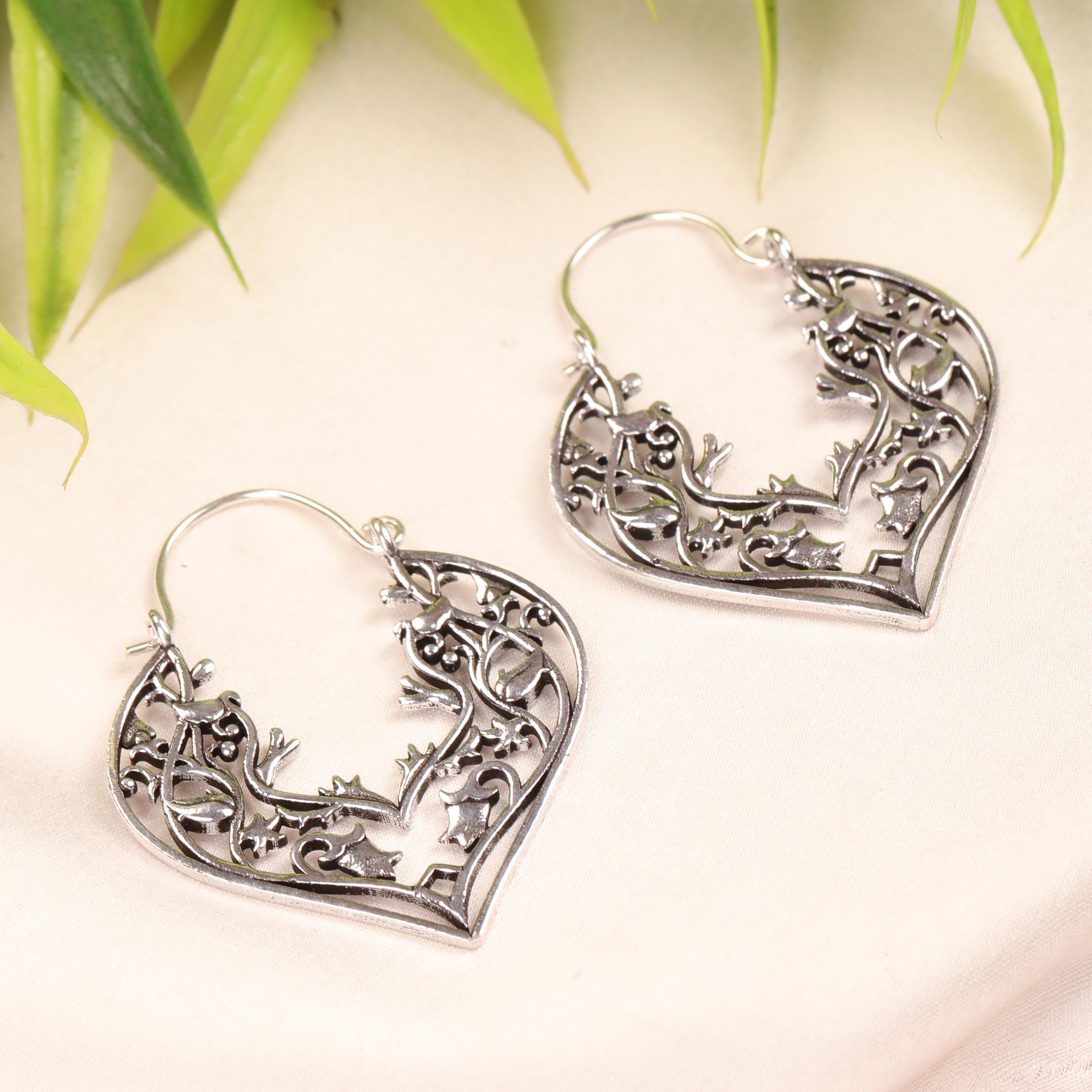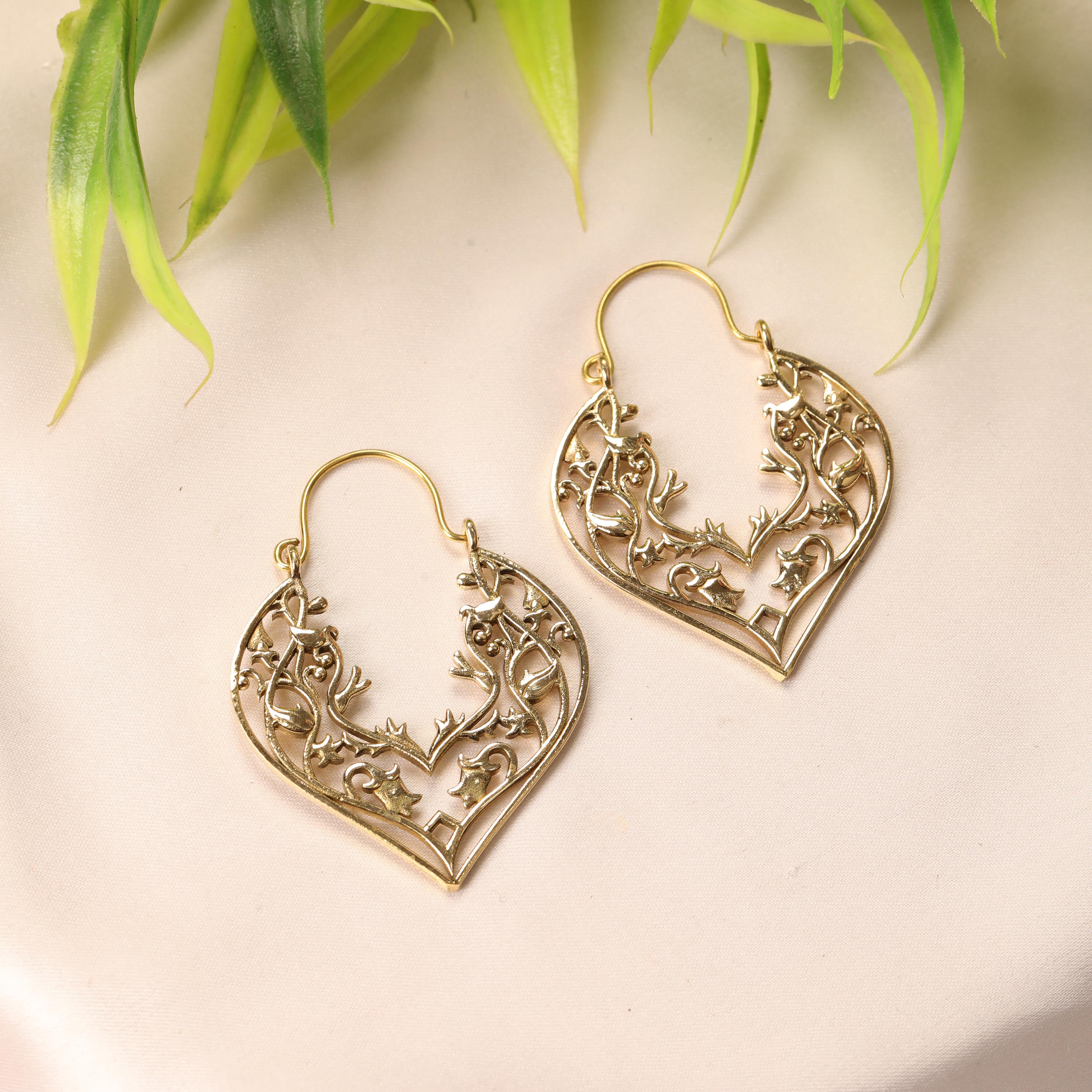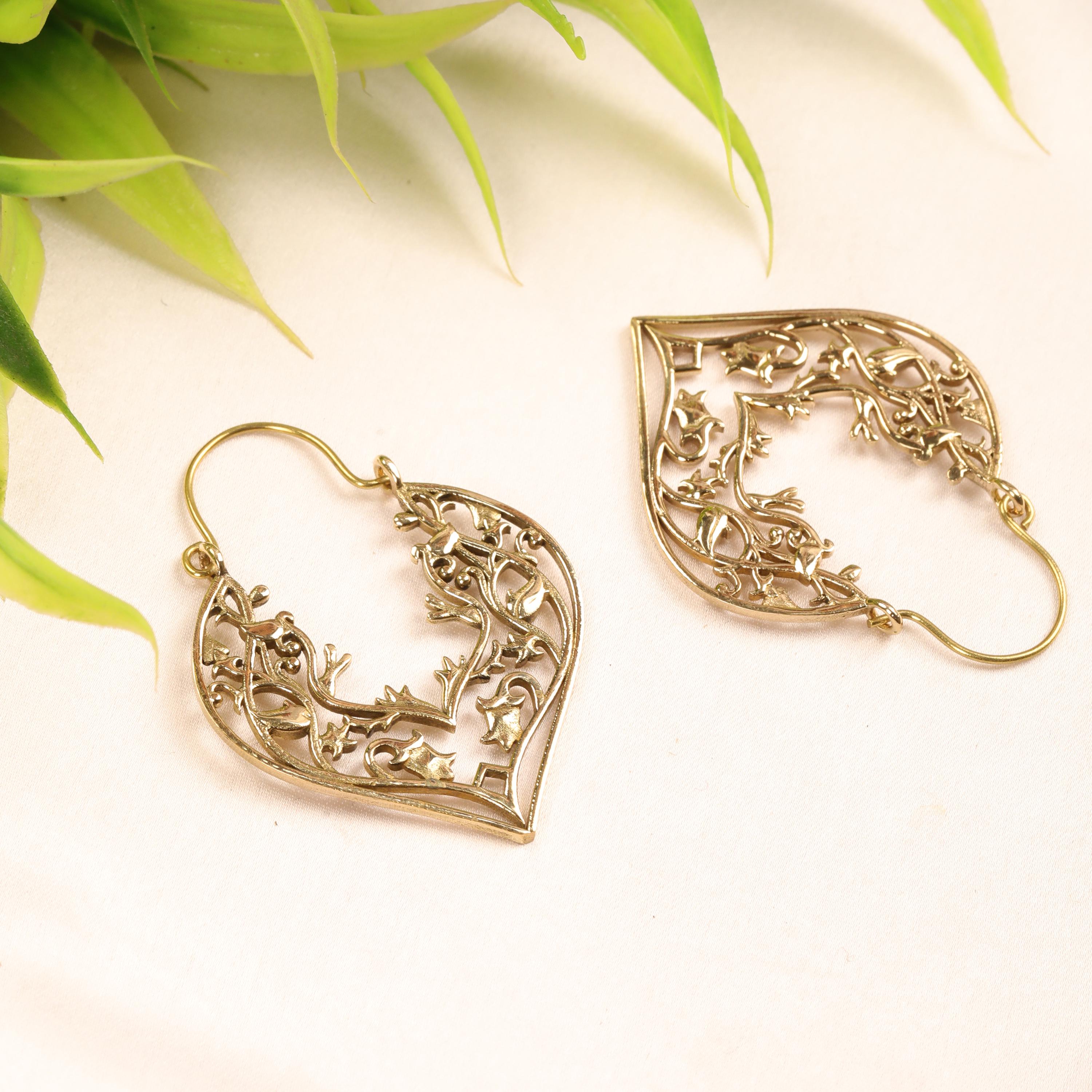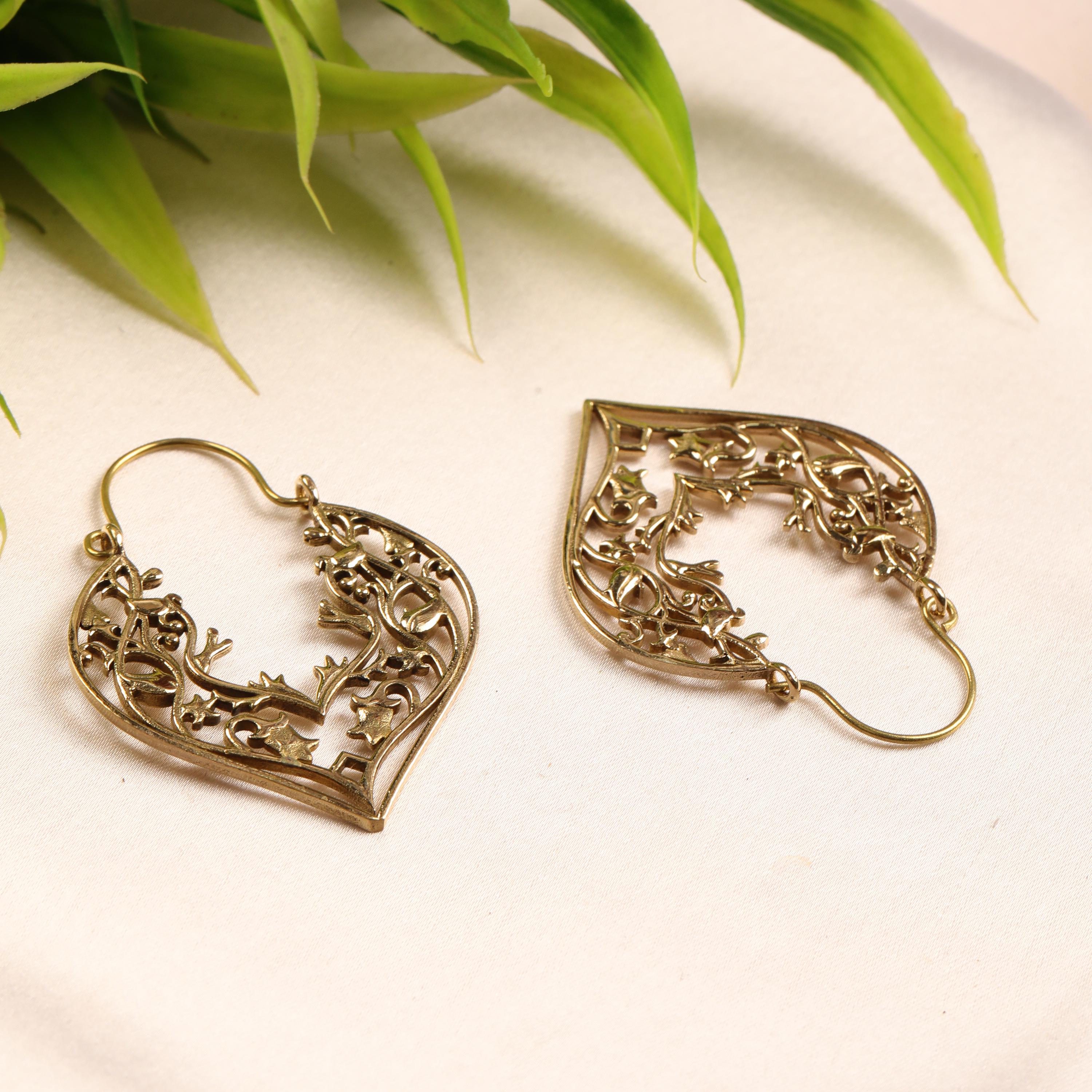 These handcrafted brass heart earrings feature an elegant openwork design inspired by romantic symbolism and vintage metal artistry. Shaped into graceful heart silhouettes, each earring is adorned with intricate filigree floral detailing that creates depth, texture, and visual movement.