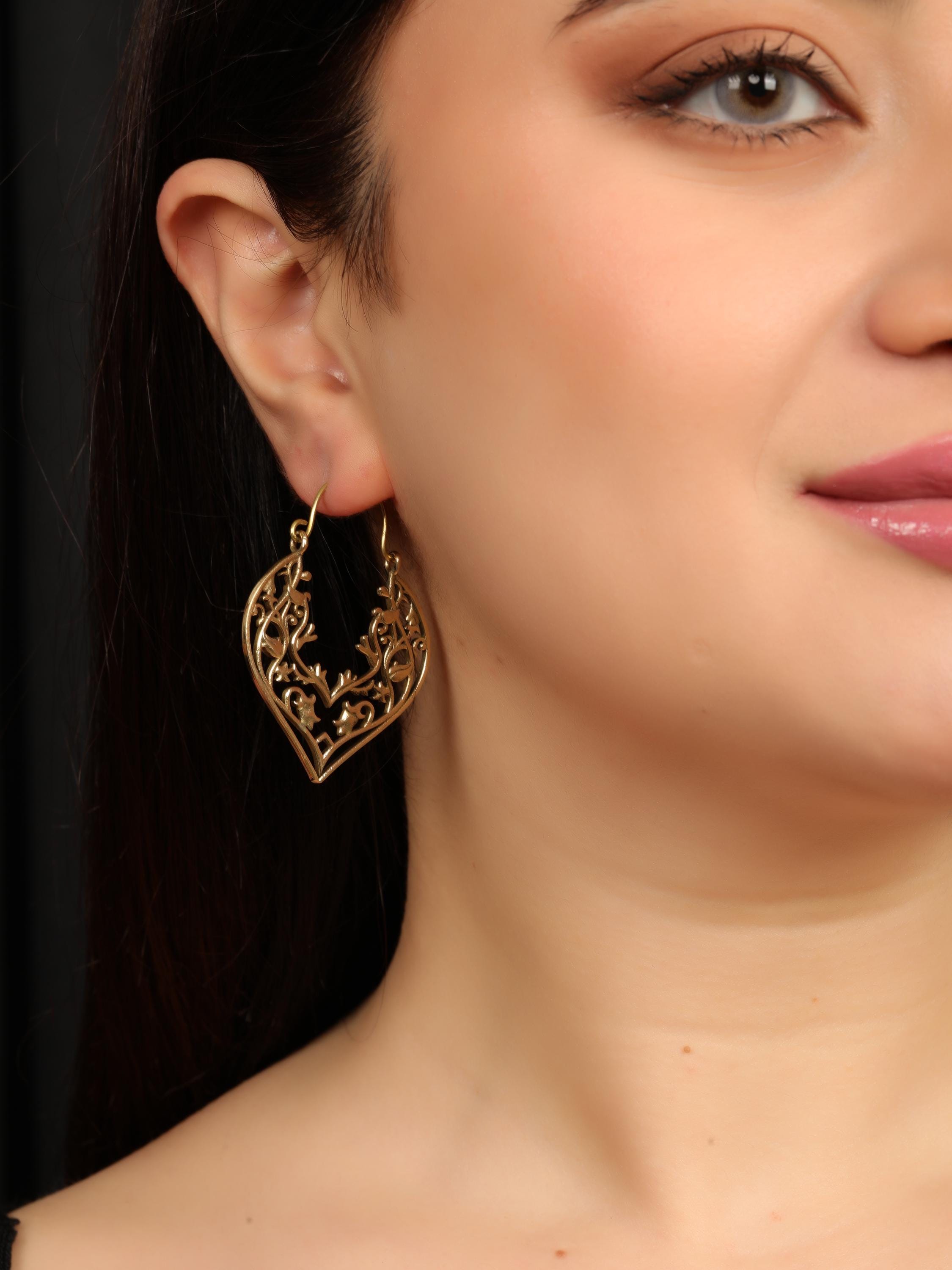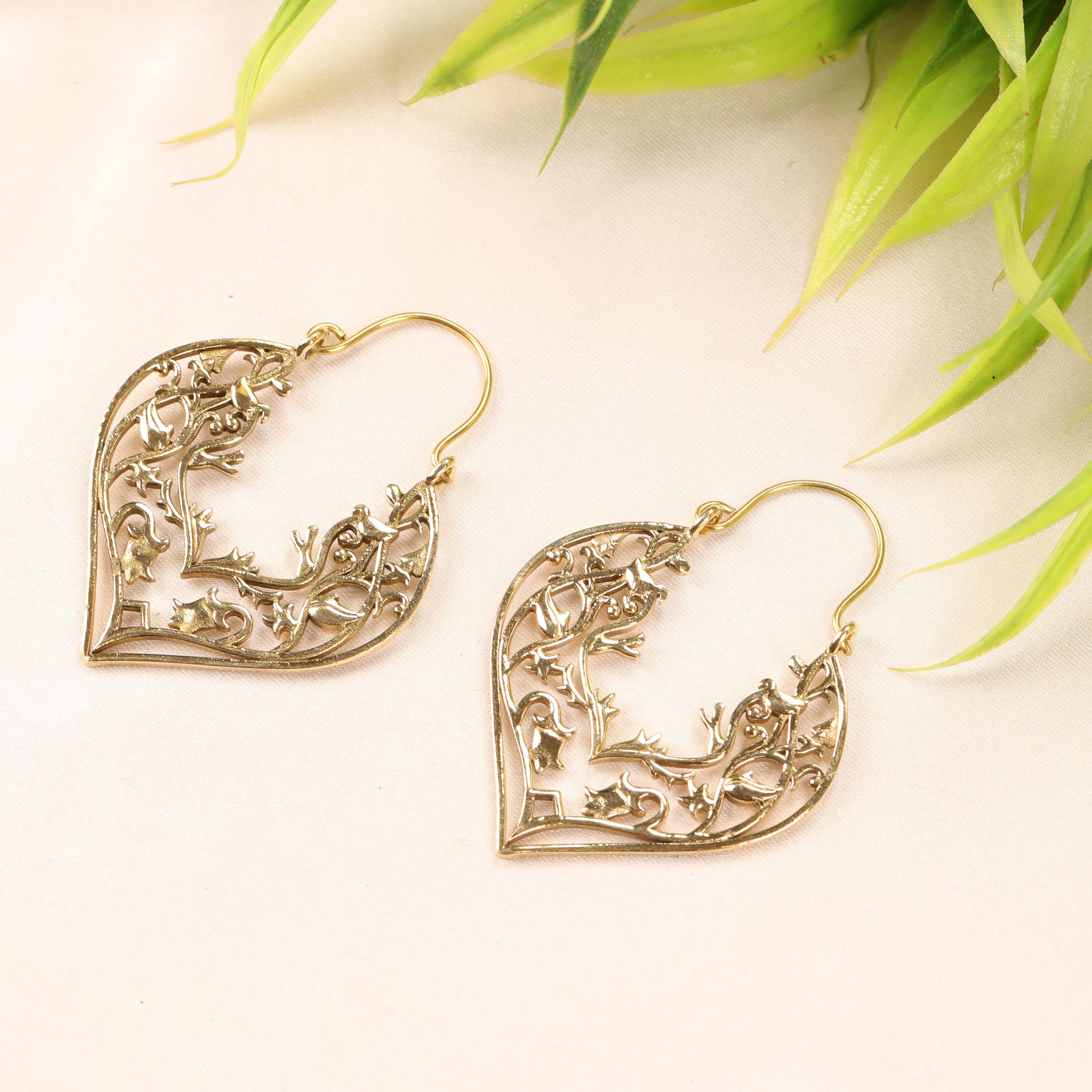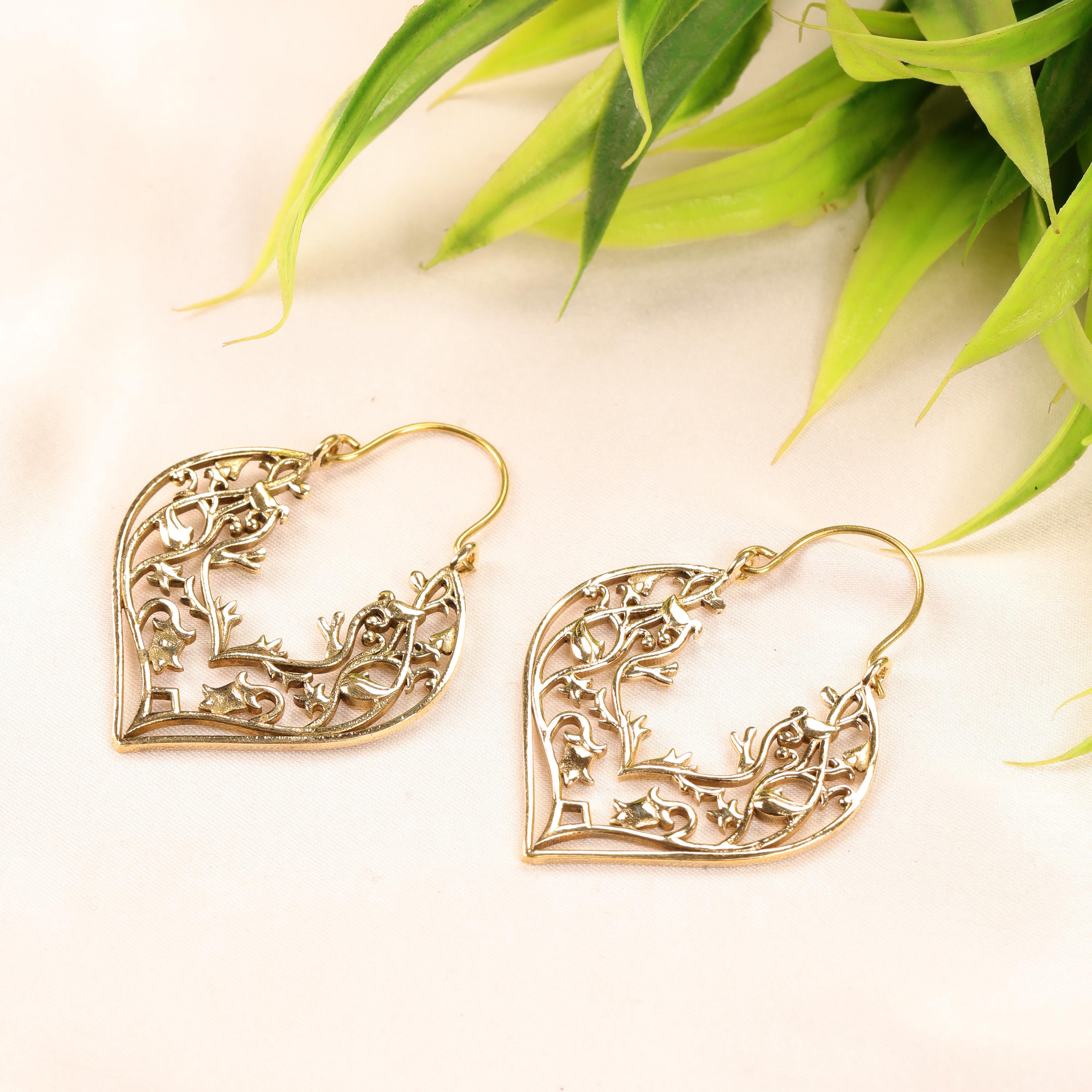 Made entirely from brass with golden or silver-tone finish, these earrings celebrate the beauty of metalwork itself. The delicate cutout pattern allows light to pass through the design, giving the earrings an airy, lightweight feel while maintaining a bold and expressive look.