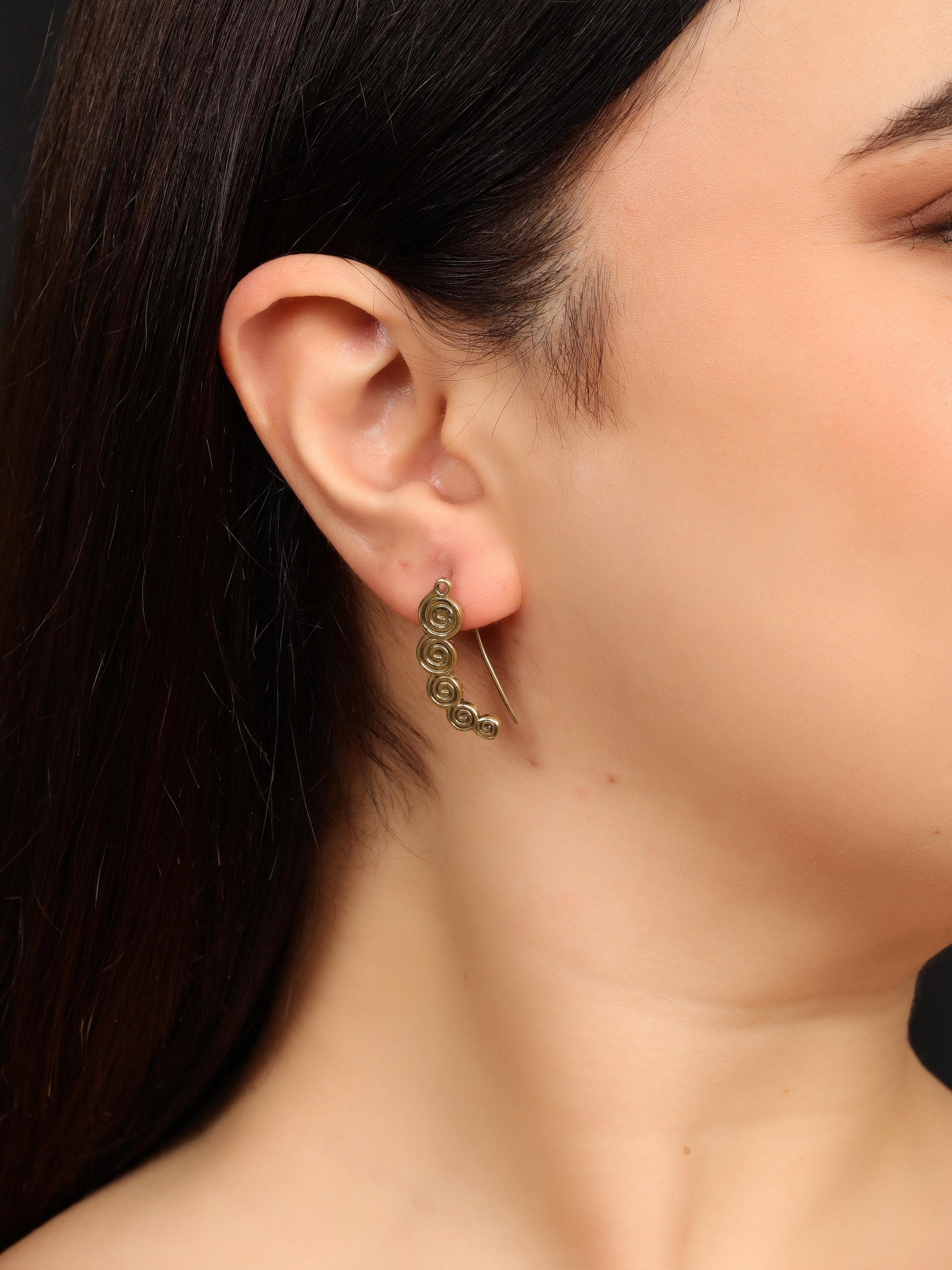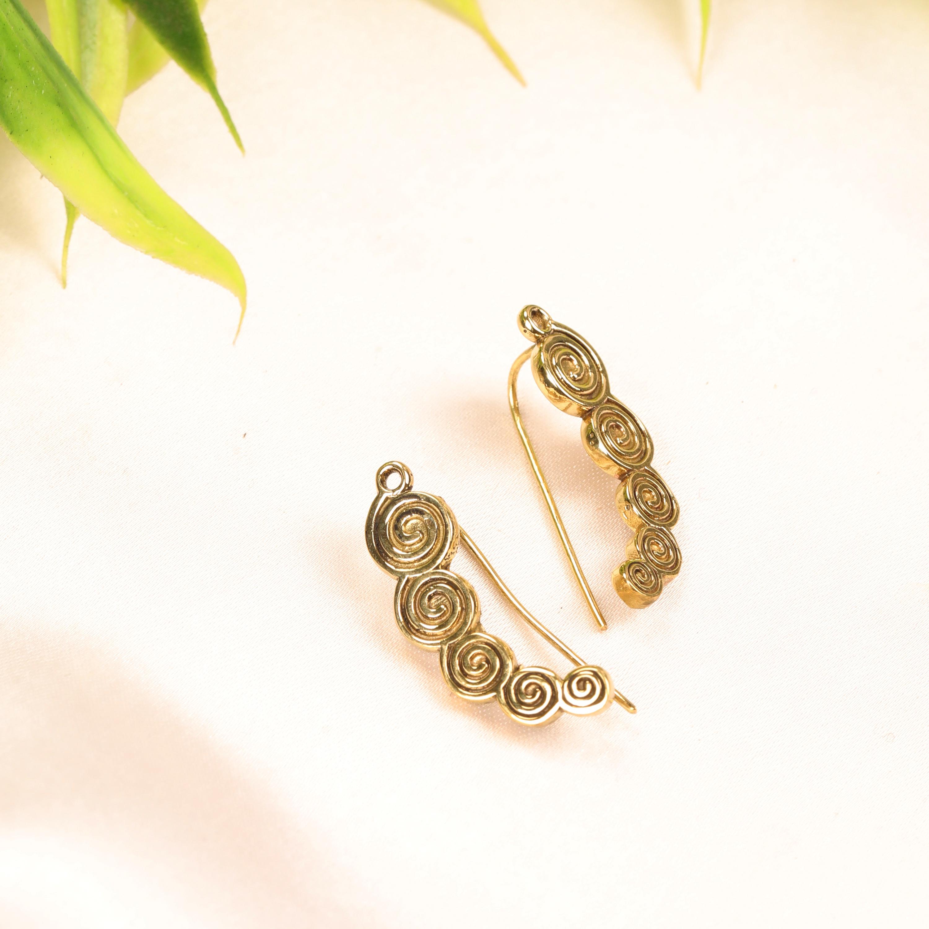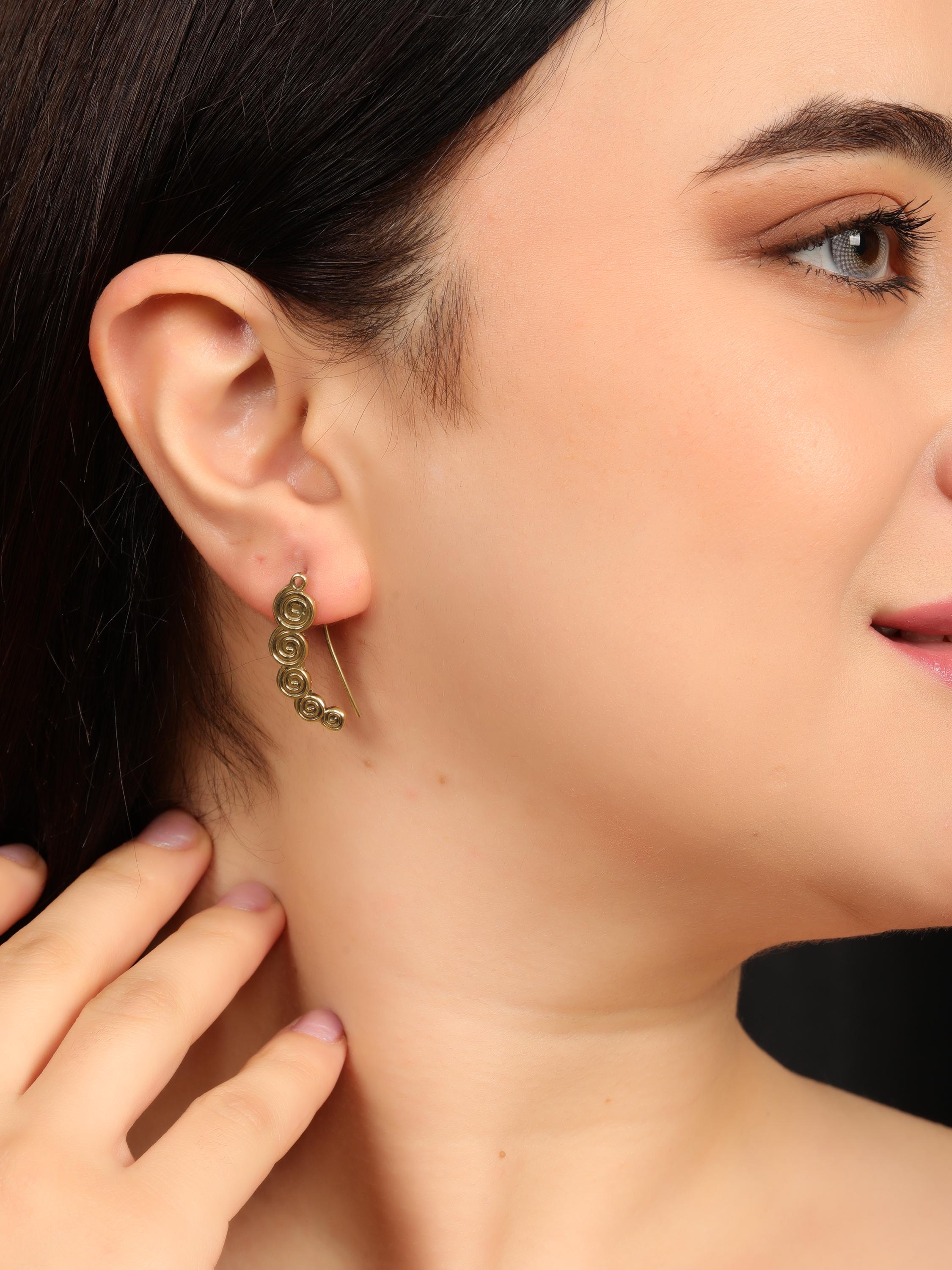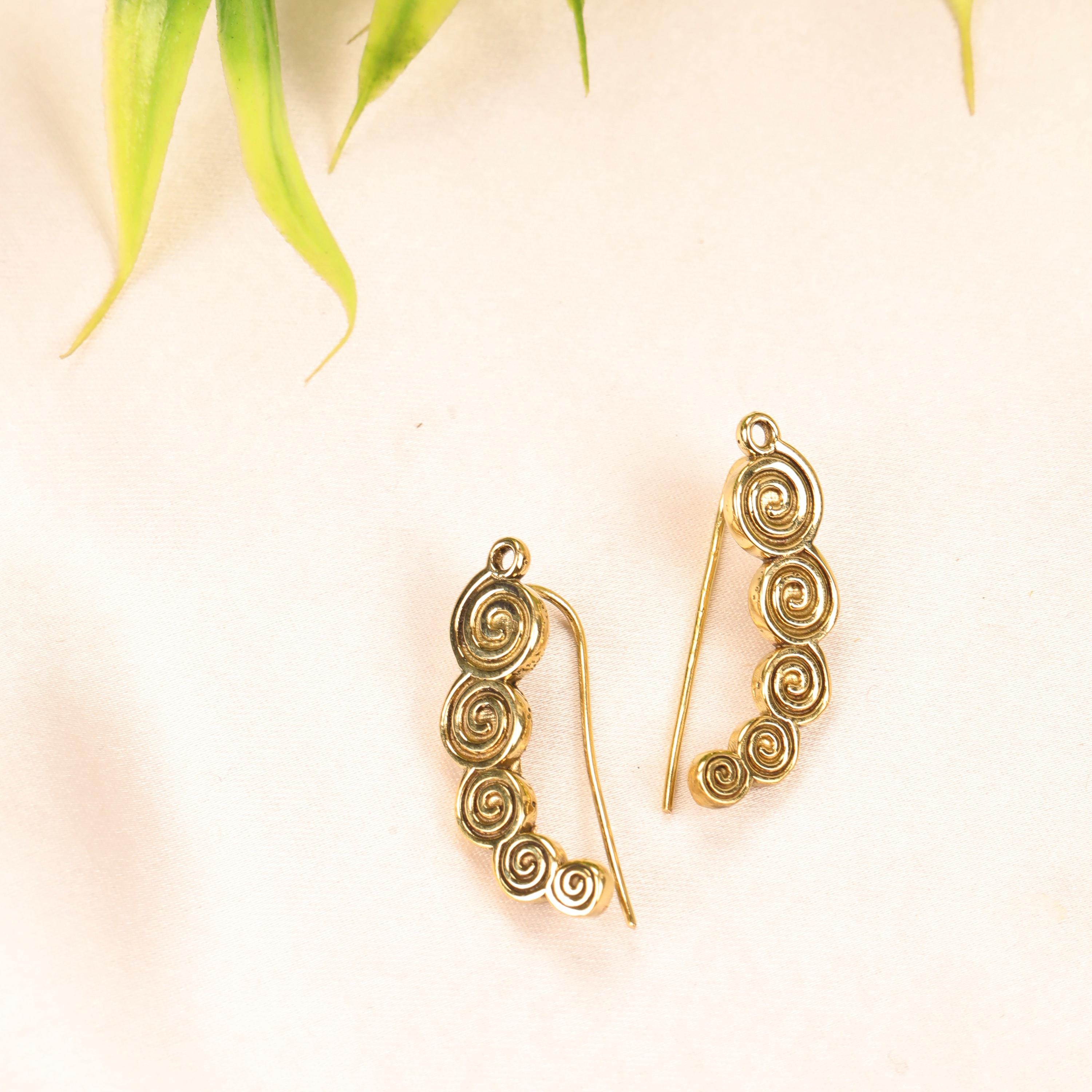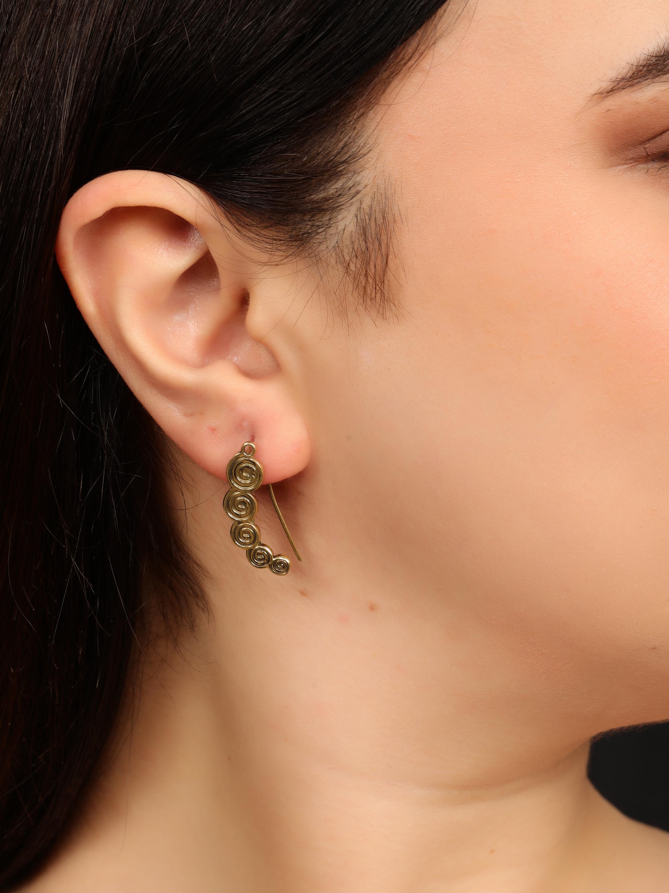 These boho spiral ear climber earrings combine minimalist design with ancient tribal symbolism. Crafted from solid brass, they feature a flowing spiral motif that gently follows the curve of the ear, creating a refined yet expressive look.
