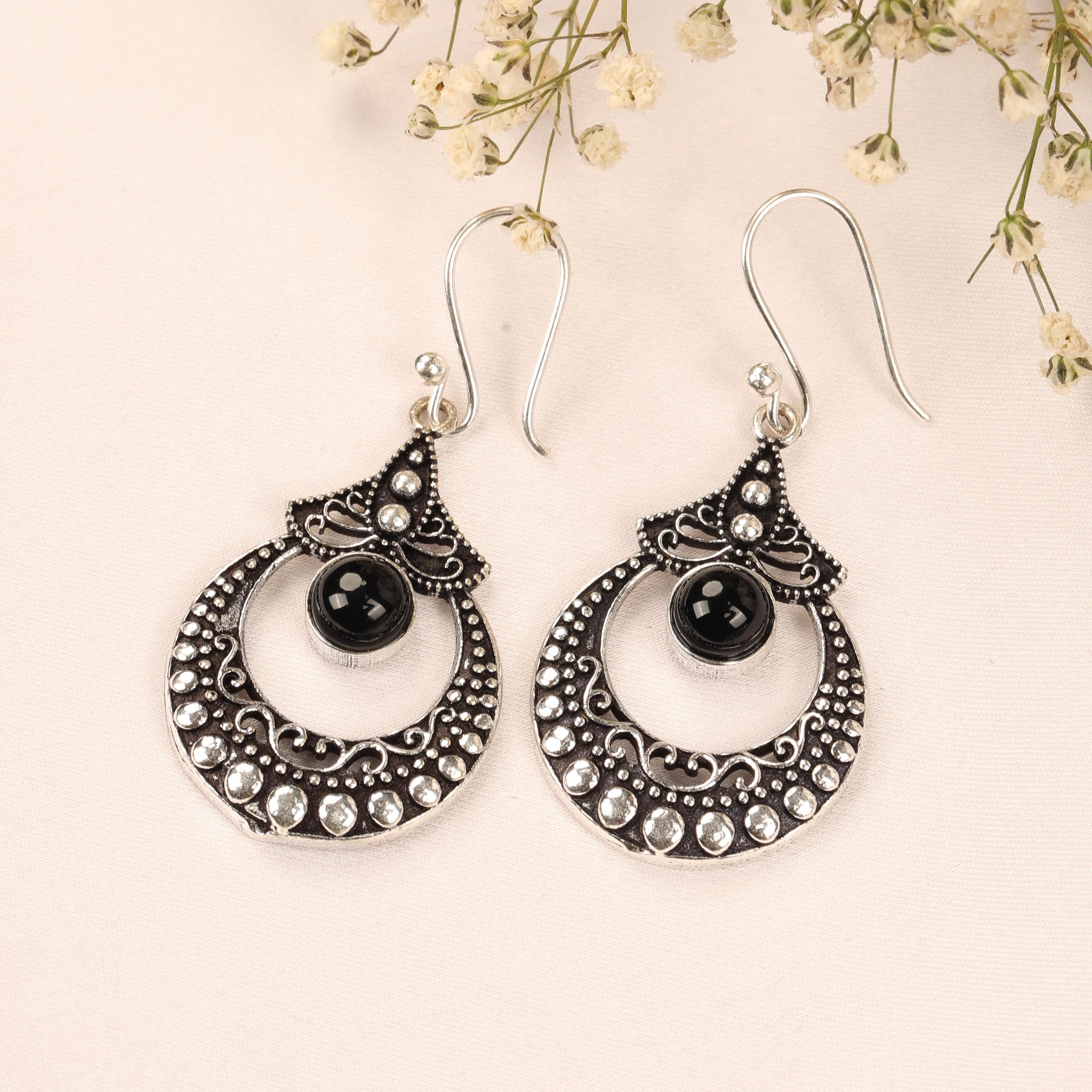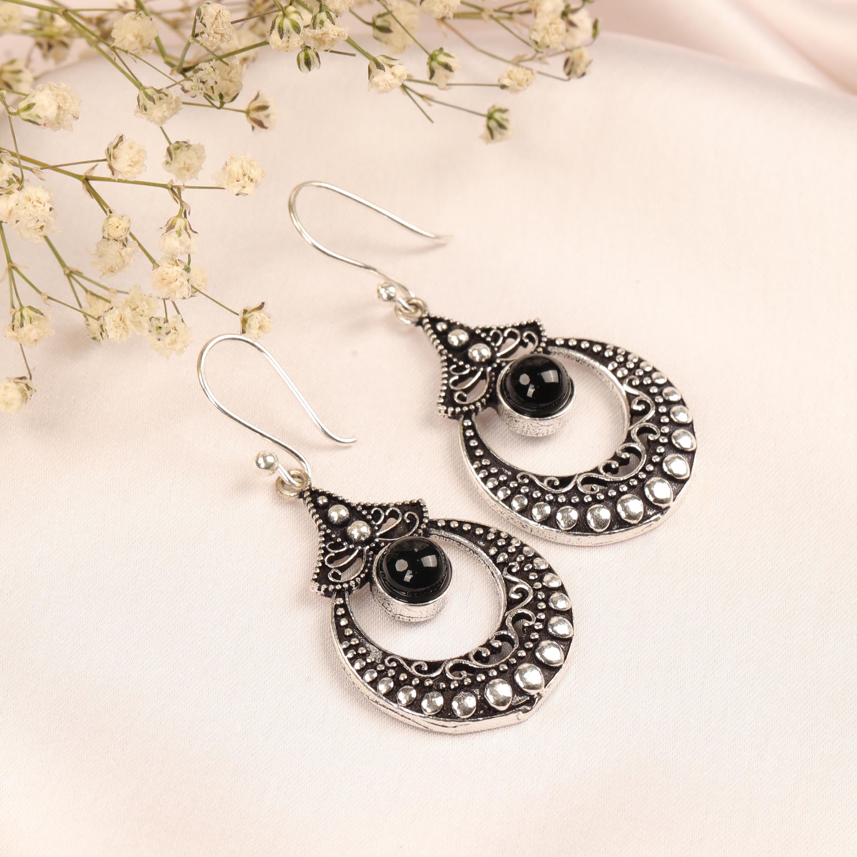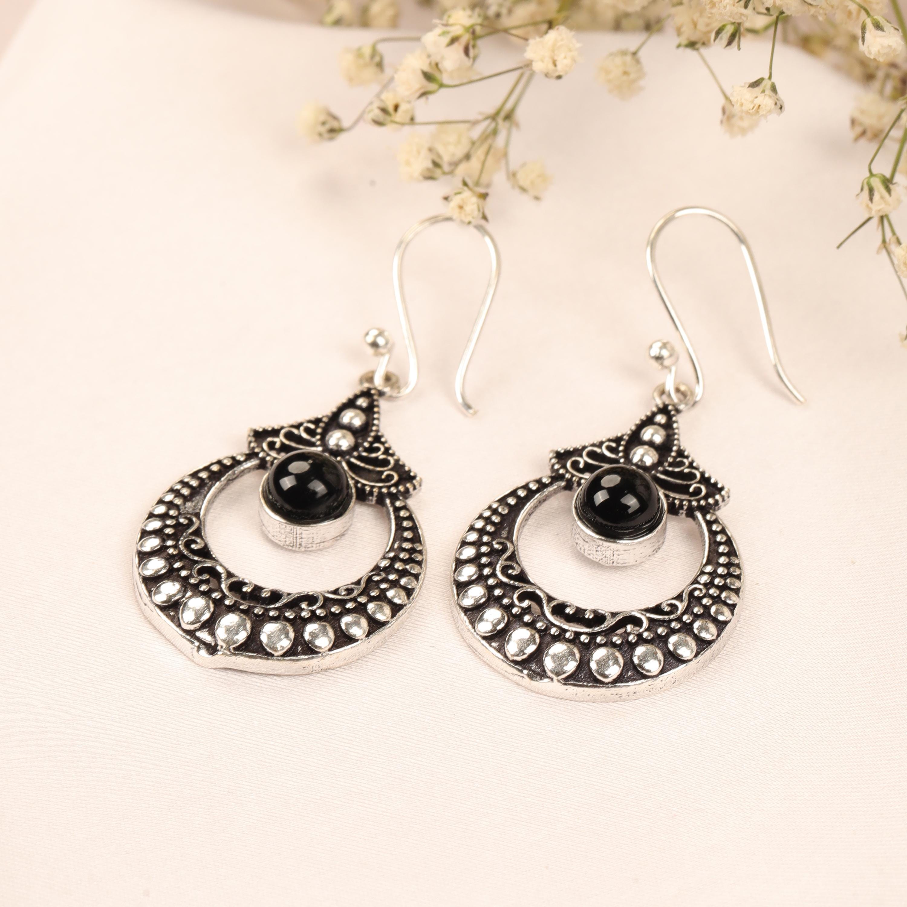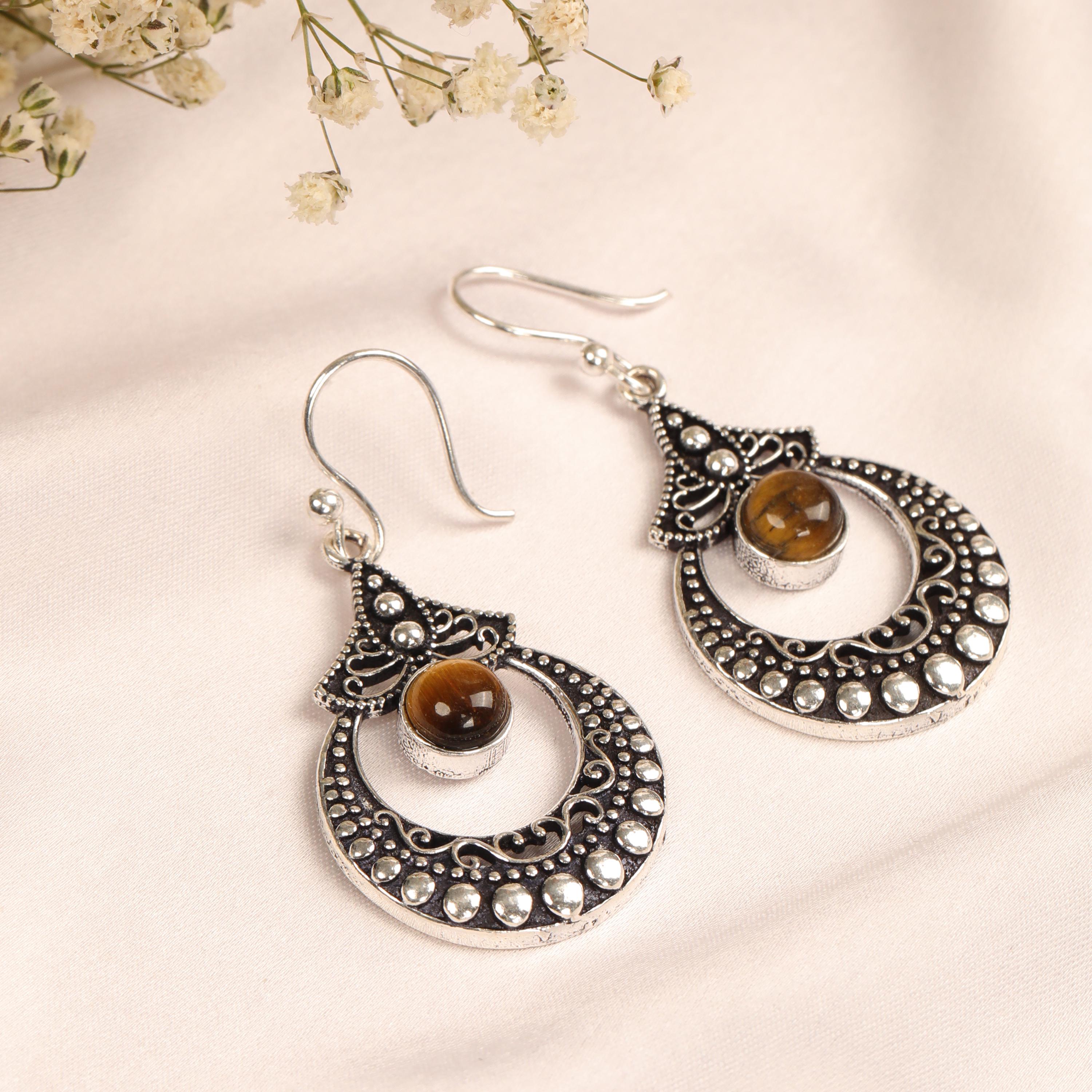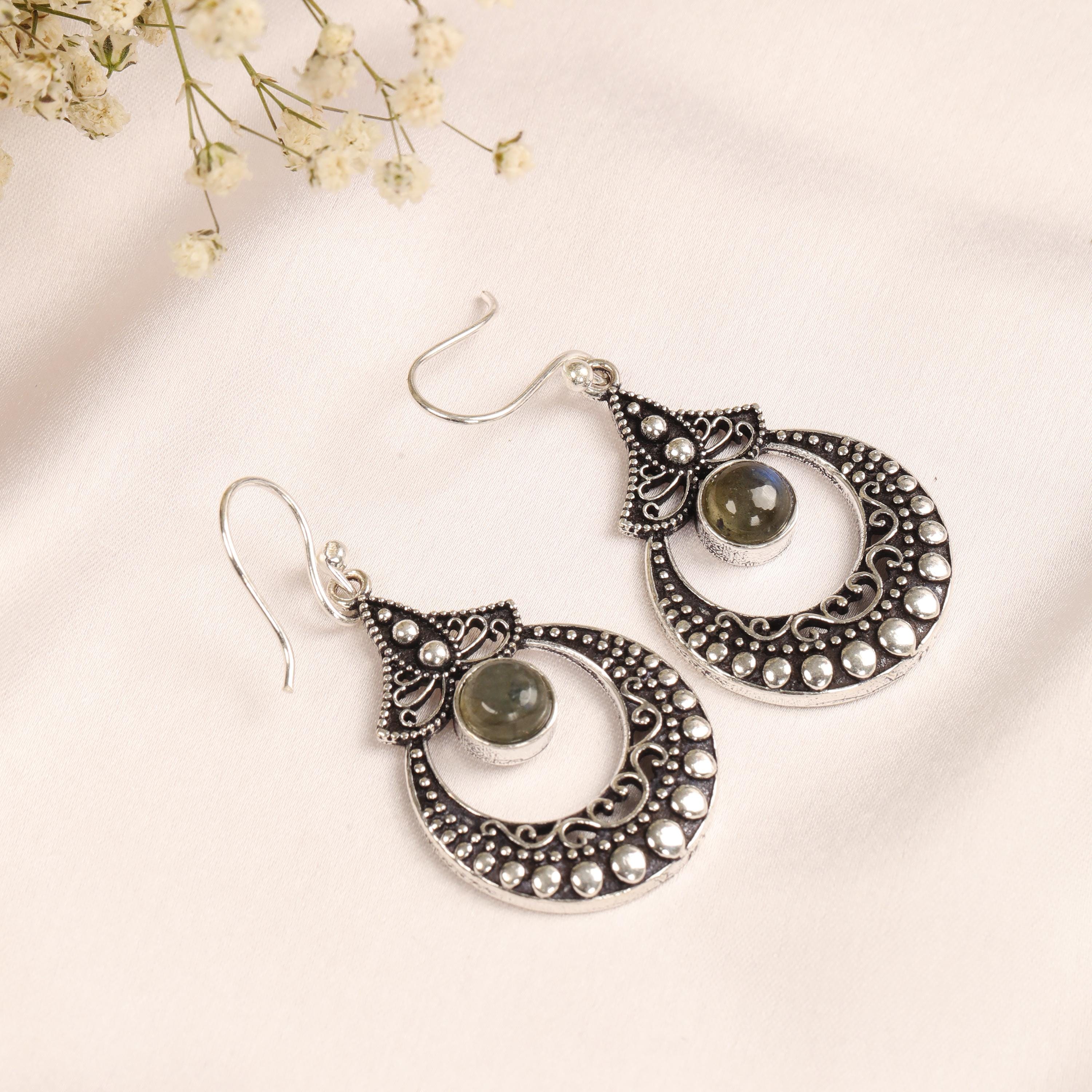 These ornate hoop earrings are crafted from solid brass and designed with a detailed filigree pattern inspired by ethnic, tribal, and nomadic jewelry traditions. Their circular form symbolizes harmony and continuity, while the central gemstone adds depth and character.