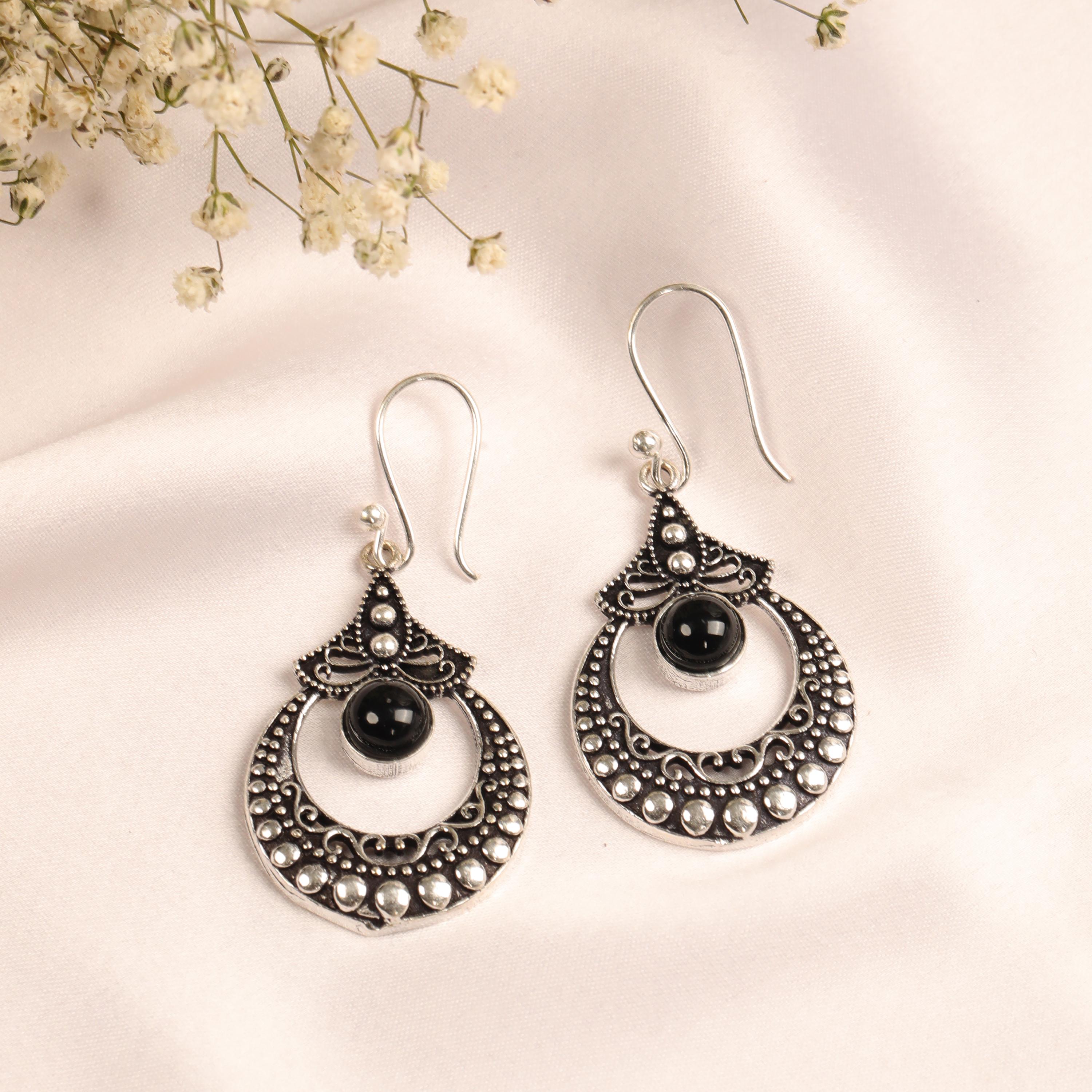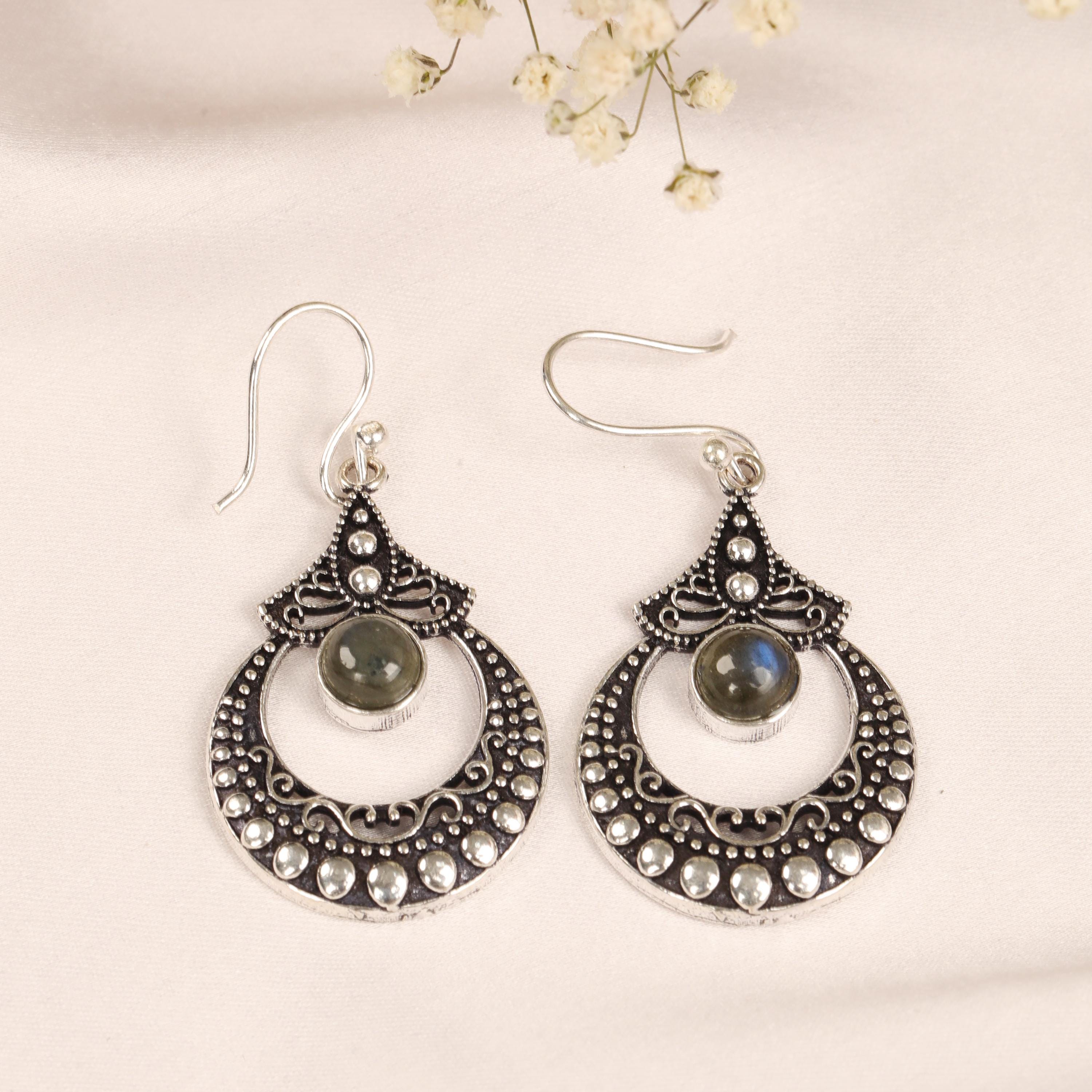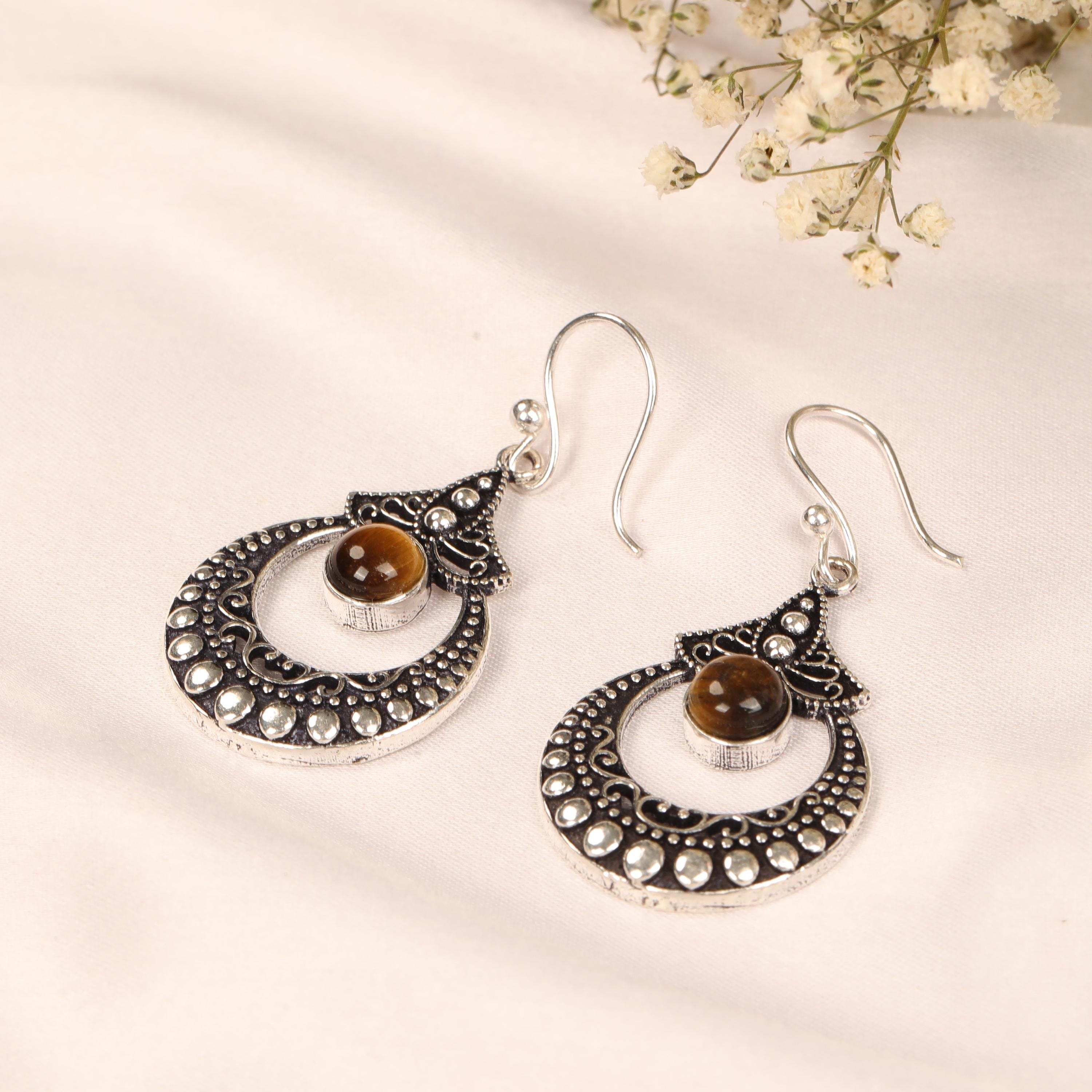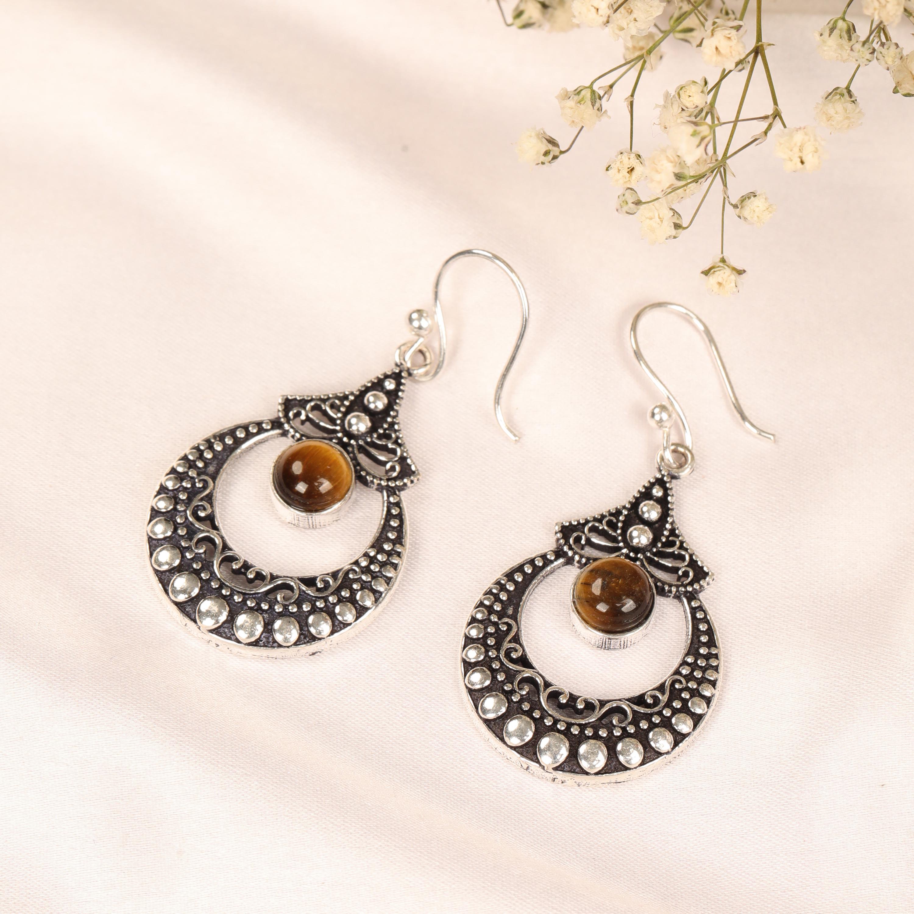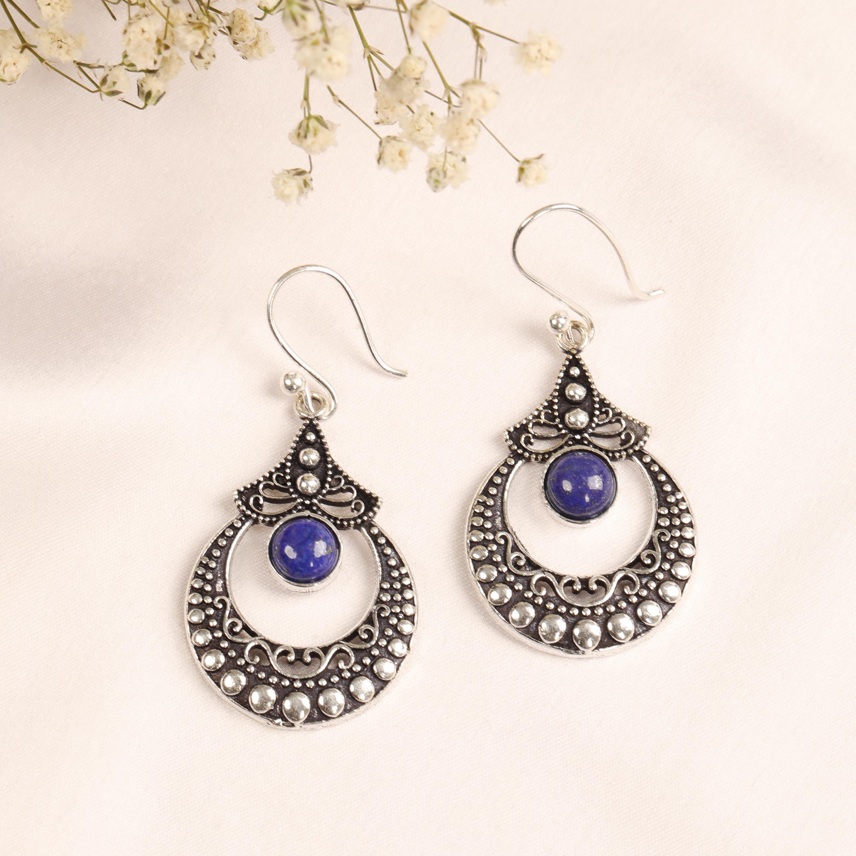 These ornate hoop earrings are crafted from solid brass and designed with a detailed filigree pattern inspired by ethnic, tribal, and nomadic jewelry traditions. Their circular form symbolizes harmony and continuity, while the central gemstone adds depth and character.
