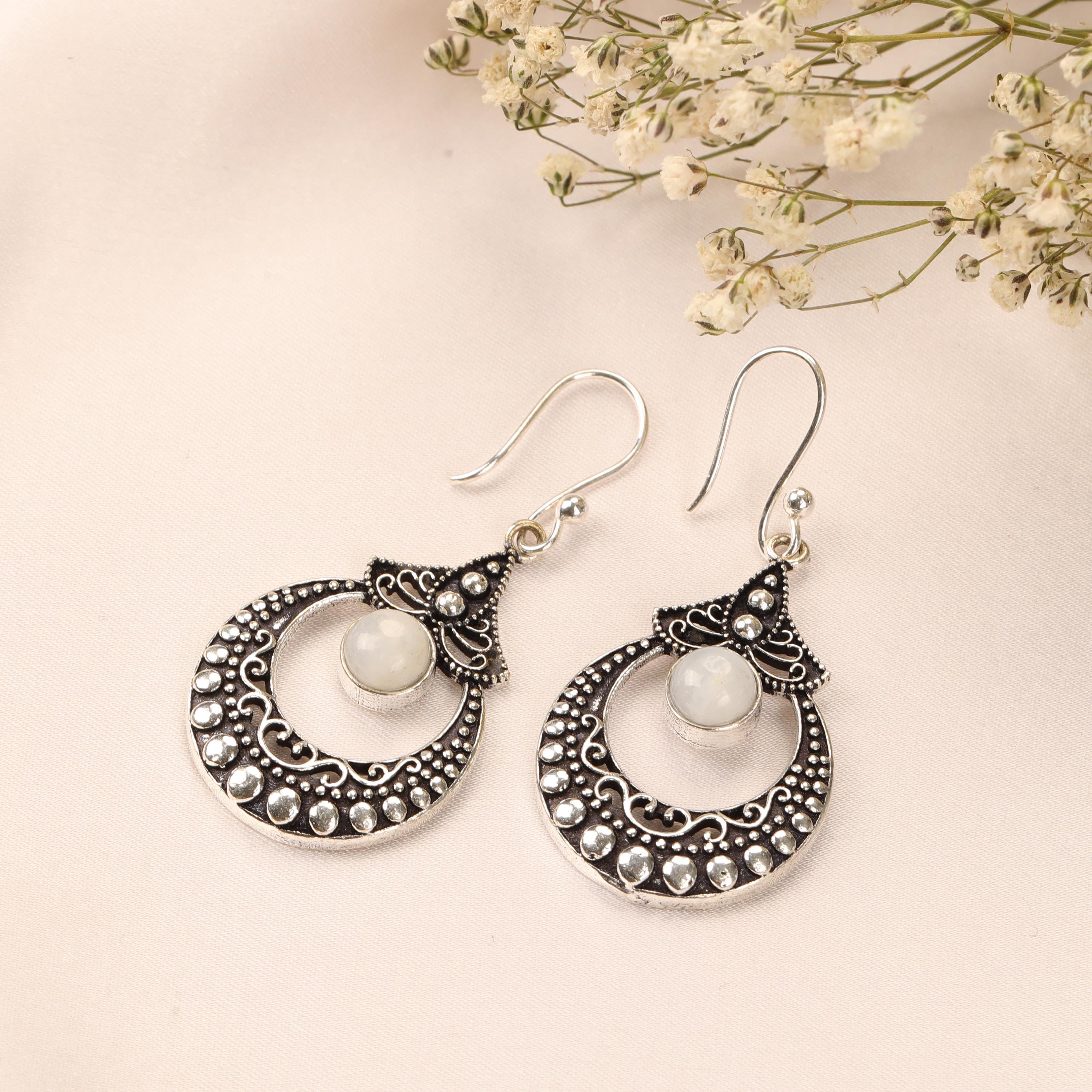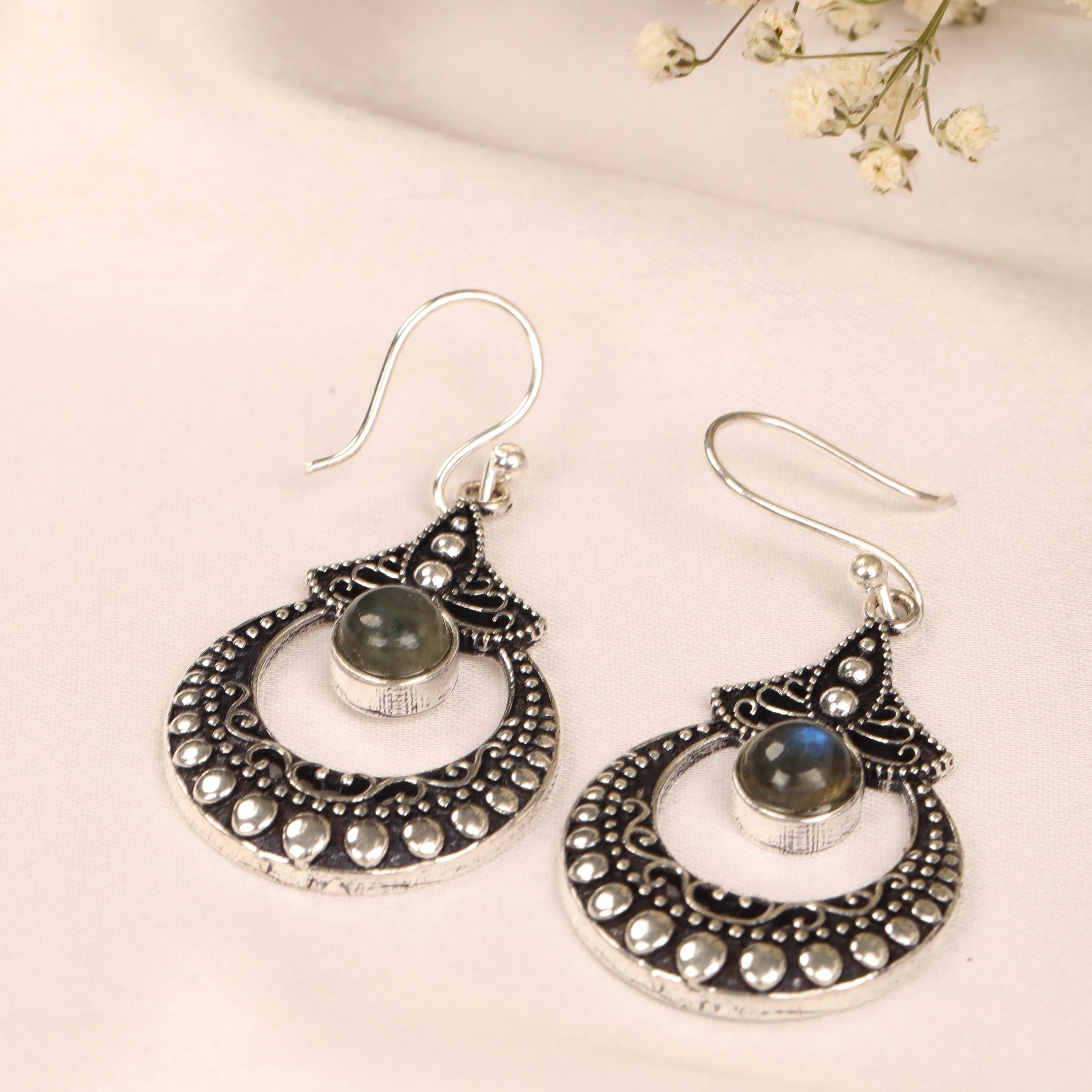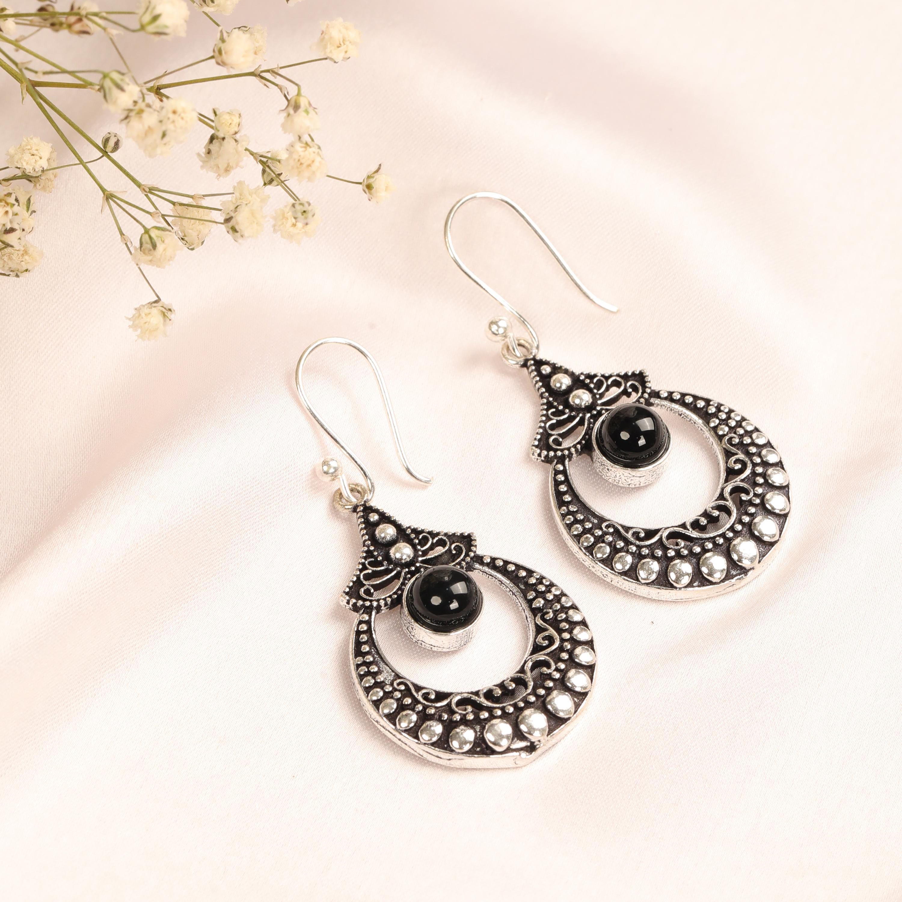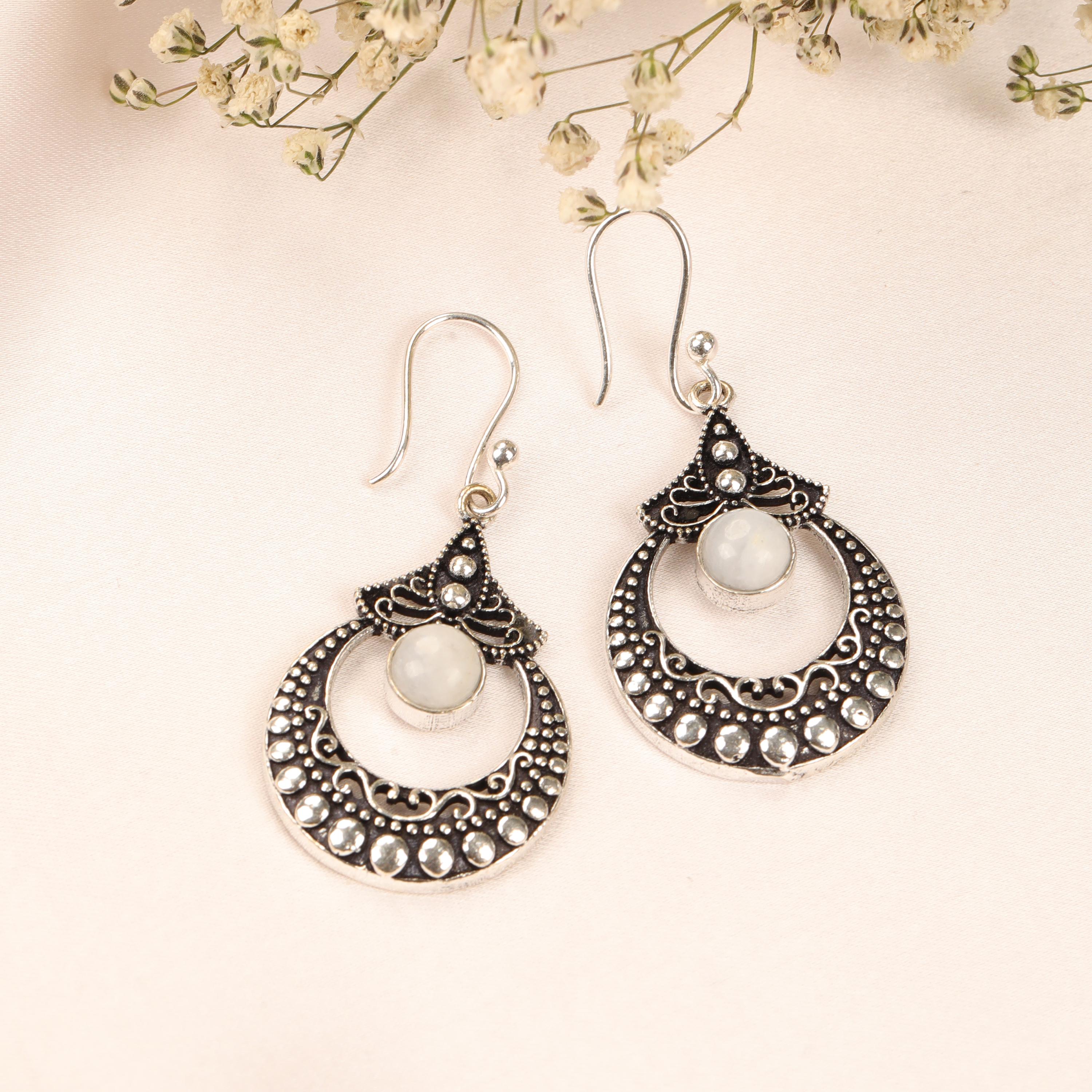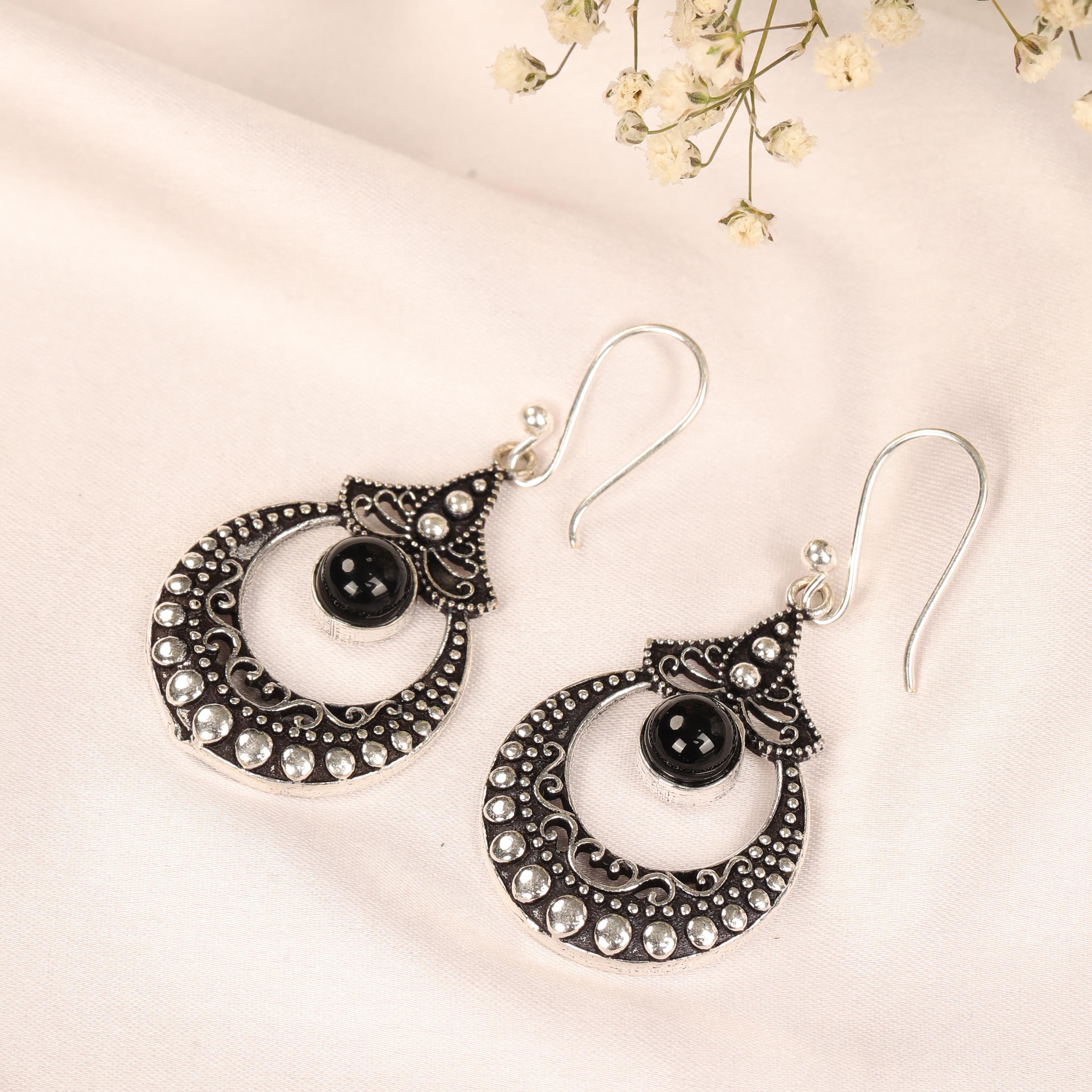 These ornate hoop earrings are crafted from solid brass and designed with a detailed filigree pattern inspired by ethnic, tribal, and nomadic jewelry traditions. Their circular form symbolizes harmony and continuity, while the central gemstone adds depth and character.