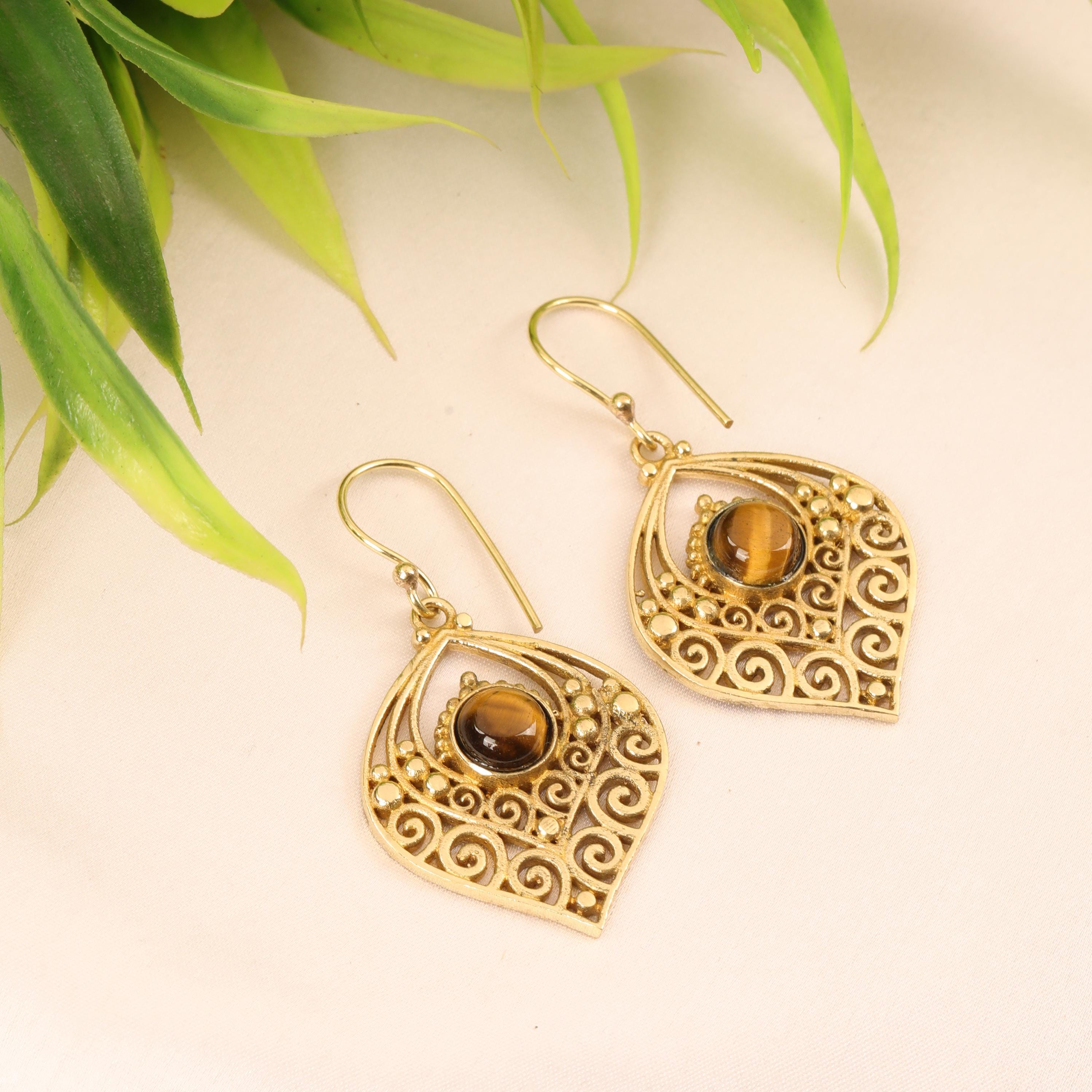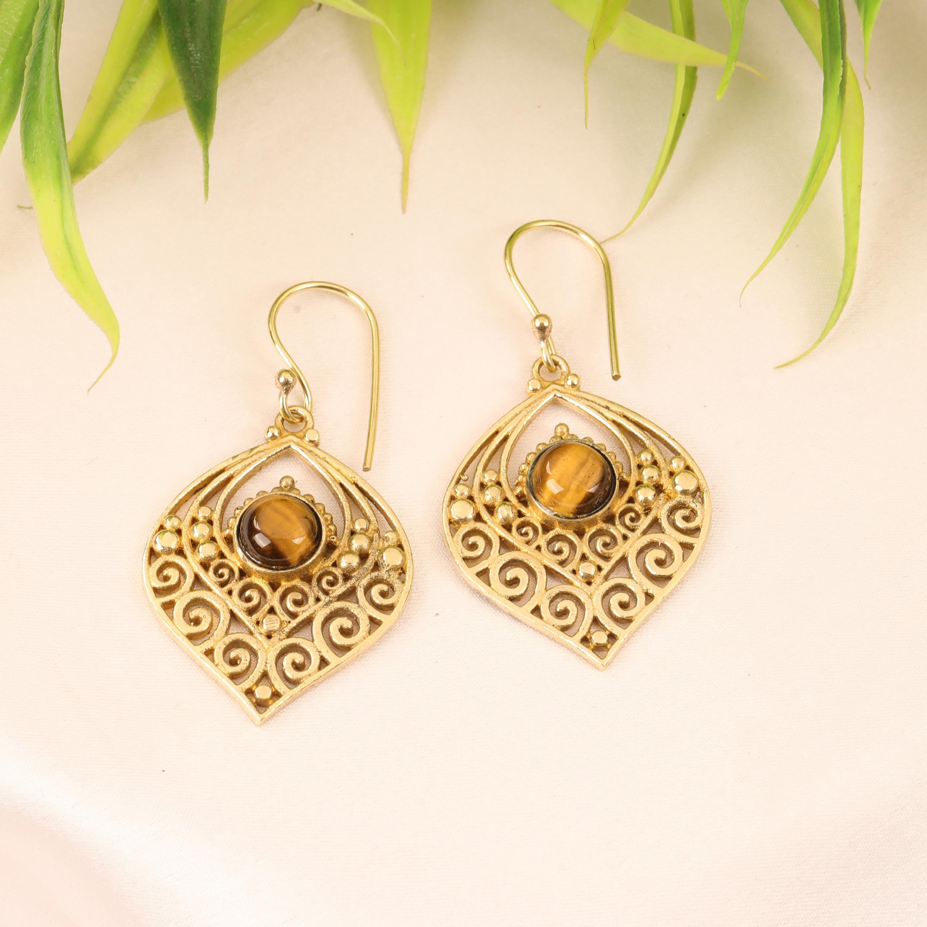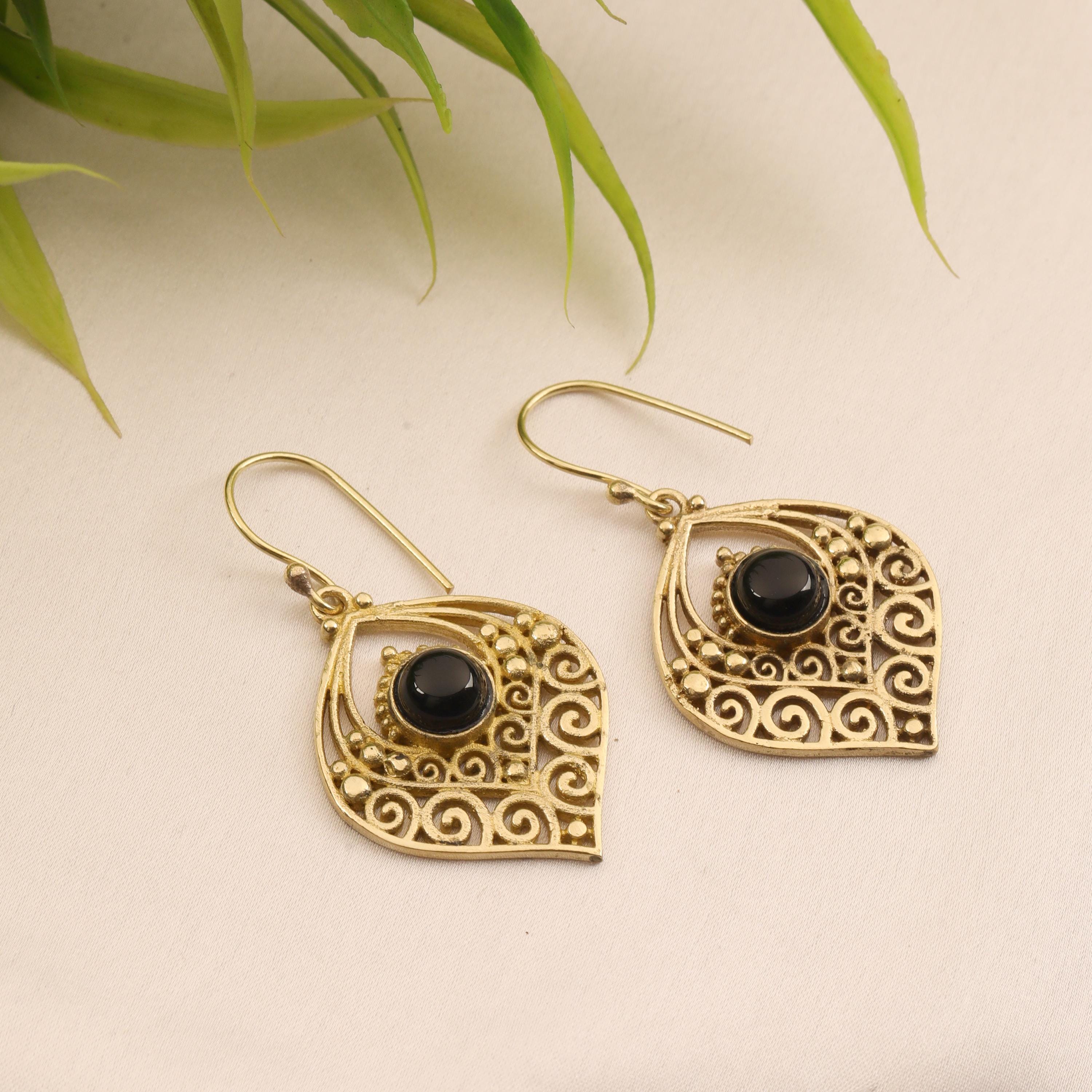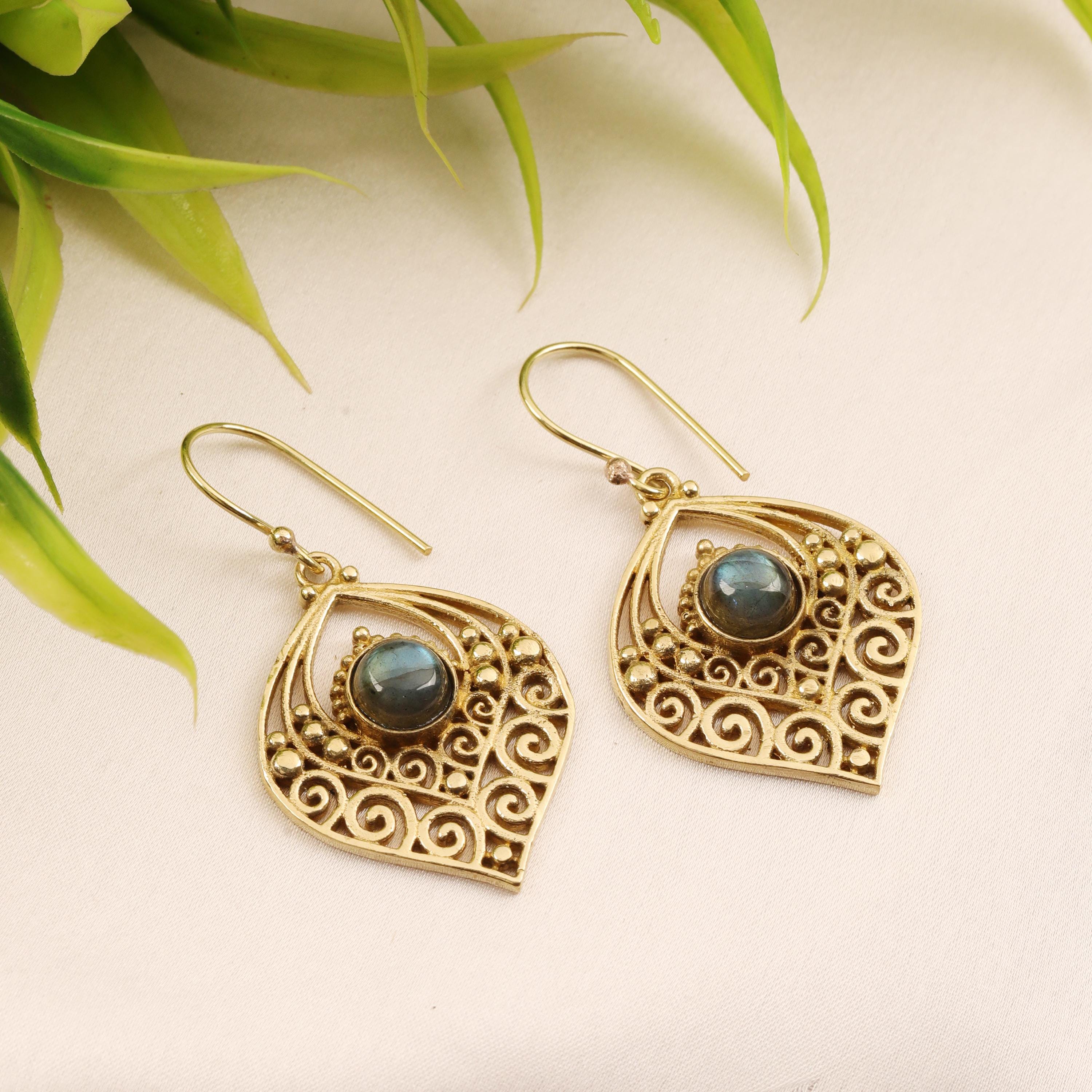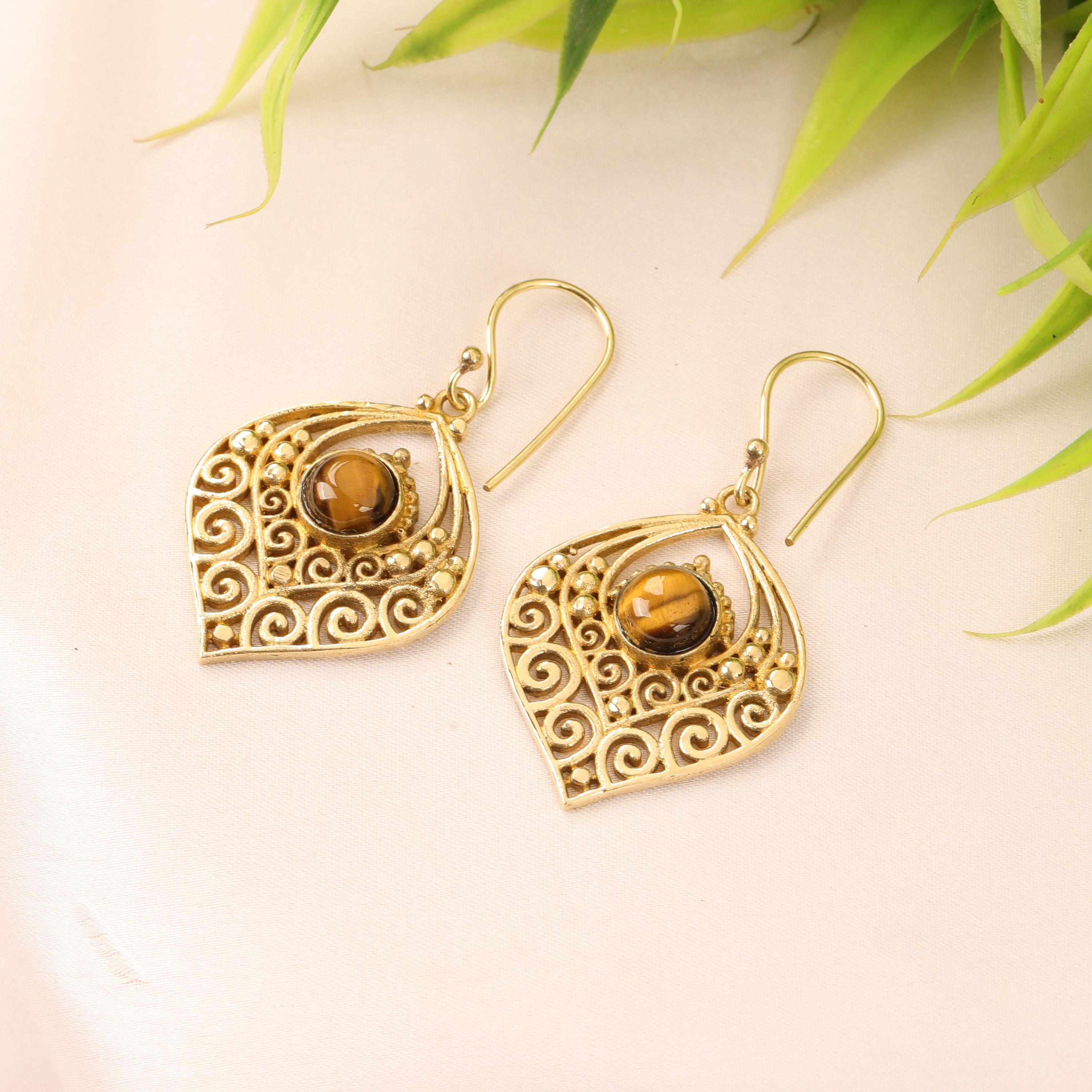 Crafted entirely from solid brass, these earrings glow with a warm golden tone that enhances their earthy, bohemian appeal. At the center of each earring sits a natural gemstone, carefully set to highlight its organic beauty. The gemstone acts as a focal point, bringing depth, color, and meaning to the tribal design.