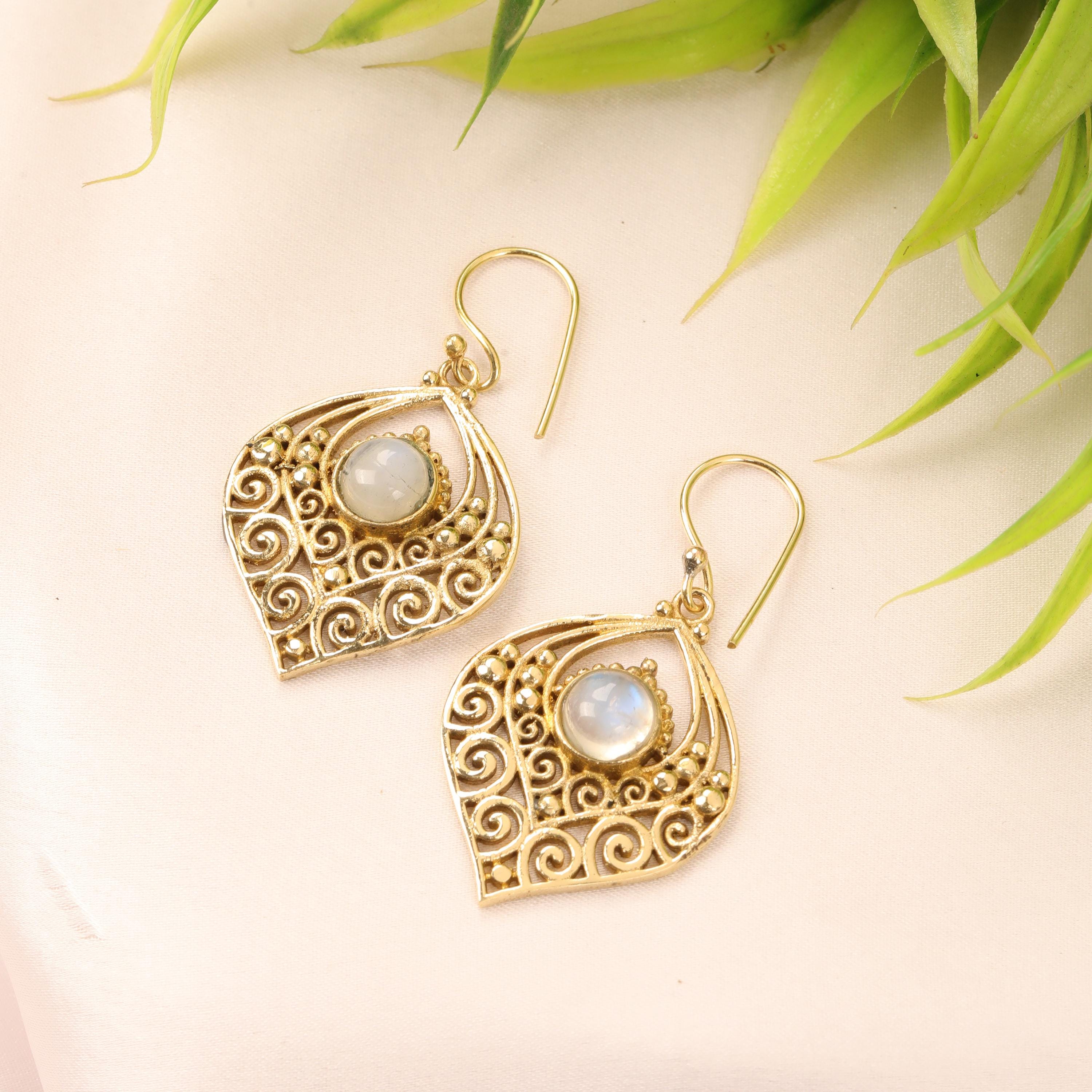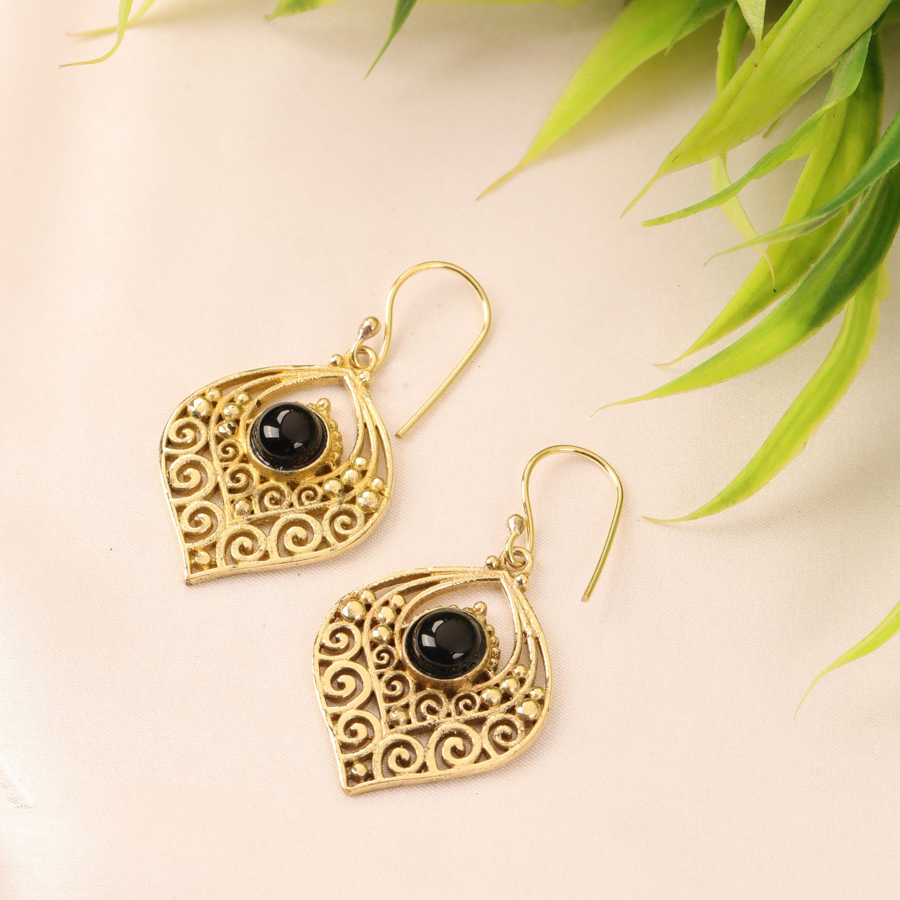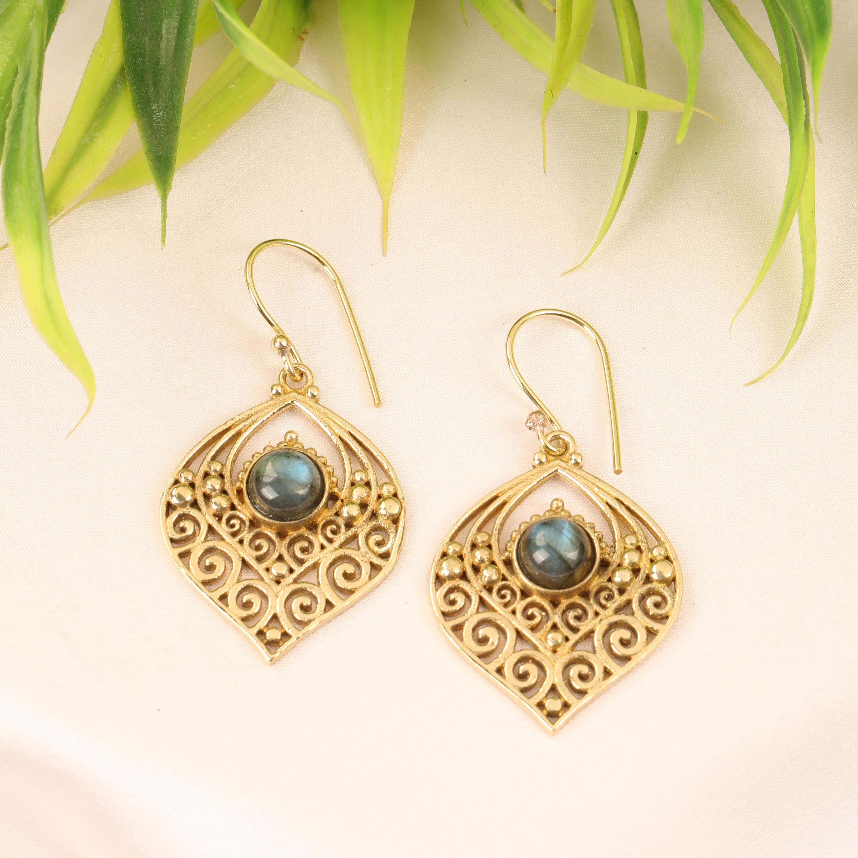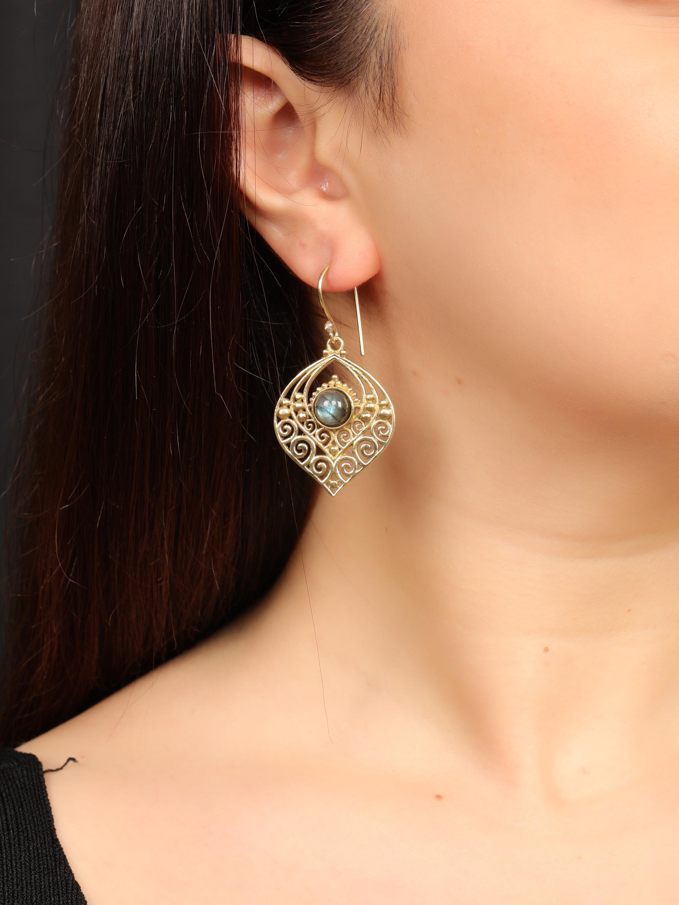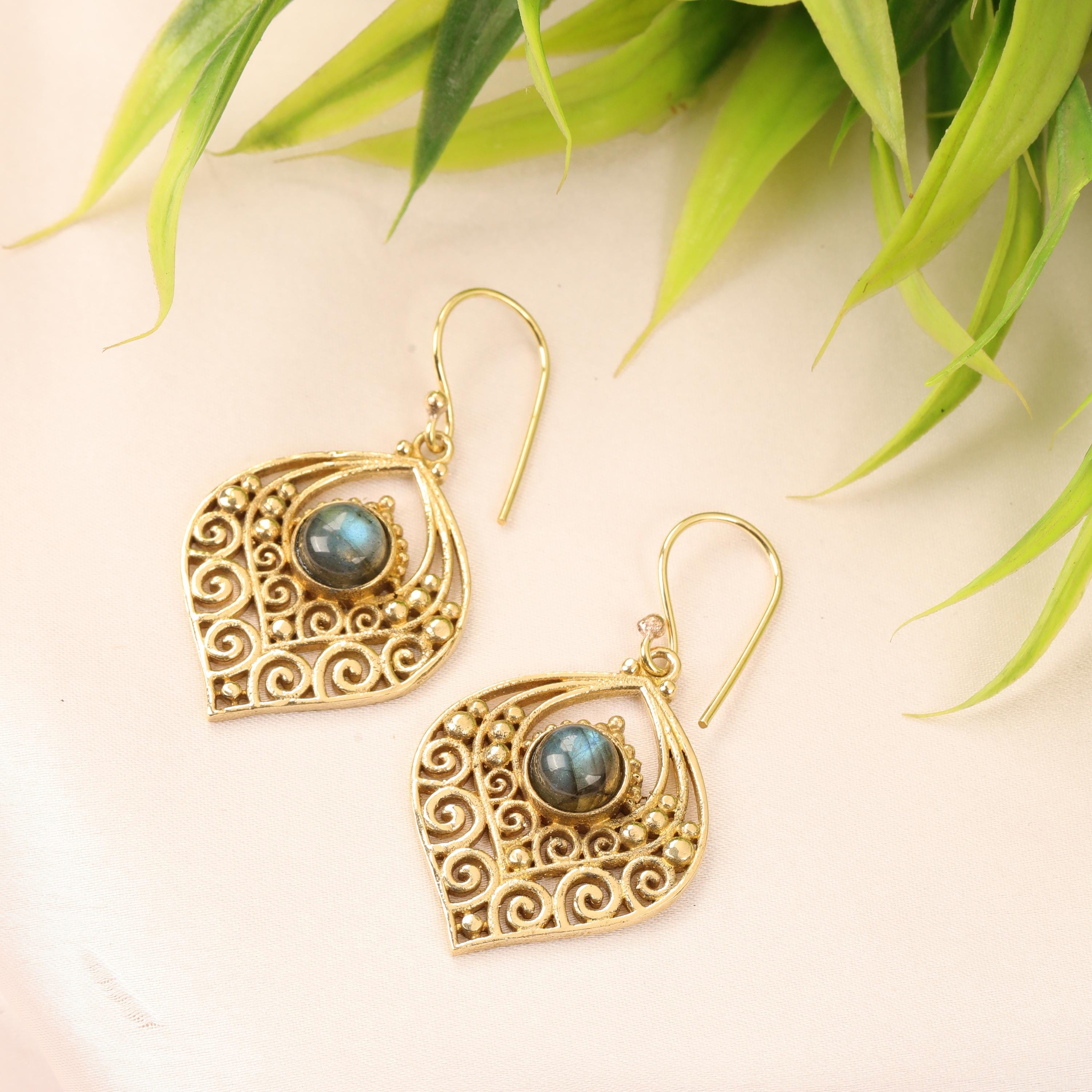 Crafted entirely from solid brass, these earrings glow with a warm golden tone that enhances their earthy, bohemian appeal. At the center of each earring sits a natural gemstone, carefully set to highlight its organic beauty. The gemstone acts as a focal point, bringing depth, color, and meaning to the tribal design.