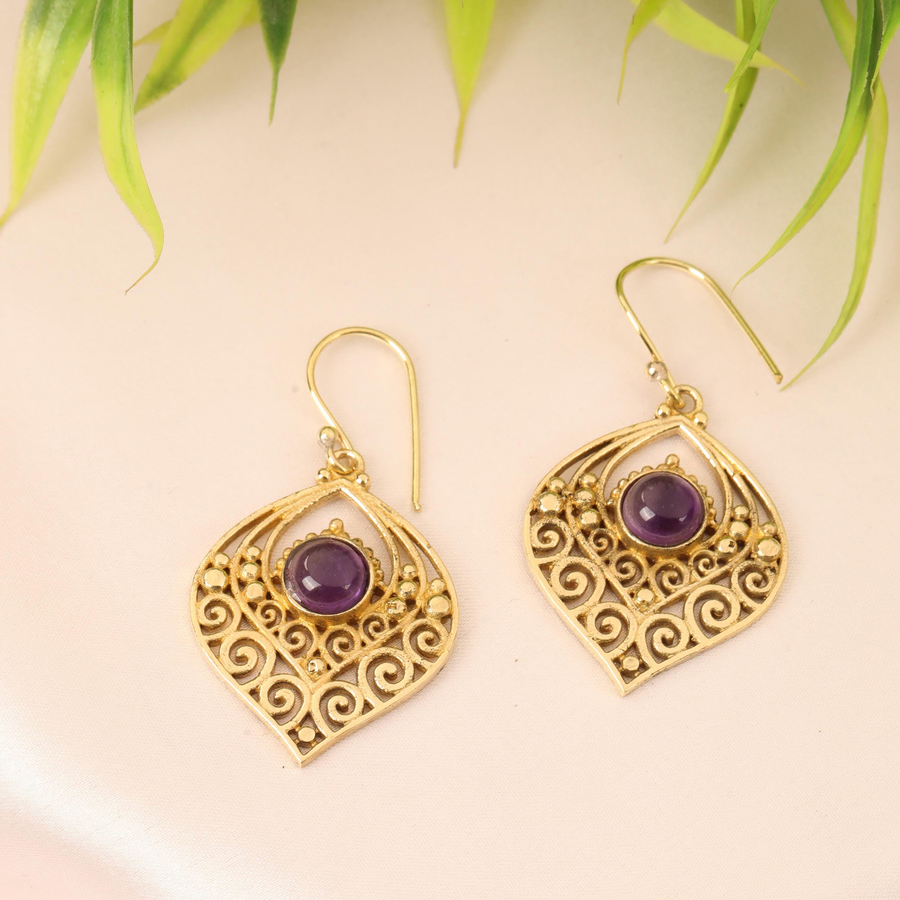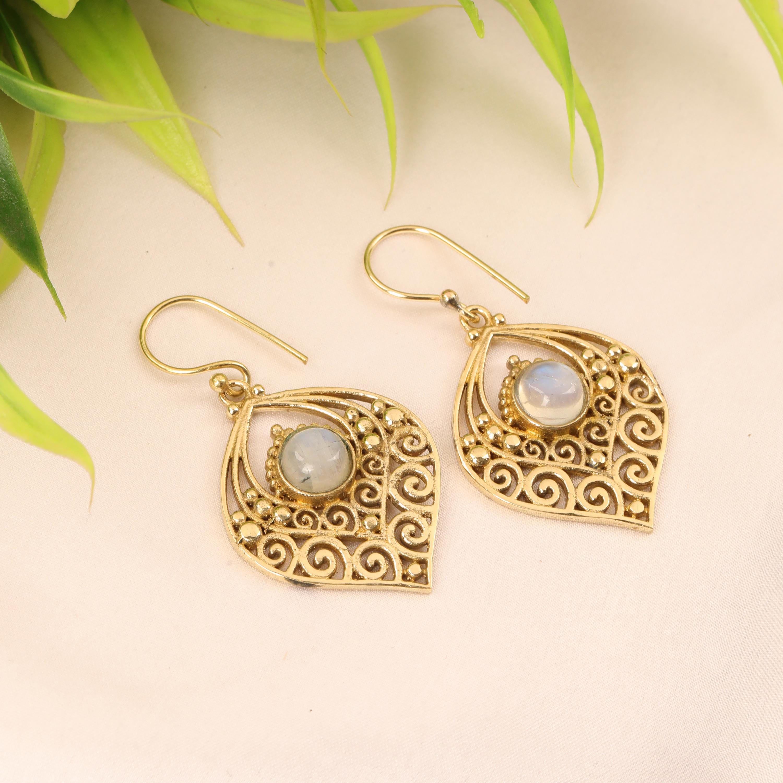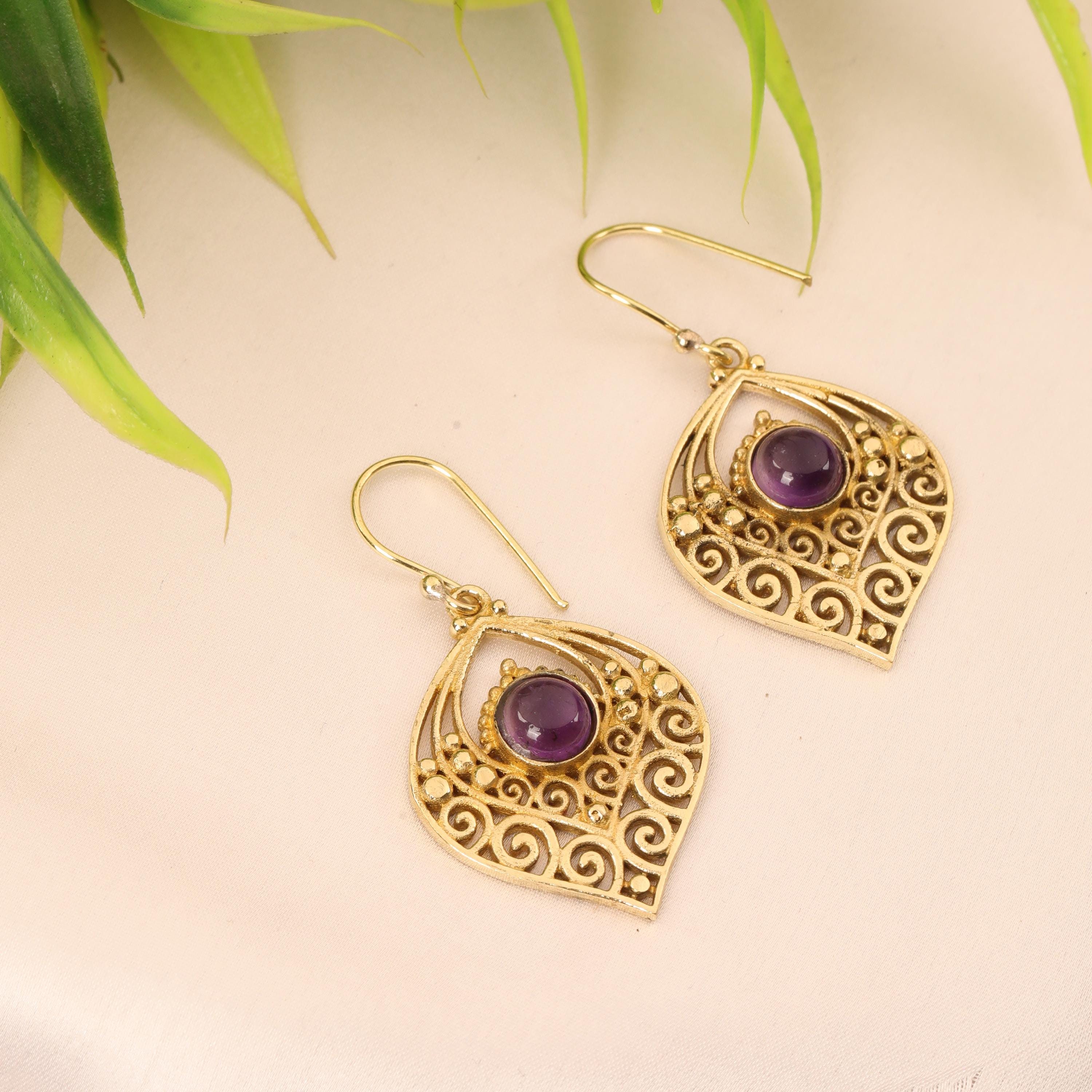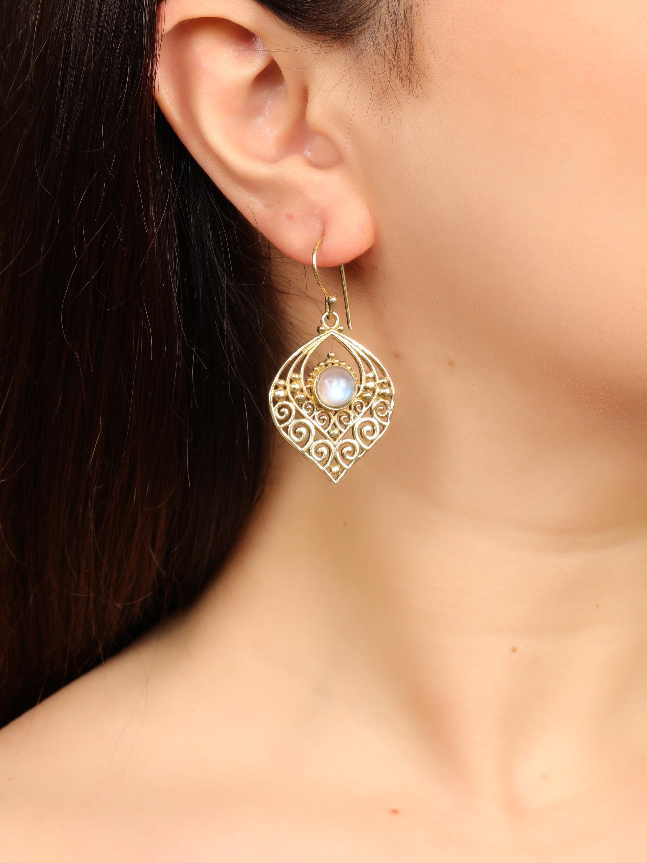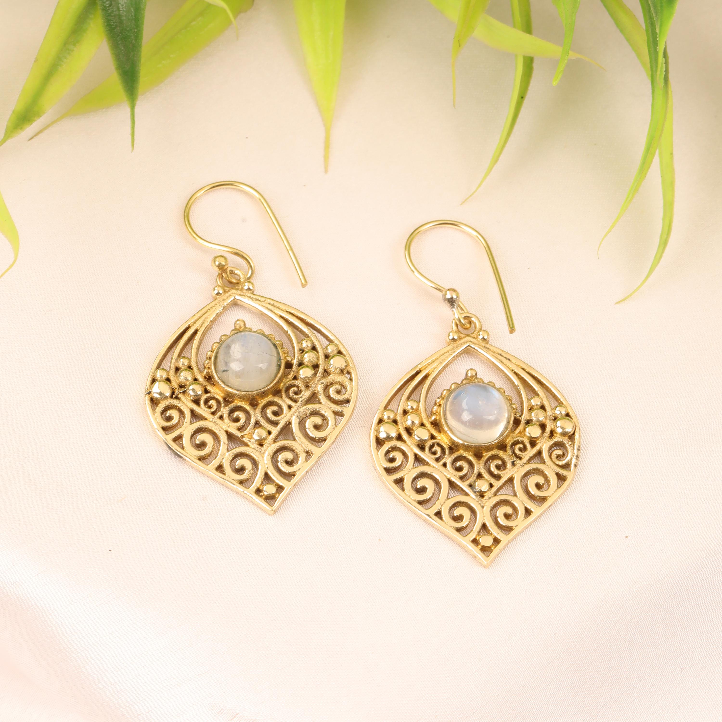 Crafted entirely from solid brass, these earrings glow with a warm golden tone that enhances their earthy, bohemian appeal. At the center of each earring sits a natural gemstone, carefully set to highlight its organic beauty. The gemstone acts as a focal point, bringing depth, color, and meaning to the tribal design.