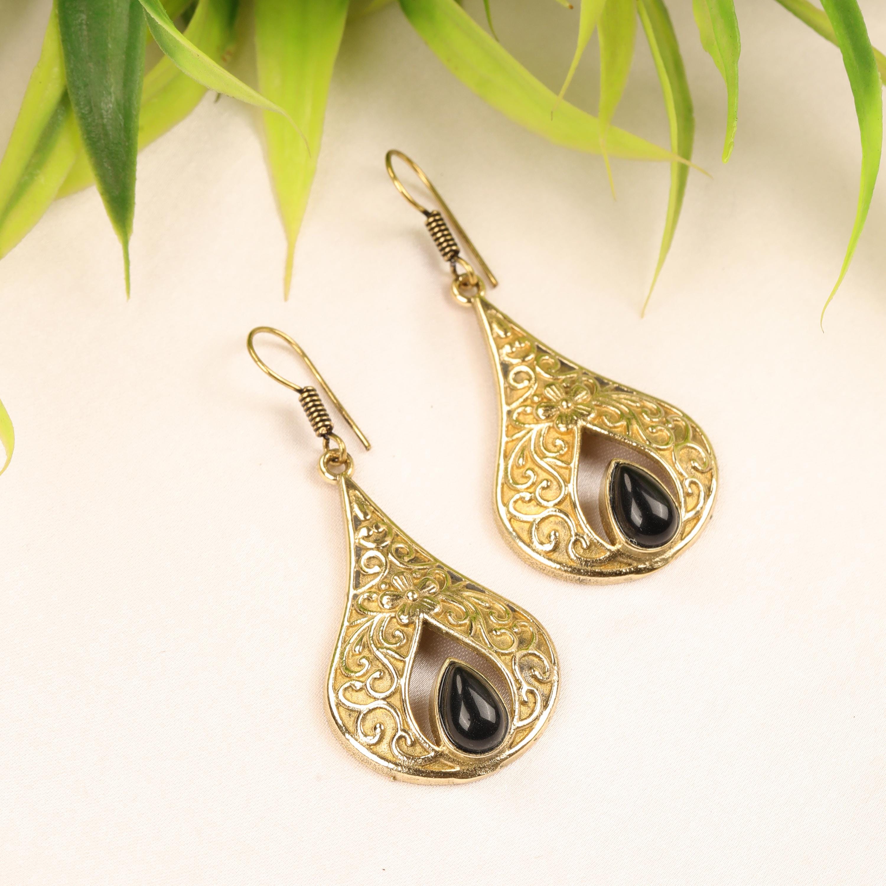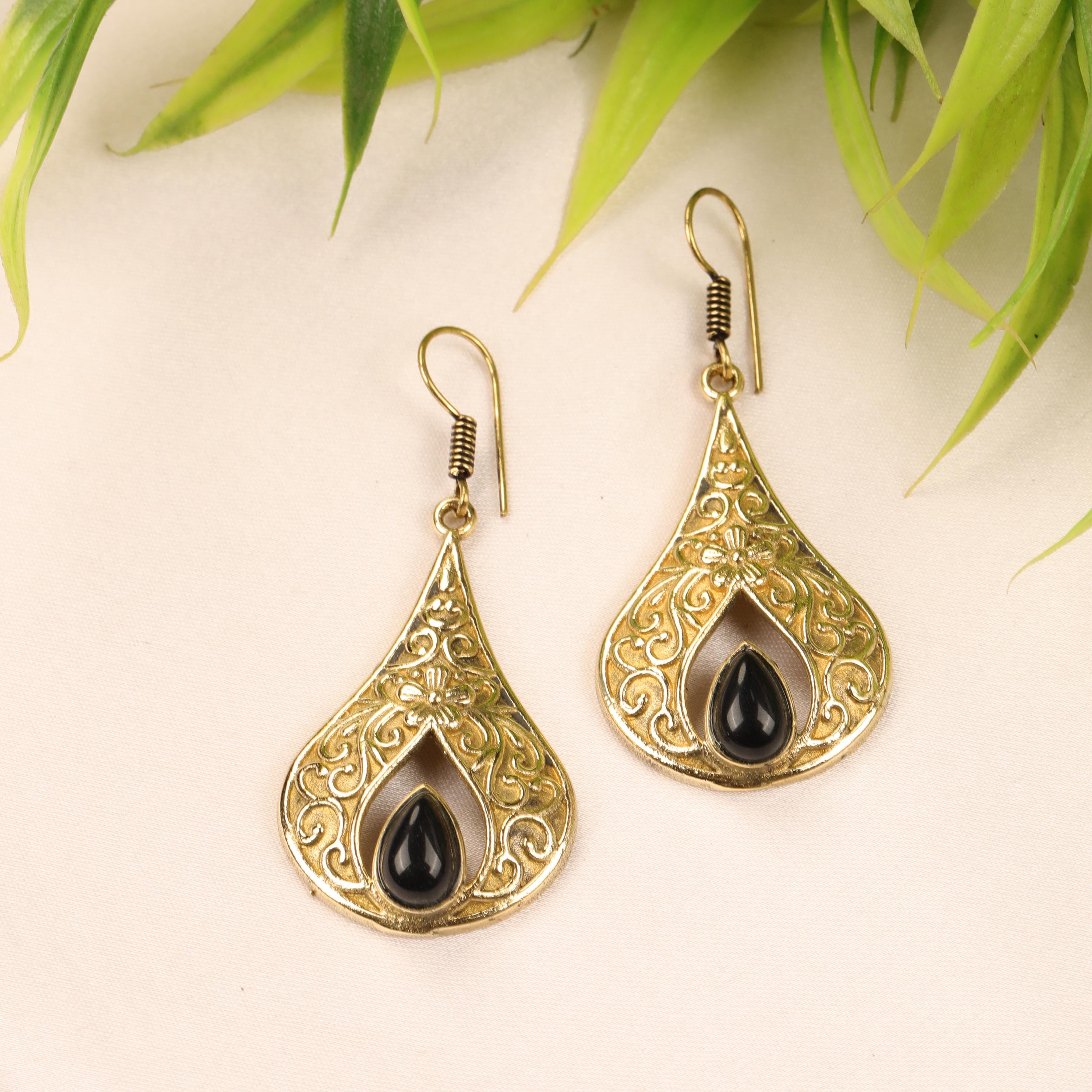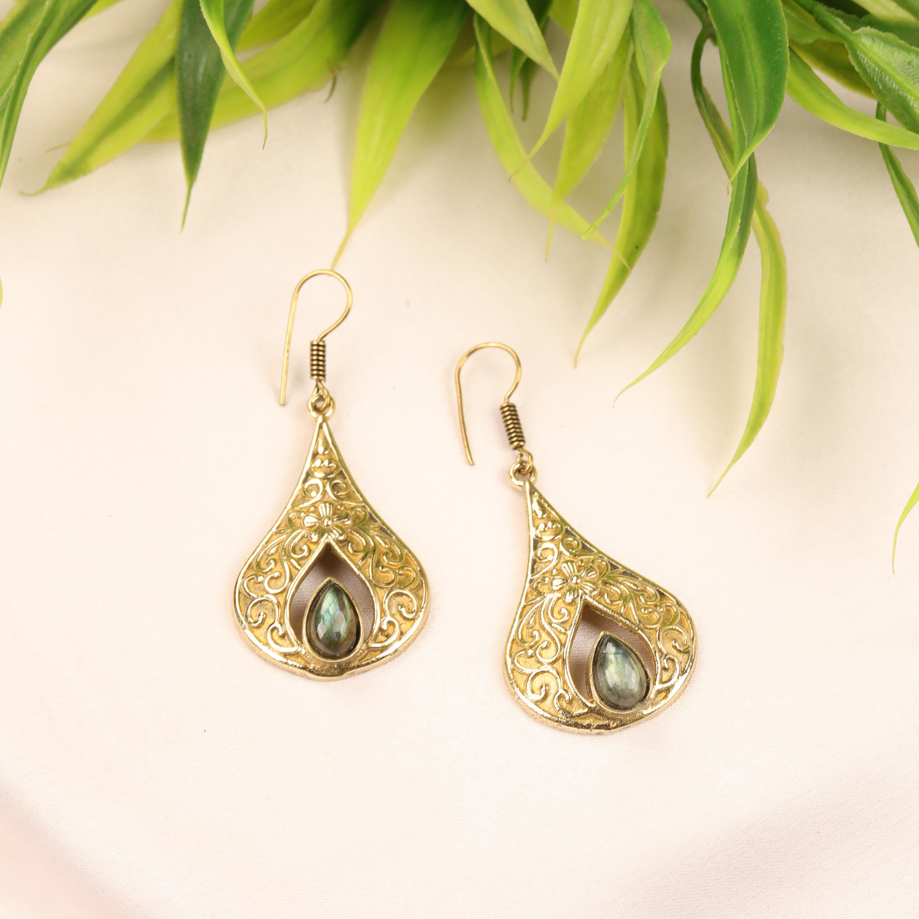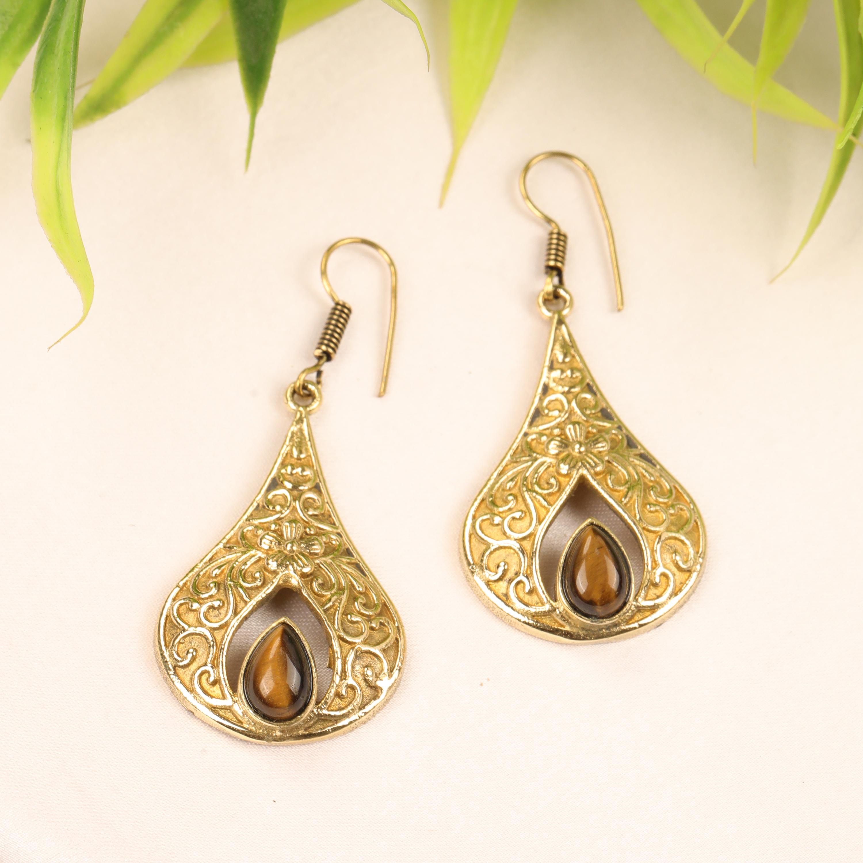 These elegant handmade brass teardrop earrings feature an ornate design inspired by vintage and bohemian styles. Each earring showcases a graceful teardrop frame with intricate detailing, finished with a natural gemstone set at the center for a touch of color and meaning.