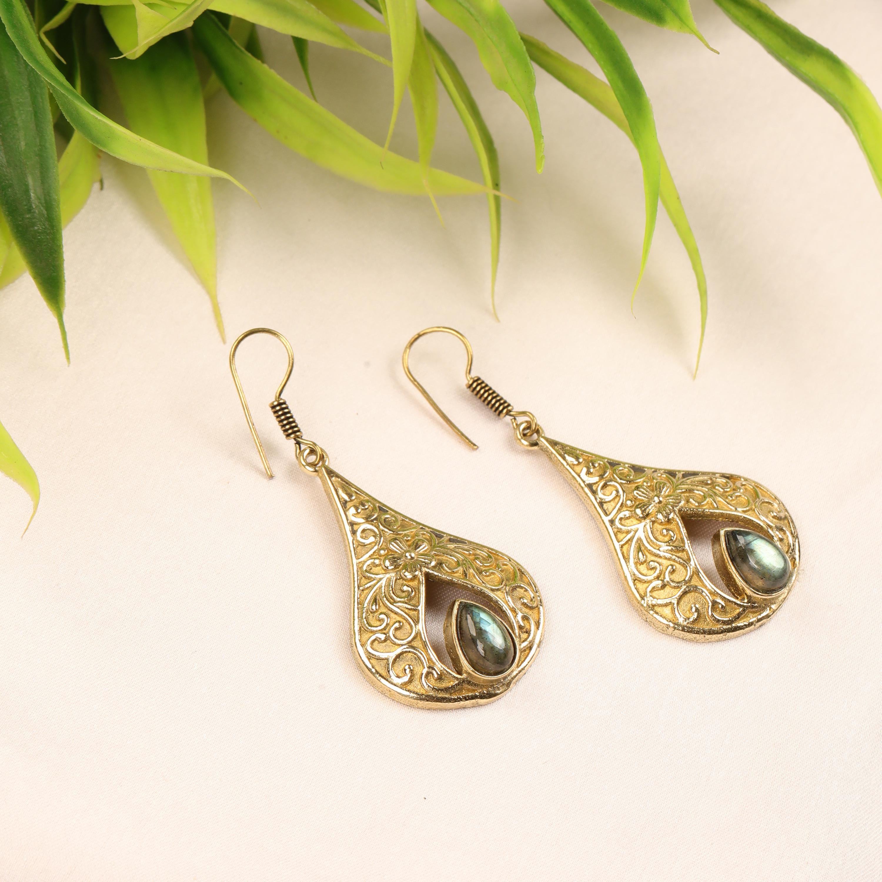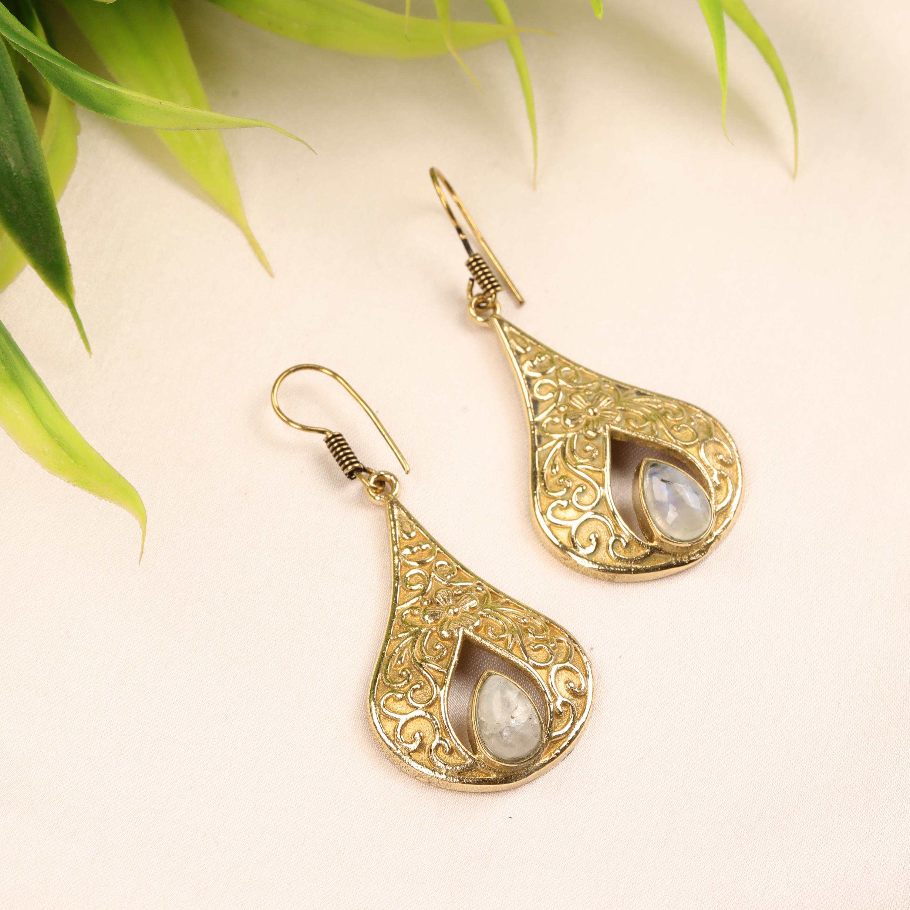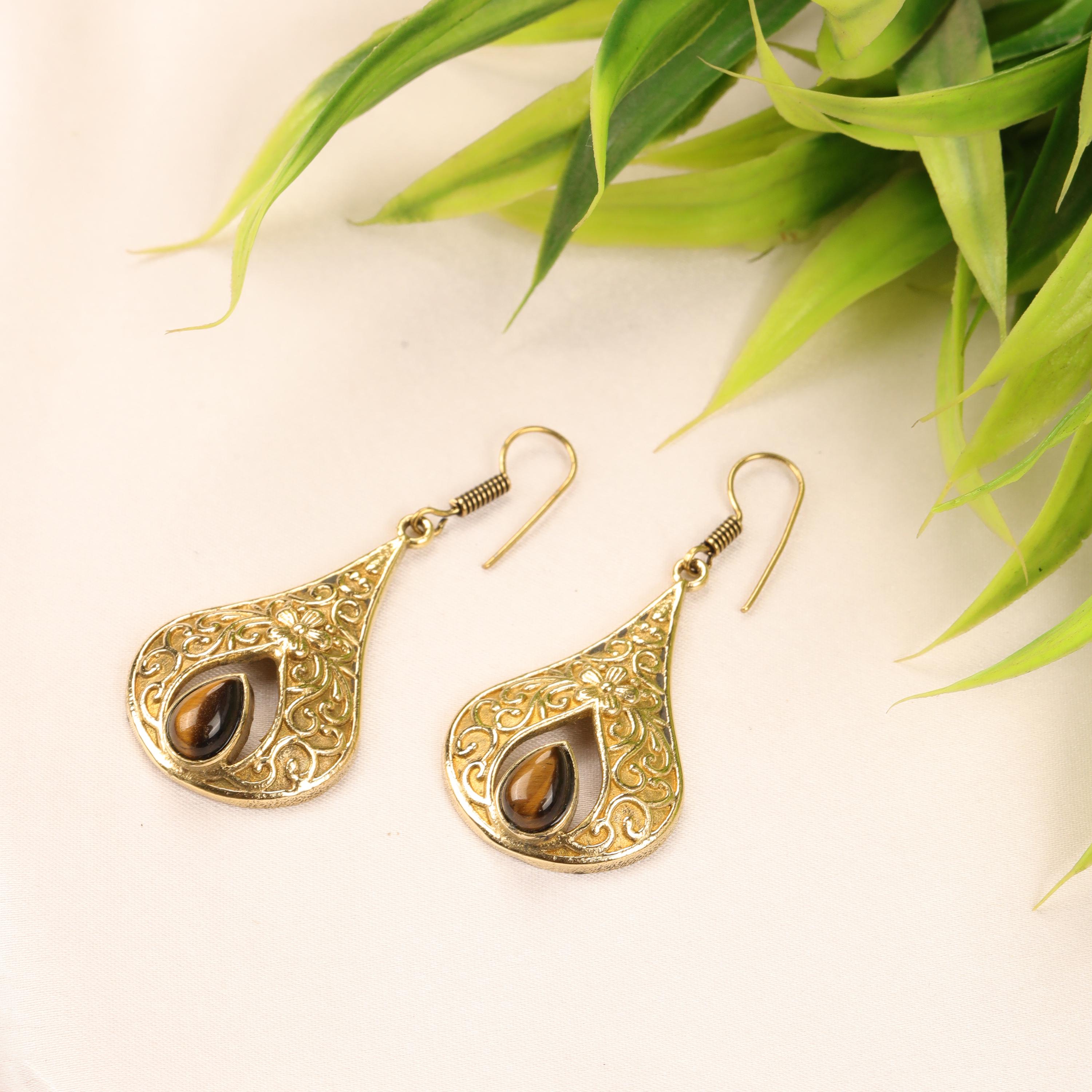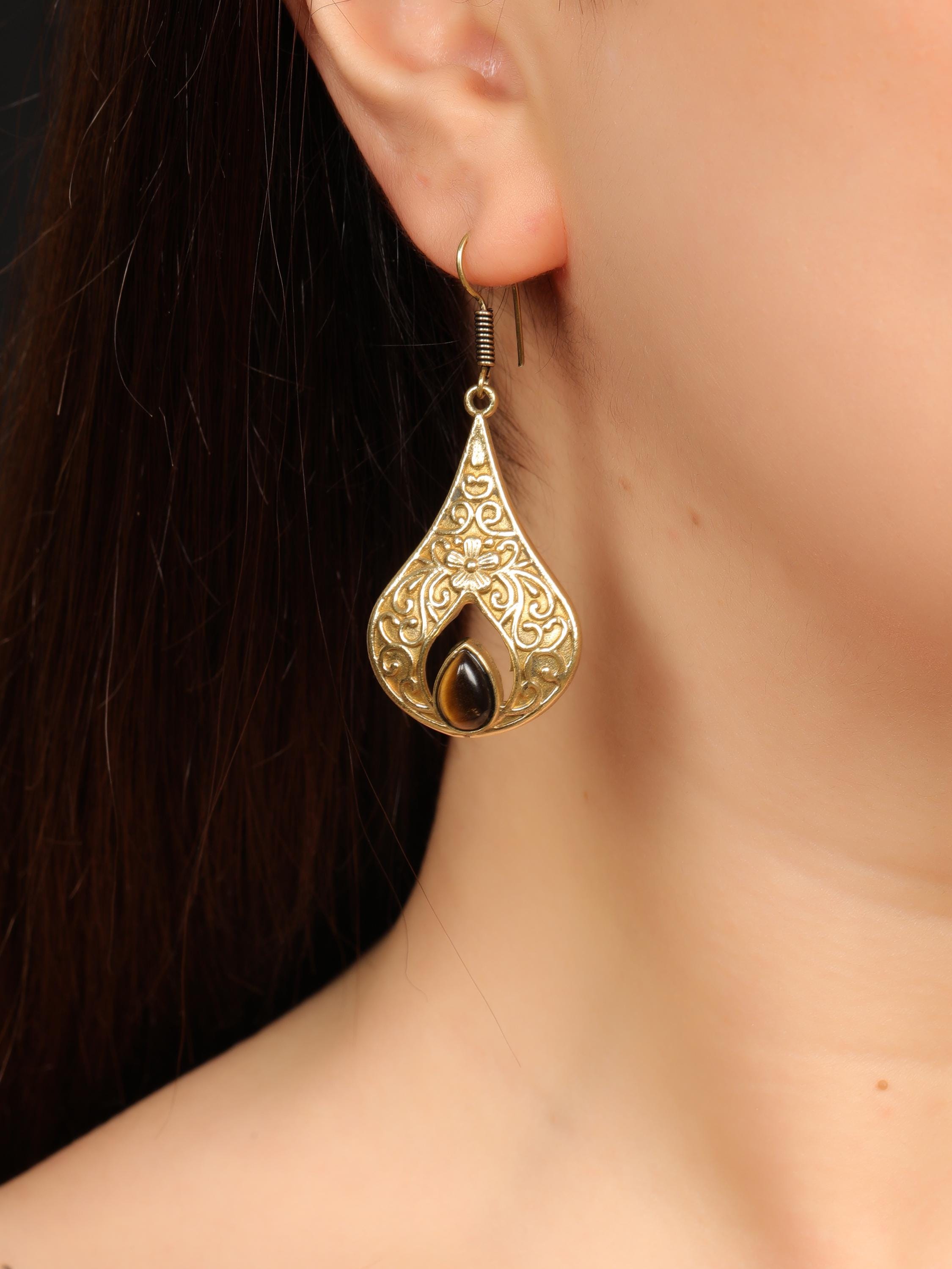 These elegant handmade brass teardrop earrings feature an ornate design inspired by vintage and bohemian styles. Each earring showcases a graceful teardrop frame with intricate detailing, finished with a natural gemstone set at the center for a touch of color and meaning.