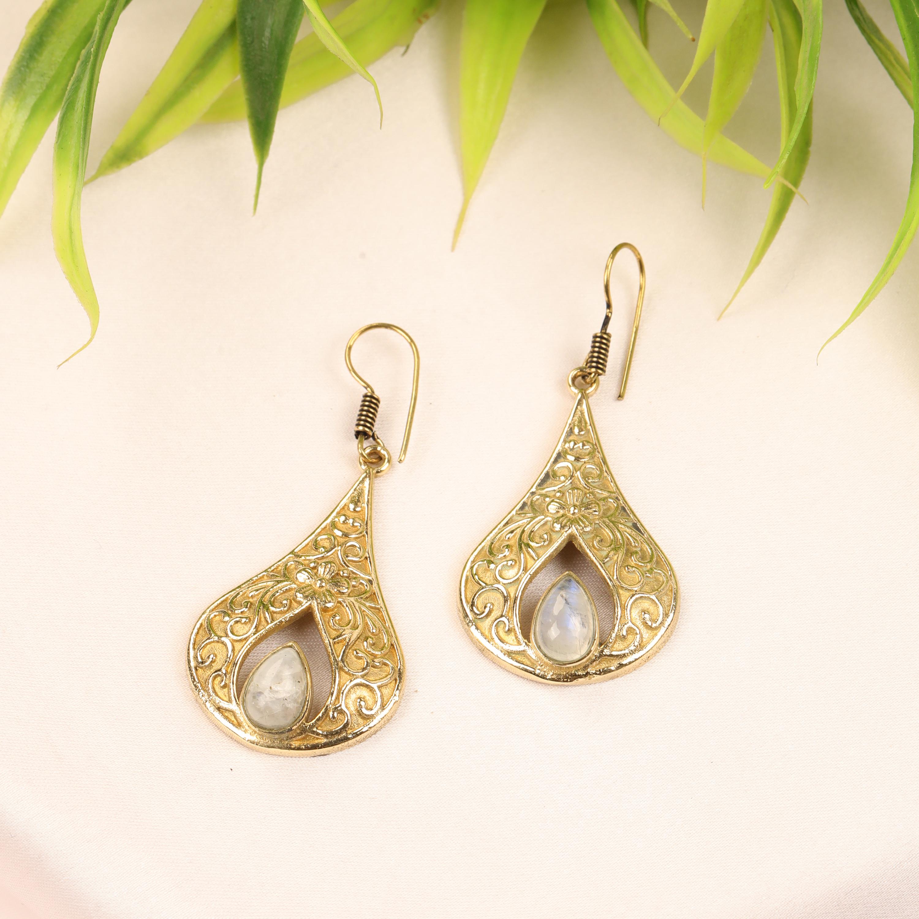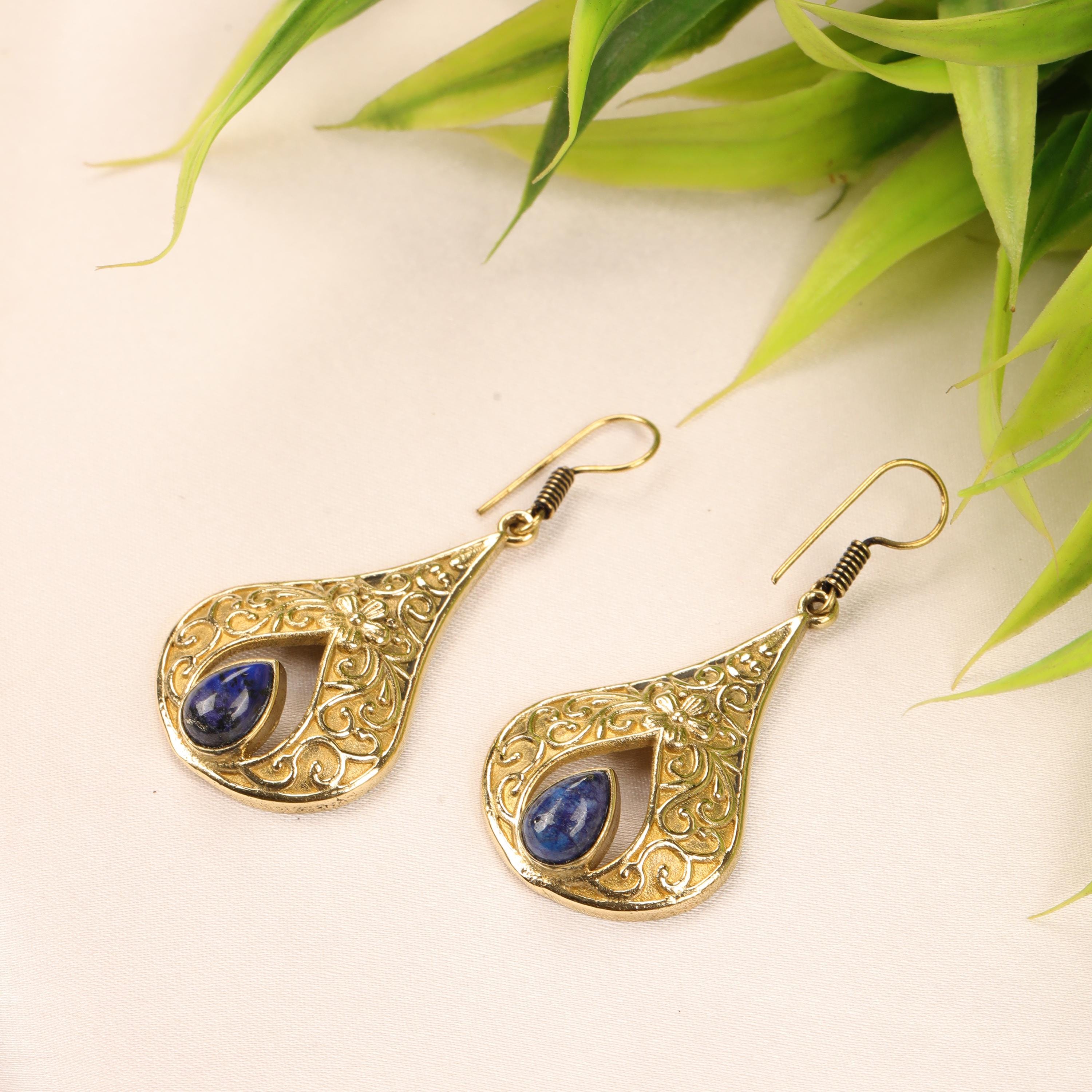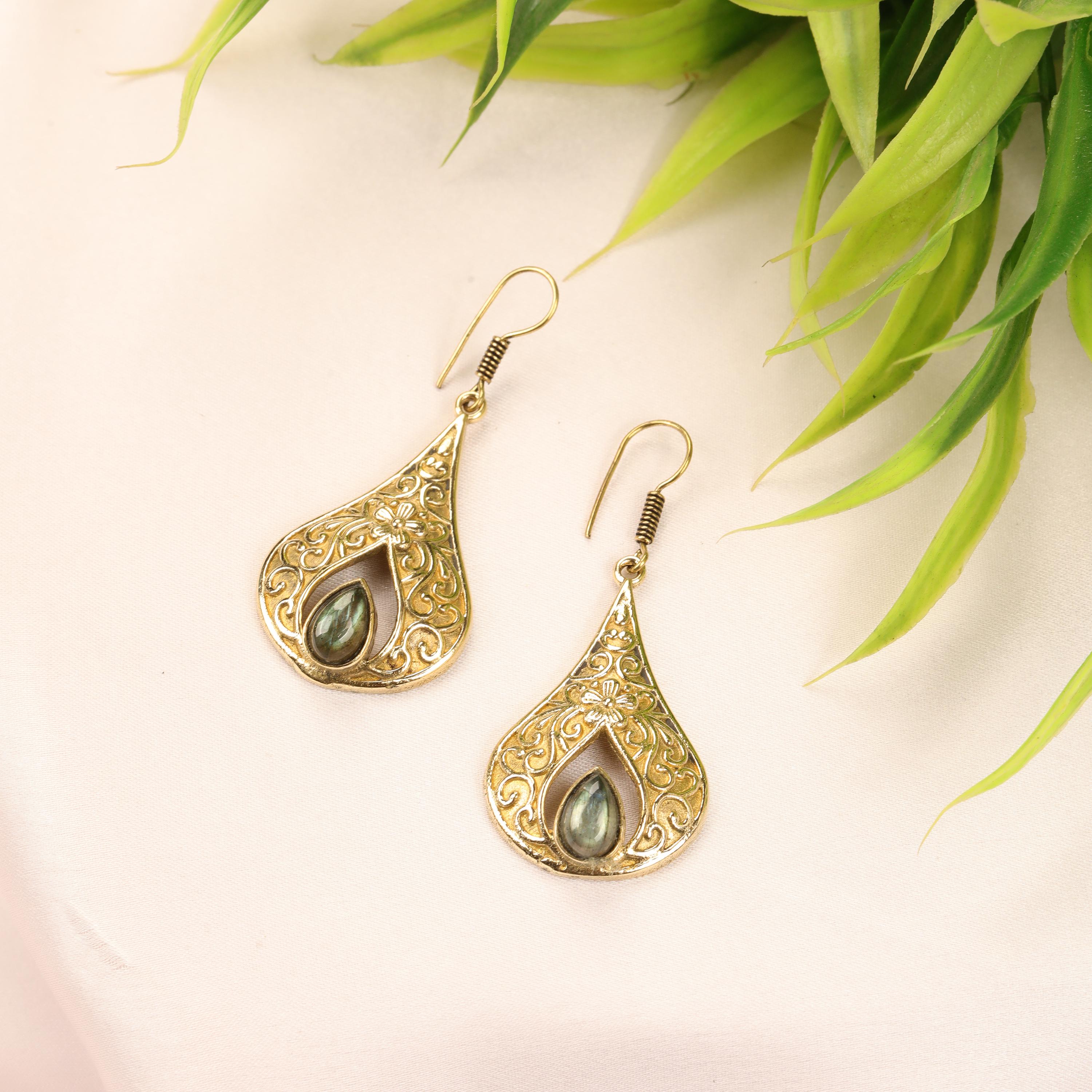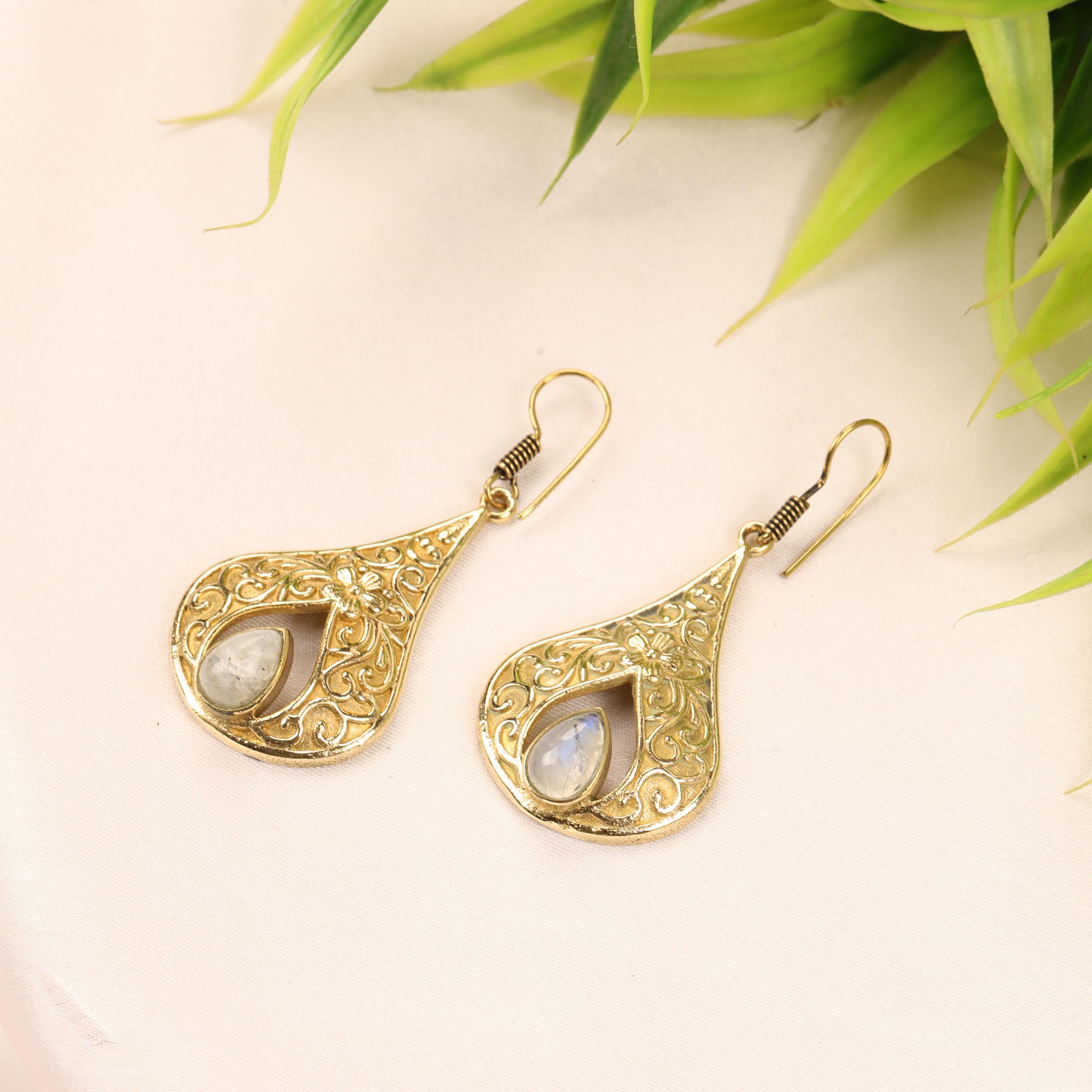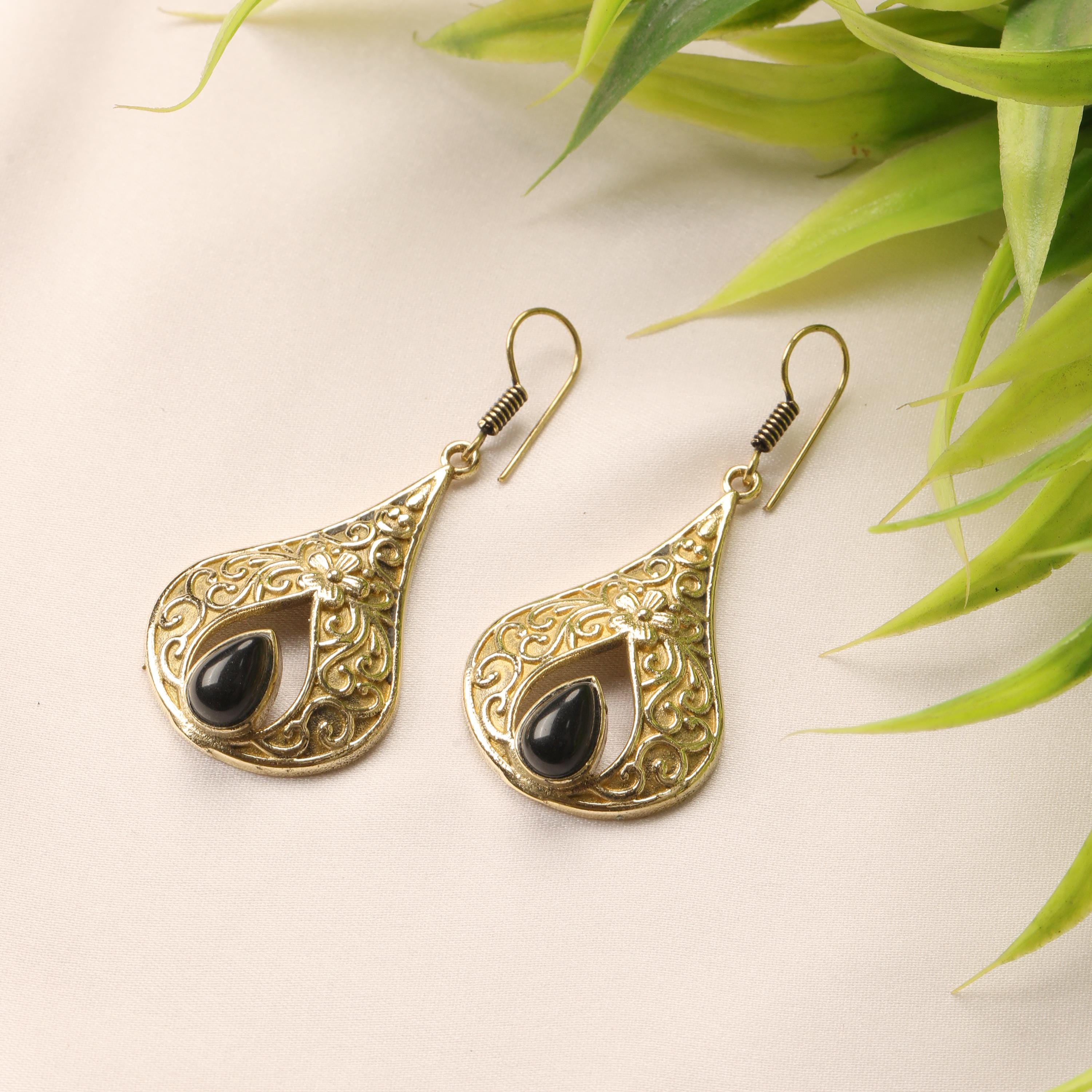 These elegant handmade brass teardrop earrings feature an ornate design inspired by vintage and bohemian styles. Each earring showcases a graceful teardrop frame with intricate detailing, finished with a natural gemstone set at the center for a touch of color and meaning.