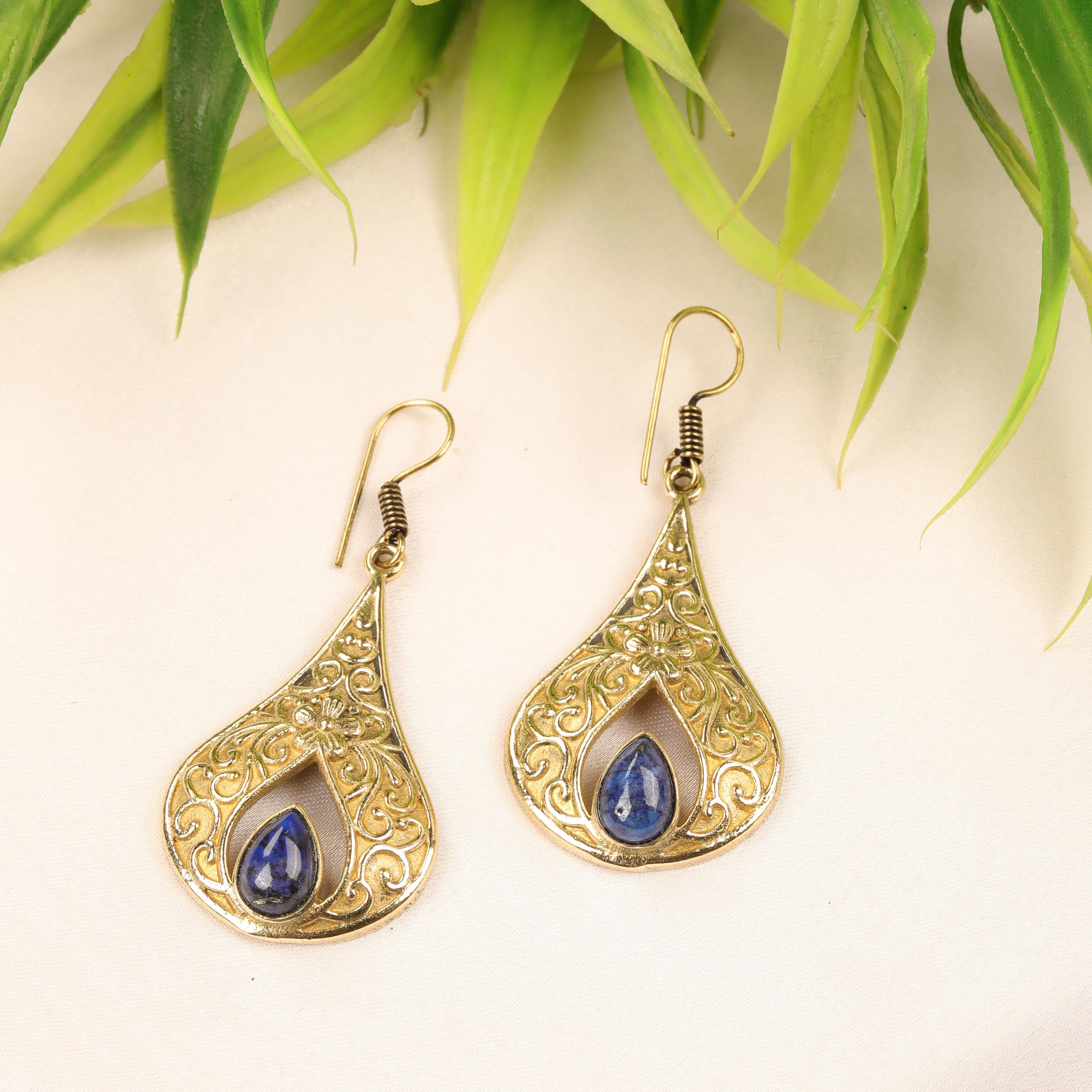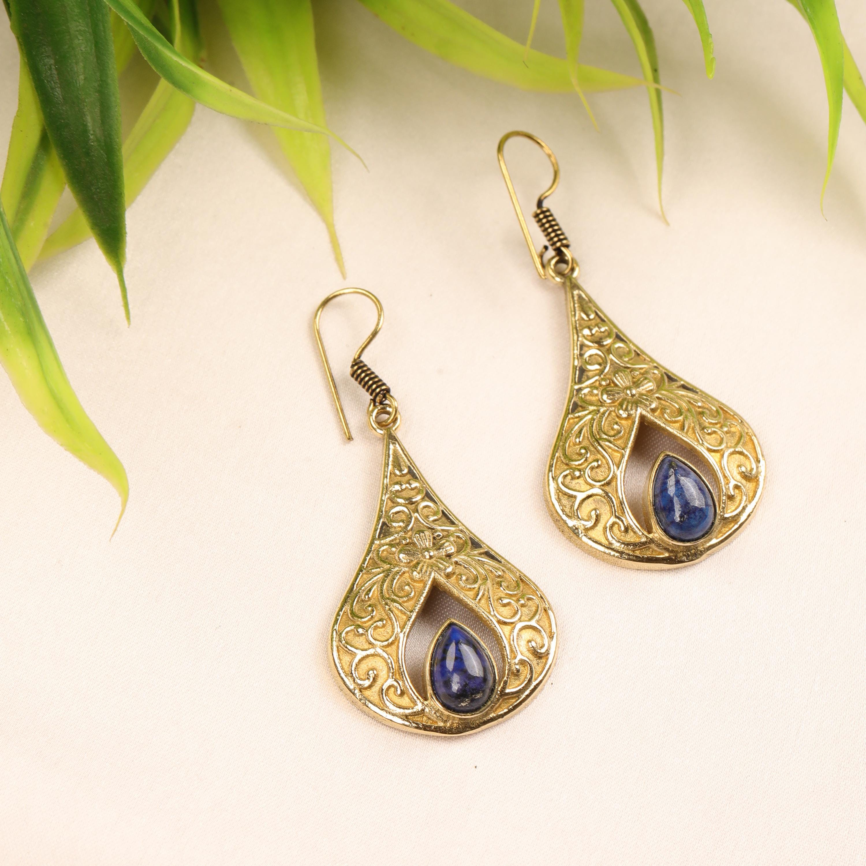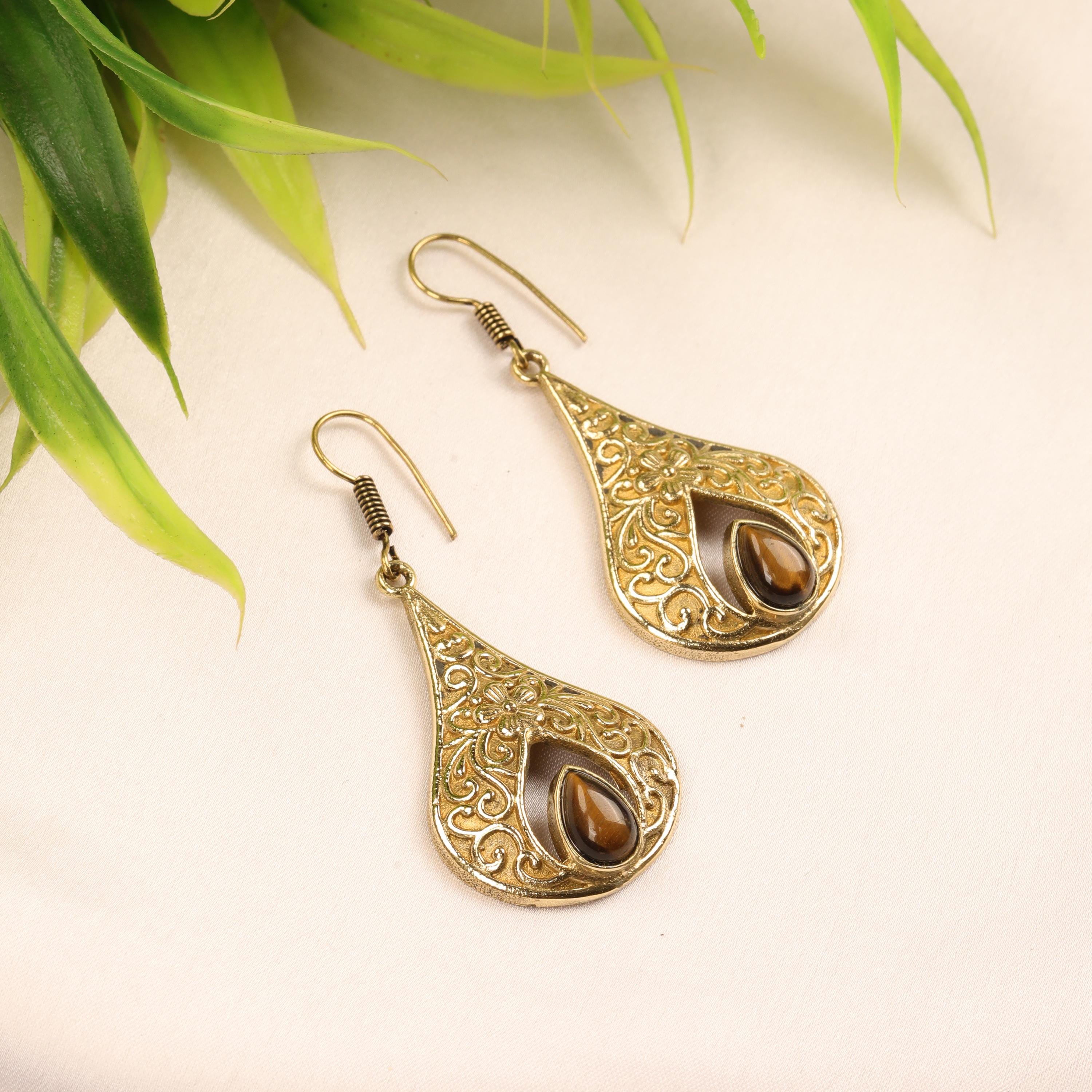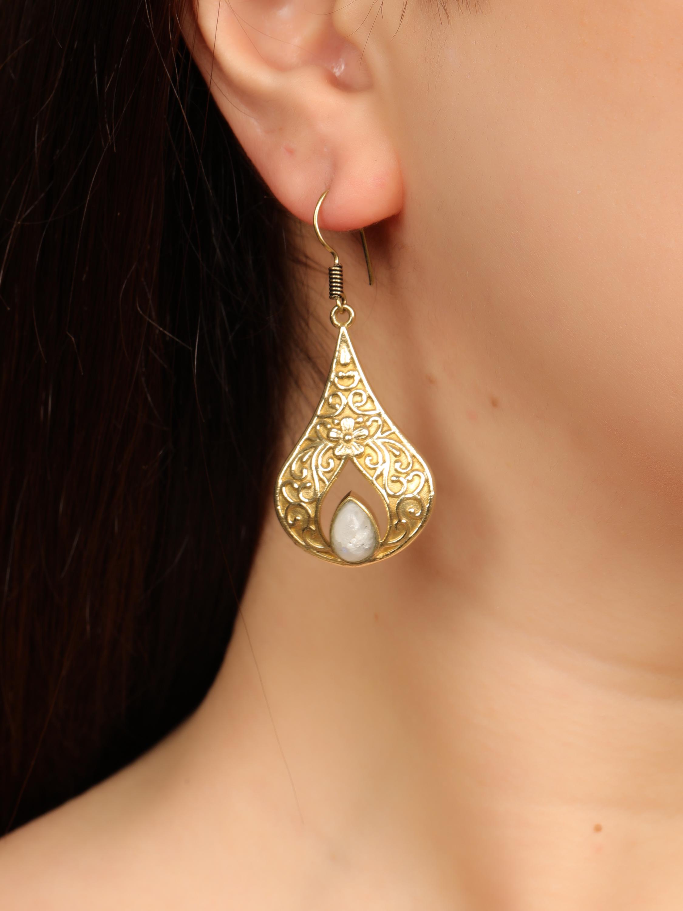 These elegant handmade brass teardrop earrings feature an ornate design inspired by vintage and bohemian styles. Each earring showcases a graceful teardrop frame with intricate detailing, finished with a natural gemstone set at the center for a touch of color and meaning.