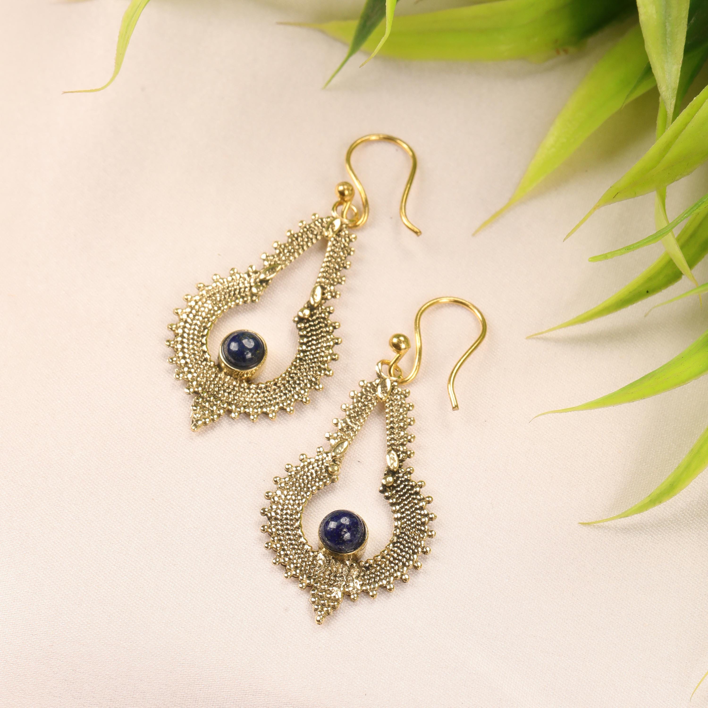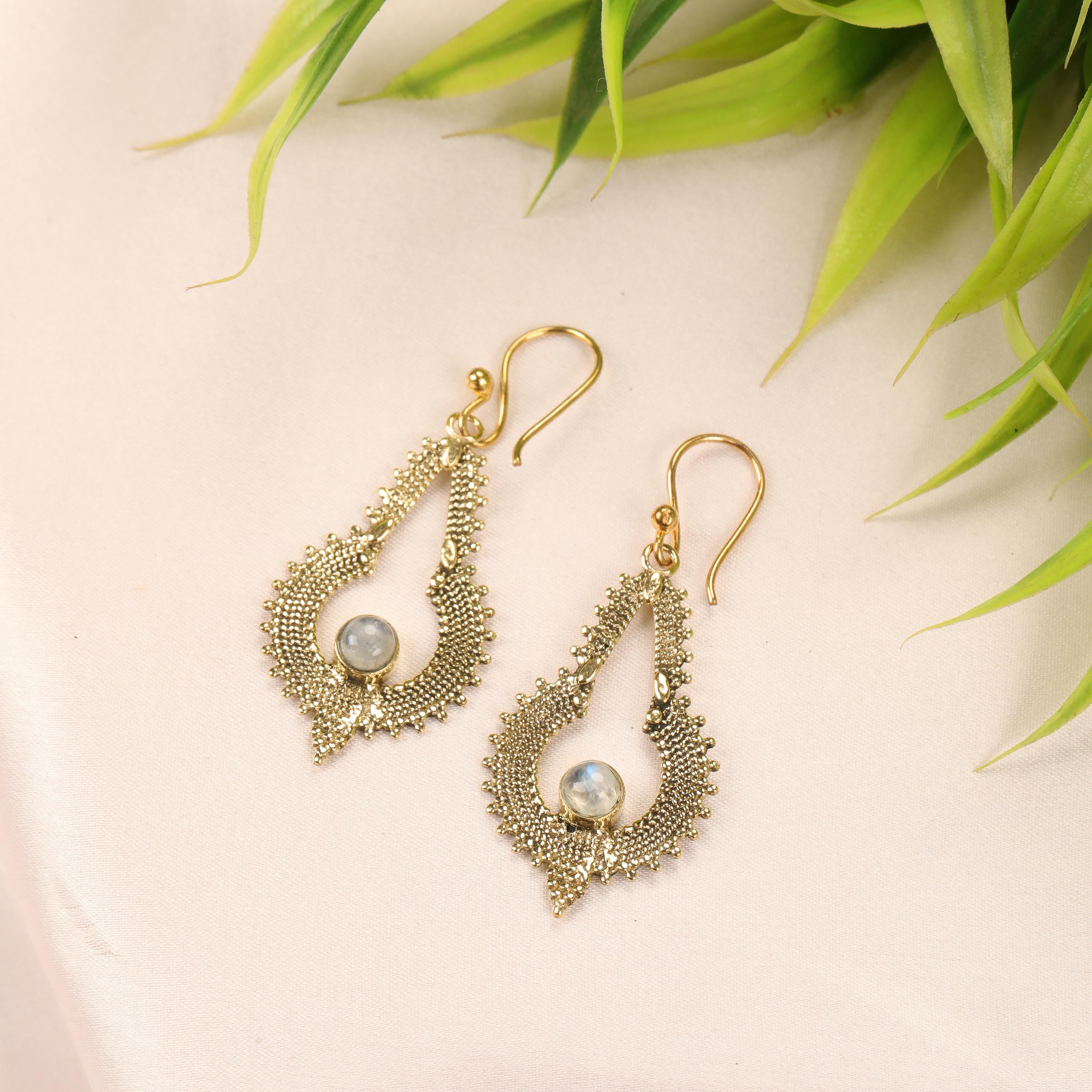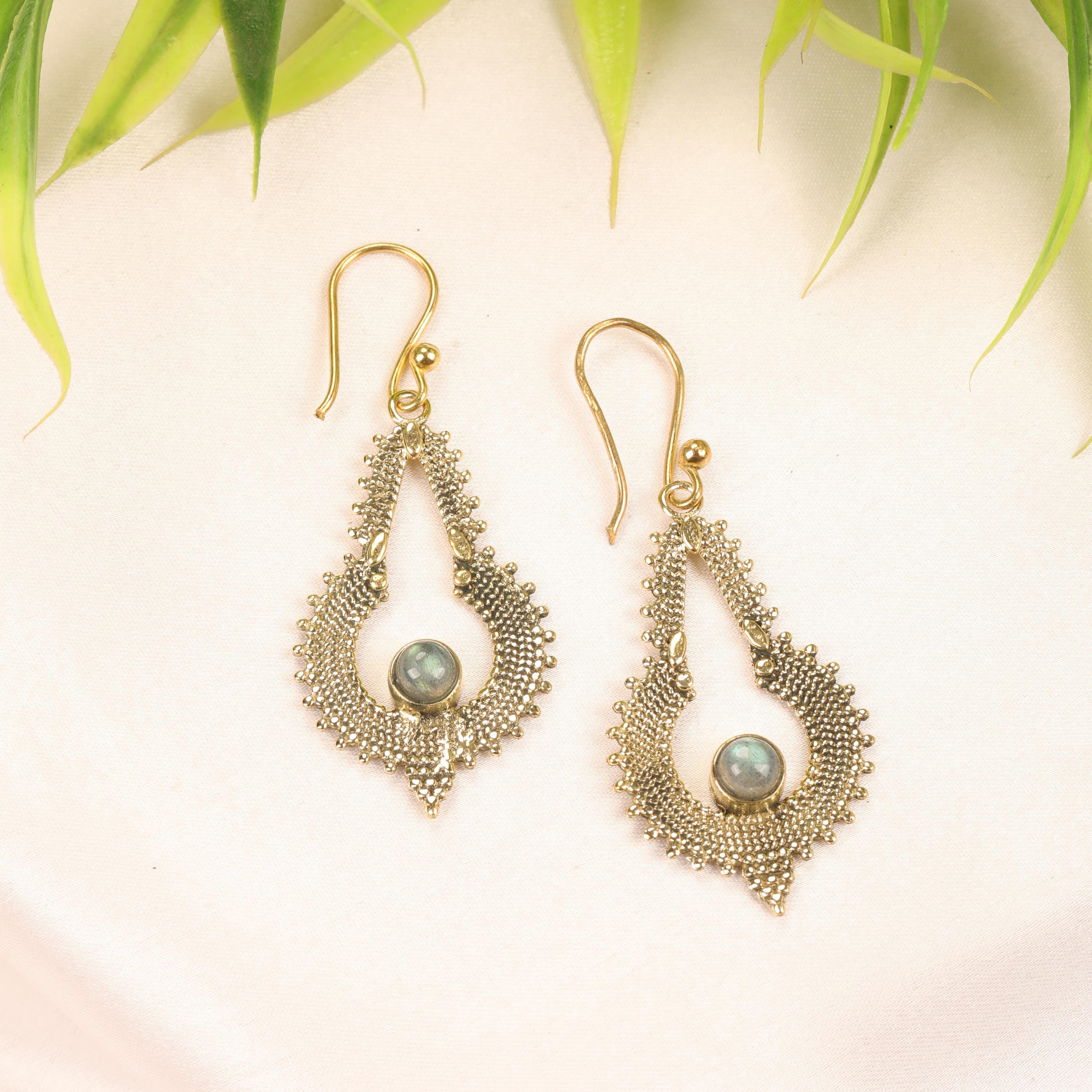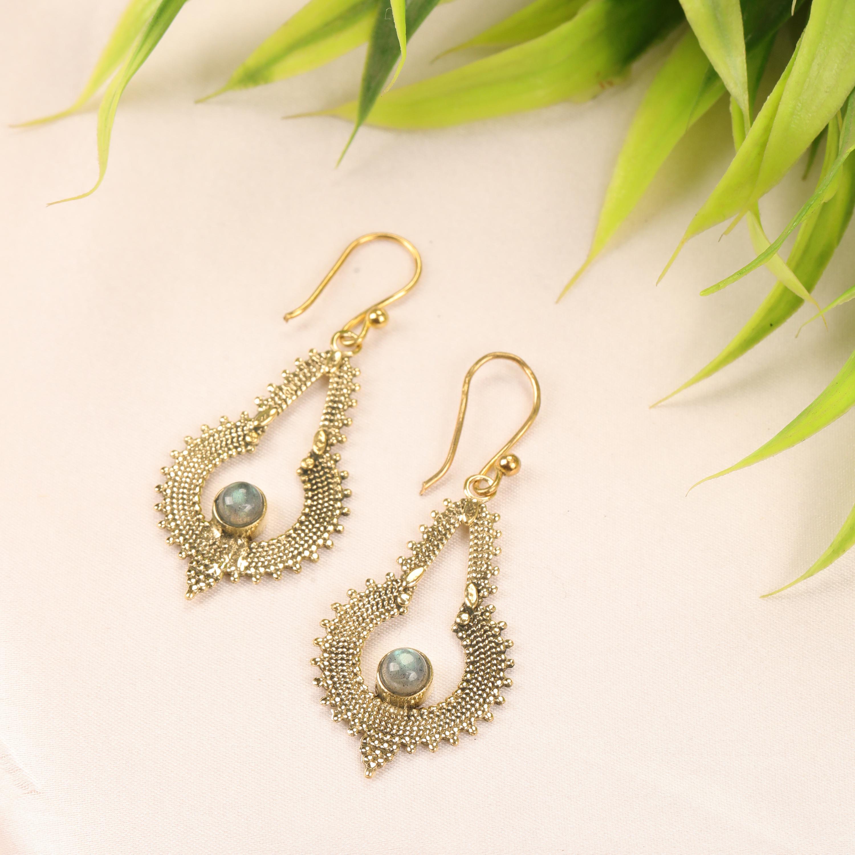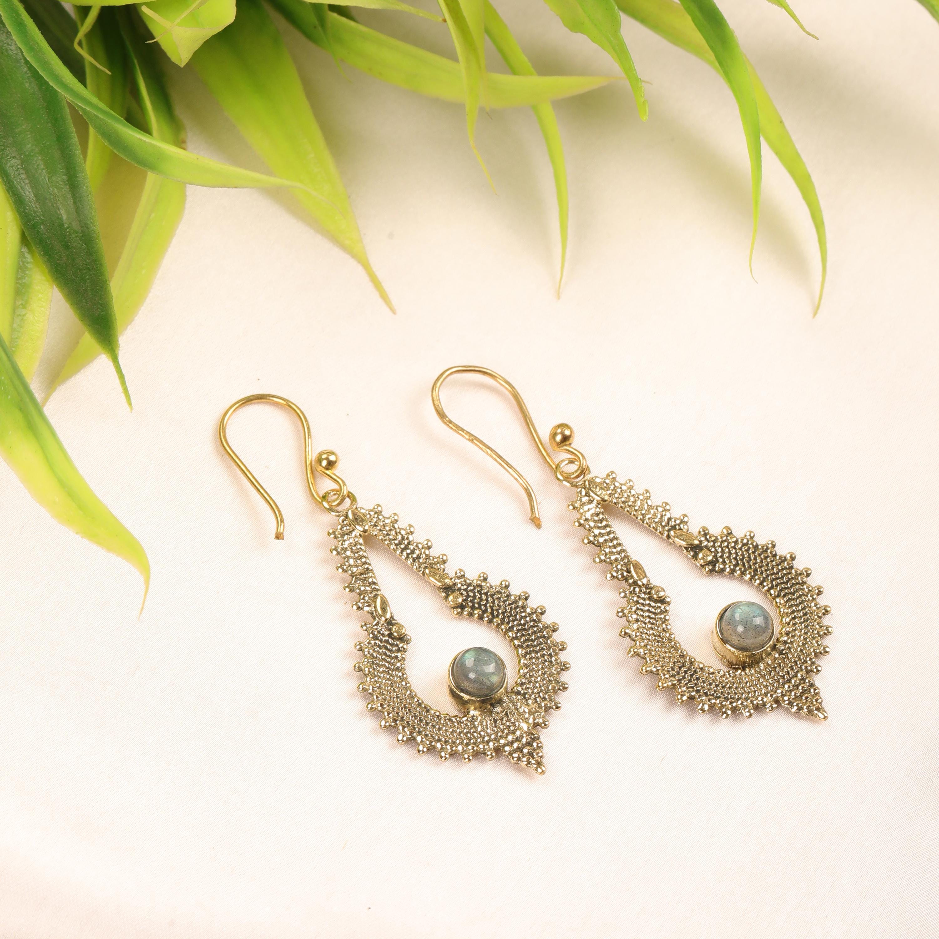 Crafted from solid brass, the earrings have a warm, golden glow that enhances the organic, earthy aesthetic of the piece. At the heart of each earring sits a natural gemstone, carefully set to create a beautiful contrast against the textured brass surface. Each gemstone carries its own natural variations, making every pair truly one of a kind.