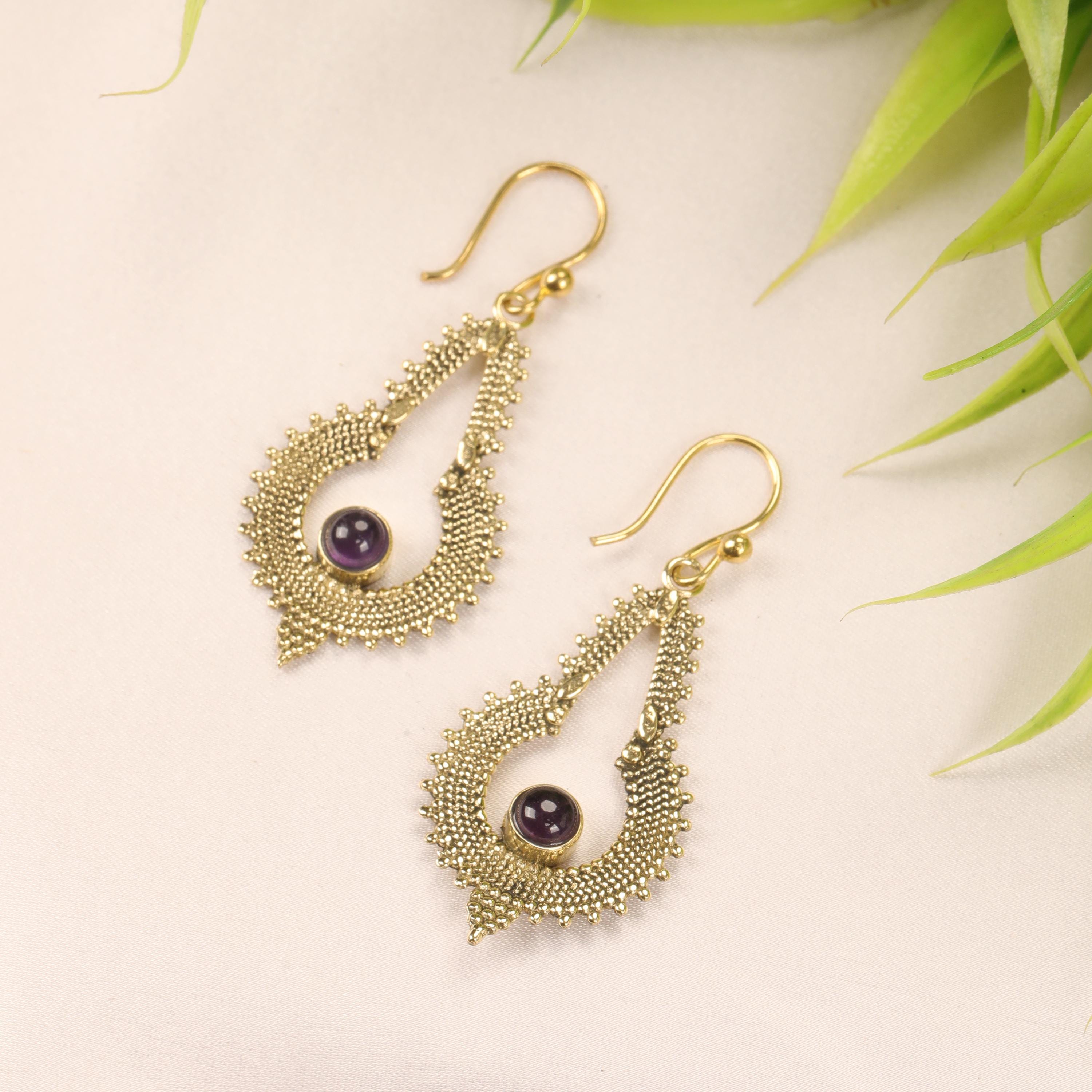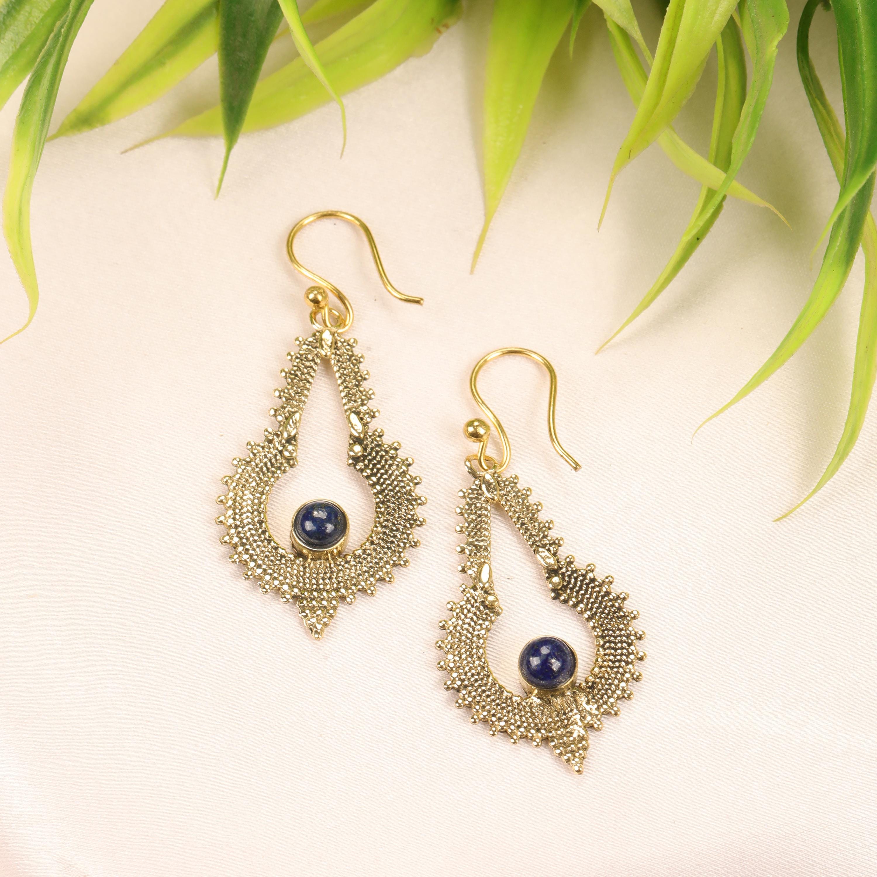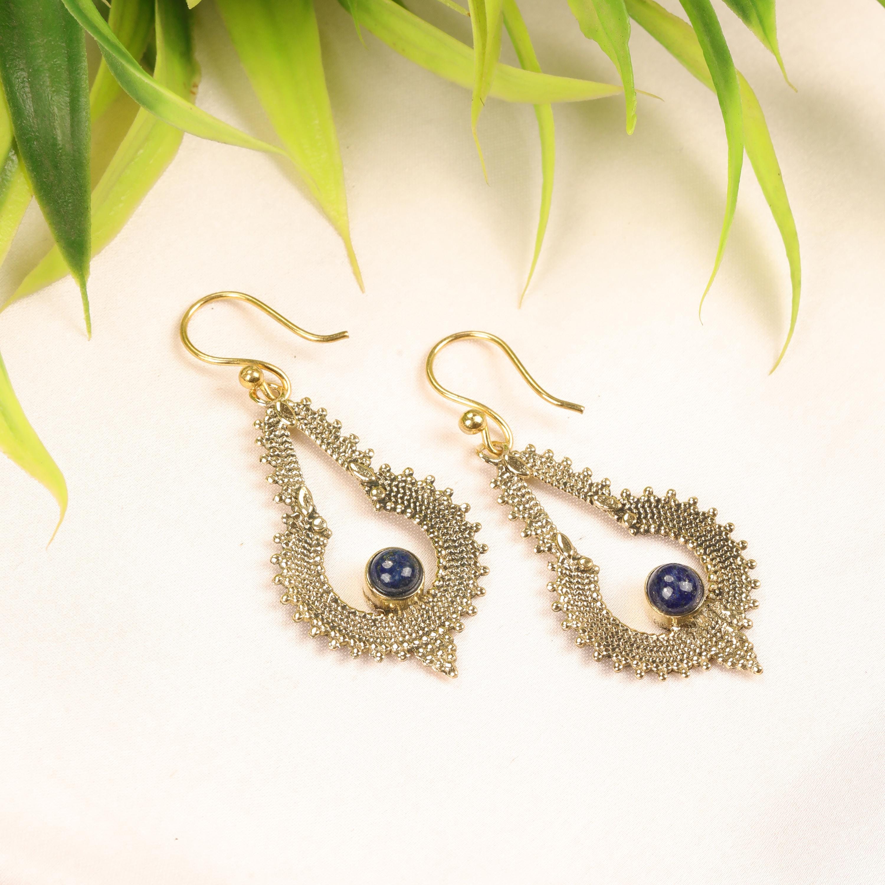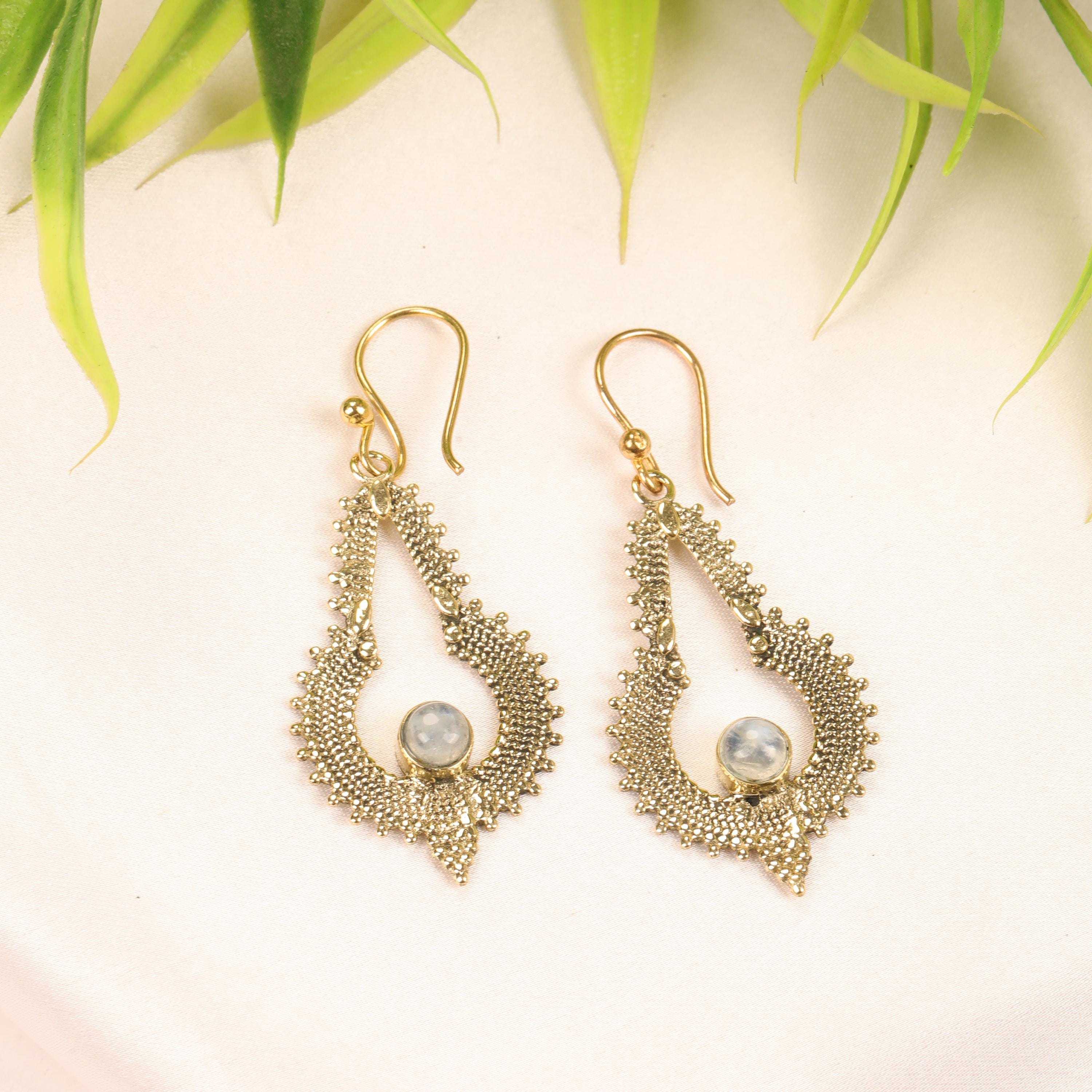 Crafted from solid brass, the earrings have a warm, golden glow that enhances the organic, earthy aesthetic of the piece. At the heart of each earring sits a natural gemstone, carefully set to create a beautiful contrast against the textured brass surface. Each gemstone carries its own natural variations, making every pair truly one of a kind.