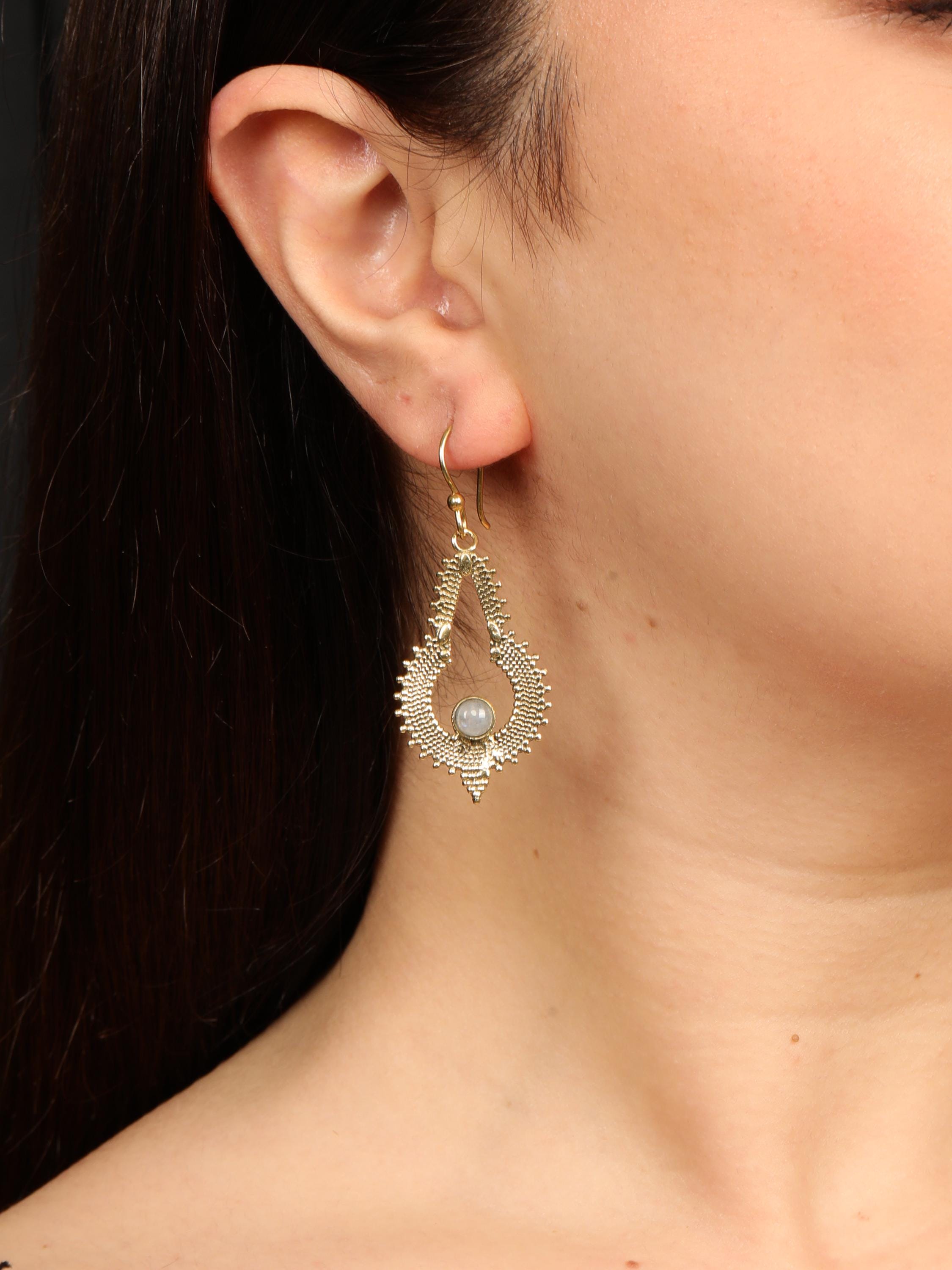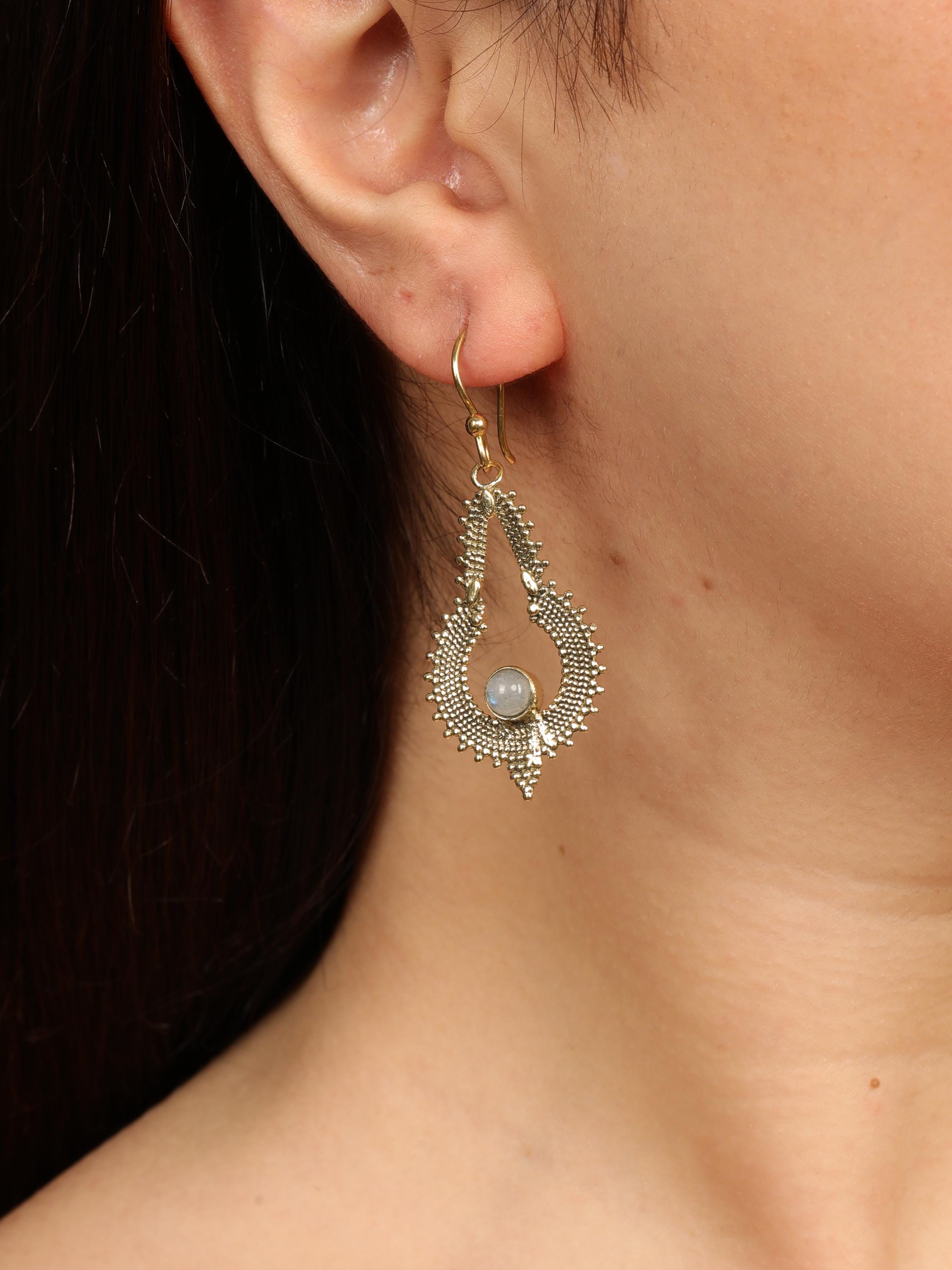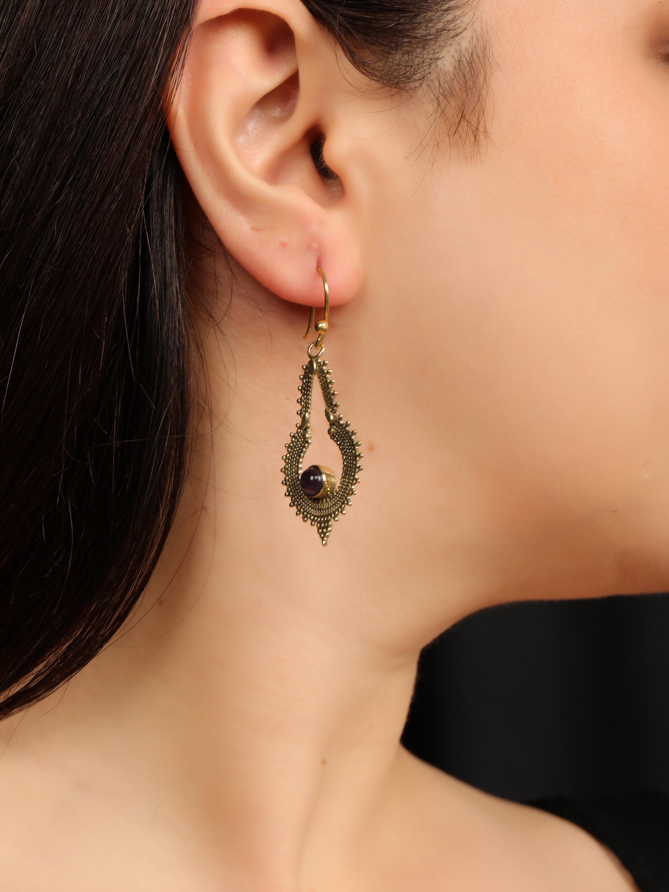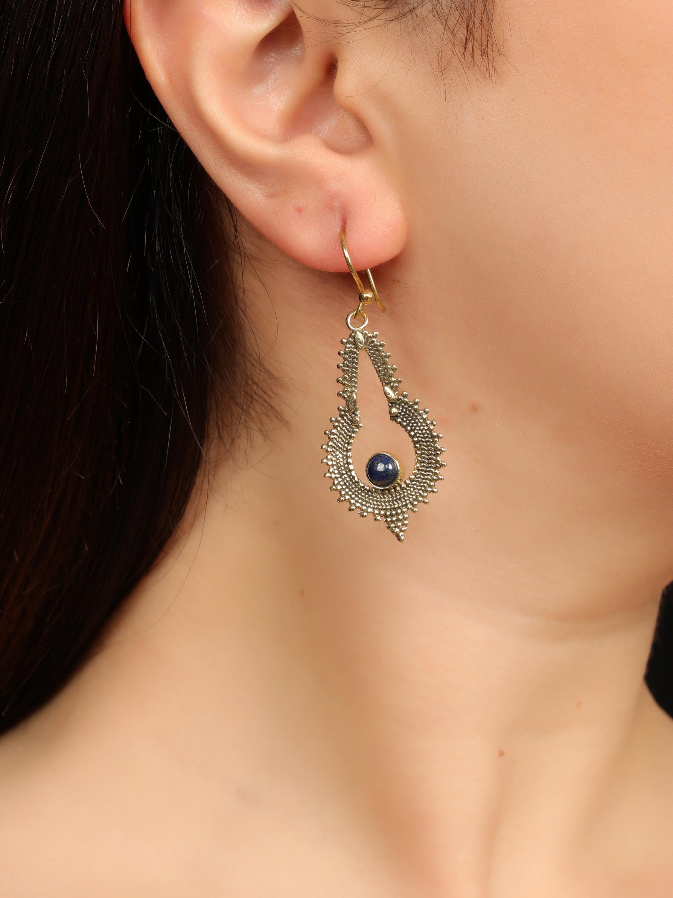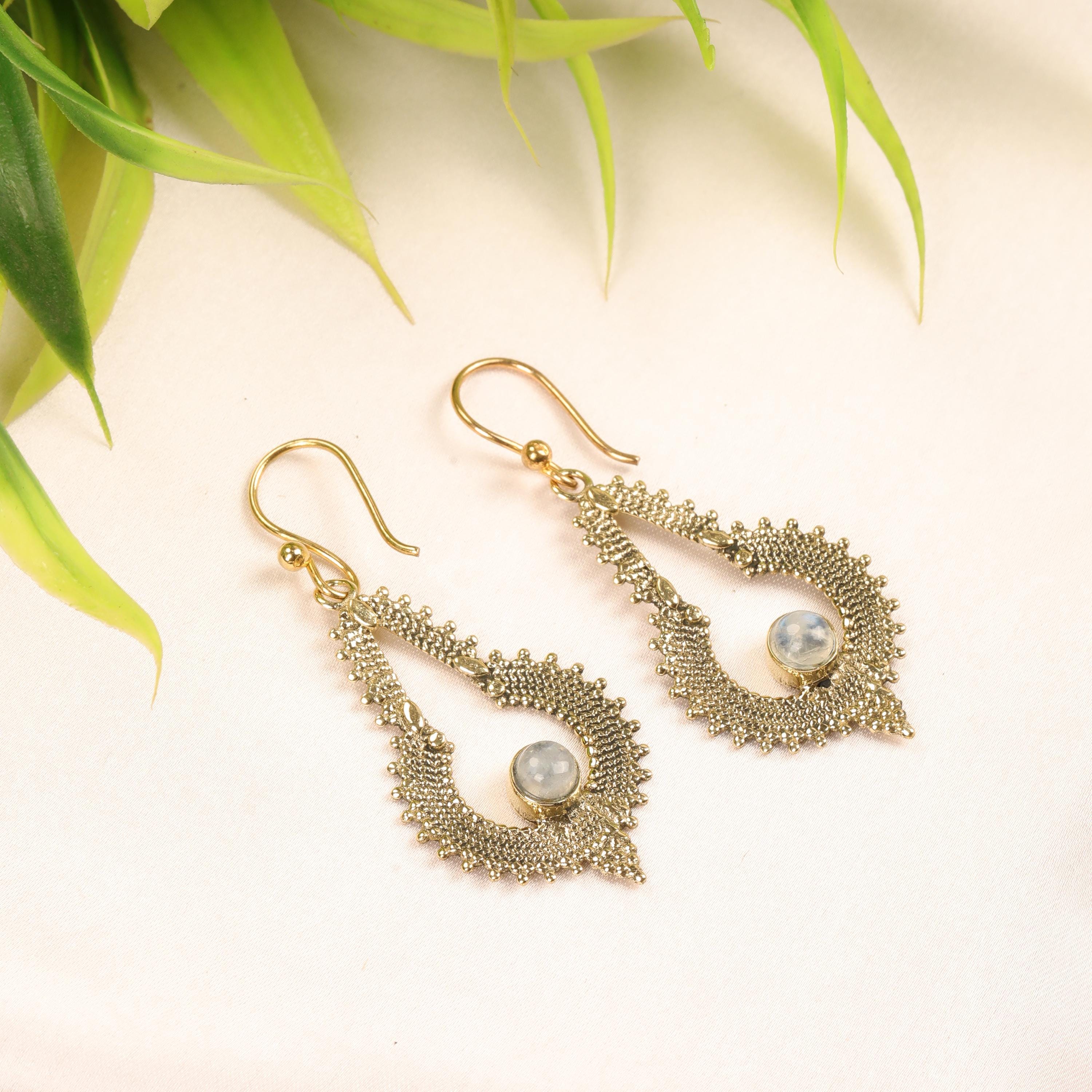 Crafted from solid brass, the earrings have a warm, golden glow that enhances the organic, earthy aesthetic of the piece. At the heart of each earring sits a natural gemstone, carefully set to create a beautiful contrast against the textured brass surface. Each gemstone carries its own natural variations, making every pair truly one of a kind.