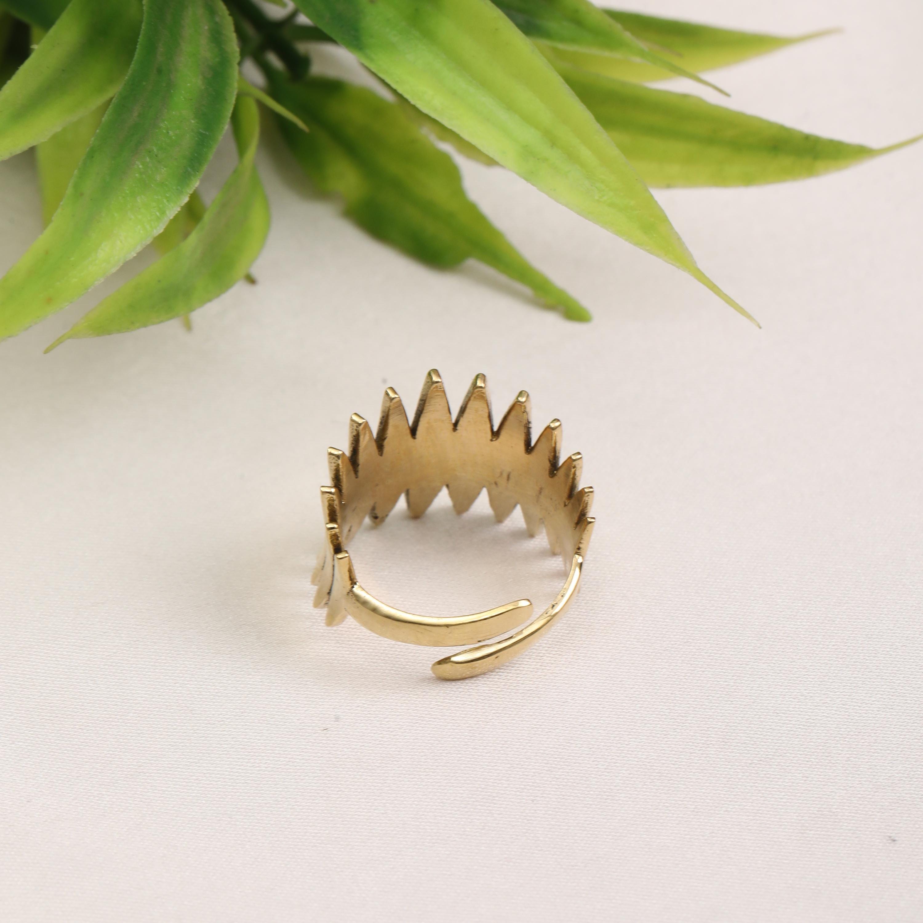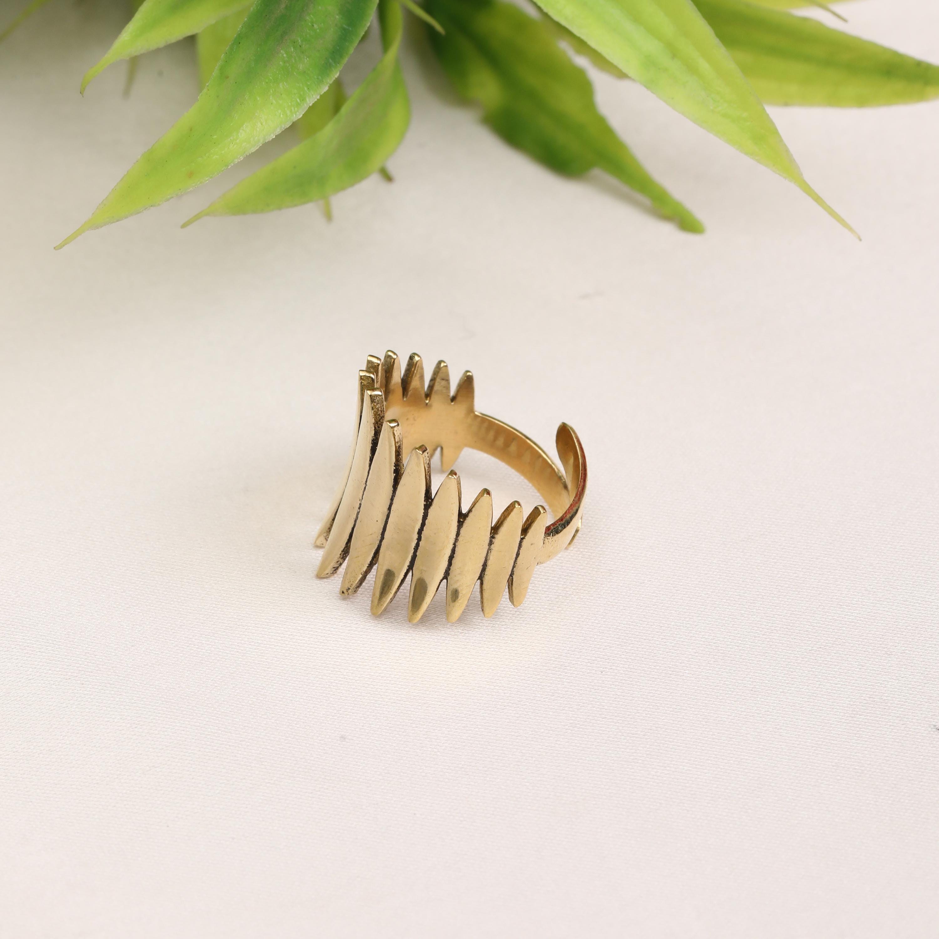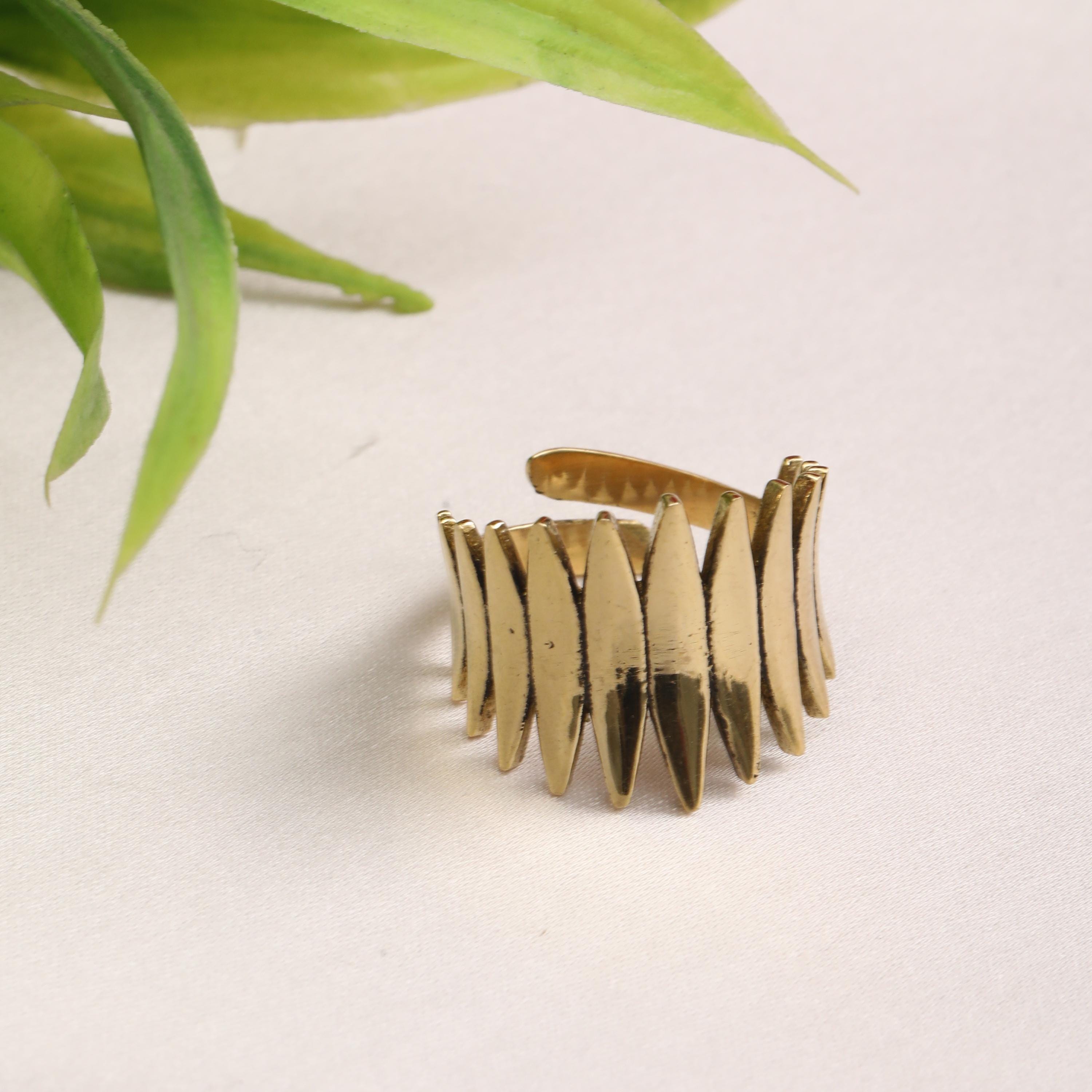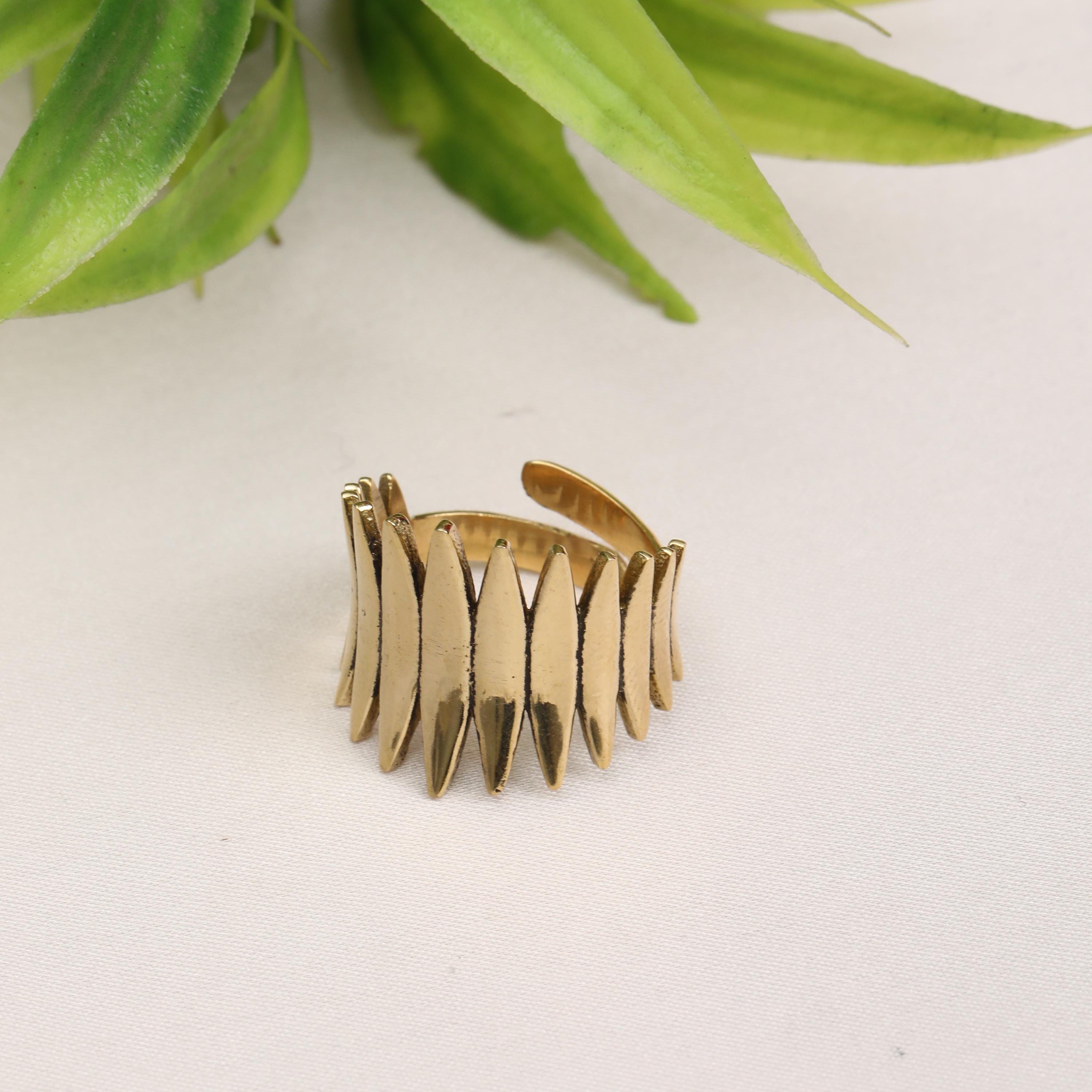 Crafted from solid brass, the ring is available in gold tone or silver tone, making it versatile and easy to pair with both everyday outfits and elevated looks. Its adjustable open band ensures a comfortable fit while maintaining a strong visual presence.