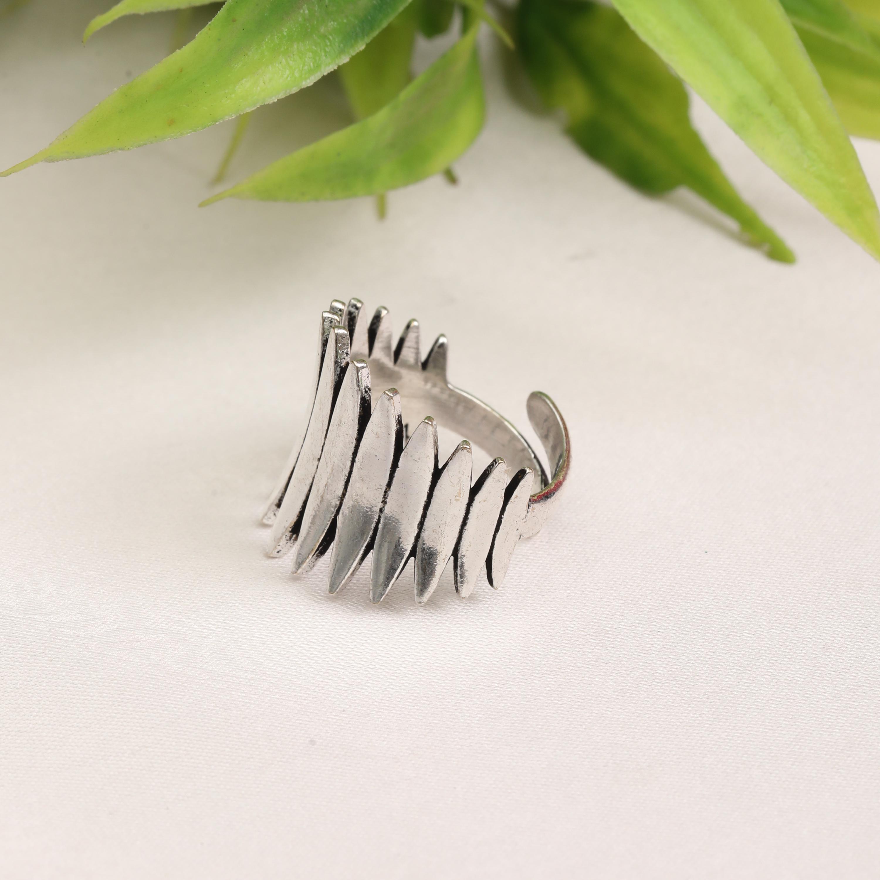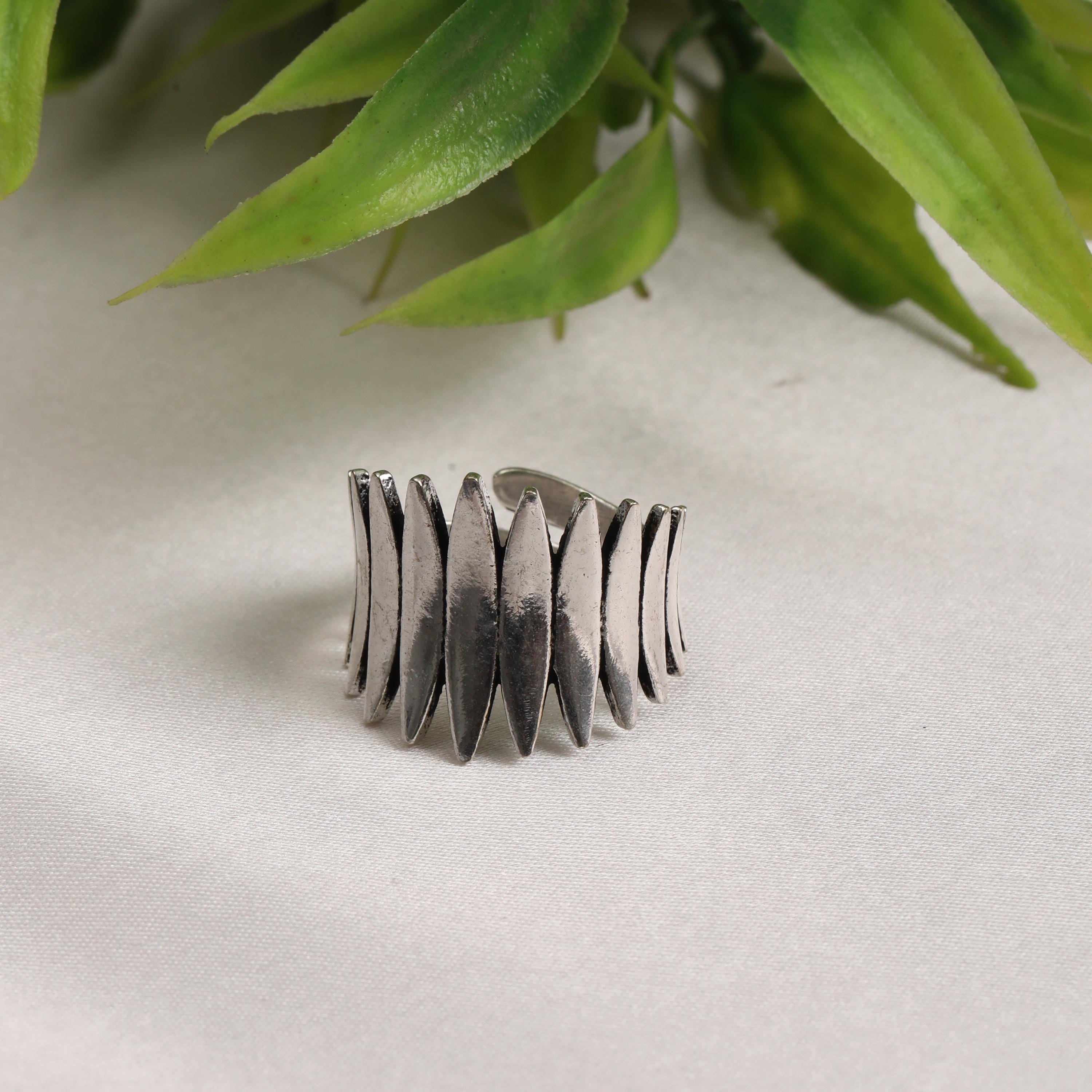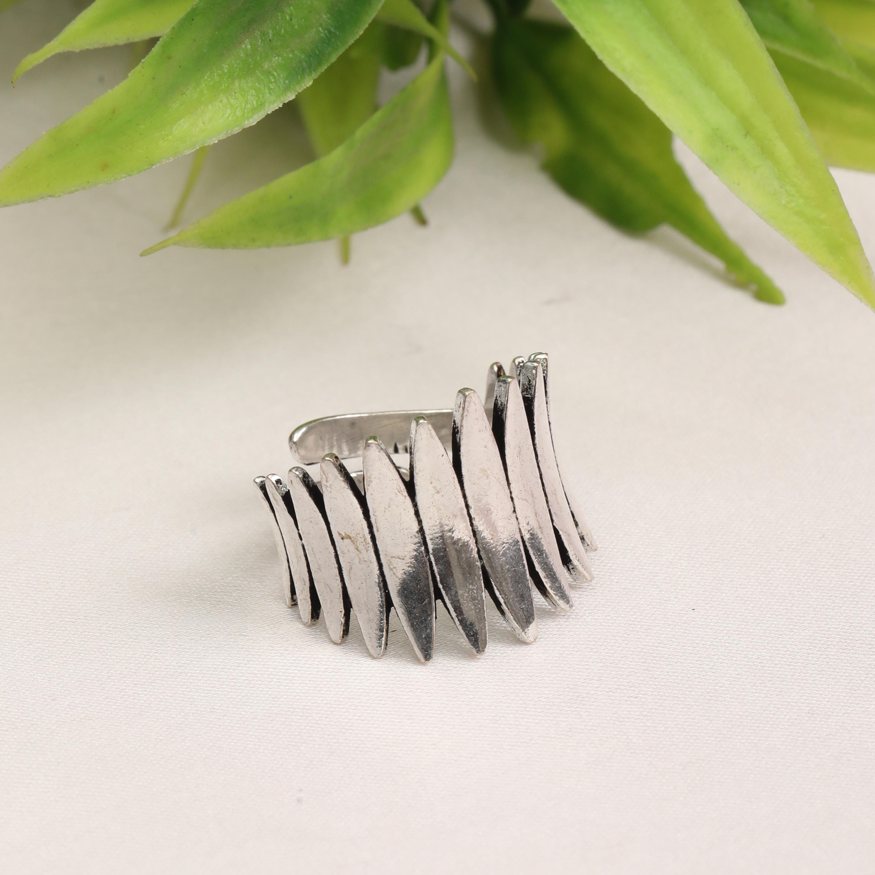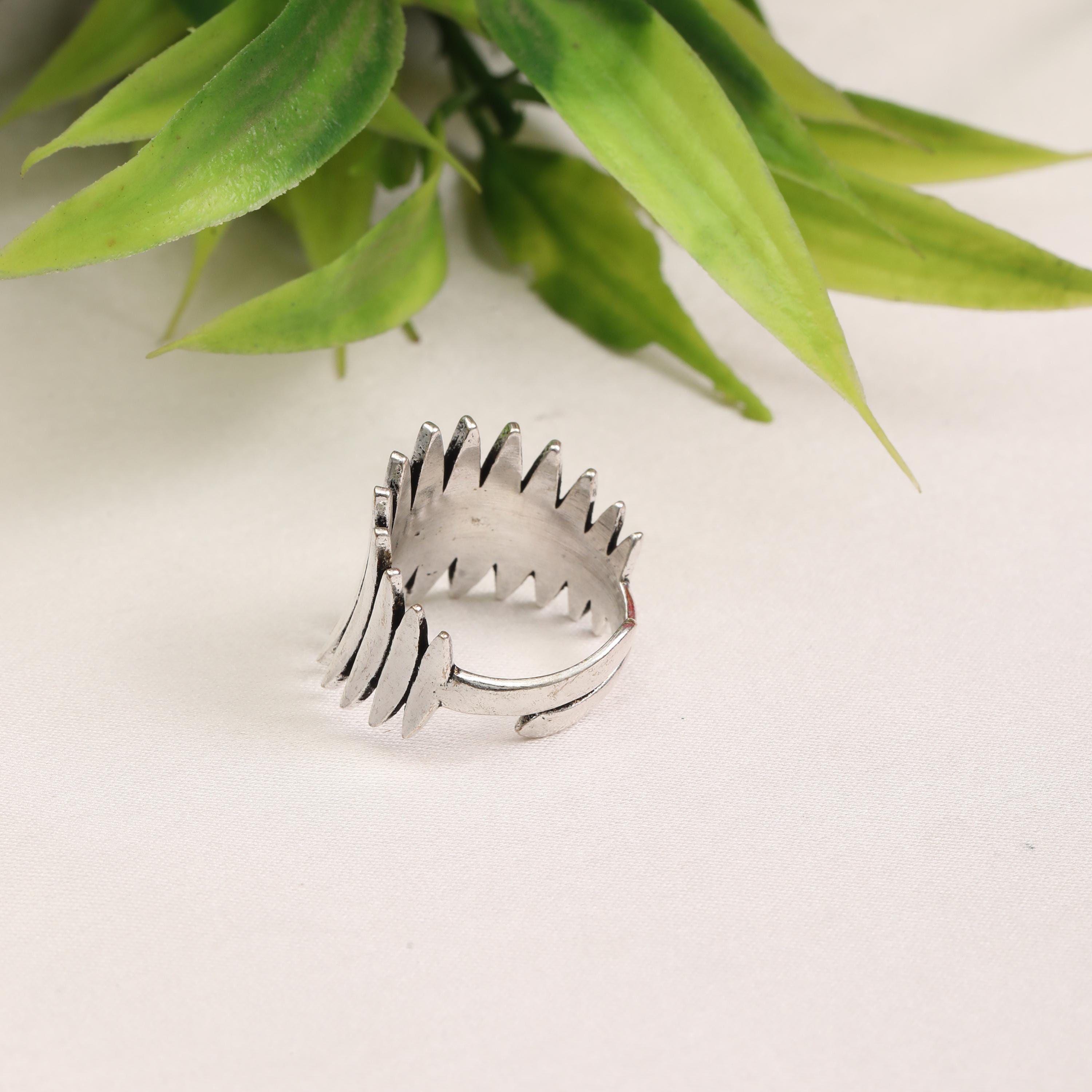 Crafted from solid brass, the ring is available in gold tone or silver tone, making it versatile and easy to pair with both everyday outfits and elevated looks. Its adjustable open band ensures a comfortable fit while maintaining a strong visual presence.