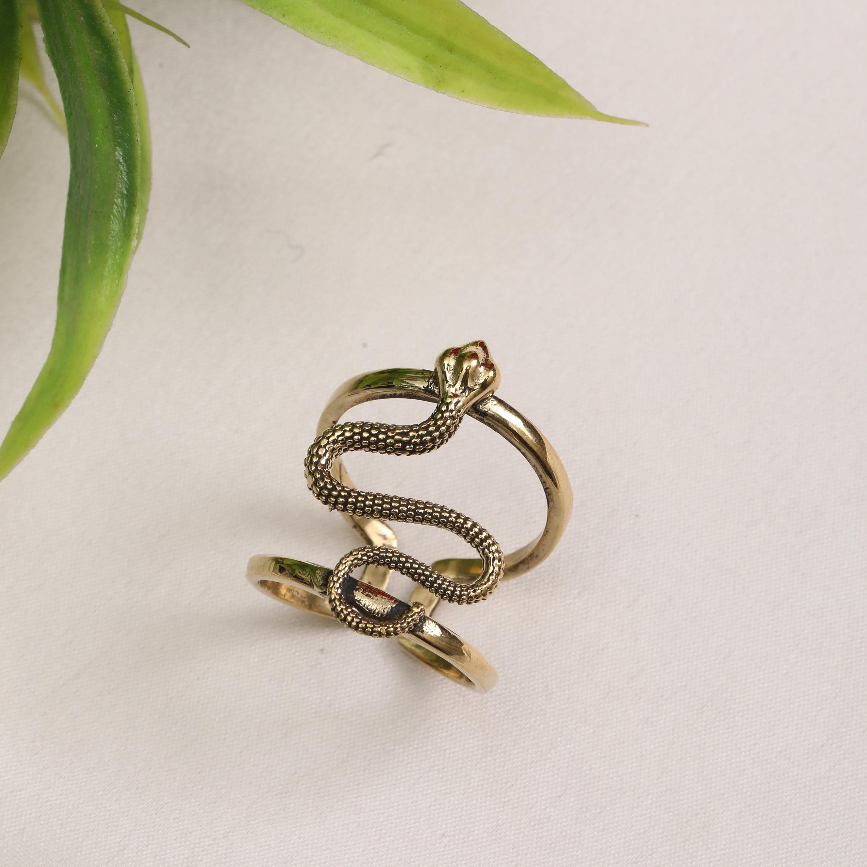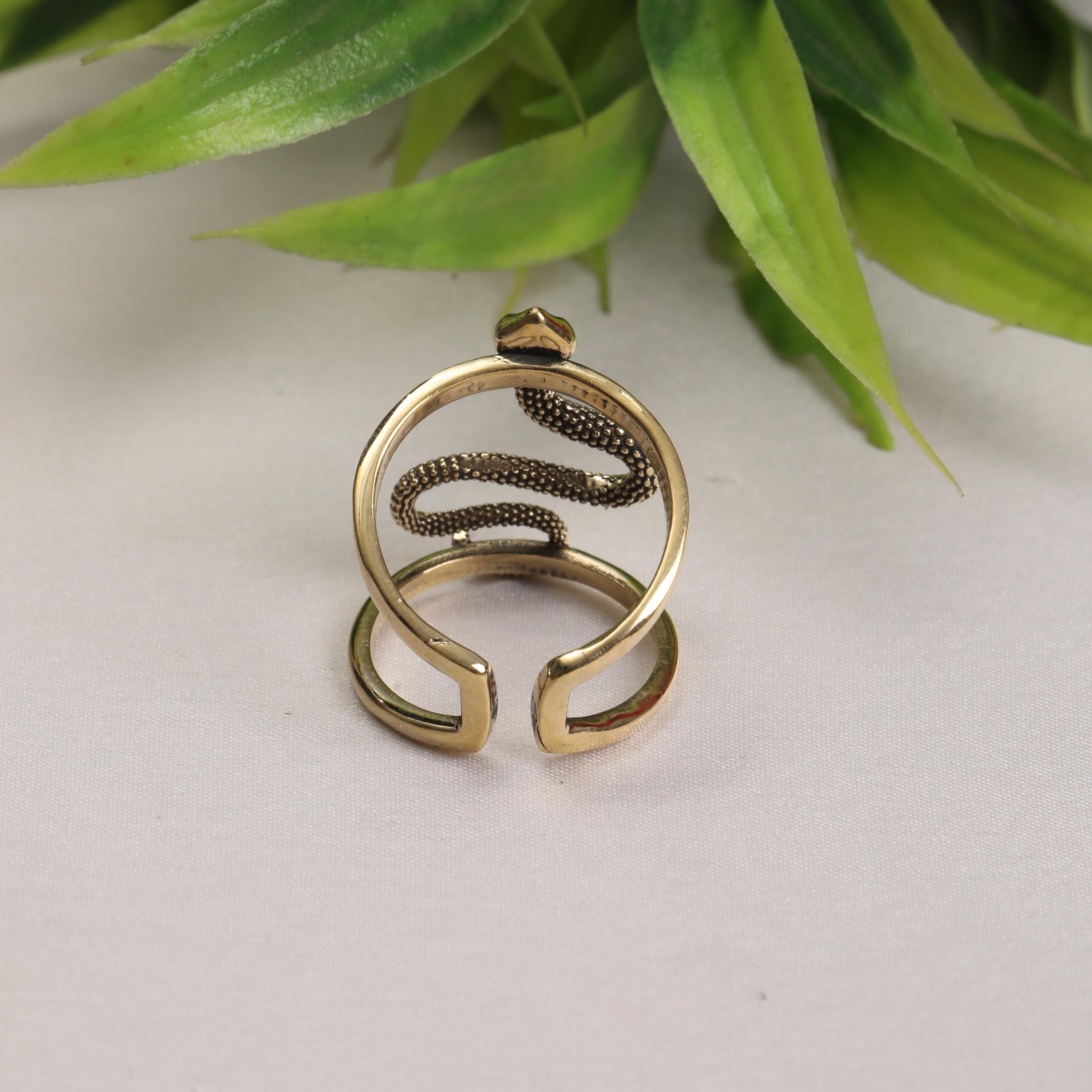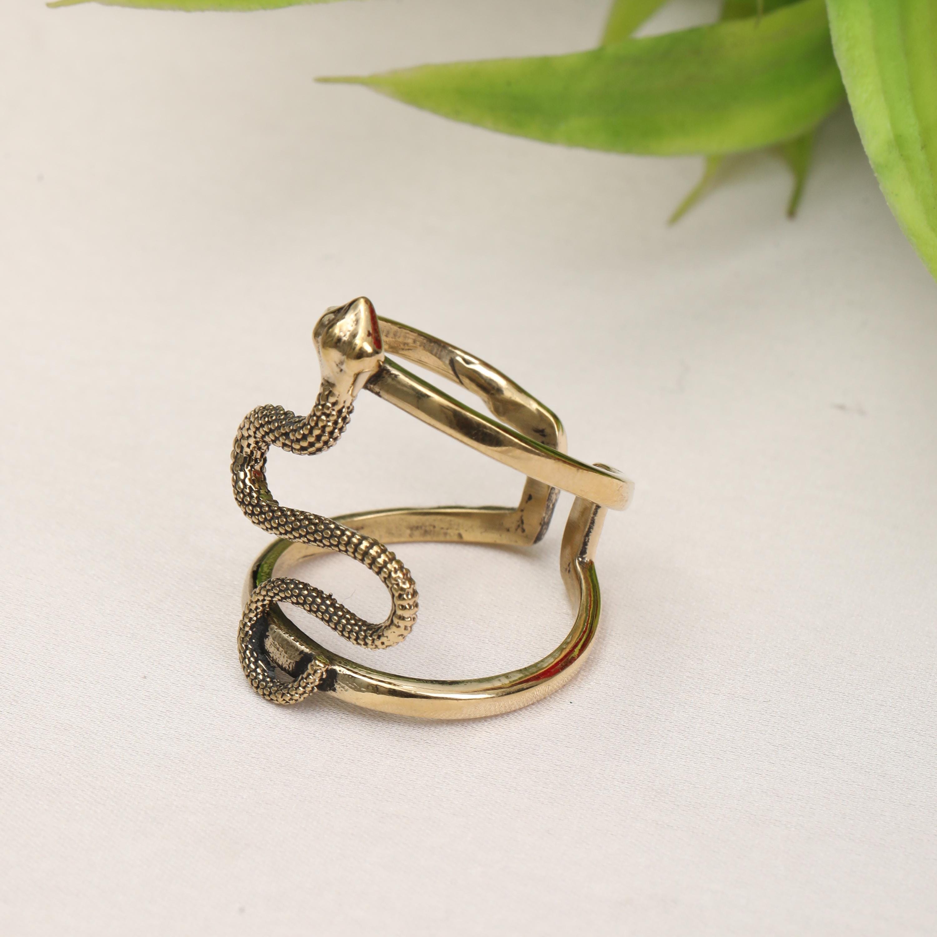 Crafted from solid brass with a polished gold-tone finish, the snake motif represents strength, transformation, and timeless style. Its open adjustable band ensures a comfortable fit while maintaining a strong architectural presence.