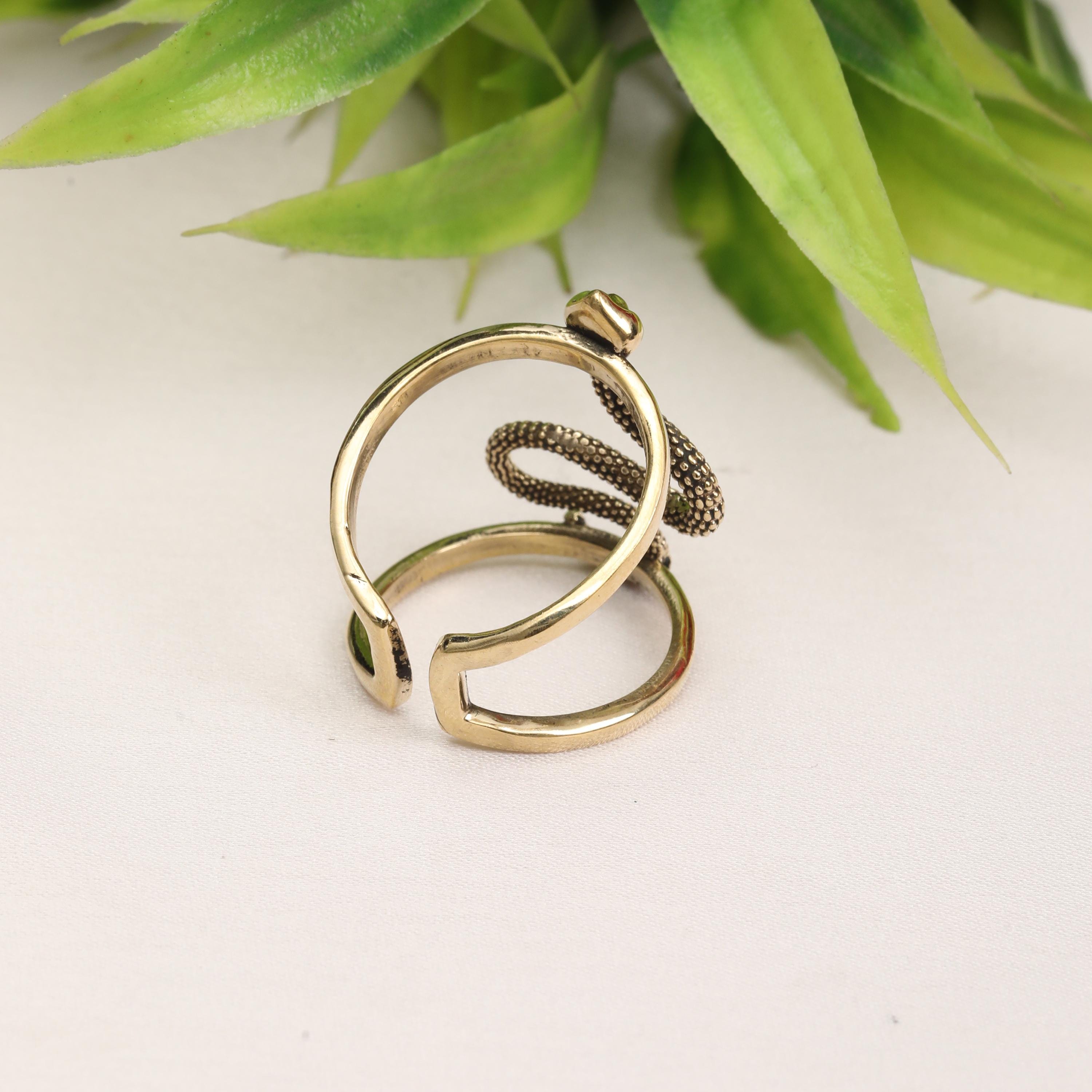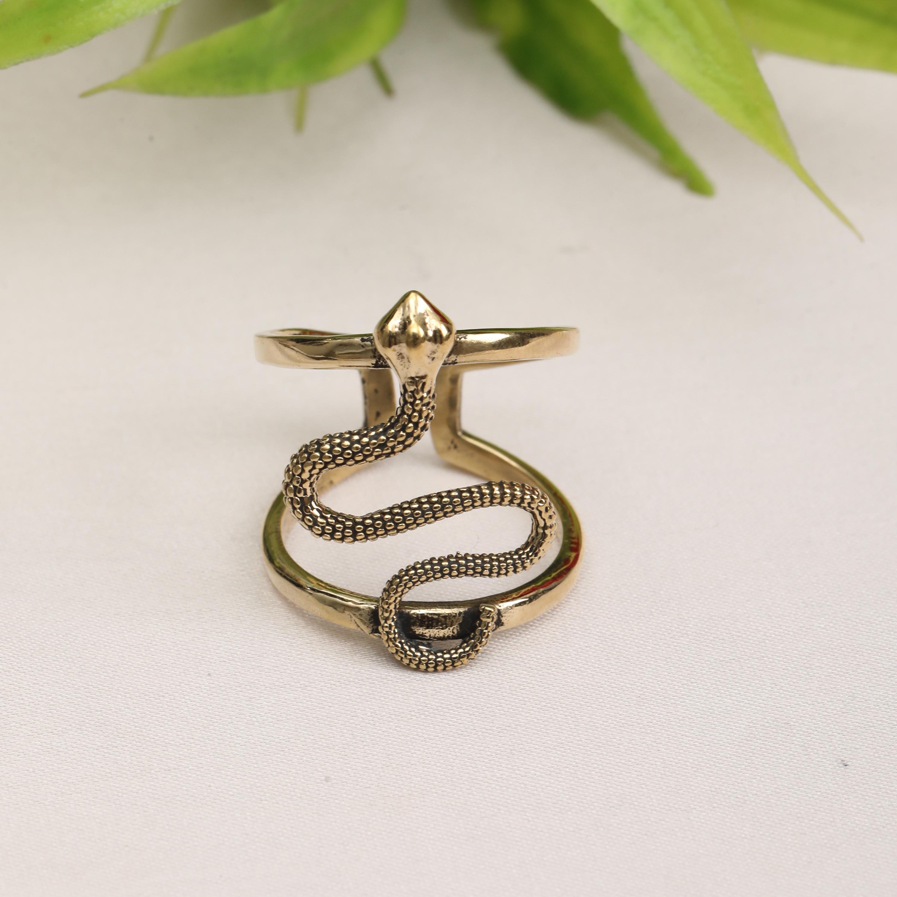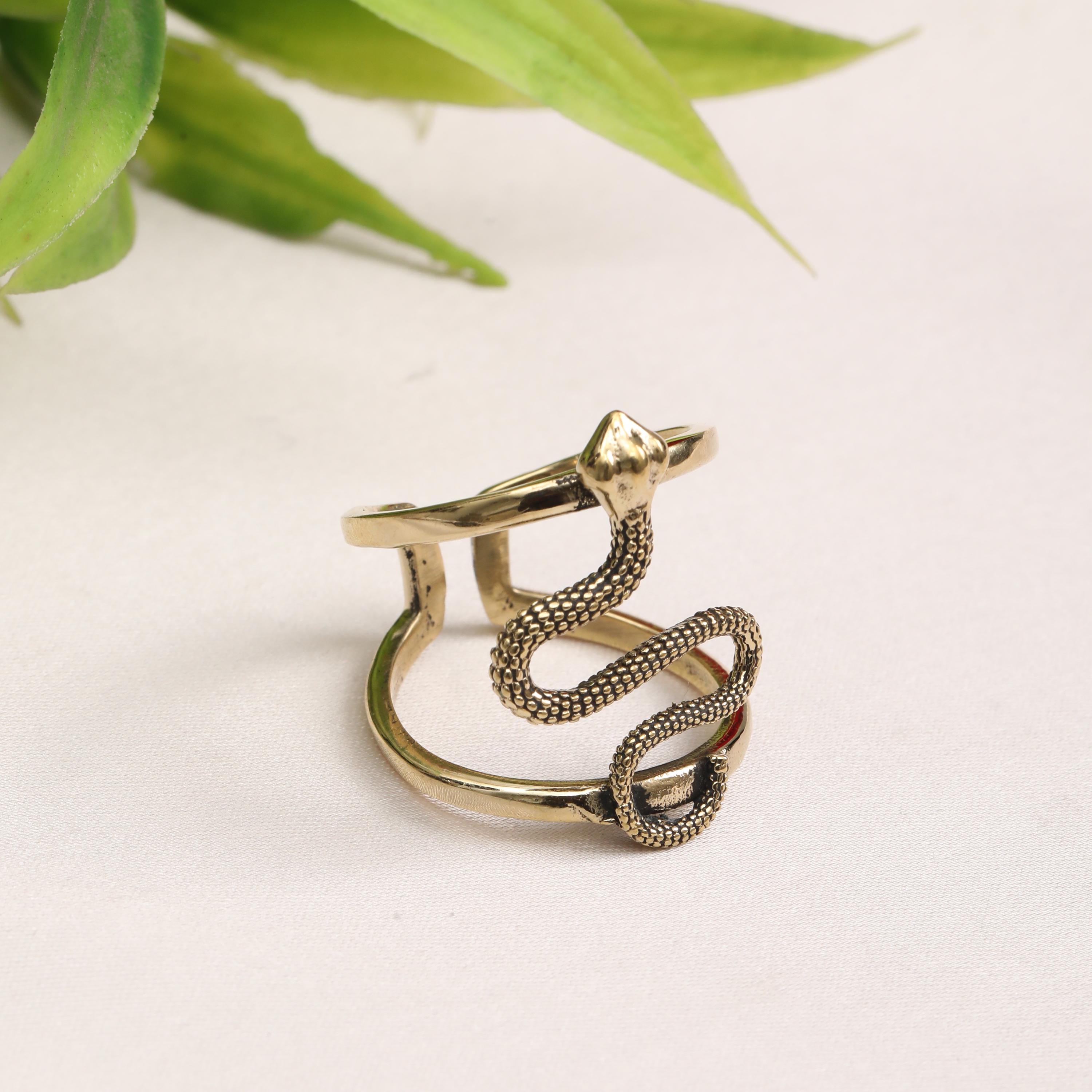 This modern snake brass ring features a bold sculptural serpent design with clean curves and refined detailing. The fluid form wraps elegantly around the finger, creating a striking balance between contemporary minimalism and symbolic statement jewelry.