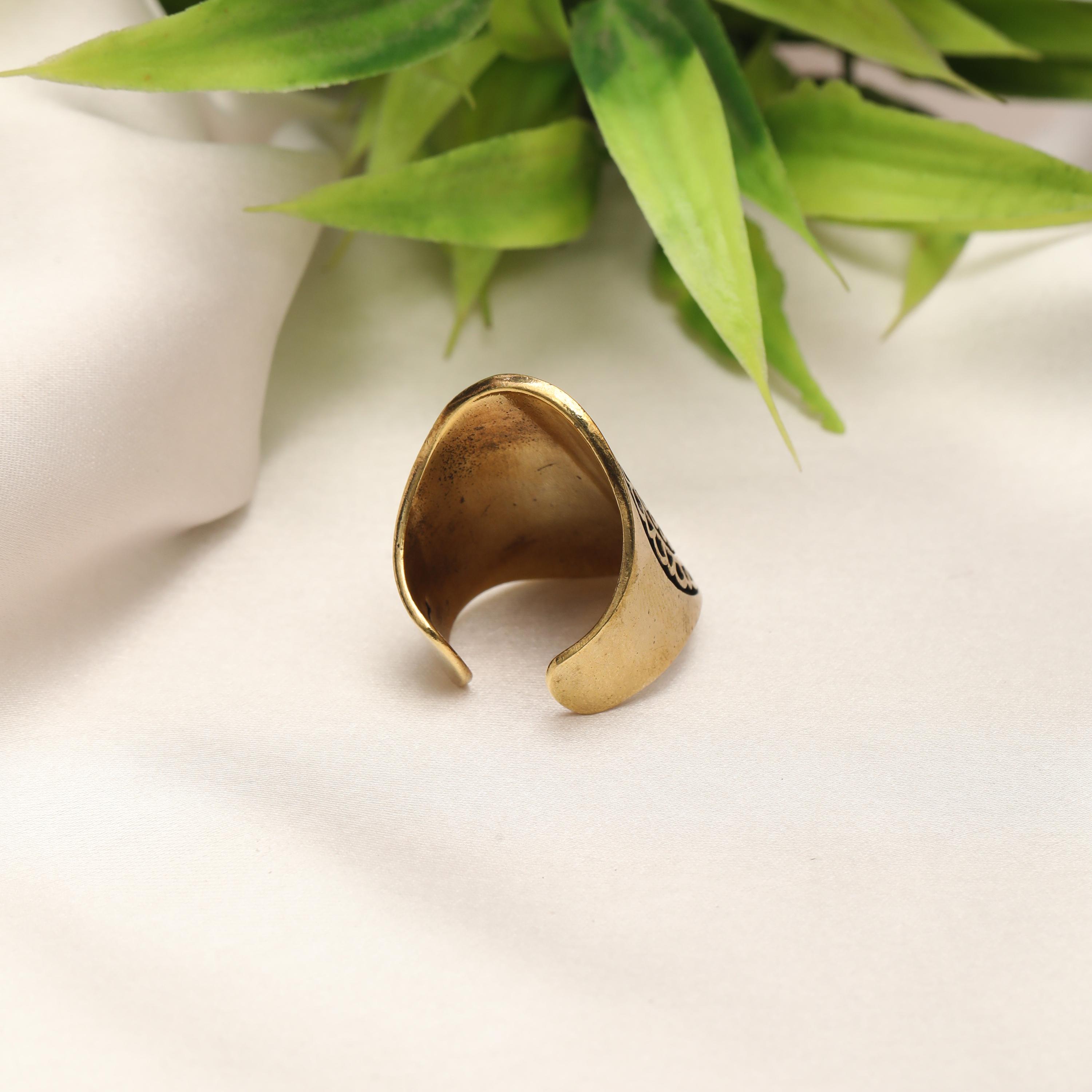 The ring band is adjustable, allowing a flexible fit for different finger sizes. Each piece has natural variations in tone and texture, adding to its unique artisanal character.